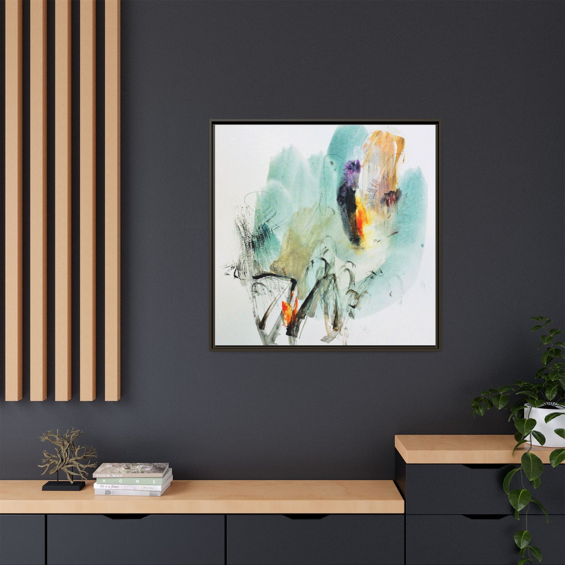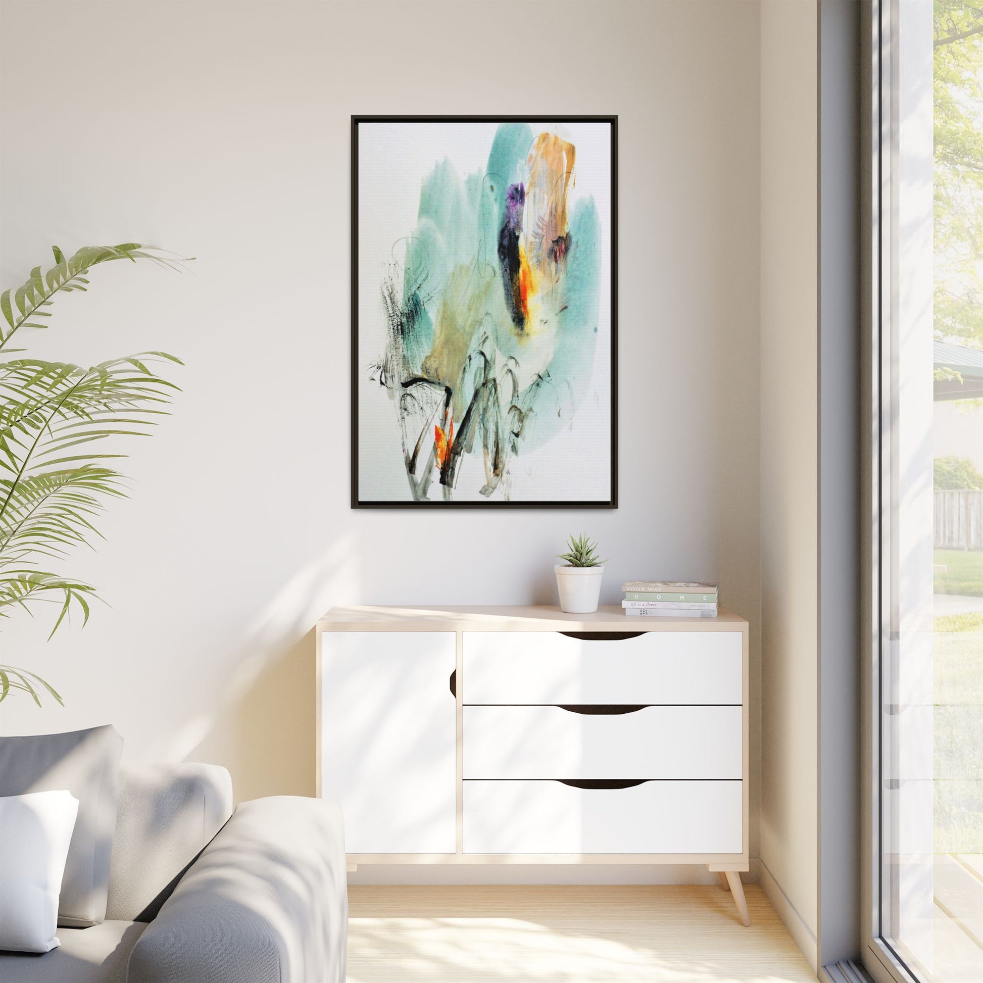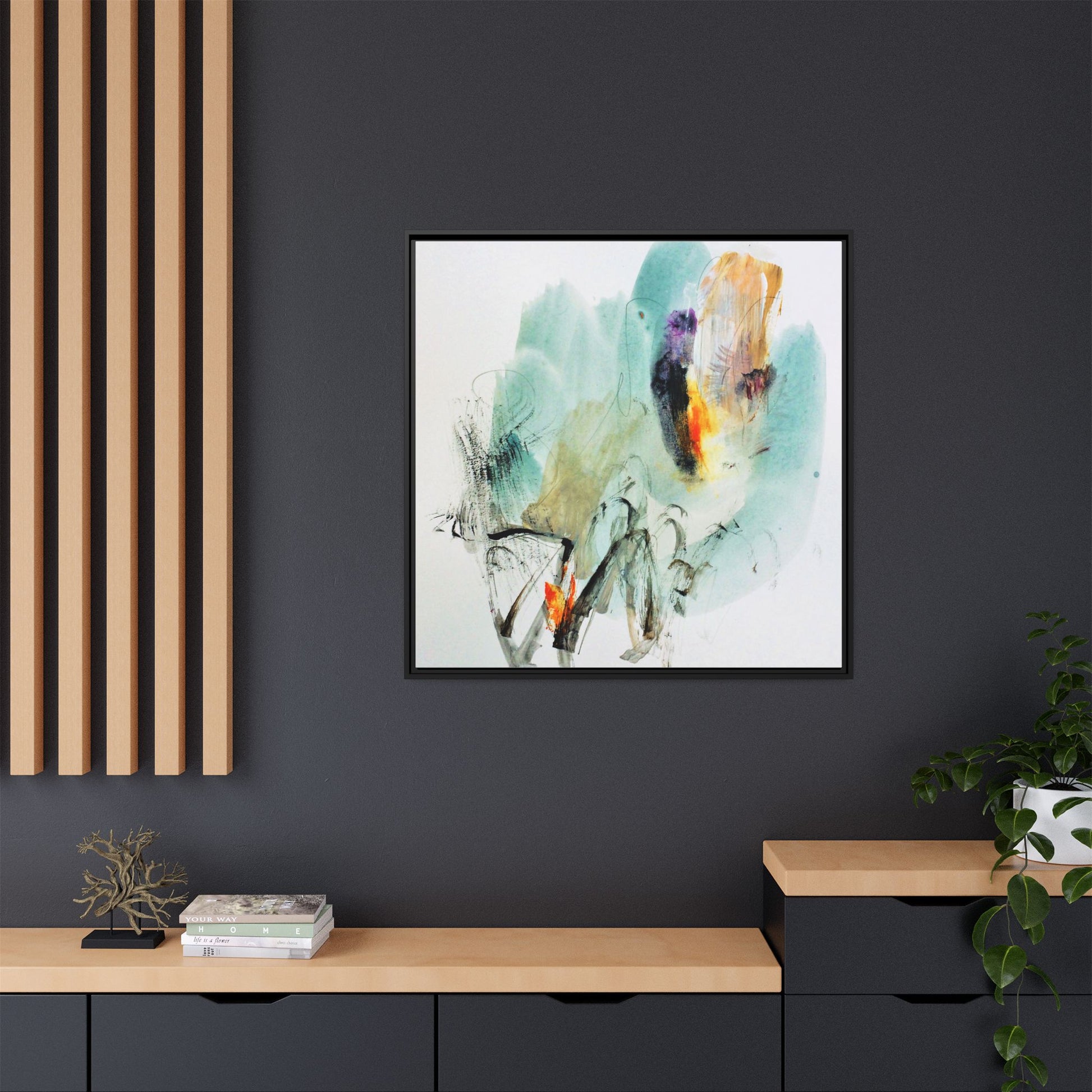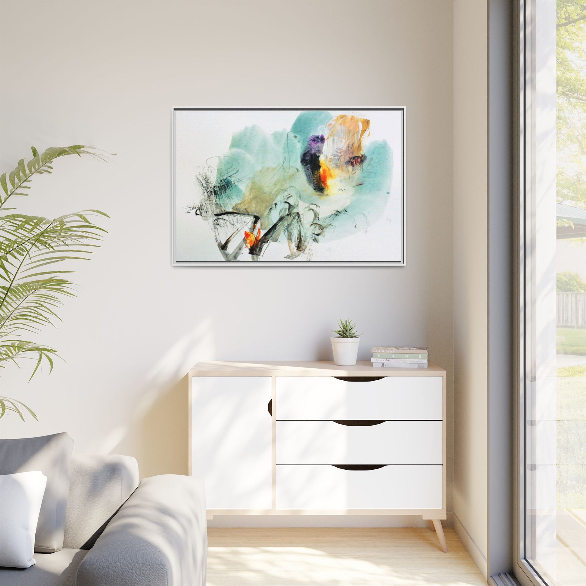 This captivating abstract watercolor painting features a dynamic composition of soft, ethereal teal and aquamarine backgrounds blended with muted yellows, oranges, and touches of purple. Fluid brushstrokes and organic shapes create a sense of movement and spontaneity, with gestural black and gray lines weaving throughout the image. Vibrant bursts of fiery orange and red punctuate the painting, providing striking contrast against the cool, watery color palette. The artwork appears to be created using a combination of watercolor, ink, and possibly other mixed media techniques, giving it a rich, layered texture. The painting evokes a sense of natural elements - perhaps suggesting landscapes, water, or atmospheric phenomena through its abstract, impressionistic style.