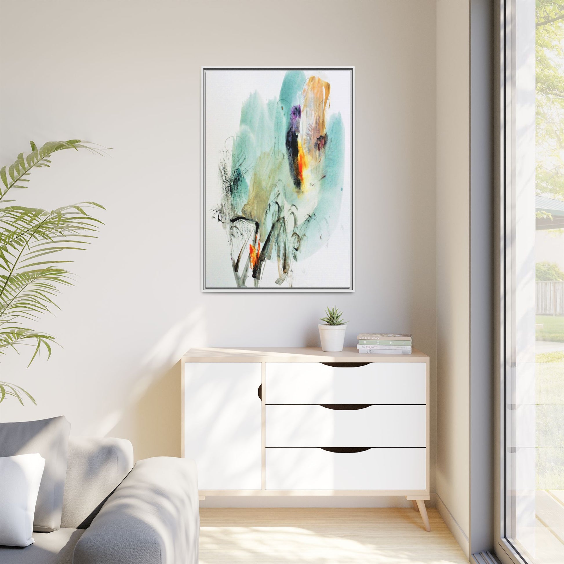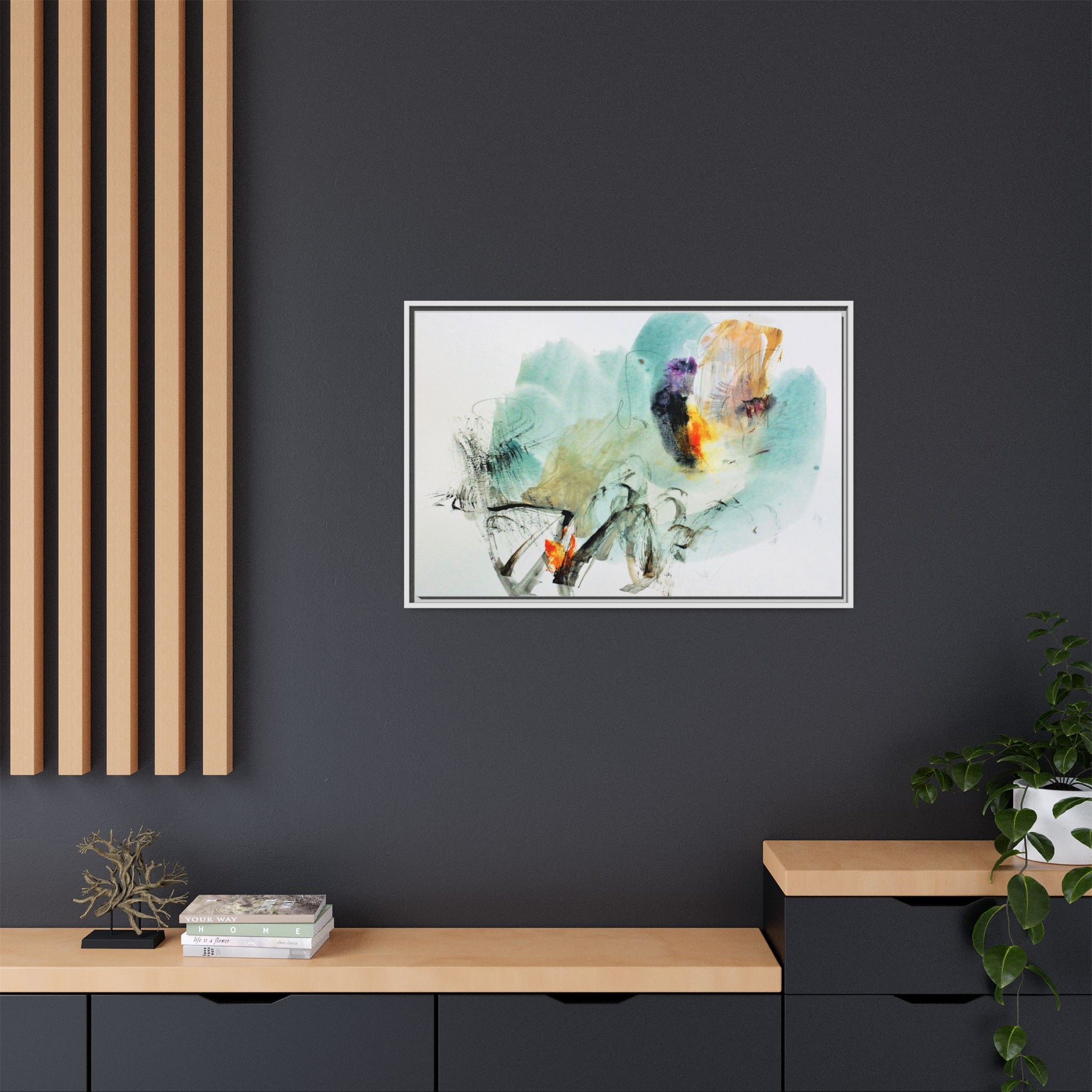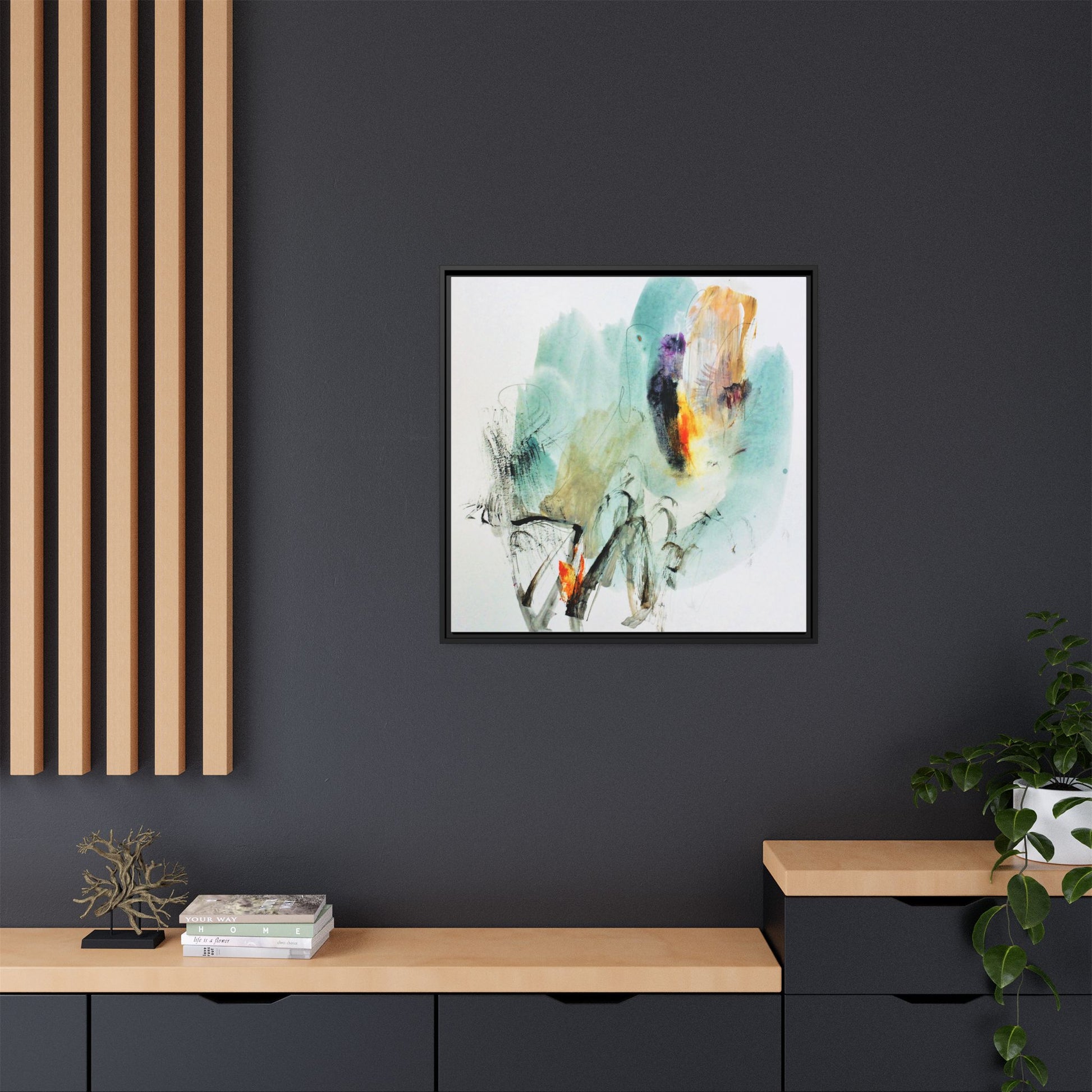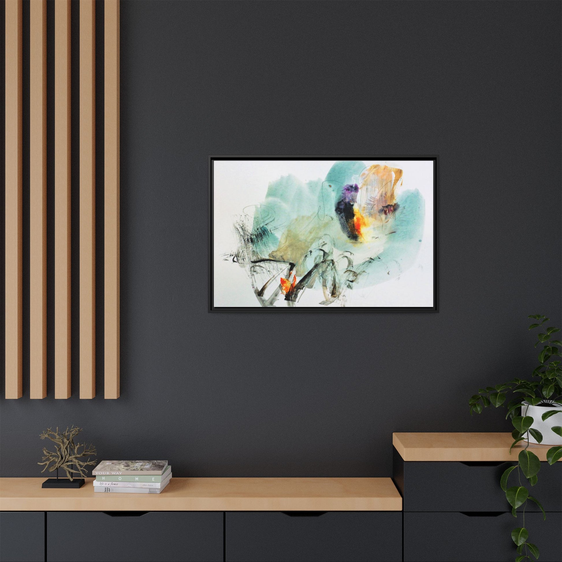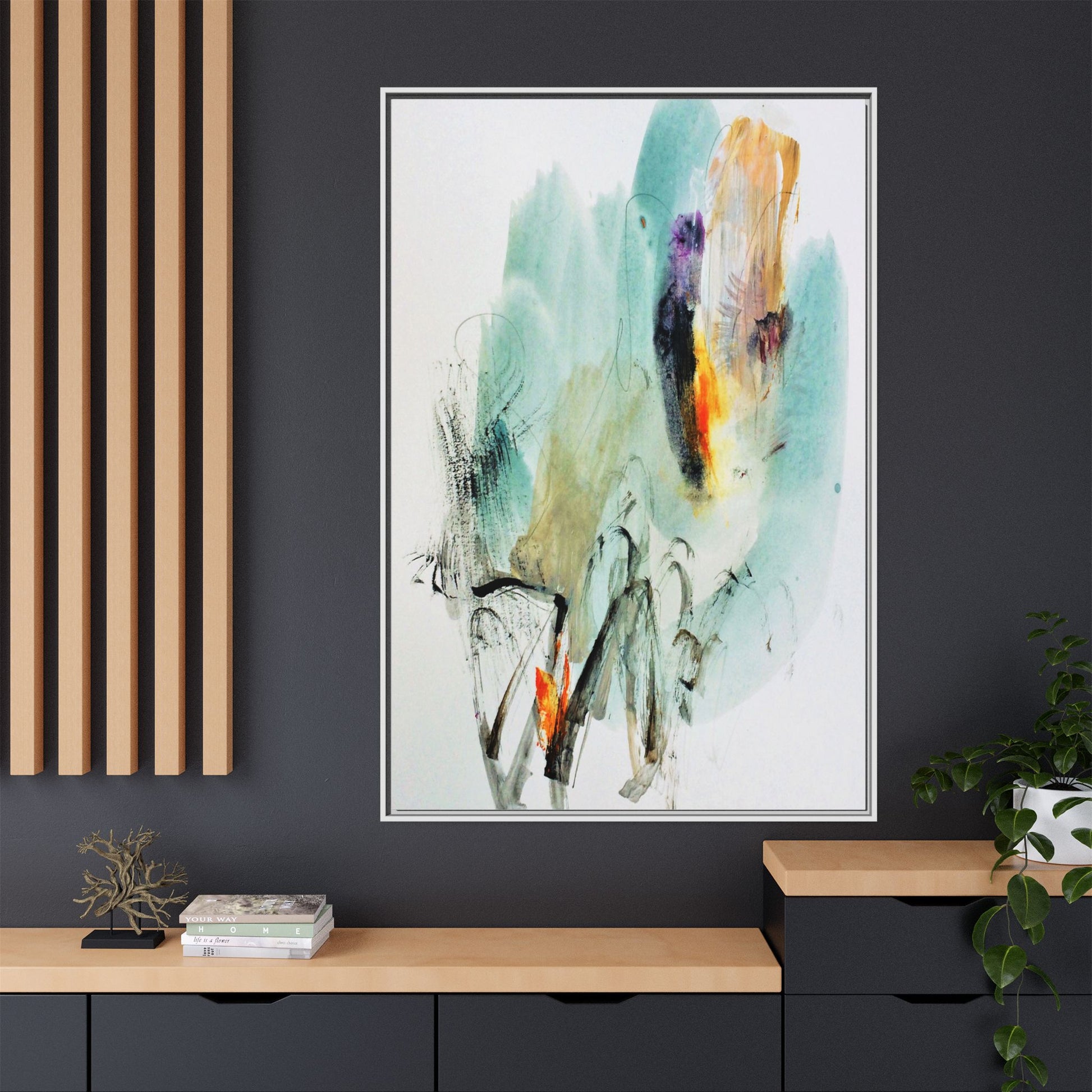 This captivating abstract watercolor painting features a dynamic composition of soft, ethereal teal and aquamarine backgrounds blended with muted yellows, oranges, and touches of purple. Fluid brushstrokes and organic shapes create a sense of movement and spontaneity, with gestural black and gray lines weaving throughout the image. Vibrant bursts of fiery orange and red punctuate the painting, providing striking contrast against the cool, watery color palette. The artwork appears to be created using a combination of watercolor, ink, and possibly other mixed media techniques, giving it a rich, layered texture. The painting evokes a sense of natural elements - perhaps suggesting landscapes, water, or atmospheric phenomena through its abstract, impressionistic style.