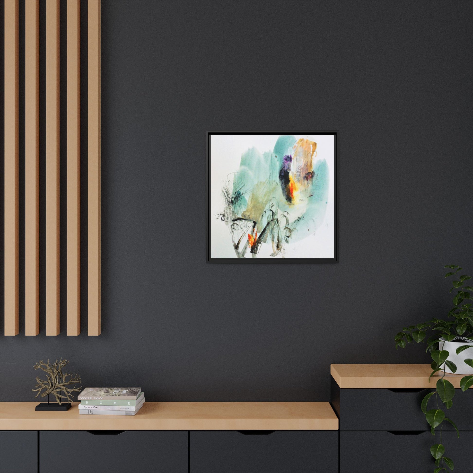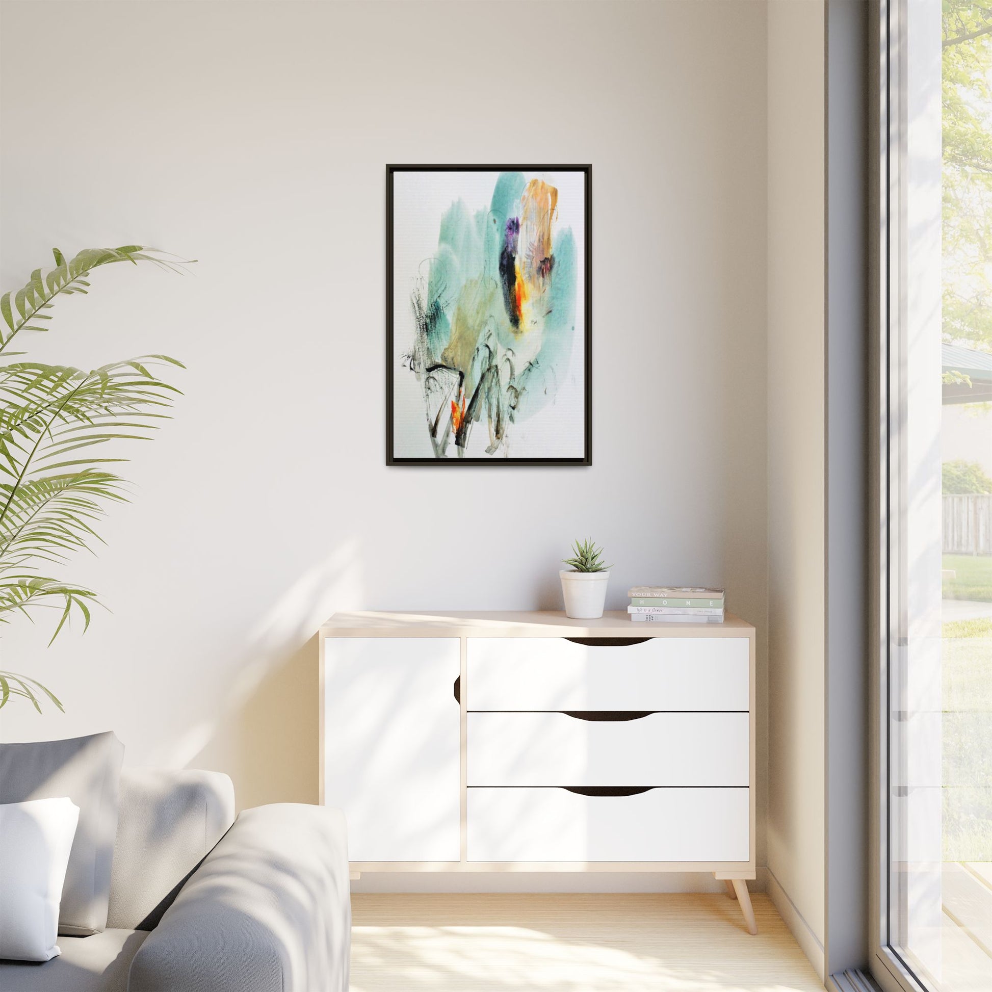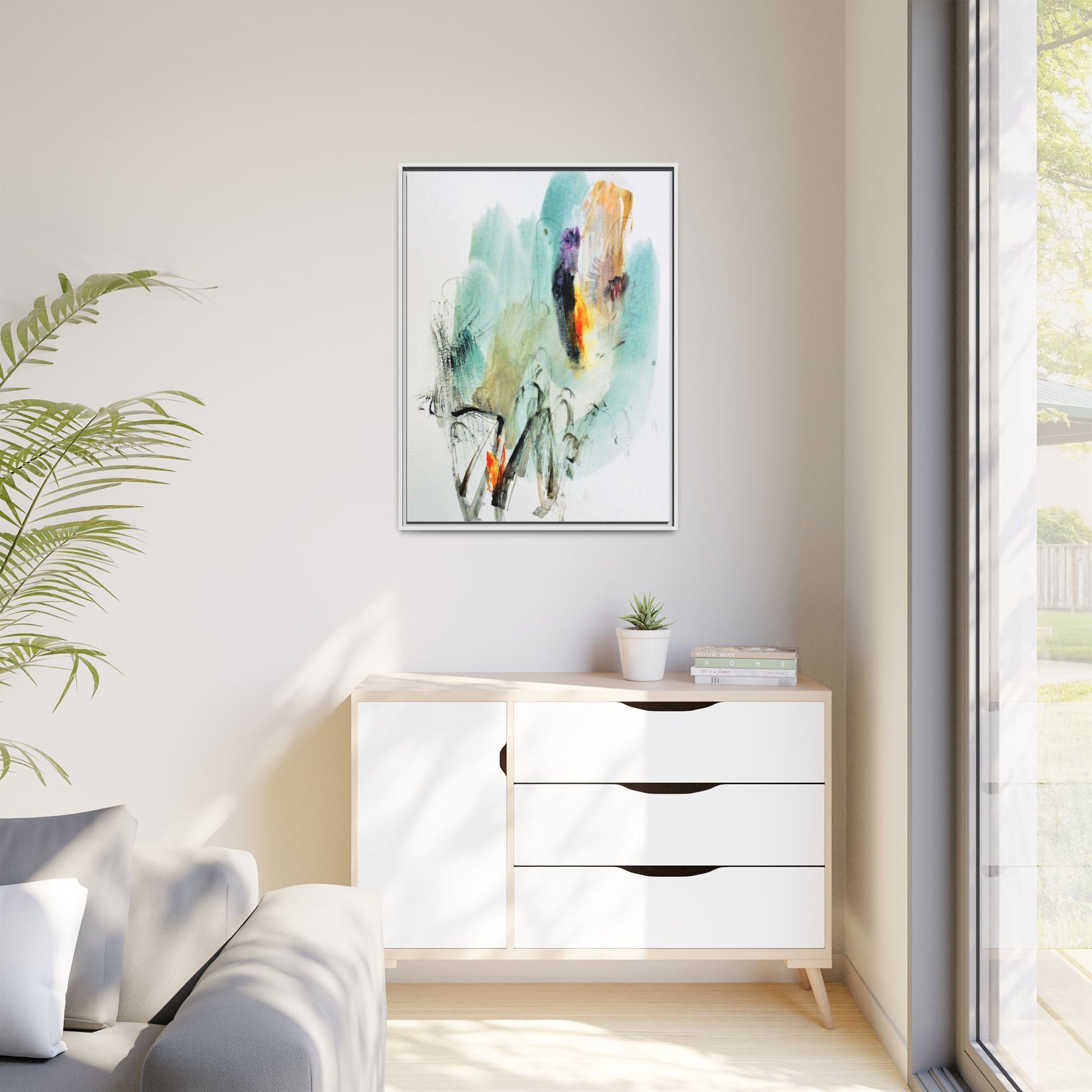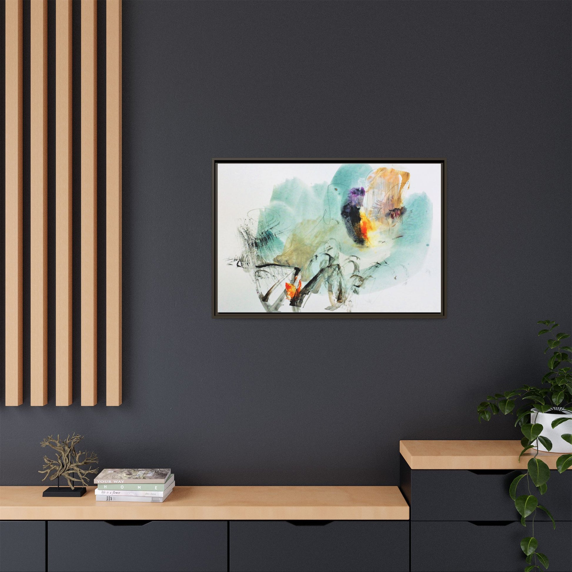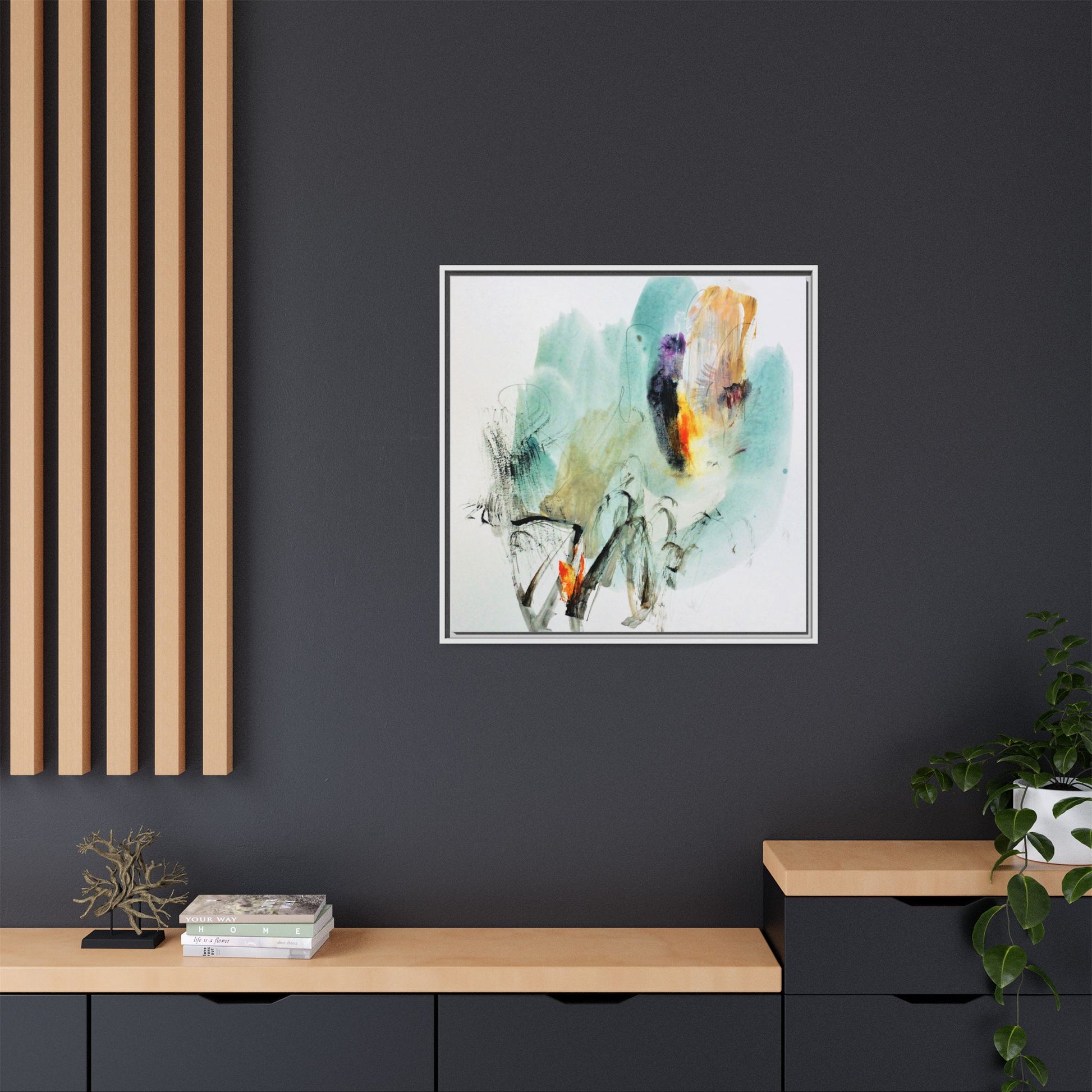 This captivating abstract watercolor painting features a dynamic composition of soft, ethereal teal and aquamarine backgrounds blended with muted yellows, oranges, and touches of purple. Fluid brushstrokes and organic shapes create a sense of movement and spontaneity, with gestural black and gray lines weaving throughout the image. Vibrant bursts of fiery orange and red punctuate the painting, providing striking contrast against the cool, watery color palette. The artwork appears to be created using a combination of watercolor, ink, and possibly other mixed media techniques, giving it a rich, layered texture. The painting evokes a sense of natural elements - perhaps suggesting landscapes, water, or atmospheric phenomena through its abstract, impressionistic style.