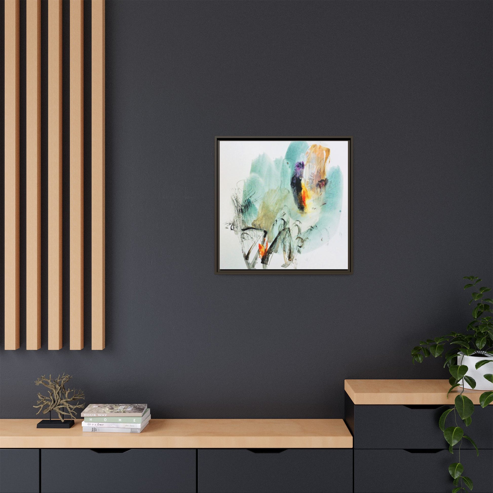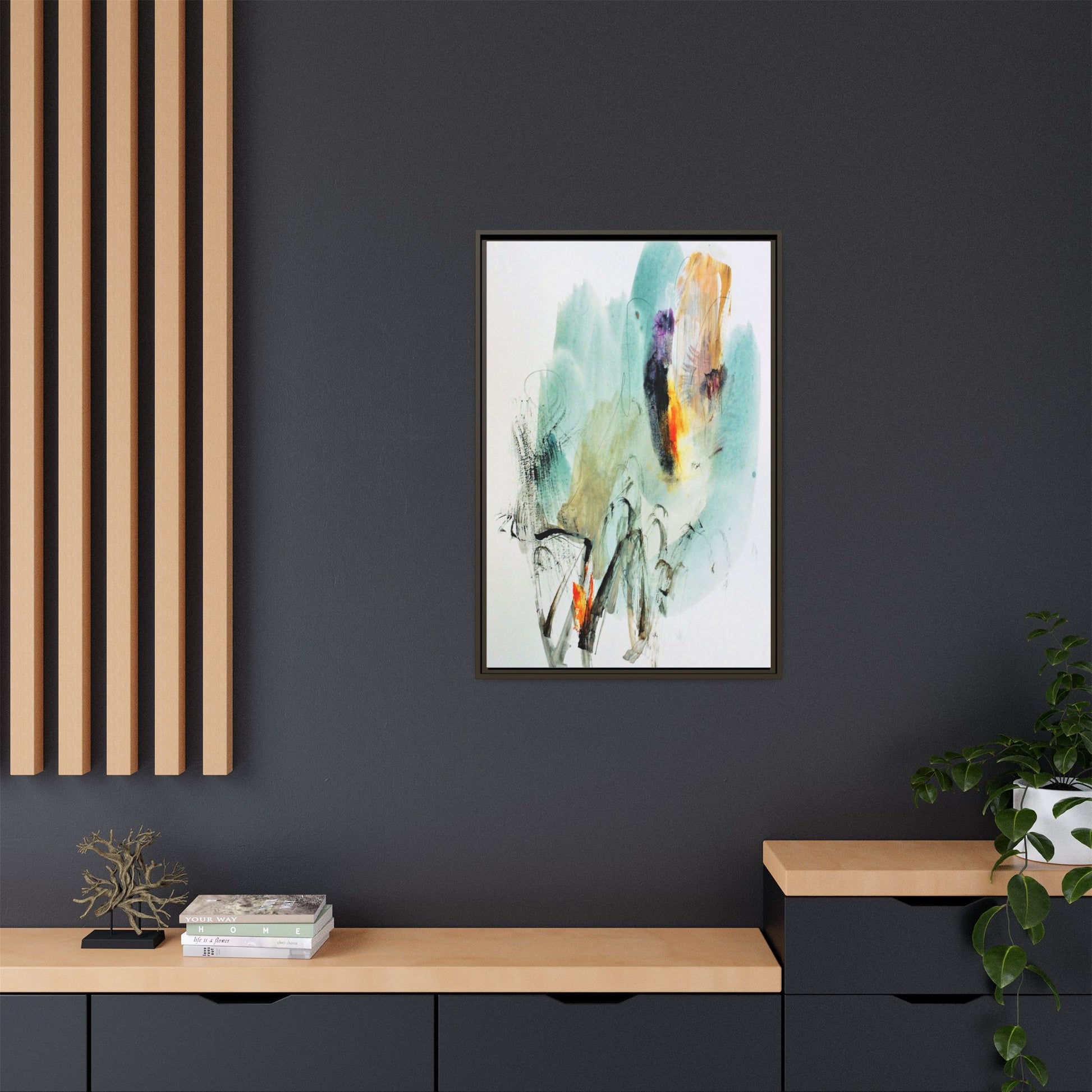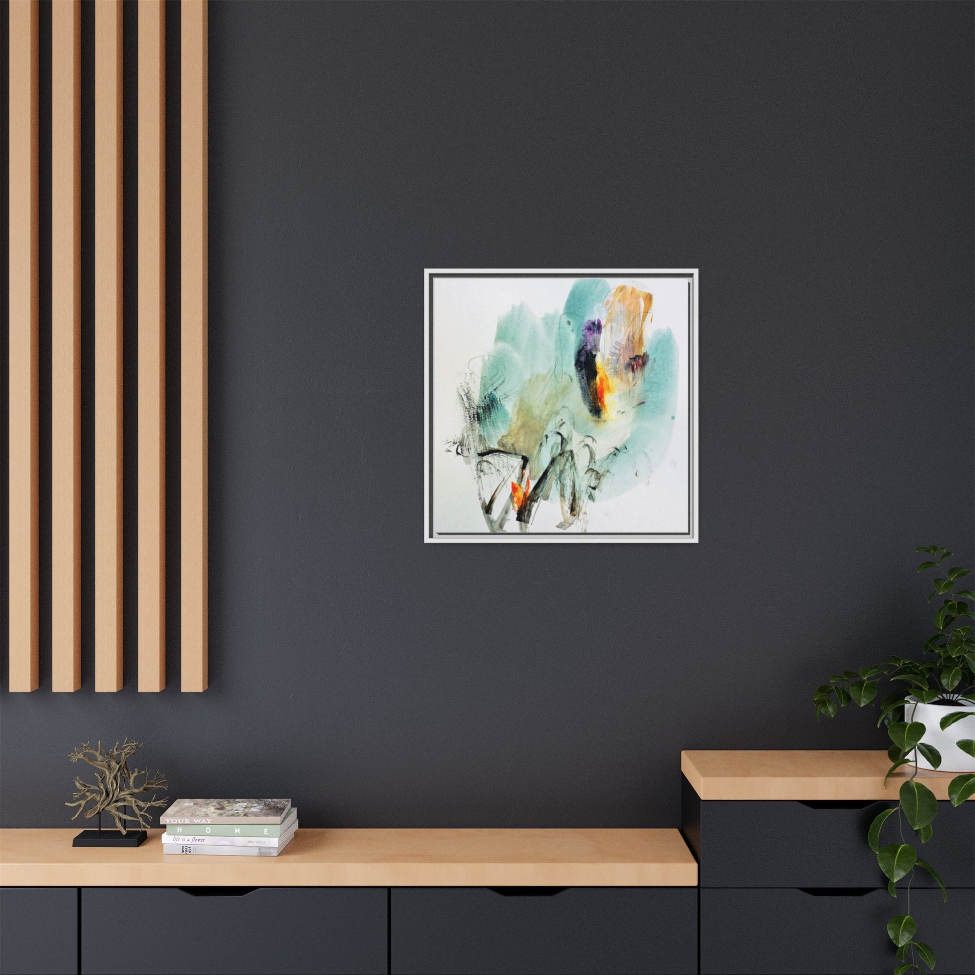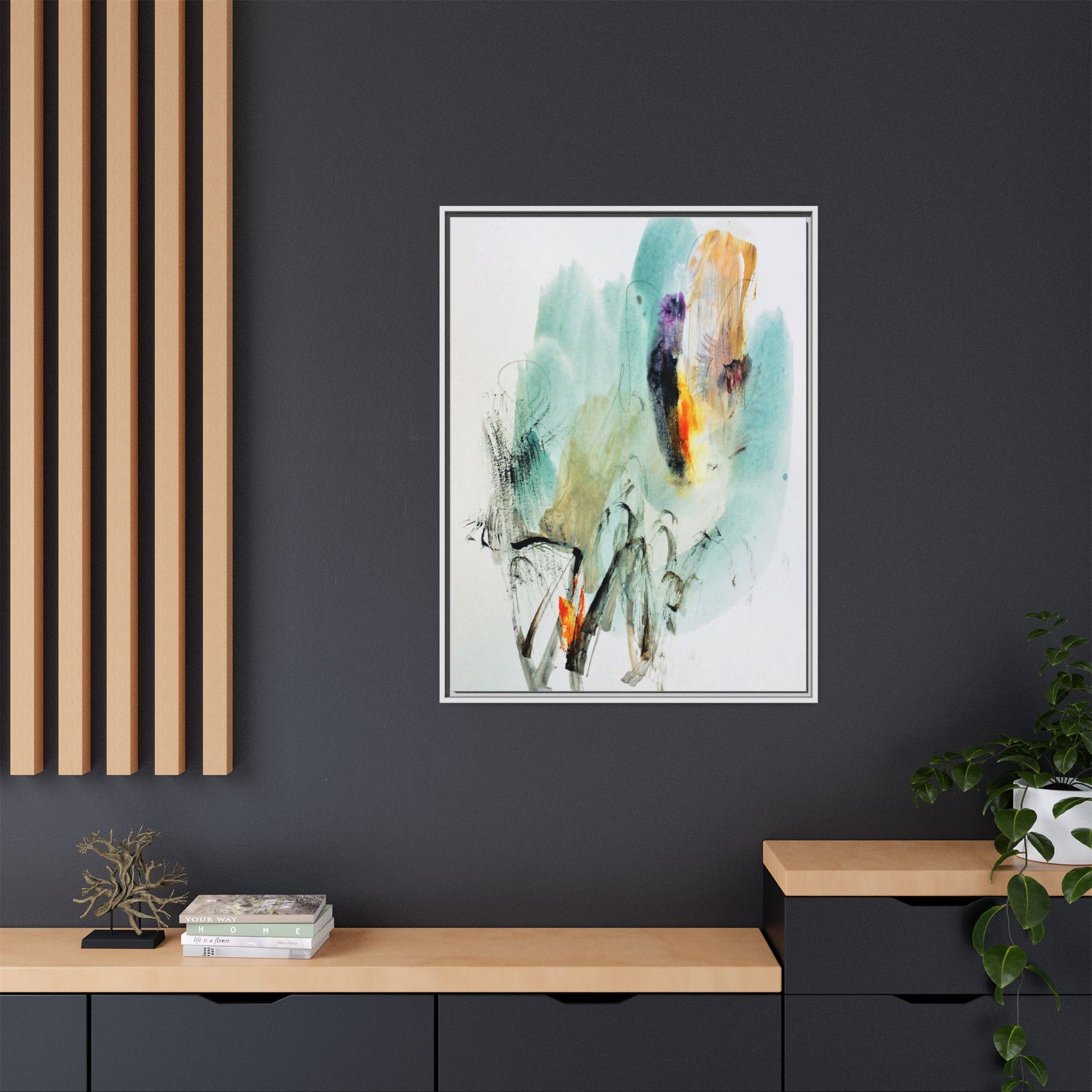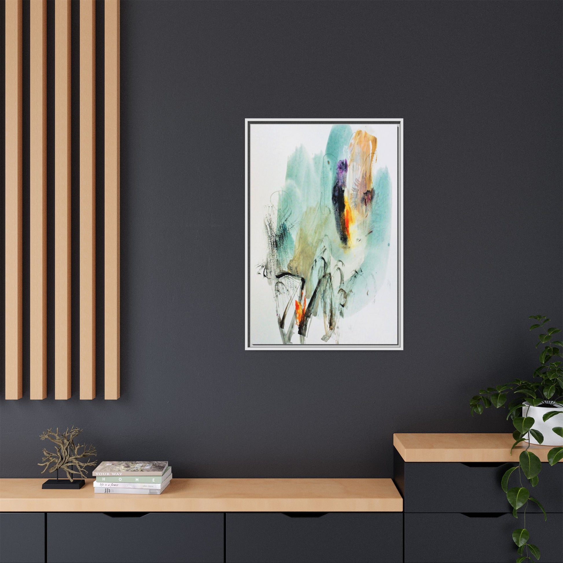 This captivating abstract watercolor painting features a dynamic composition of soft, ethereal teal and aquamarine backgrounds blended with muted yellows, oranges, and touches of purple. Fluid brushstrokes and organic shapes create a sense of movement and spontaneity, with gestural black and gray lines weaving throughout the image. Vibrant bursts of fiery orange and red punctuate the painting, providing striking contrast against the cool, watery color palette. The artwork appears to be created using a combination of watercolor, ink, and possibly other mixed media techniques, giving it a rich, layered texture. The painting evokes a sense of natural elements - perhaps suggesting landscapes, water, or atmospheric phenomena through its abstract, impressionistic style.