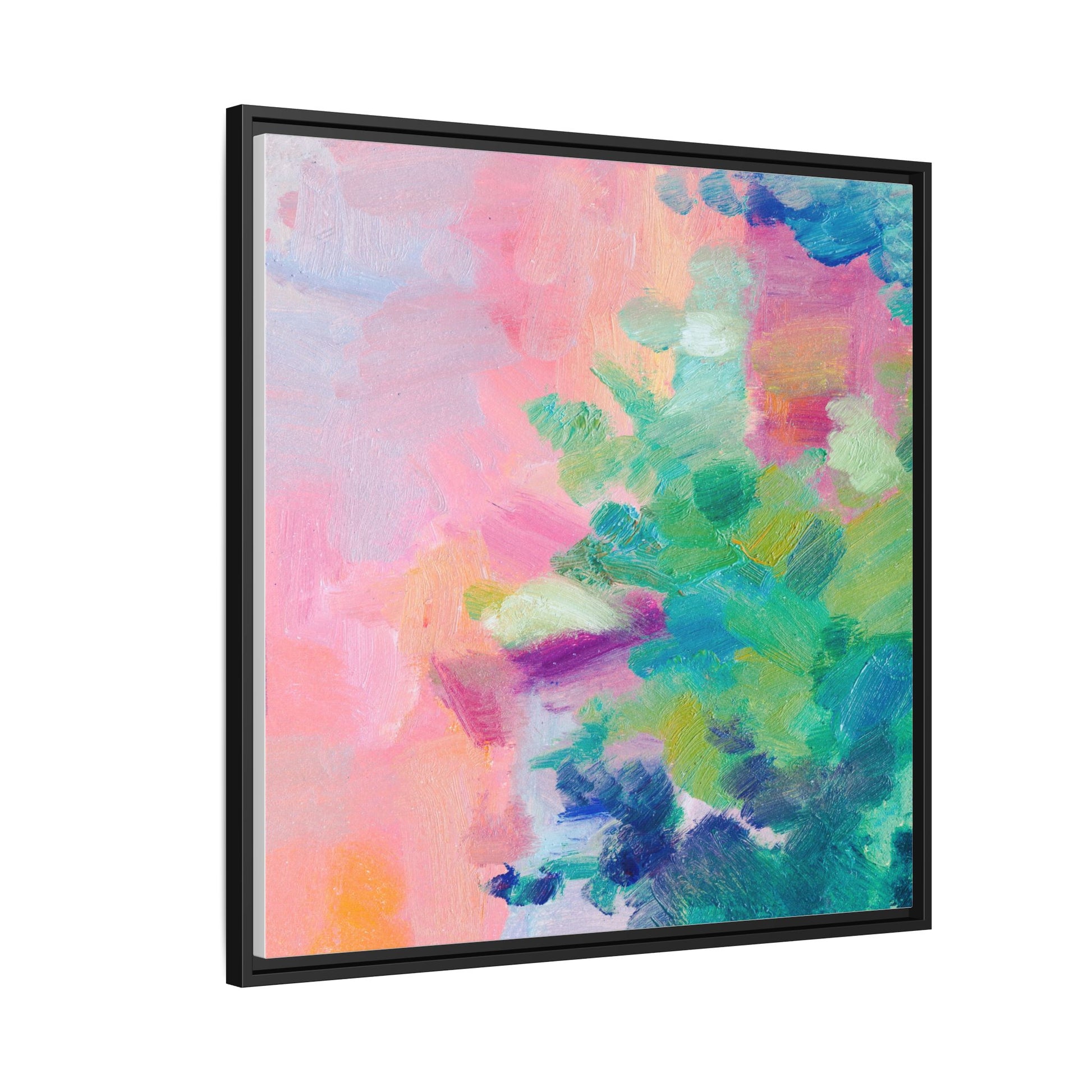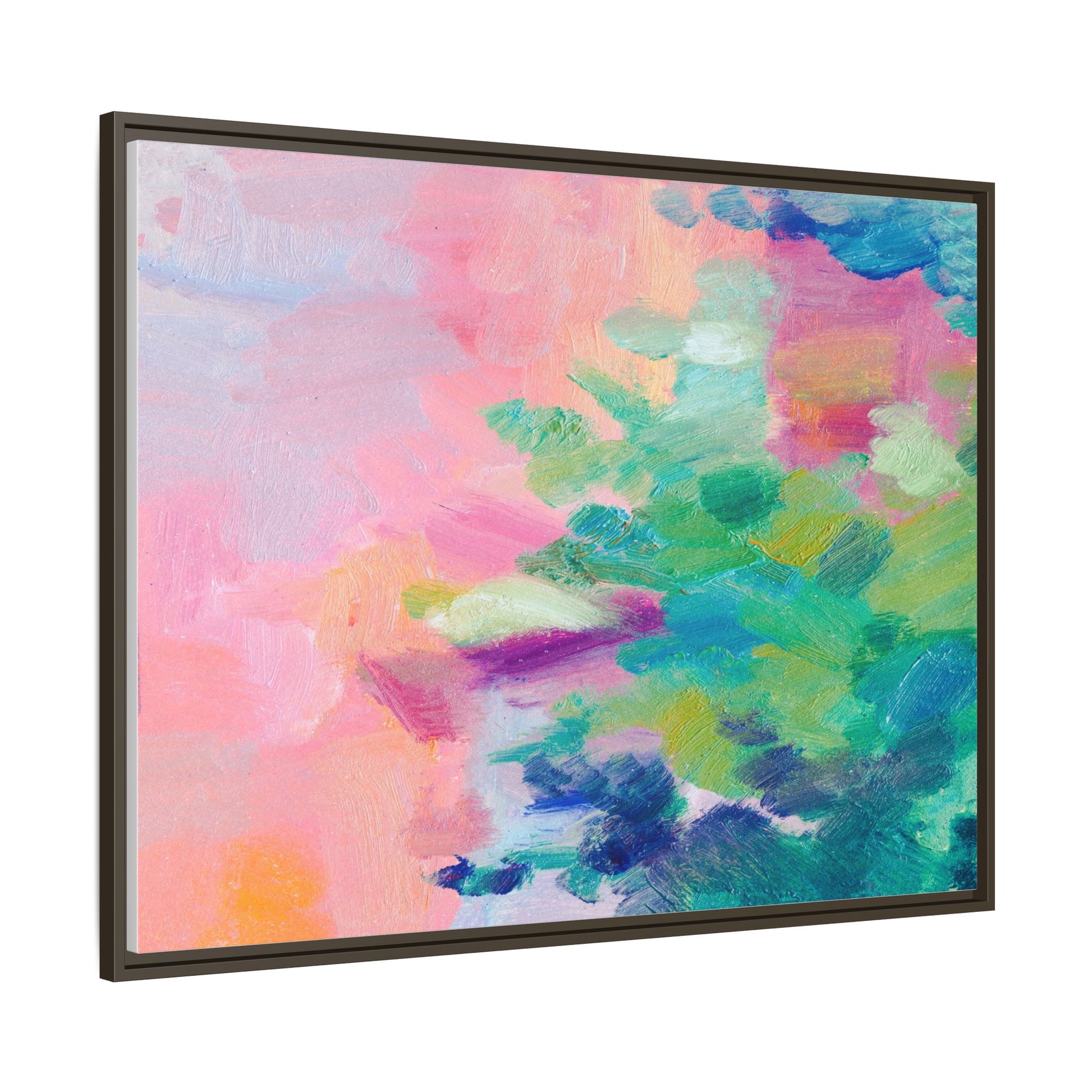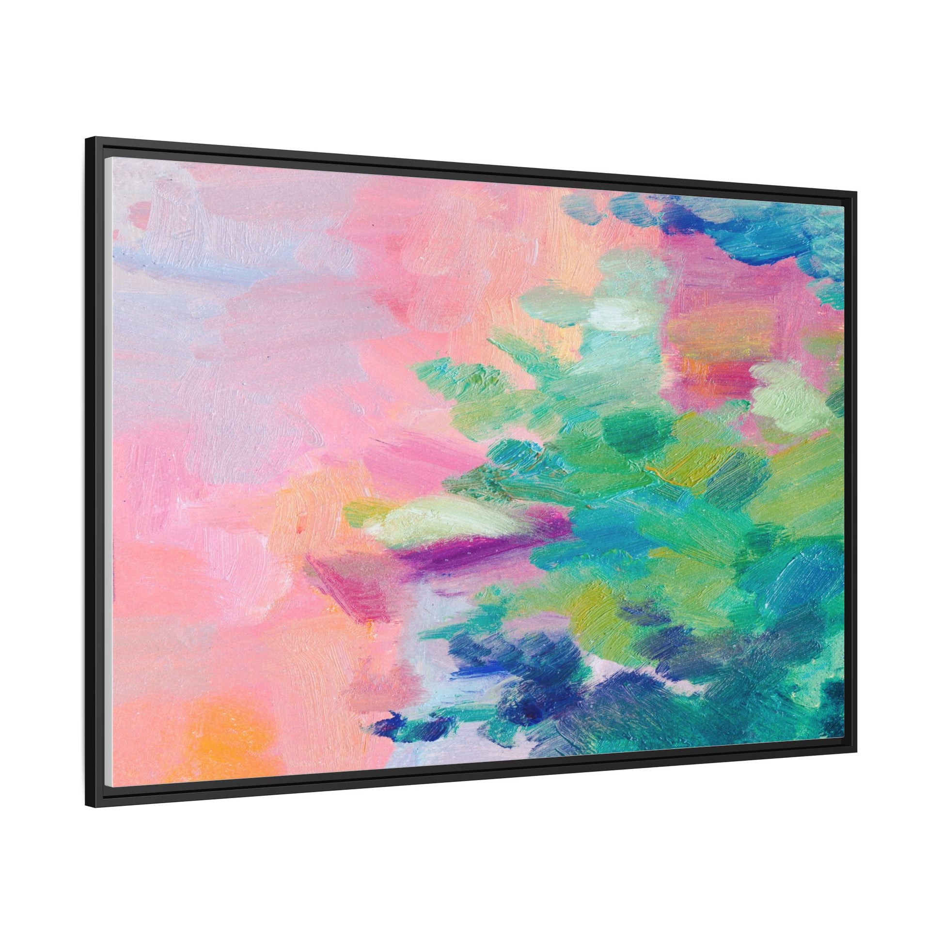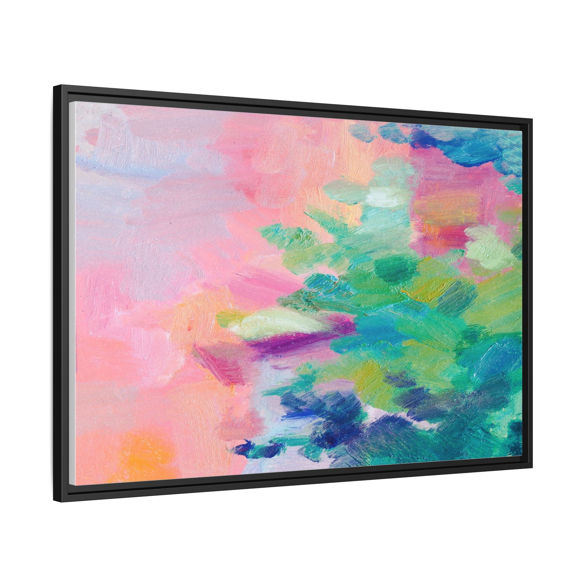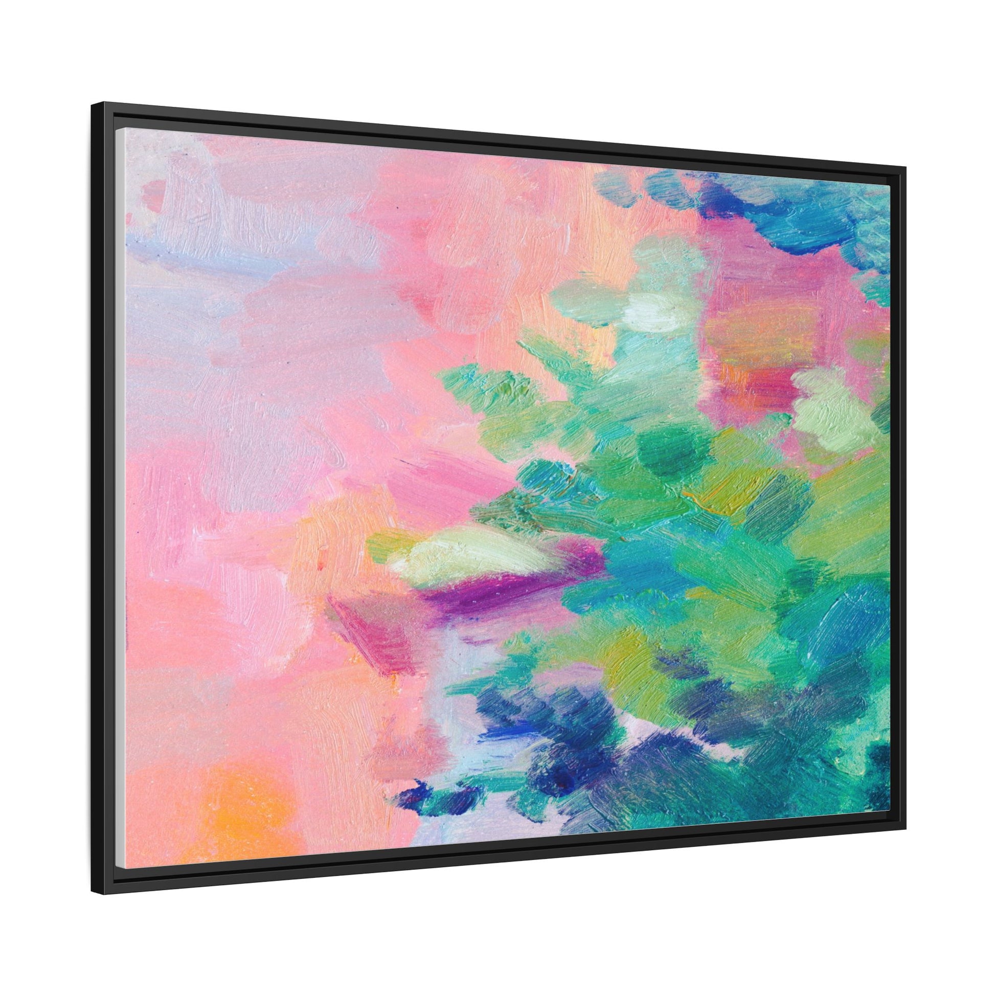 This vibrant abstract painting showcases a mesmerizing blend of soft pastel and bold, dynamic colors. The artwork features sweeping brushstrokes in shades of pink, green, blue, turquoise, and yellow, creating a fluid and organic composition. Textured layers of paint overlap and intertwine, giving the piece a sense of depth and movement. The color palette transitions smoothly from warm pink and peach tones on the left to cooler green and blue hues on the right, creating a harmonious visual flow. The painting appears to be created with oil or acrylic paints, with visible texture and impasto techniques that add rich dimensionality to the artwork.