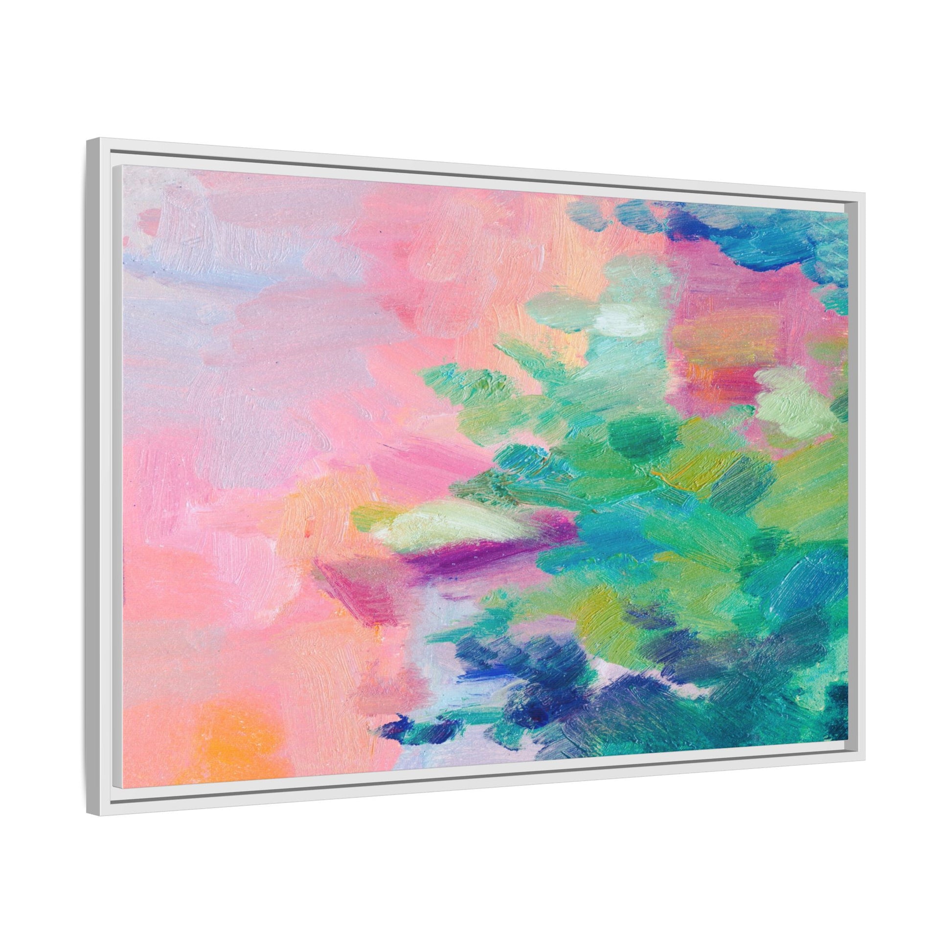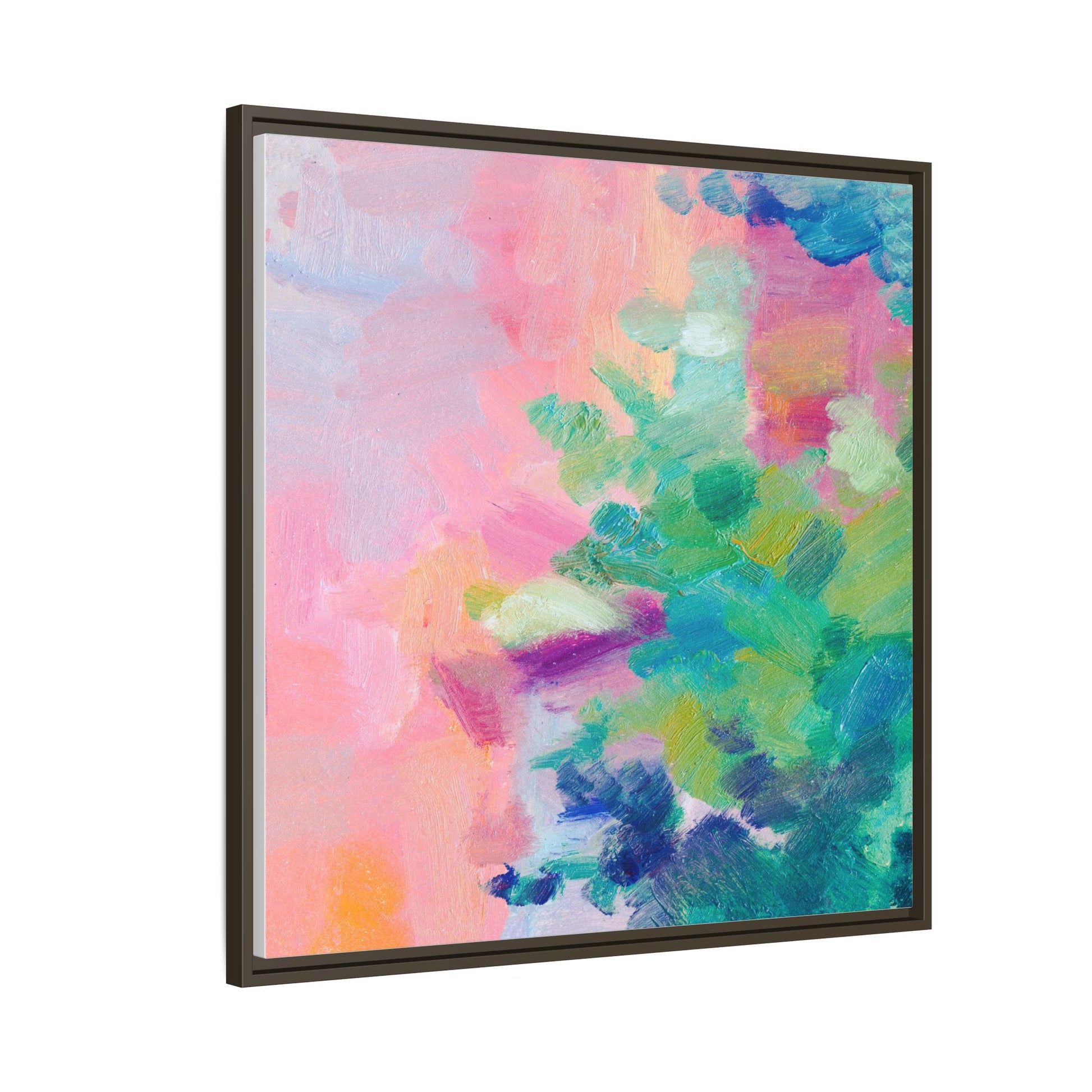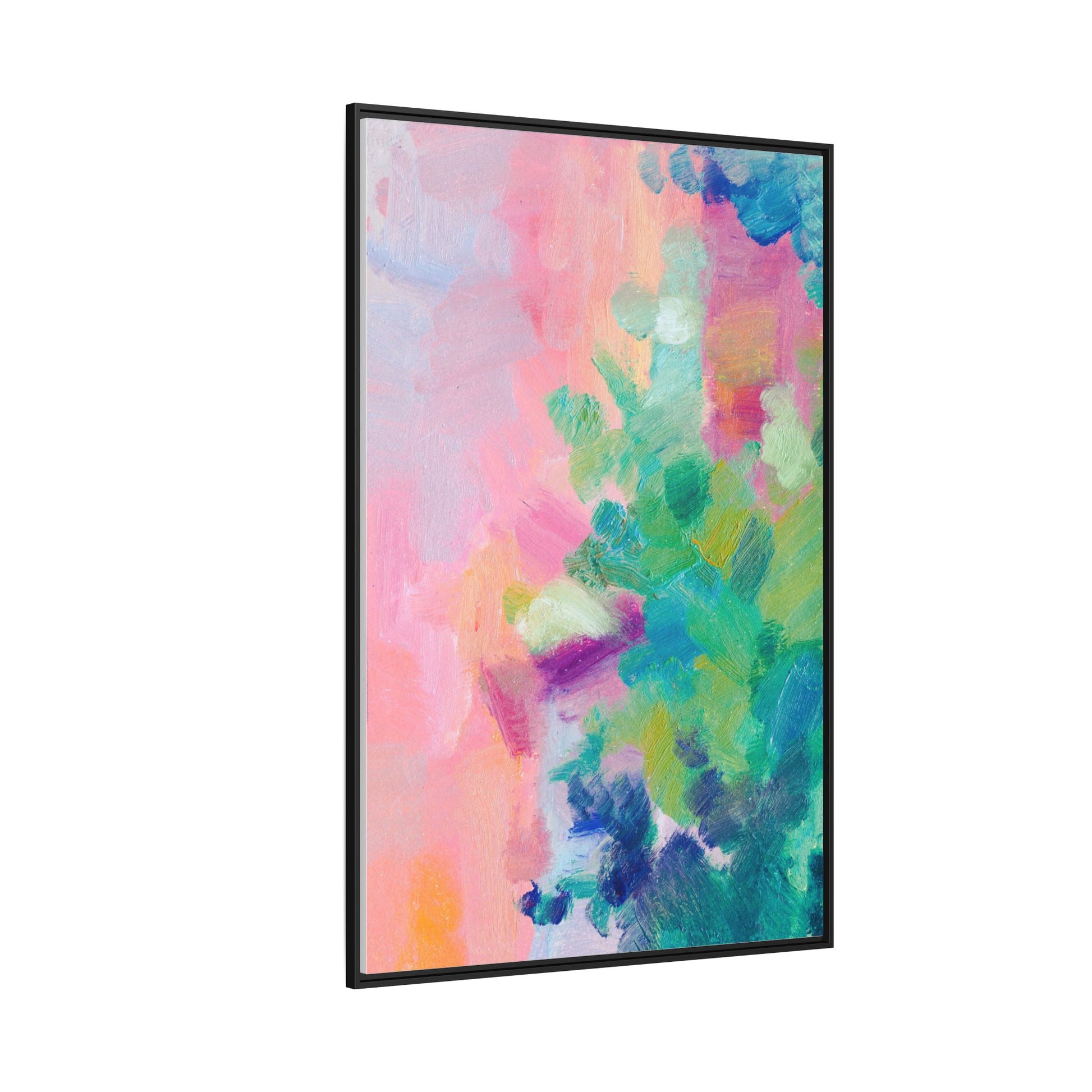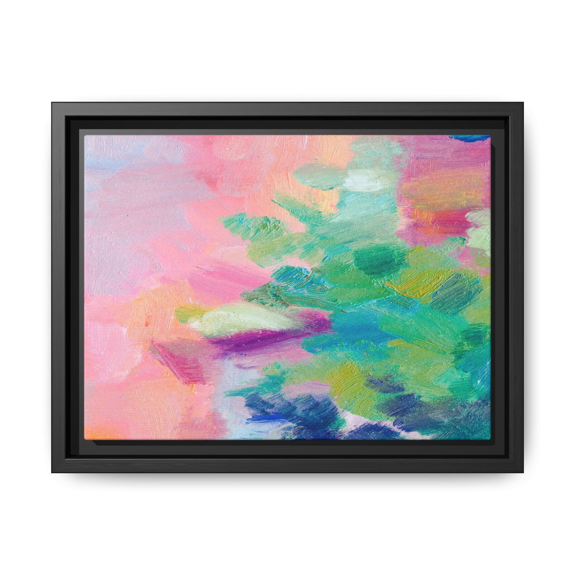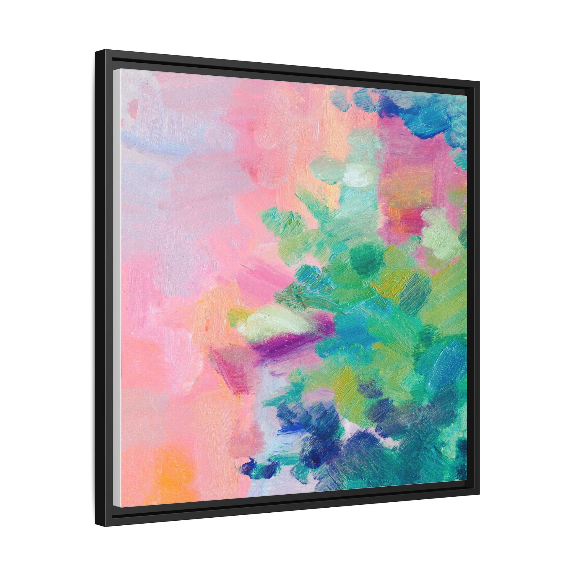 This vibrant abstract painting showcases a mesmerizing blend of soft pastel and bold, dynamic colors. The artwork features sweeping brushstrokes in shades of pink, green, blue, turquoise, and yellow, creating a fluid and organic composition. Textured layers of paint overlap and intertwine, giving the piece a sense of depth and movement. The color palette transitions smoothly from warm pink and peach tones on the left to cooler green and blue hues on the right, creating a harmonious visual flow. The painting appears to be created with oil or acrylic paints, with visible texture and impasto techniques that add rich dimensionality to the artwork.