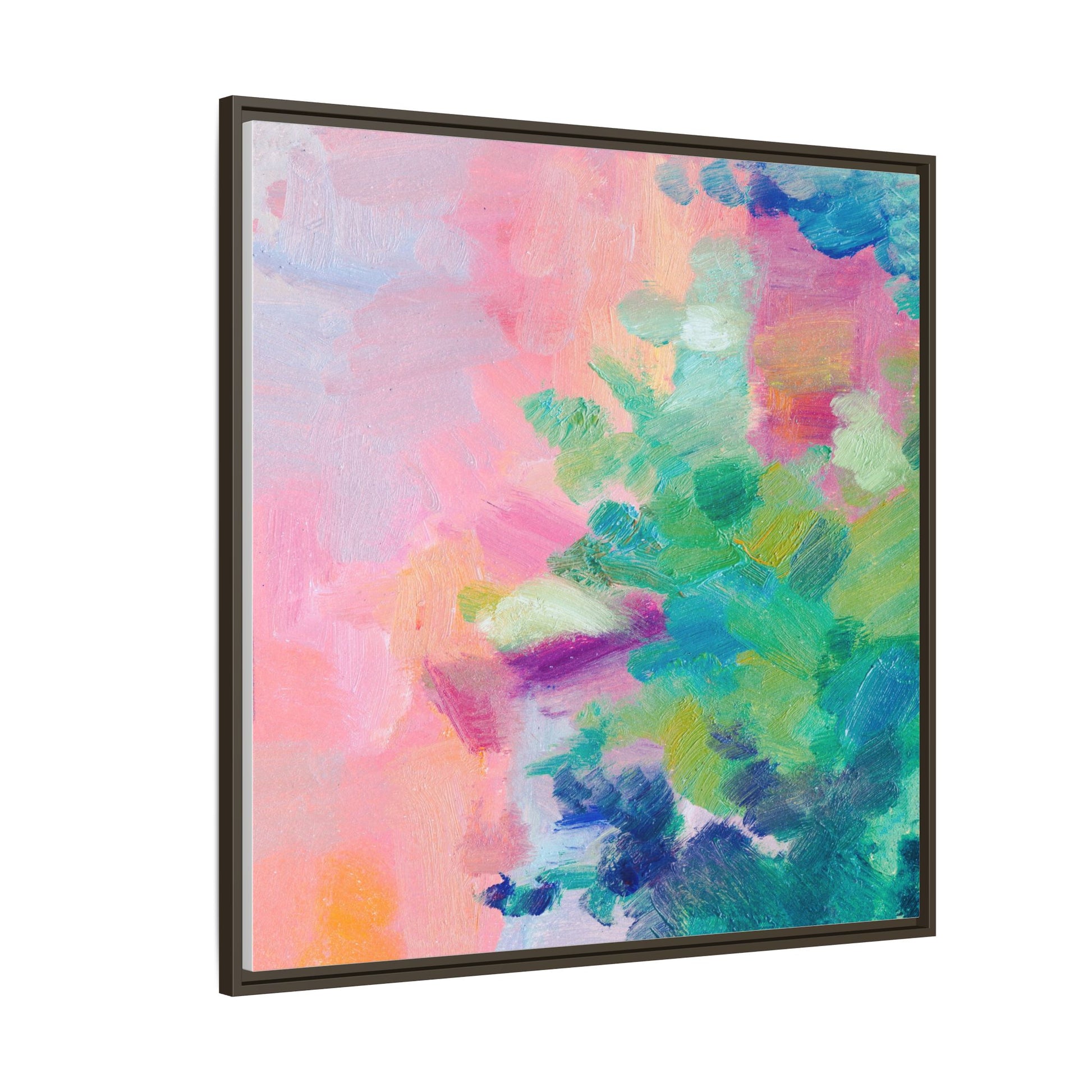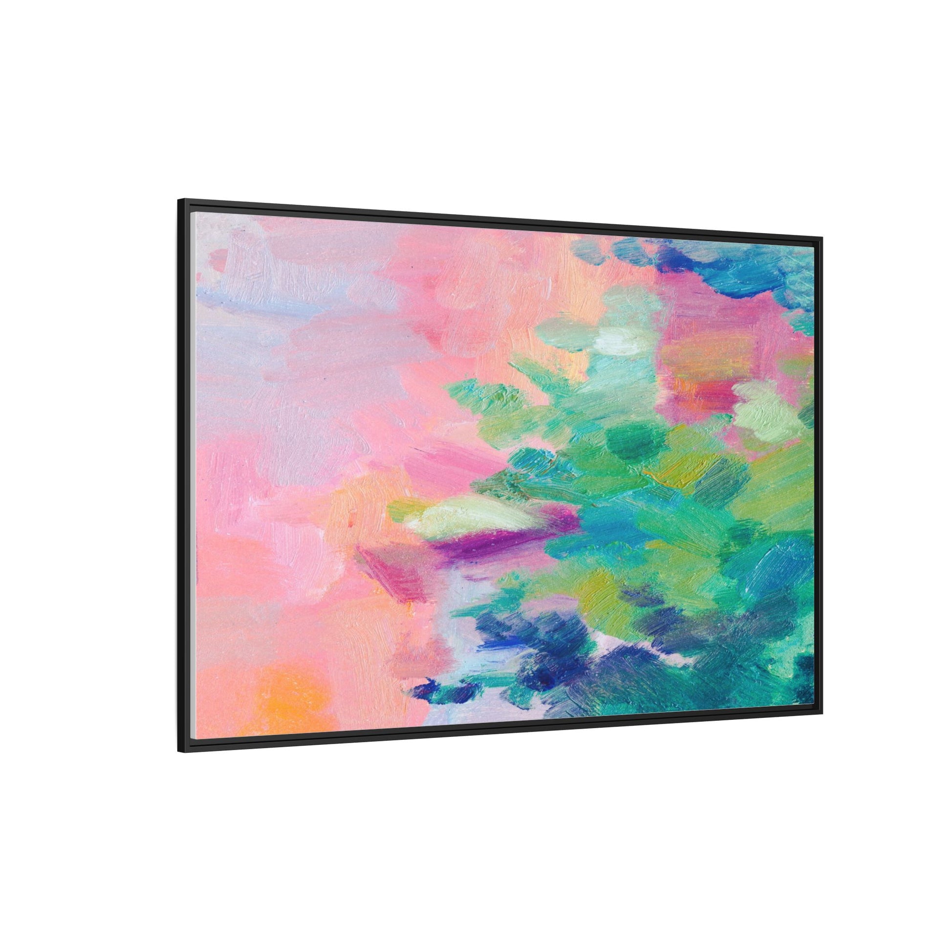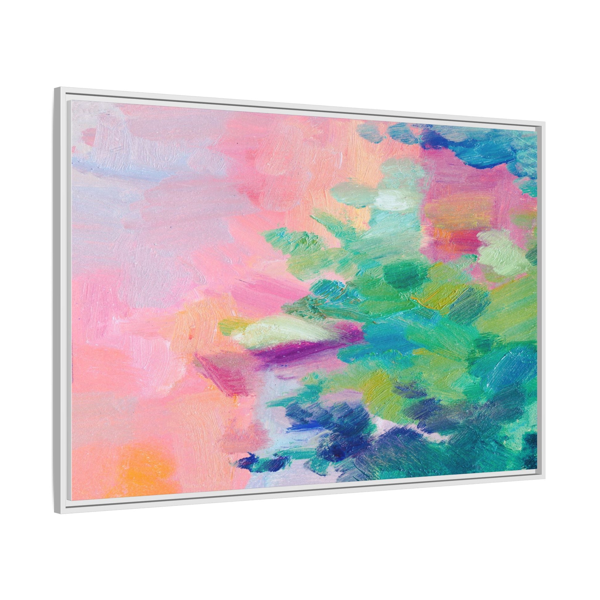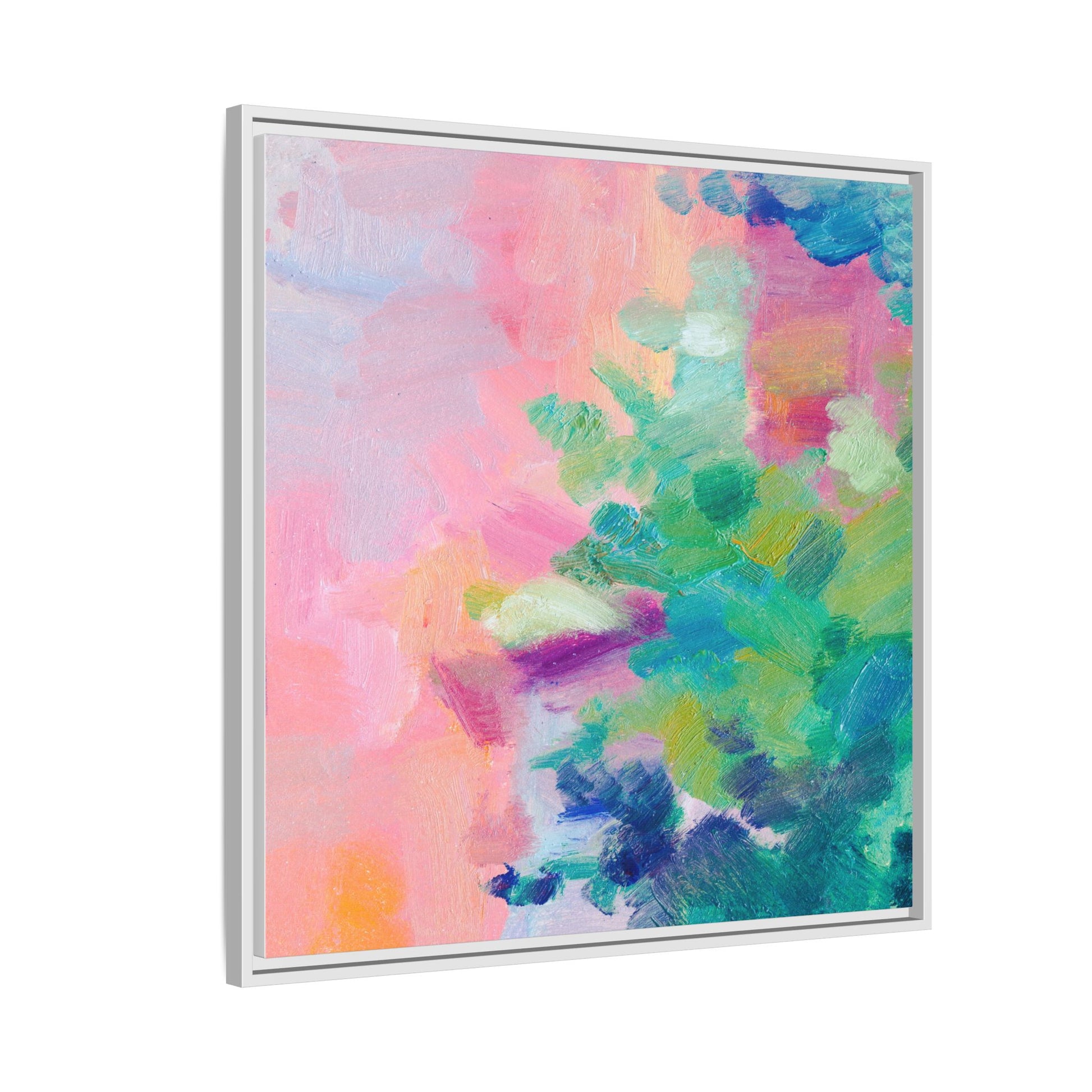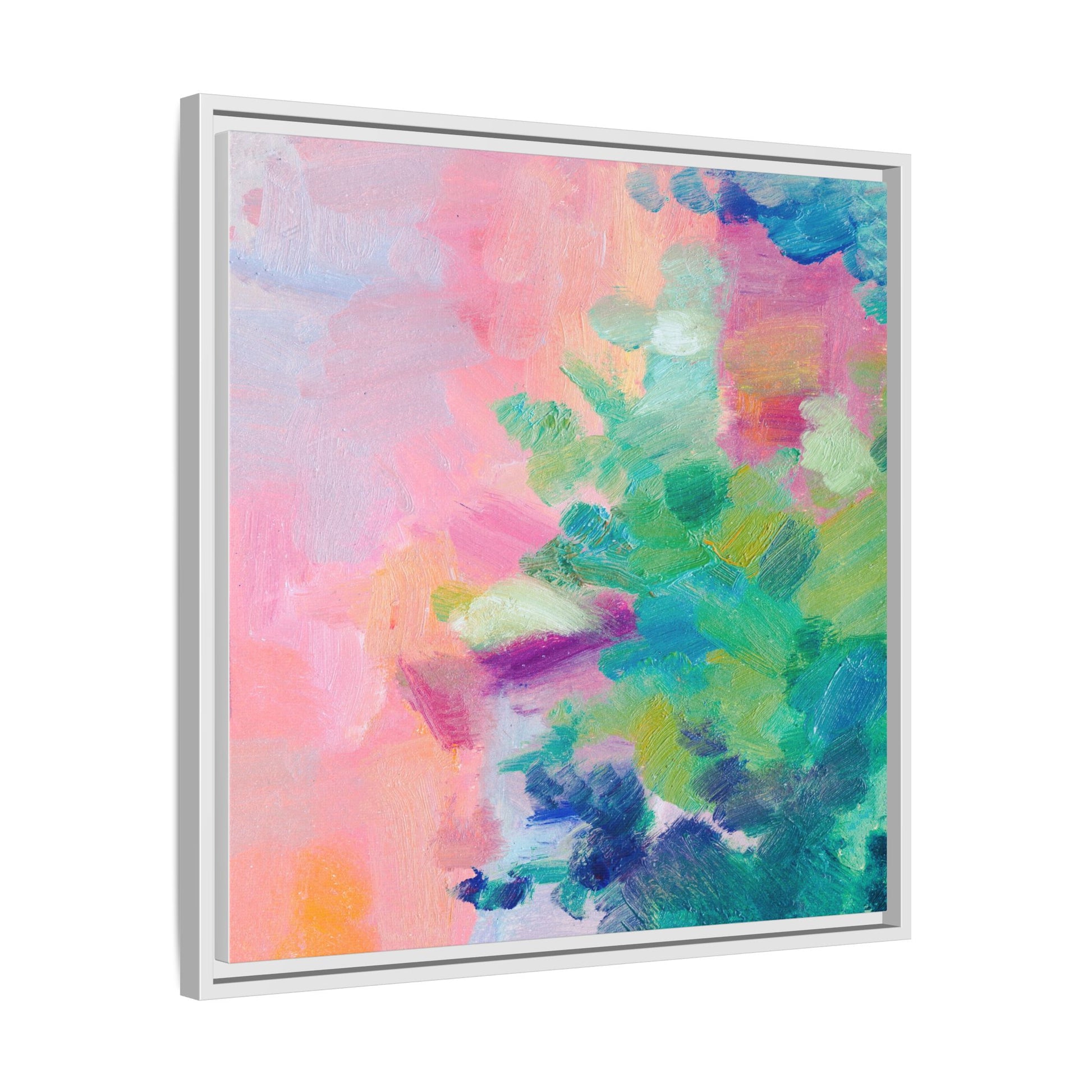 This vibrant abstract painting showcases a mesmerizing blend of soft pastel and bold, dynamic colors. The artwork features sweeping brushstrokes in shades of pink, green, blue, turquoise, and yellow, creating a fluid and organic composition. Textured layers of paint overlap and intertwine, giving the piece a sense of depth and movement. The color palette transitions smoothly from warm pink and peach tones on the left to cooler green and blue hues on the right, creating a harmonious visual flow. The painting appears to be created with oil or acrylic paints, with visible texture and impasto techniques that add rich dimensionality to the artwork.