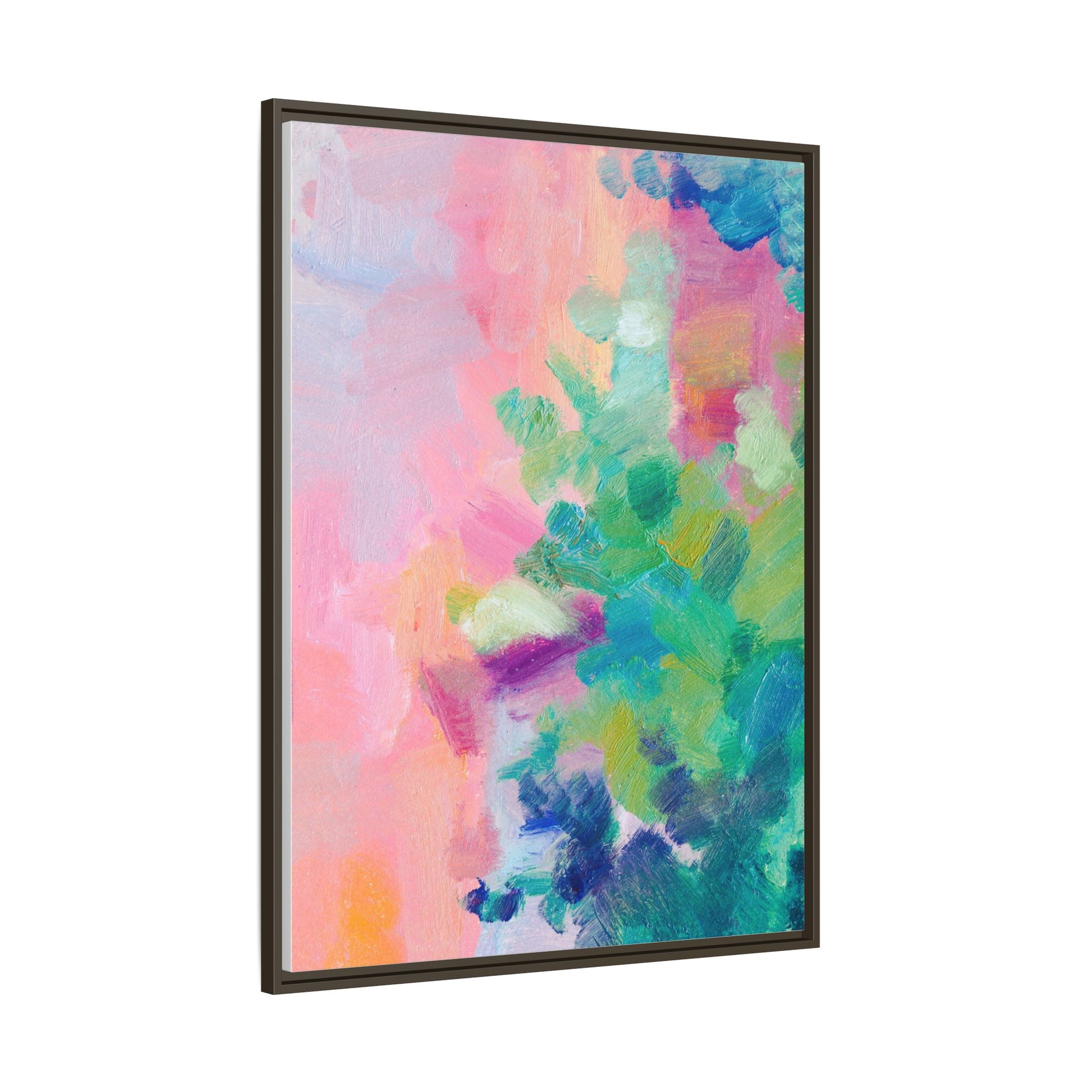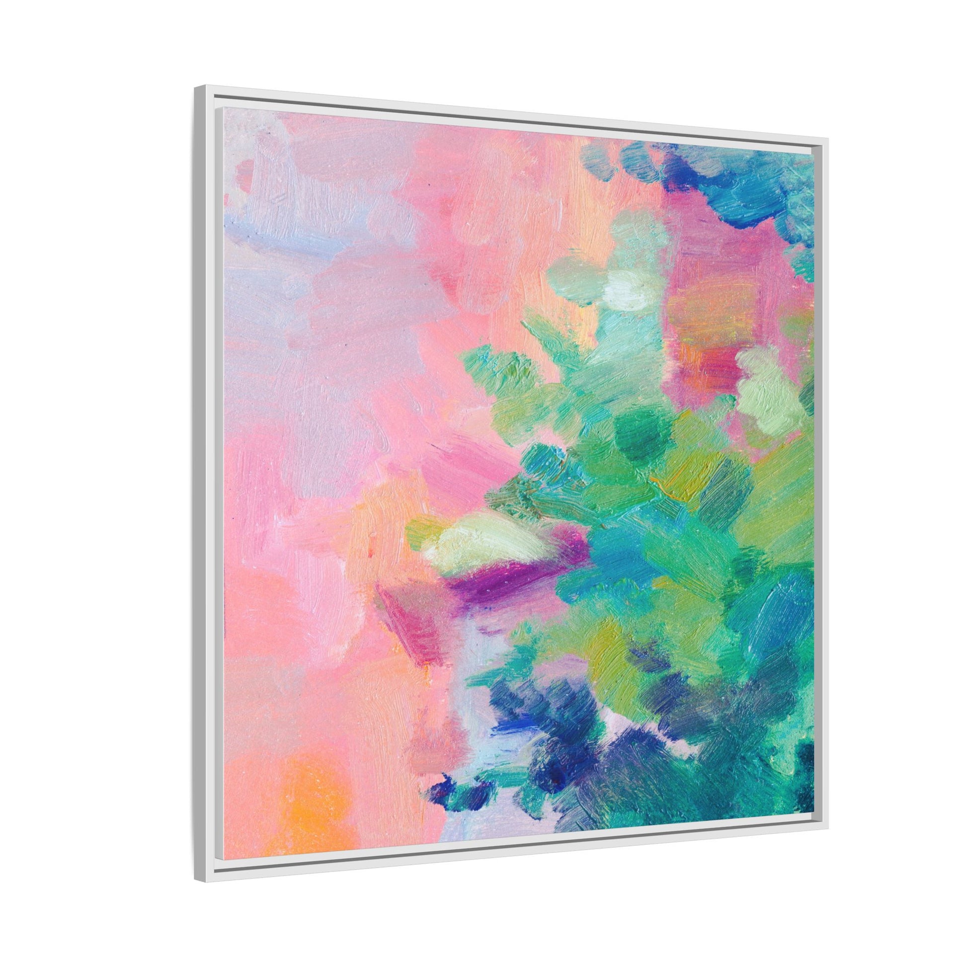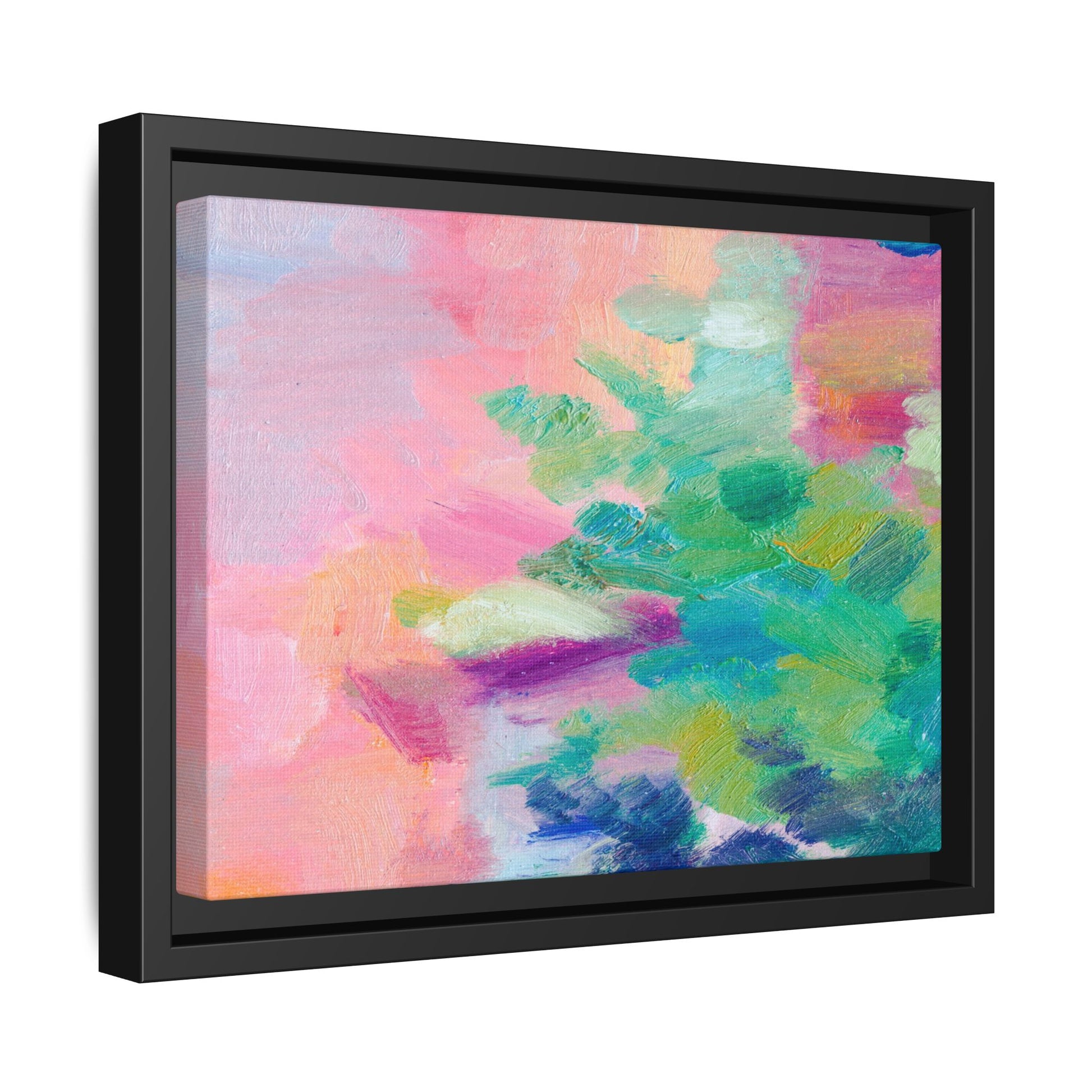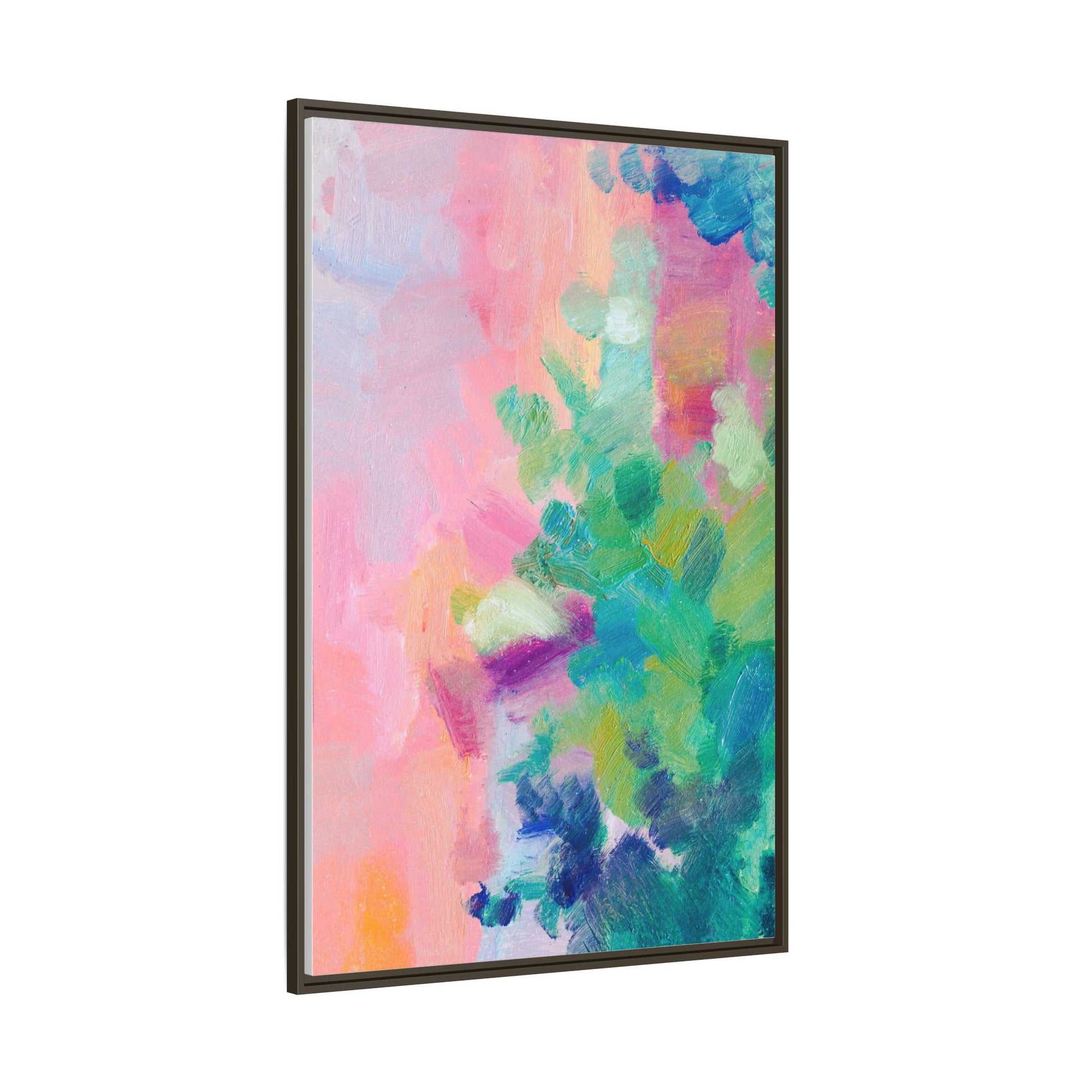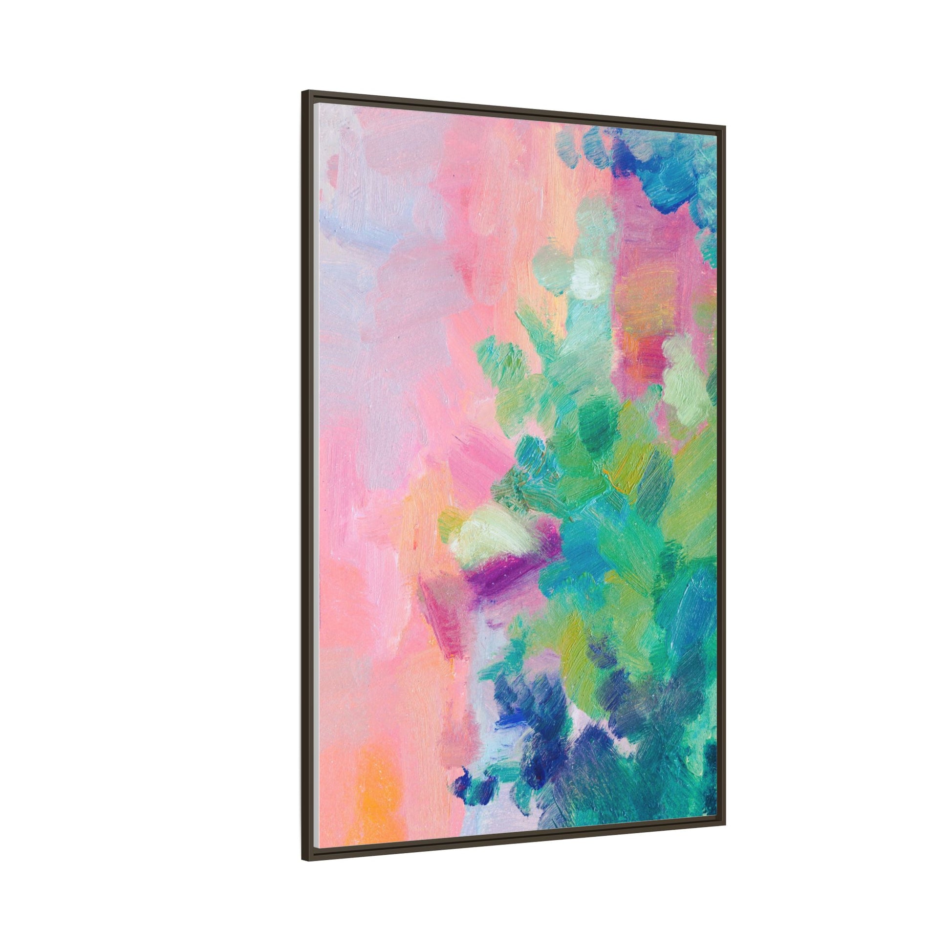 This vibrant abstract painting showcases a mesmerizing blend of soft pastel and bold, dynamic colors. The artwork features sweeping brushstrokes in shades of pink, green, blue, turquoise, and yellow, creating a fluid and organic composition. Textured layers of paint overlap and intertwine, giving the piece a sense of depth and movement. The color palette transitions smoothly from warm pink and peach tones on the left to cooler green and blue hues on the right, creating a harmonious visual flow. The painting appears to be created with oil or acrylic paints, with visible texture and impasto techniques that add rich dimensionality to the artwork.