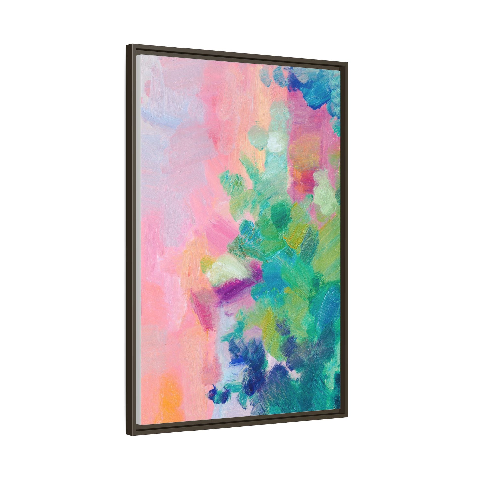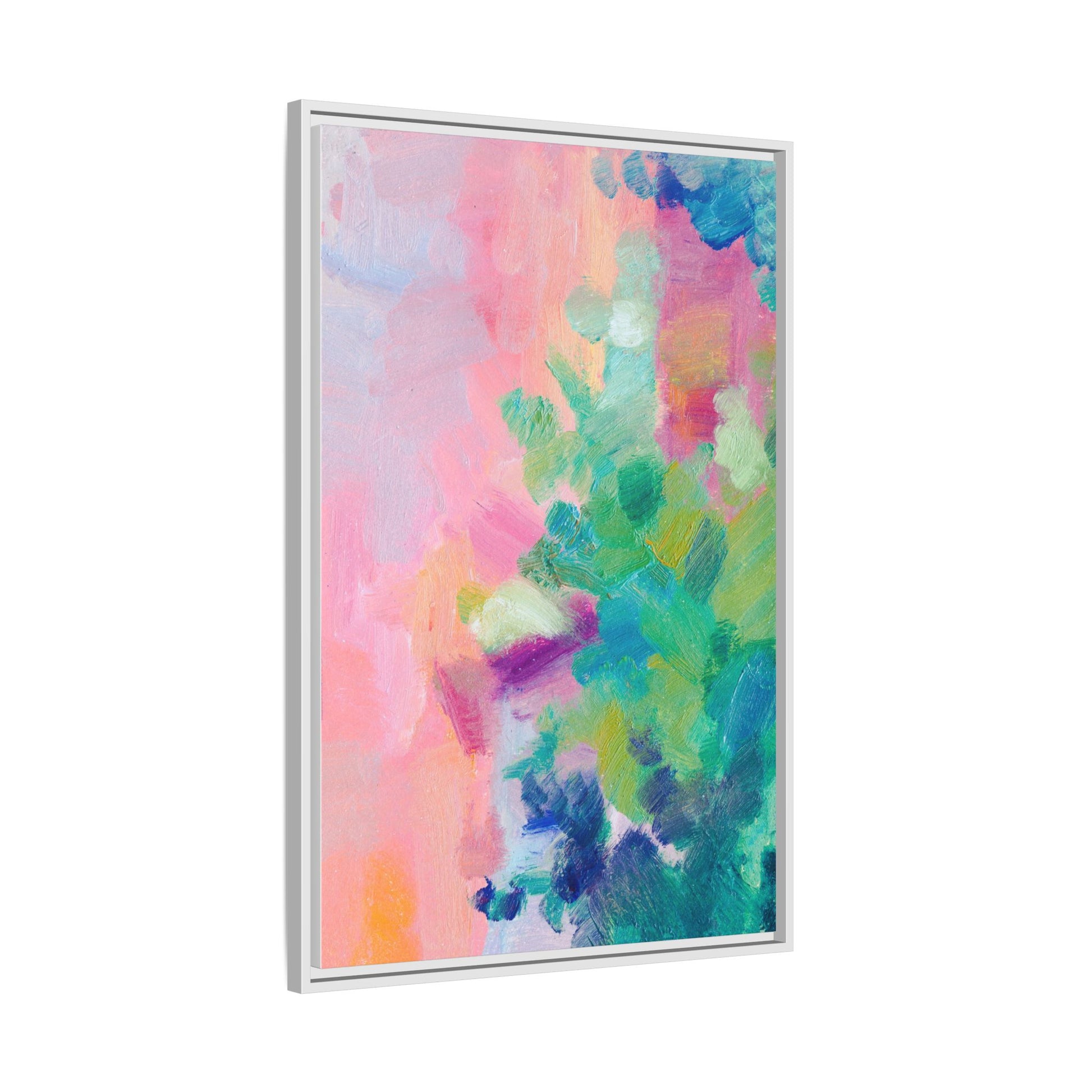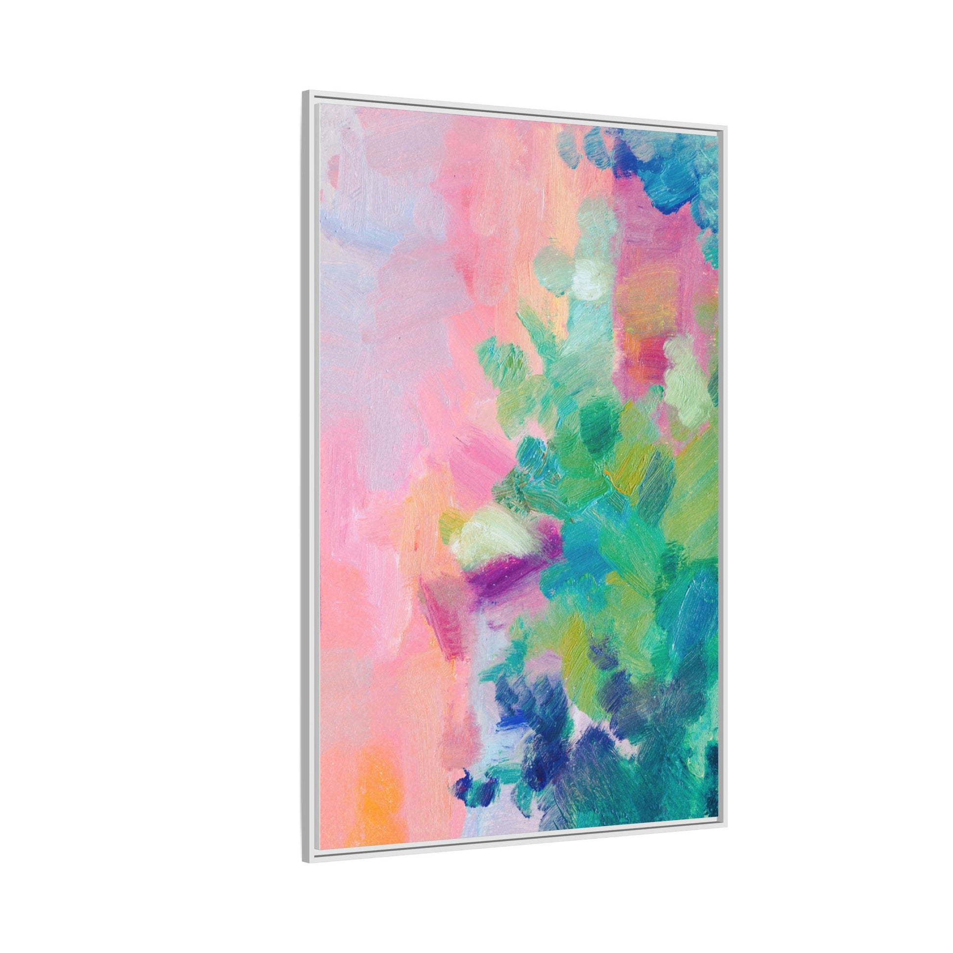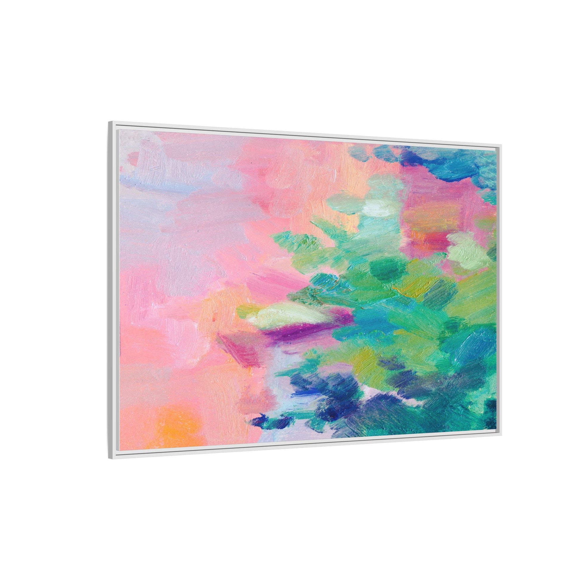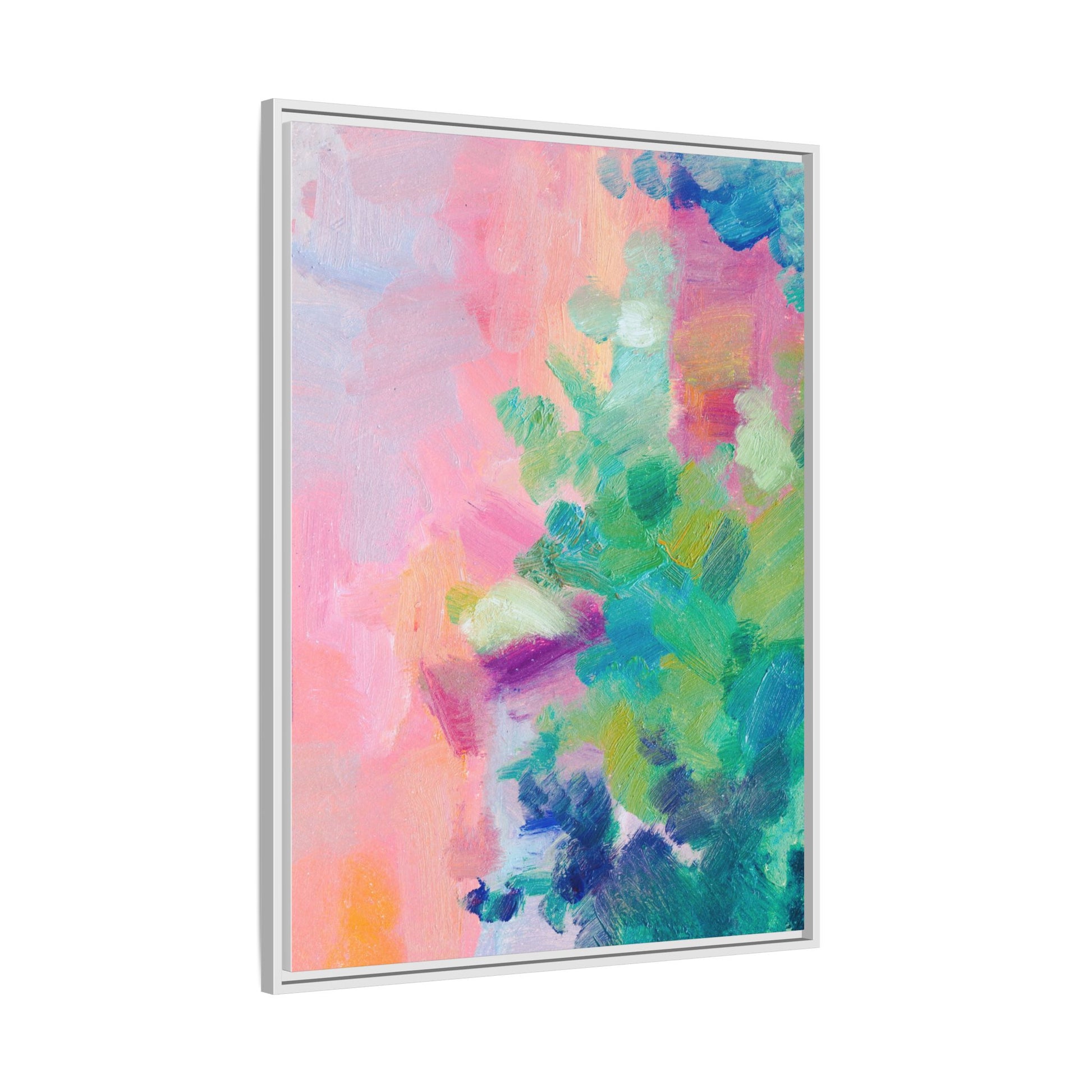 This vibrant abstract painting showcases a mesmerizing blend of soft pastel and bold, dynamic colors. The artwork features sweeping brushstrokes in shades of pink, green, blue, turquoise, and yellow, creating a fluid and organic composition. Textured layers of paint overlap and intertwine, giving the piece a sense of depth and movement. The color palette transitions smoothly from warm pink and peach tones on the left to cooler green and blue hues on the right, creating a harmonious visual flow. The painting appears to be created with oil or acrylic paints, with visible texture and impasto techniques that add rich dimensionality to the artwork.