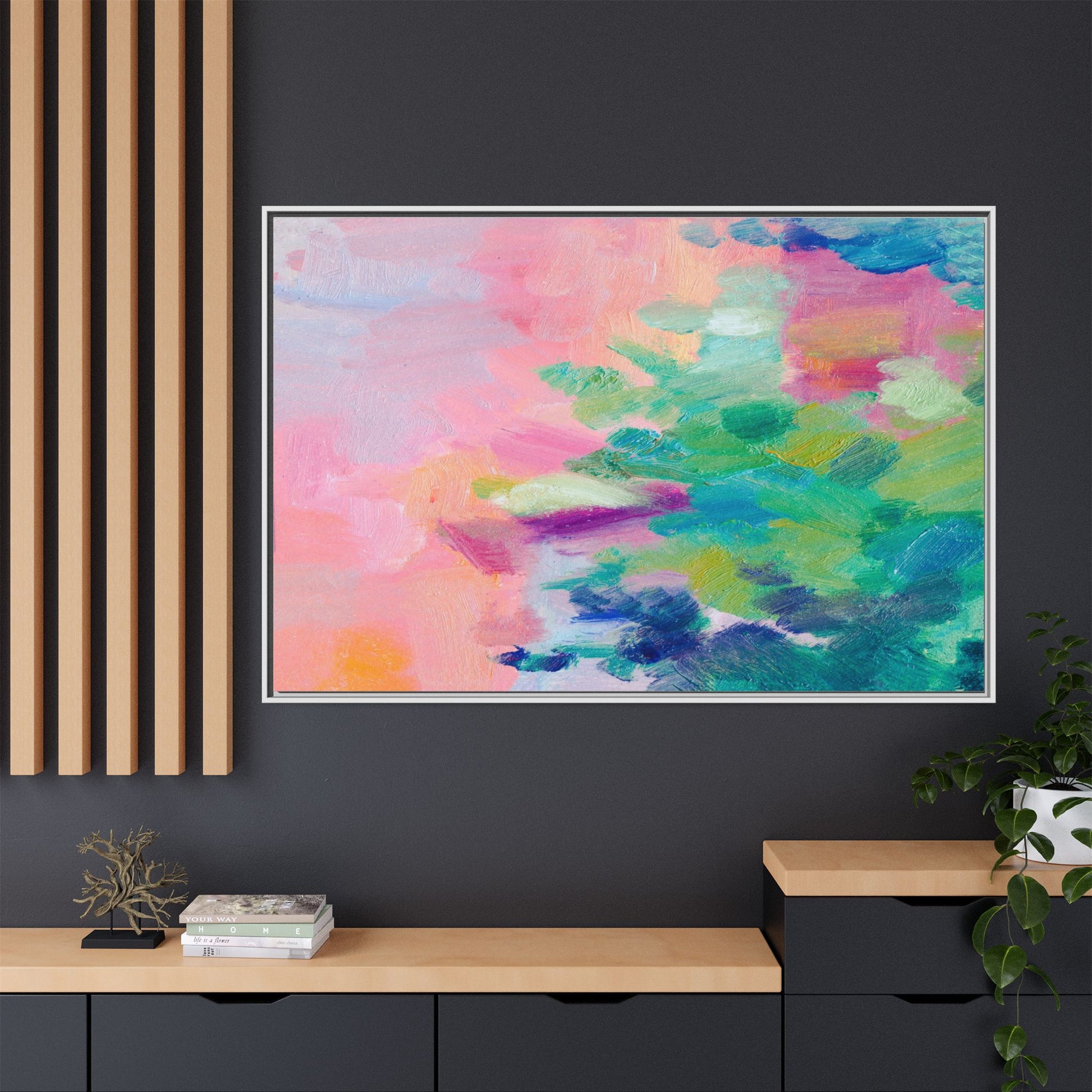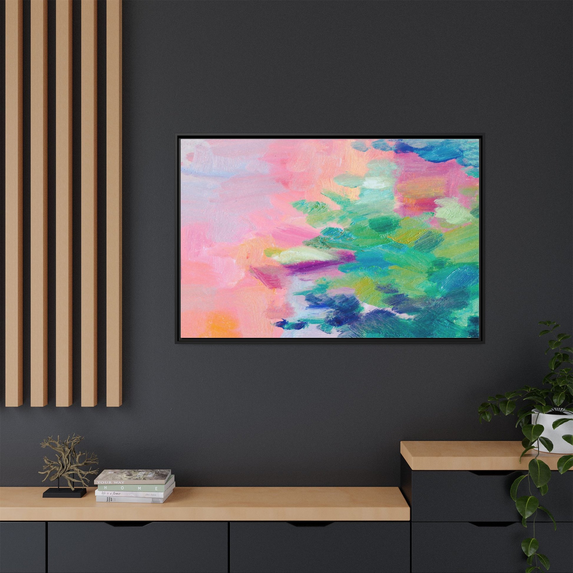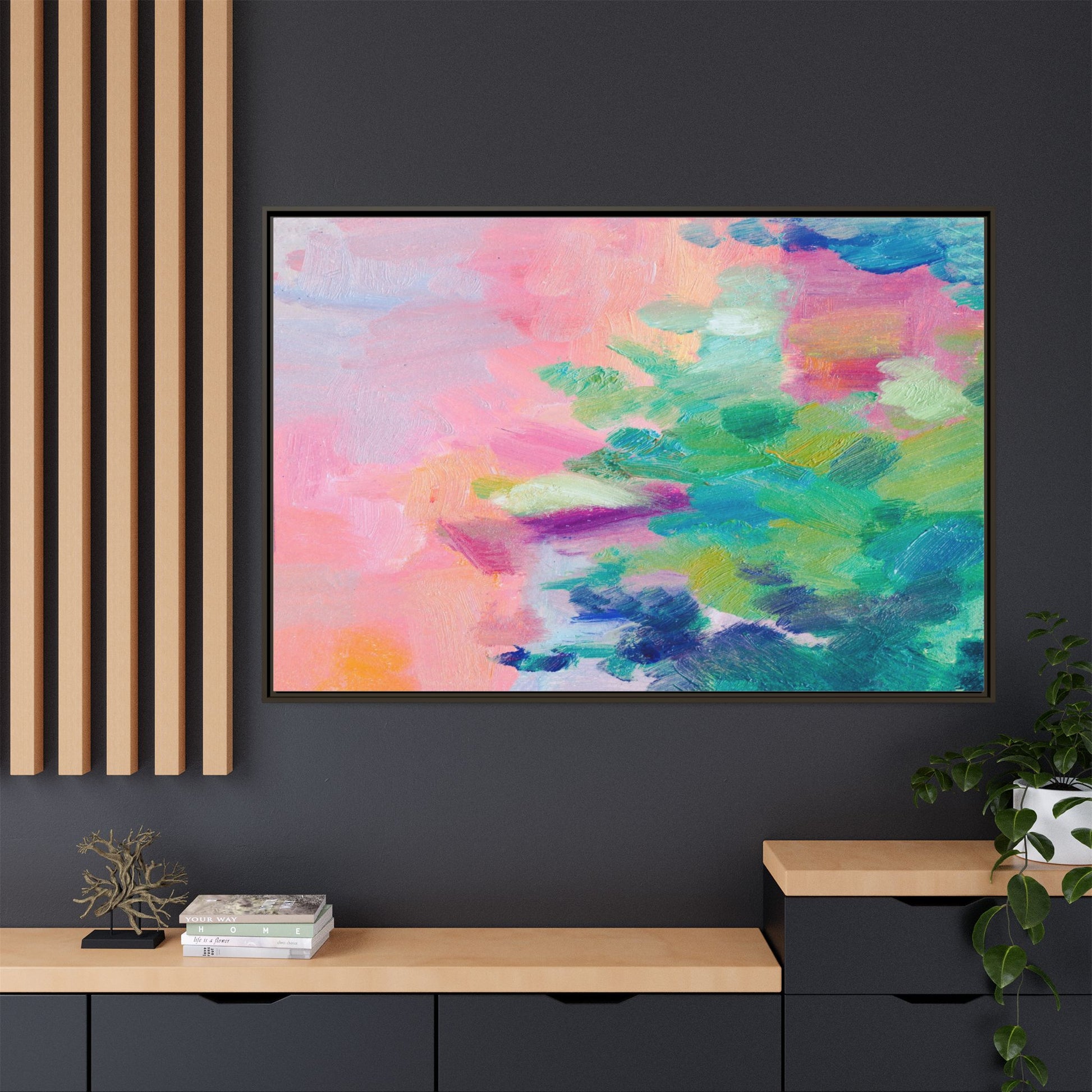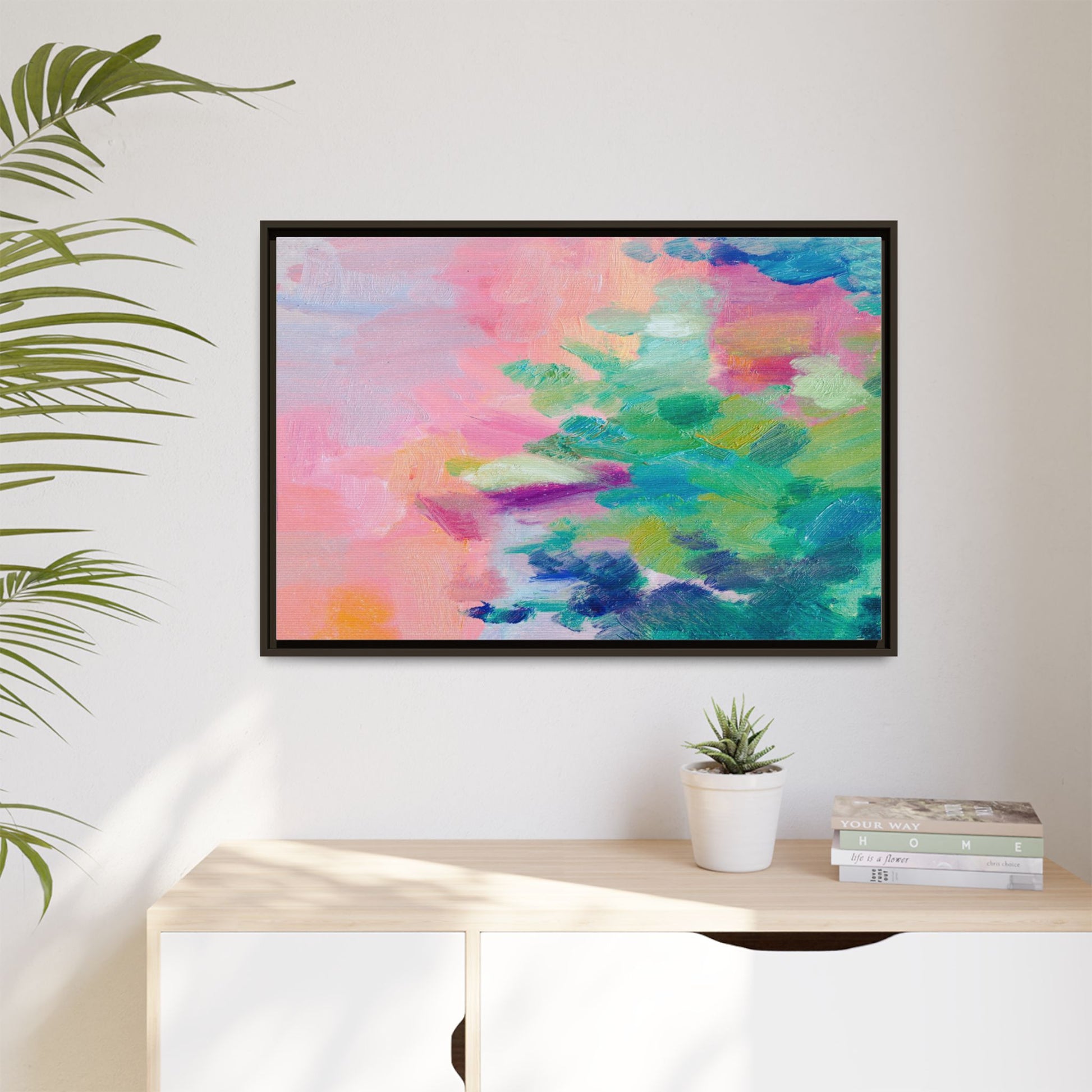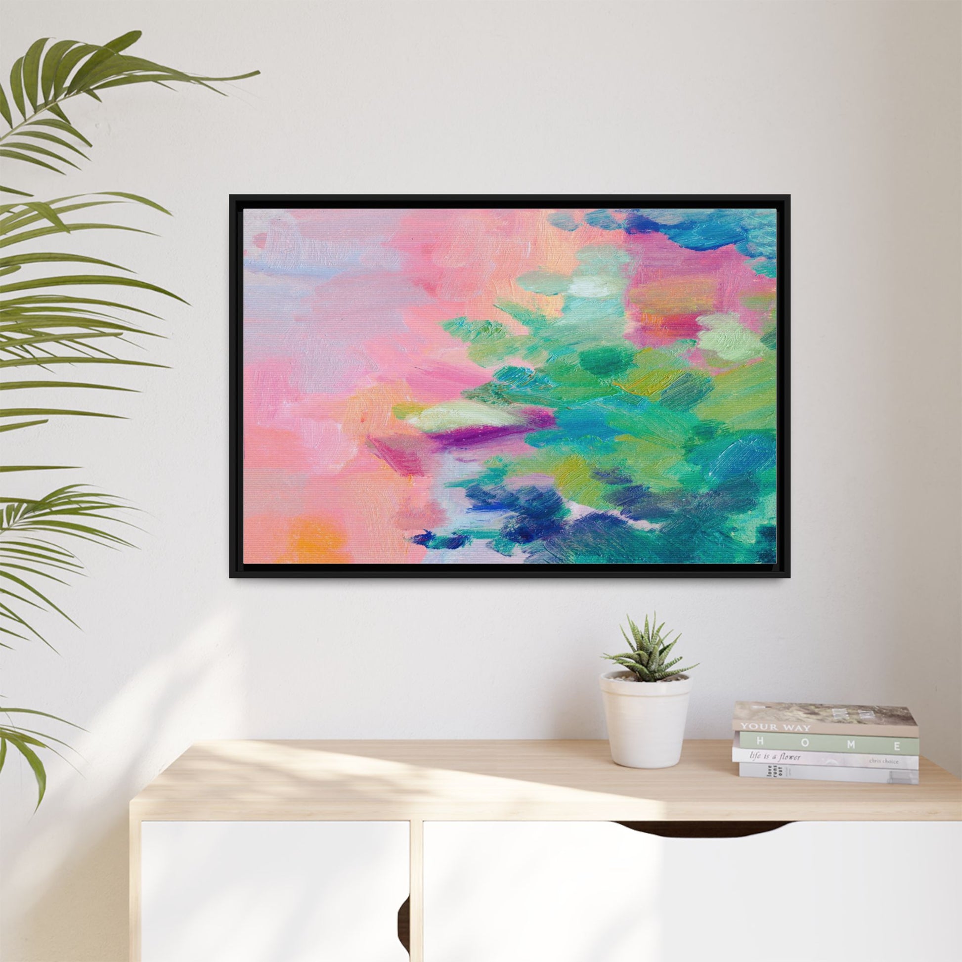 This vibrant abstract painting showcases a mesmerizing blend of soft pastel and bold, dynamic colors. The artwork features sweeping brushstrokes in shades of pink, green, blue, turquoise, and yellow, creating a fluid and organic composition. Textured layers of paint overlap and intertwine, giving the piece a sense of depth and movement. The color palette transitions smoothly from warm pink and peach tones on the left to cooler green and blue hues on the right, creating a harmonious visual flow. The painting appears to be created with oil or acrylic paints, with visible texture and impasto techniques that add rich dimensionality to the artwork.