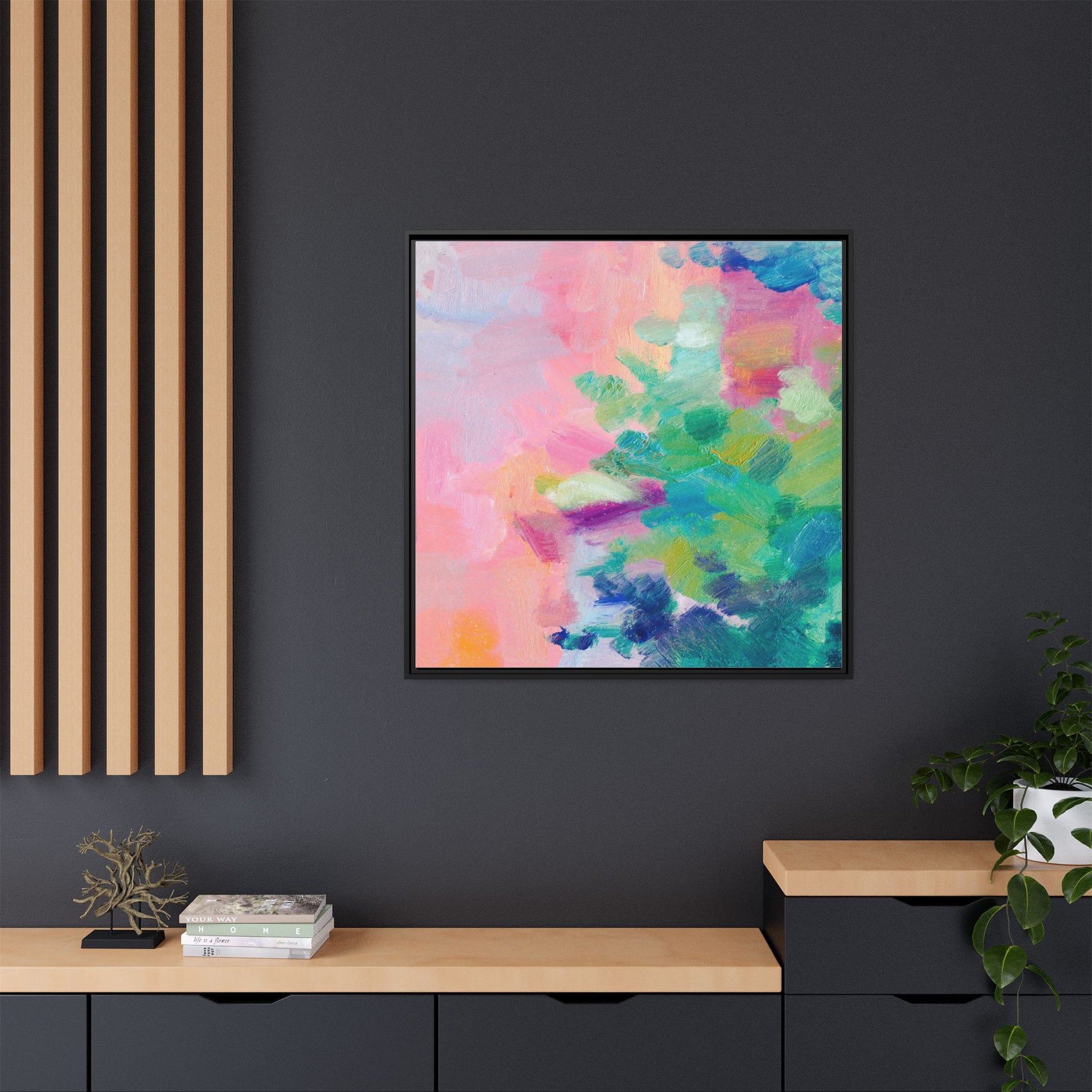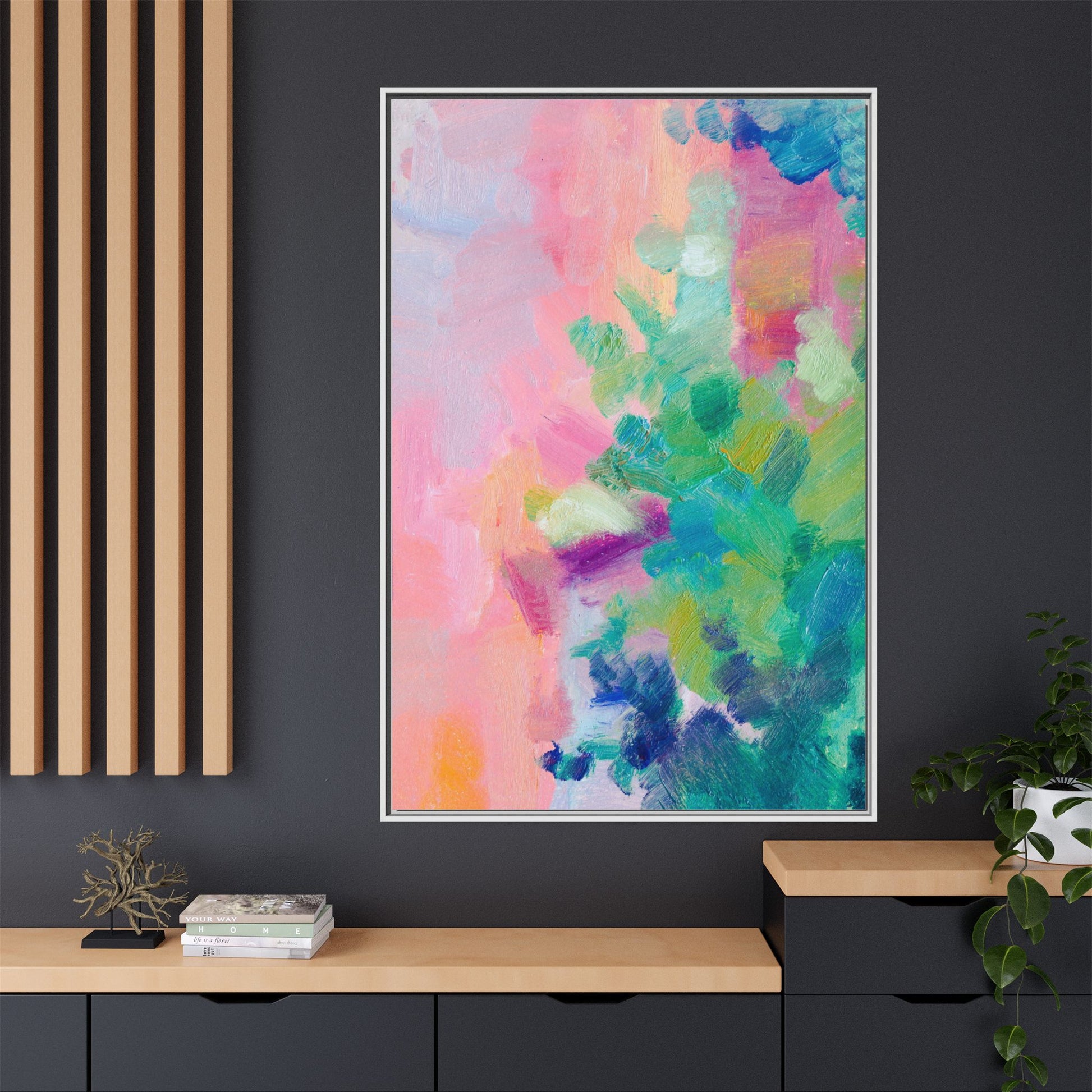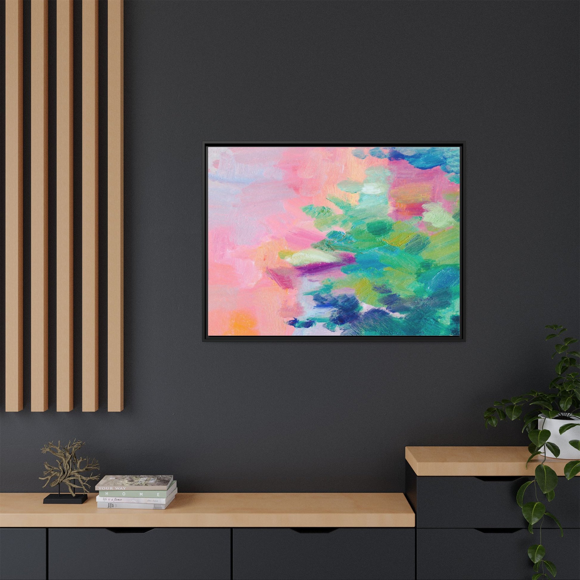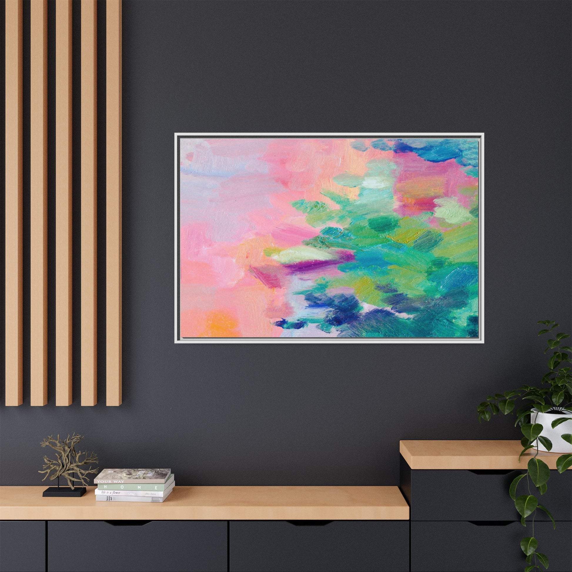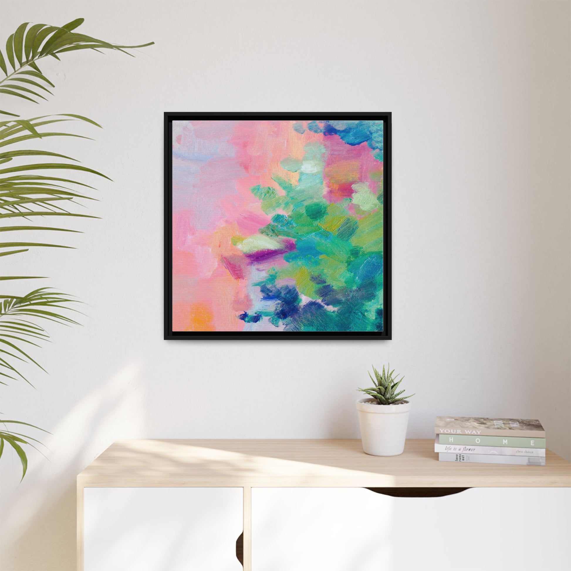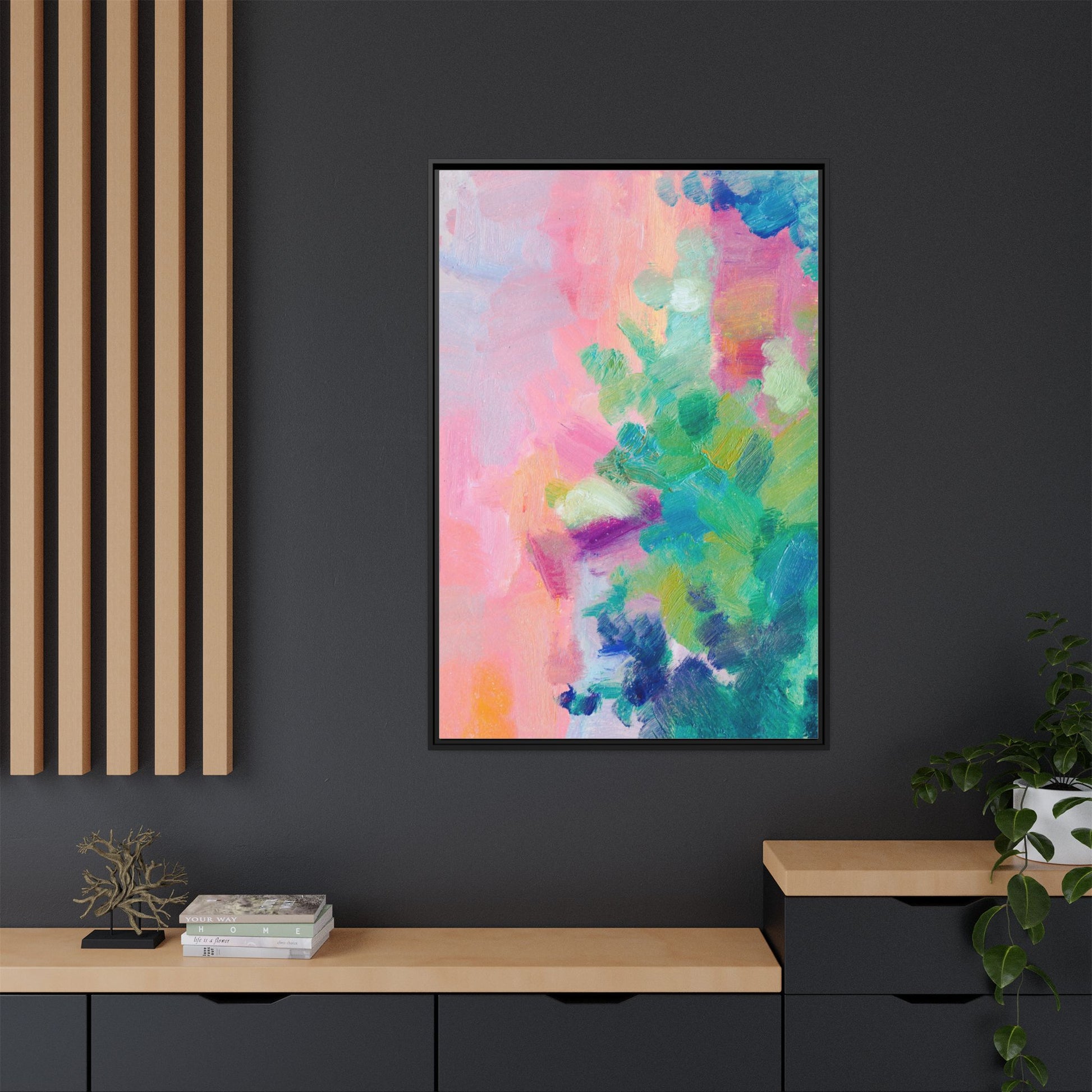 This vibrant abstract painting showcases a mesmerizing blend of soft pastel and bold, dynamic colors. The artwork features sweeping brushstrokes in shades of pink, green, blue, turquoise, and yellow, creating a fluid and organic composition. Textured layers of paint overlap and intertwine, giving the piece a sense of depth and movement. The color palette transitions smoothly from warm pink and peach tones on the left to cooler green and blue hues on the right, creating a harmonious visual flow. The painting appears to be created with oil or acrylic paints, with visible texture and impasto techniques that add rich dimensionality to the artwork.