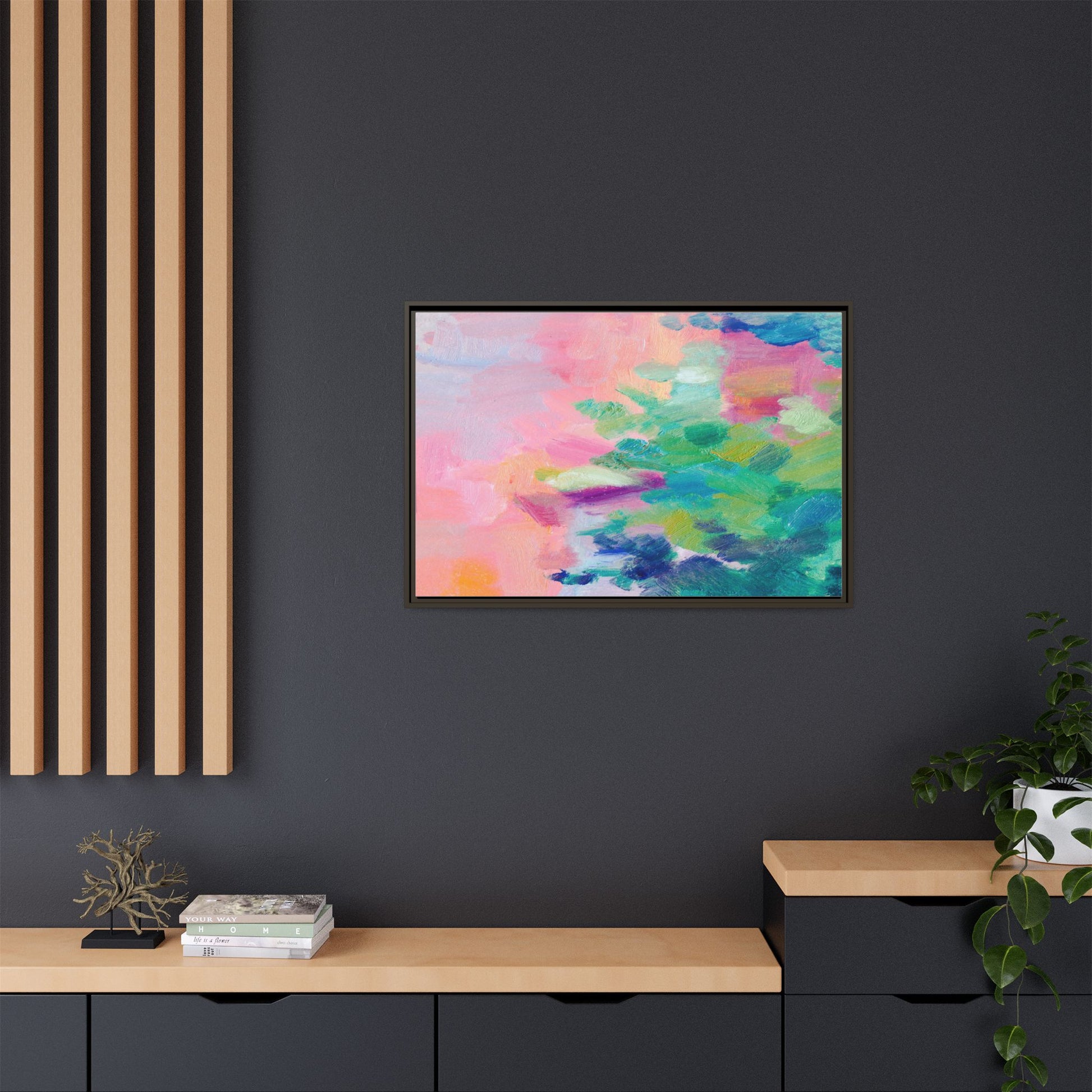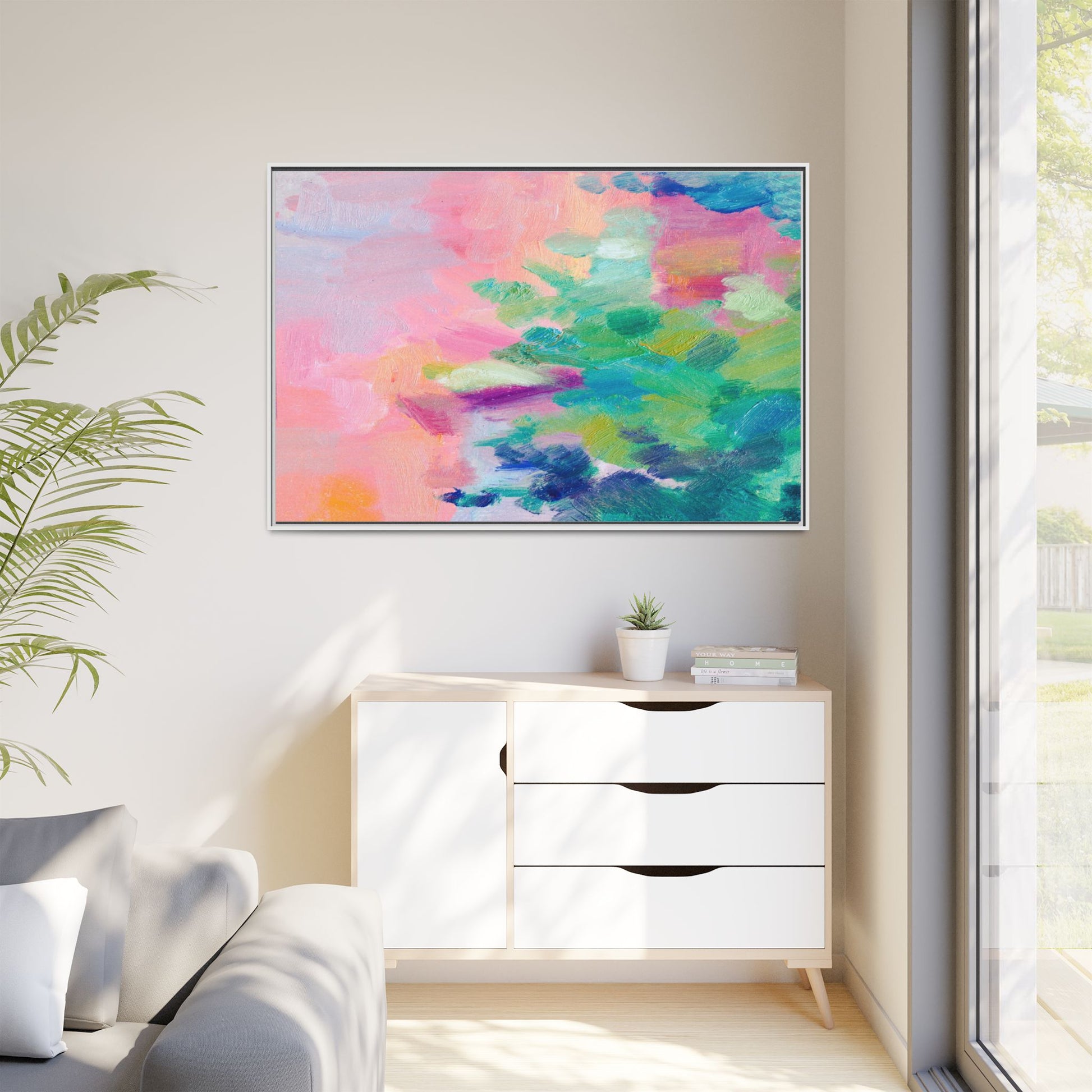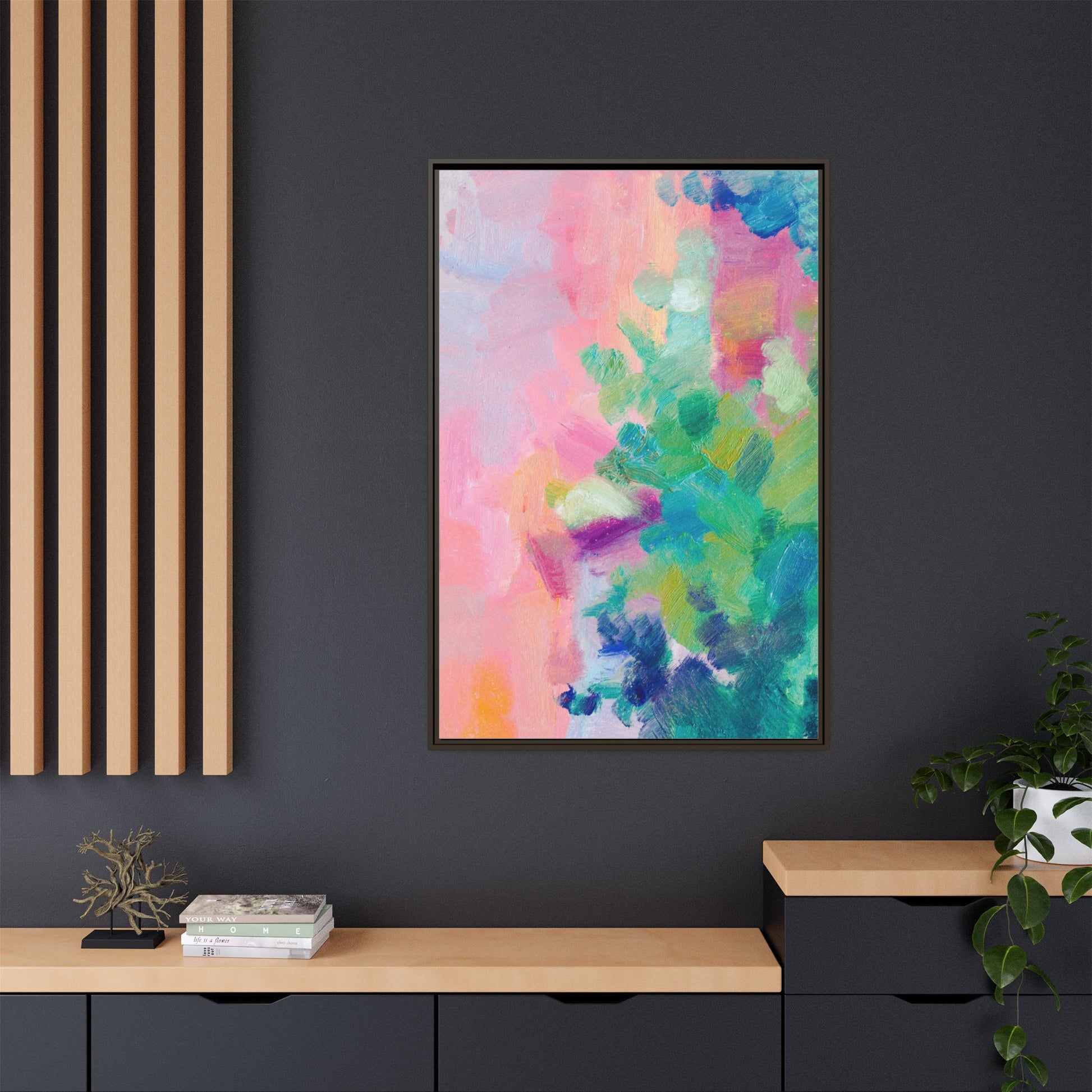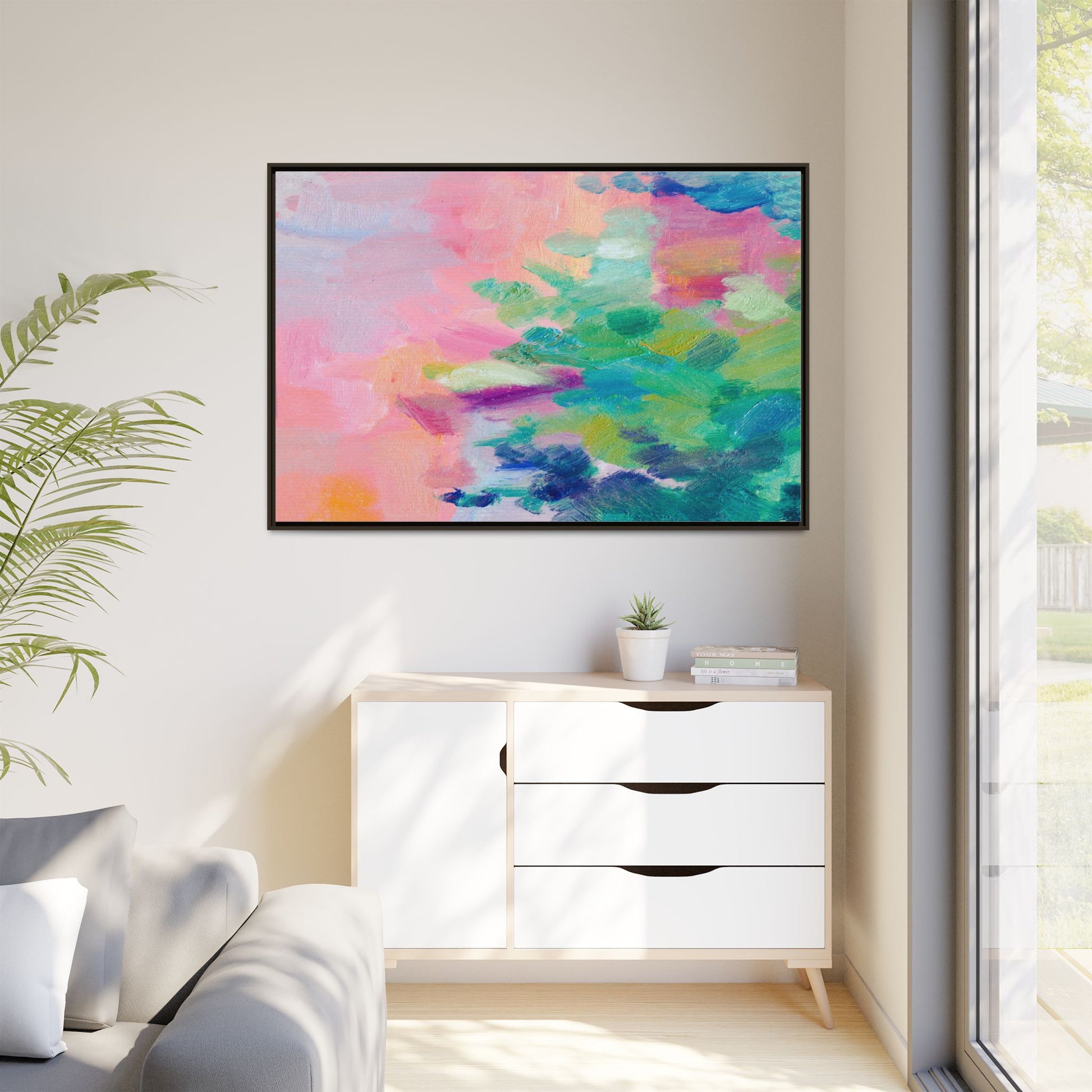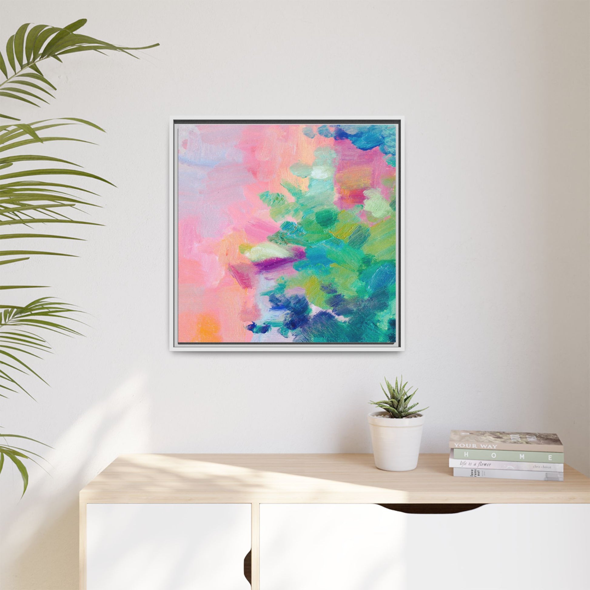This vibrant abstract painting showcases a mesmerizing blend of soft pastel and bold, dynamic colors. The artwork features sweeping brushstrokes in shades of pink, green, blue, turquoise, and yellow, creating a fluid and organic composition. Textured layers of paint overlap and intertwine, giving the piece a sense of depth and movement. The color palette transitions smoothly from warm pink and peach tones on the left to cooler green and blue hues on the right, creating a harmonious visual flow. The painting appears to be created with oil or acrylic paints, with visible texture and impasto techniques that add rich dimensionality to the artwork.