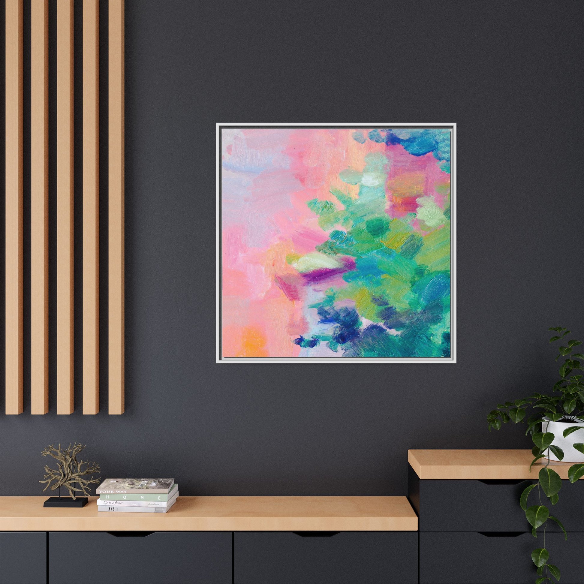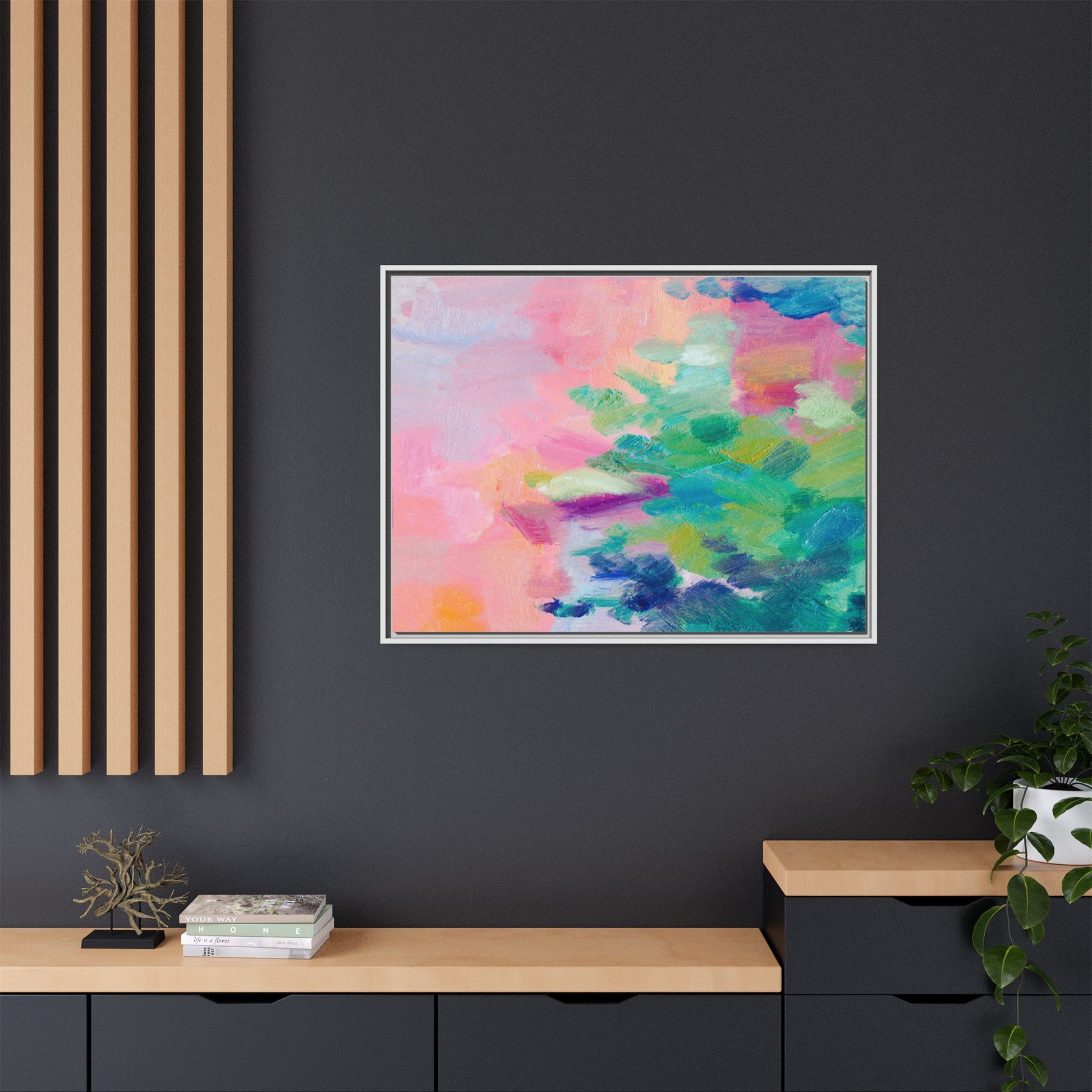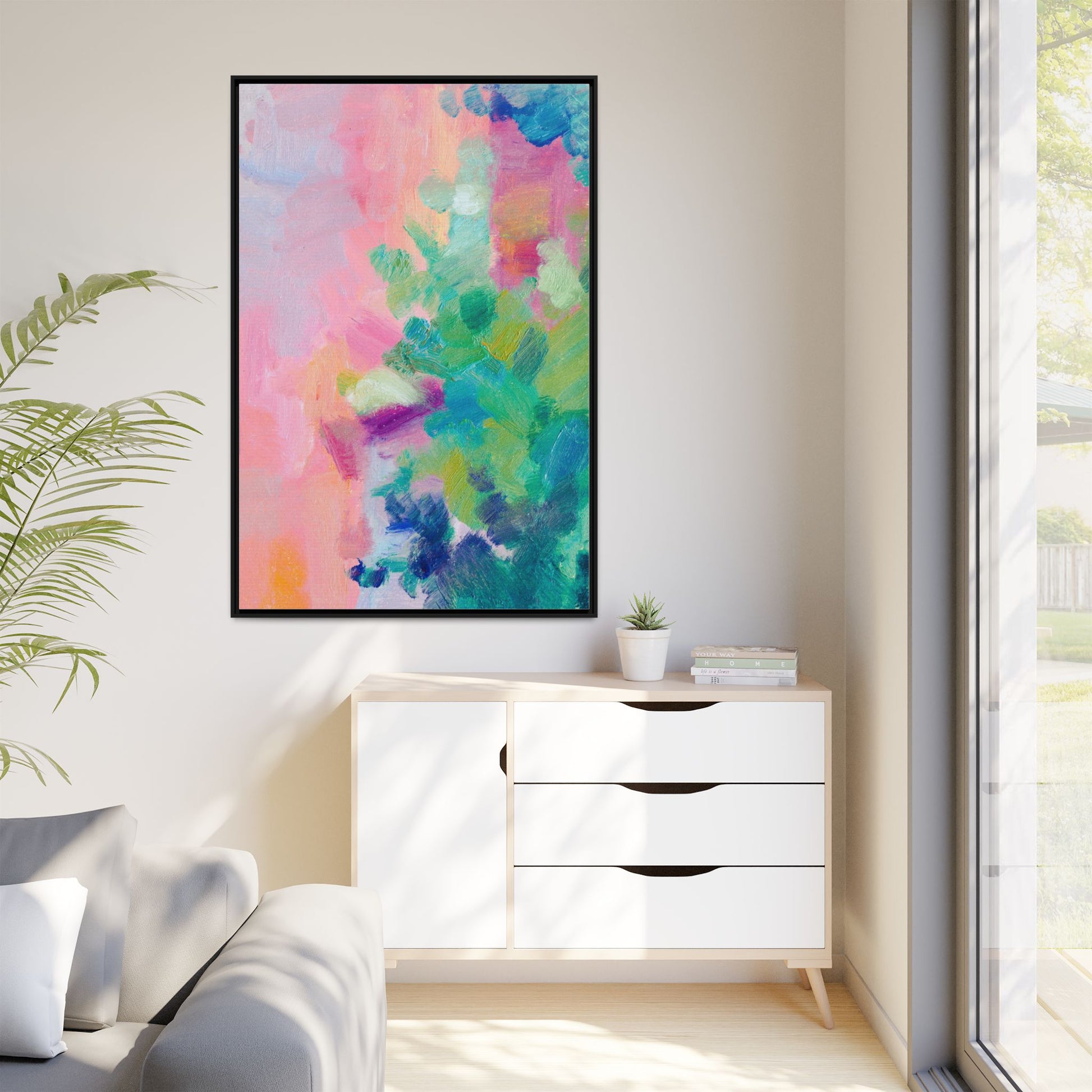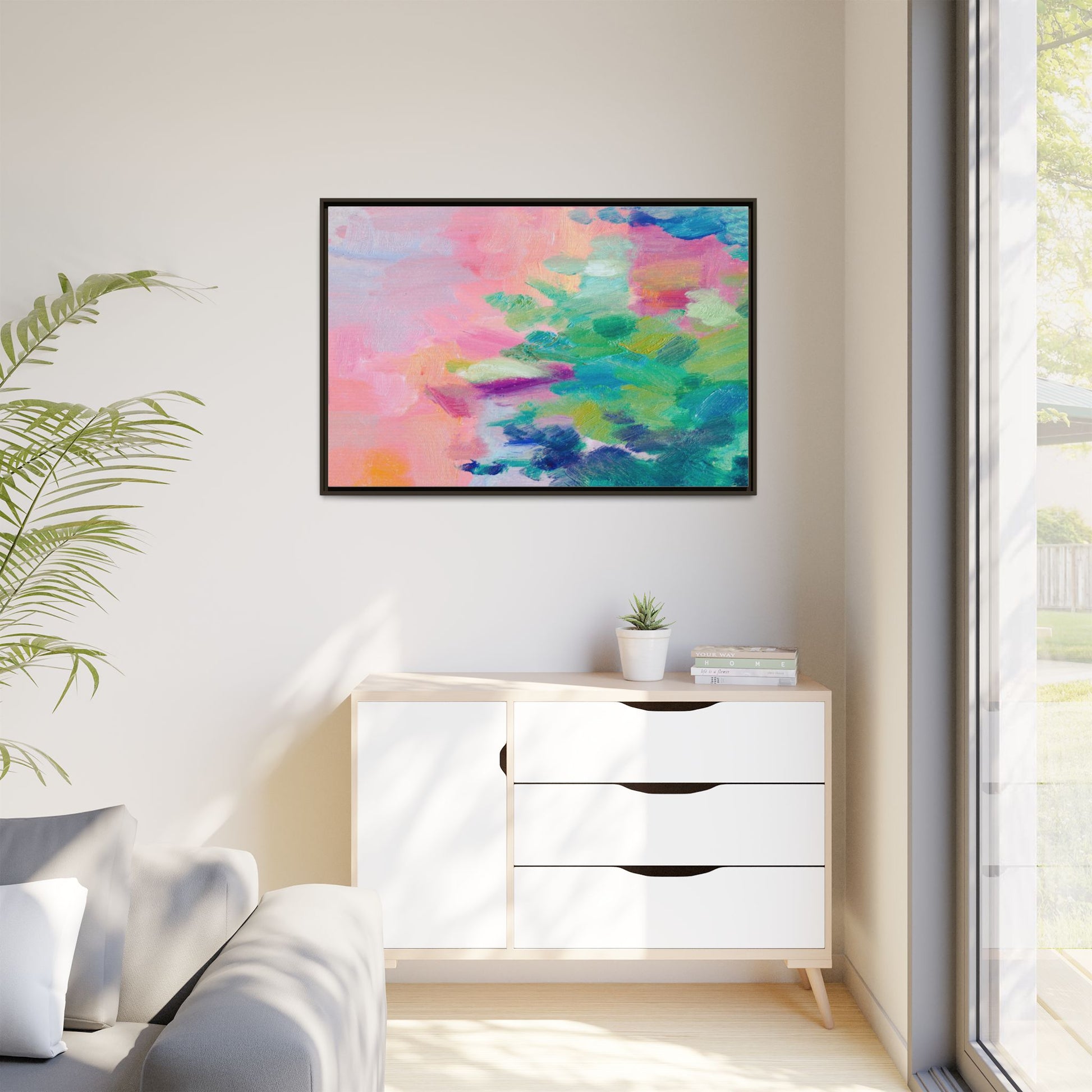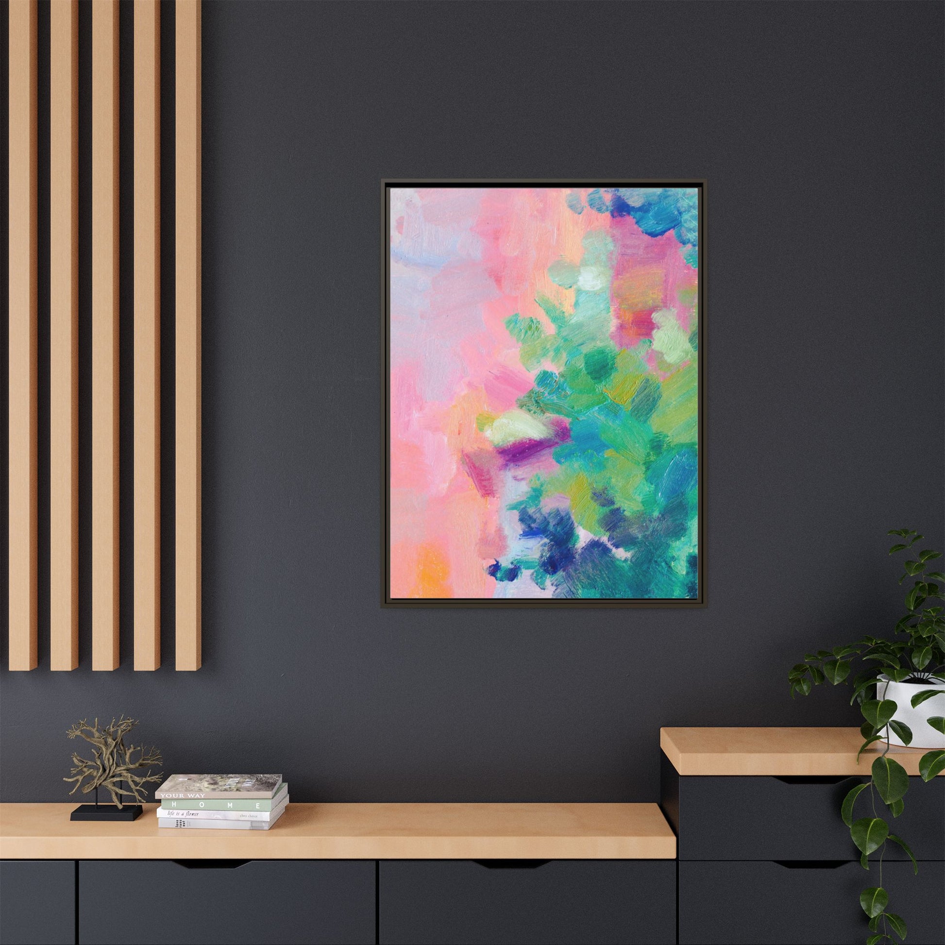 This vibrant abstract painting showcases a mesmerizing blend of soft pastel and bold, dynamic colors. The artwork features sweeping brushstrokes in shades of pink, green, blue, turquoise, and yellow, creating a fluid and organic composition. Textured layers of paint overlap and intertwine, giving the piece a sense of depth and movement. The color palette transitions smoothly from warm pink and peach tones on the left to cooler green and blue hues on the right, creating a harmonious visual flow. The painting appears to be created with oil or acrylic paints, with visible texture and impasto techniques that add rich dimensionality to the artwork.