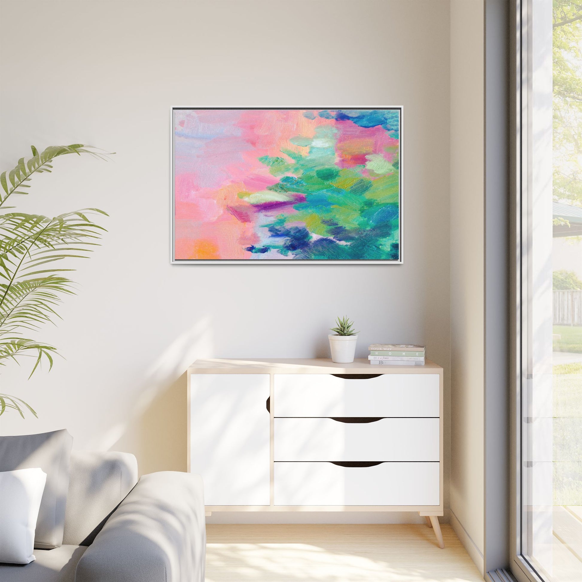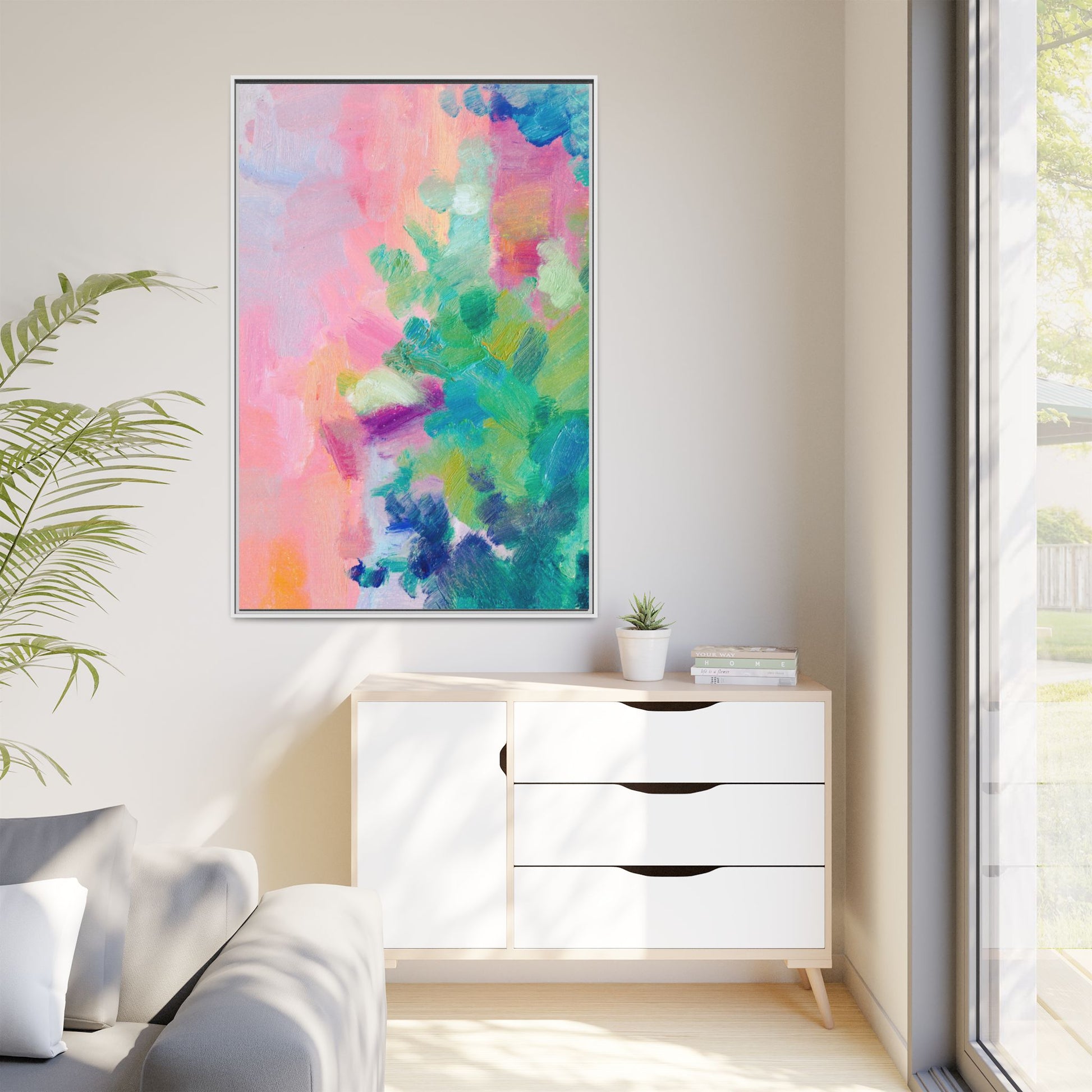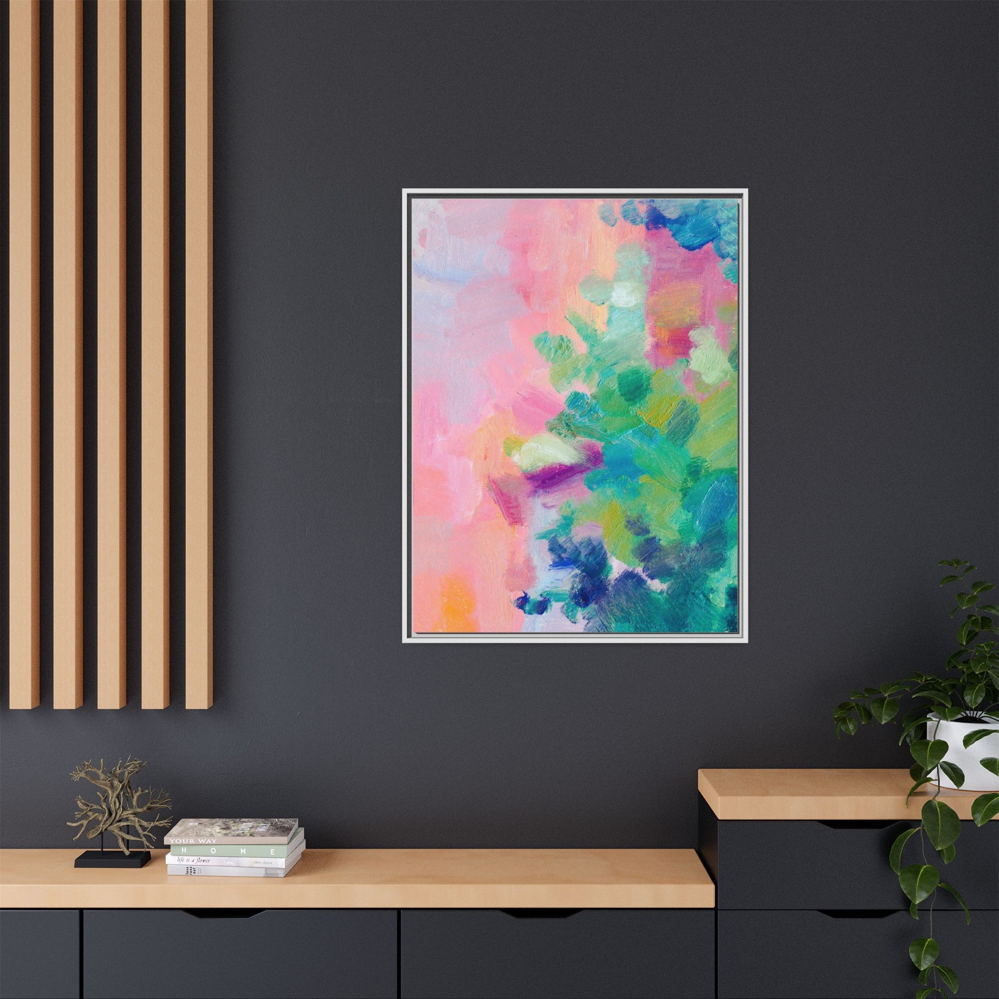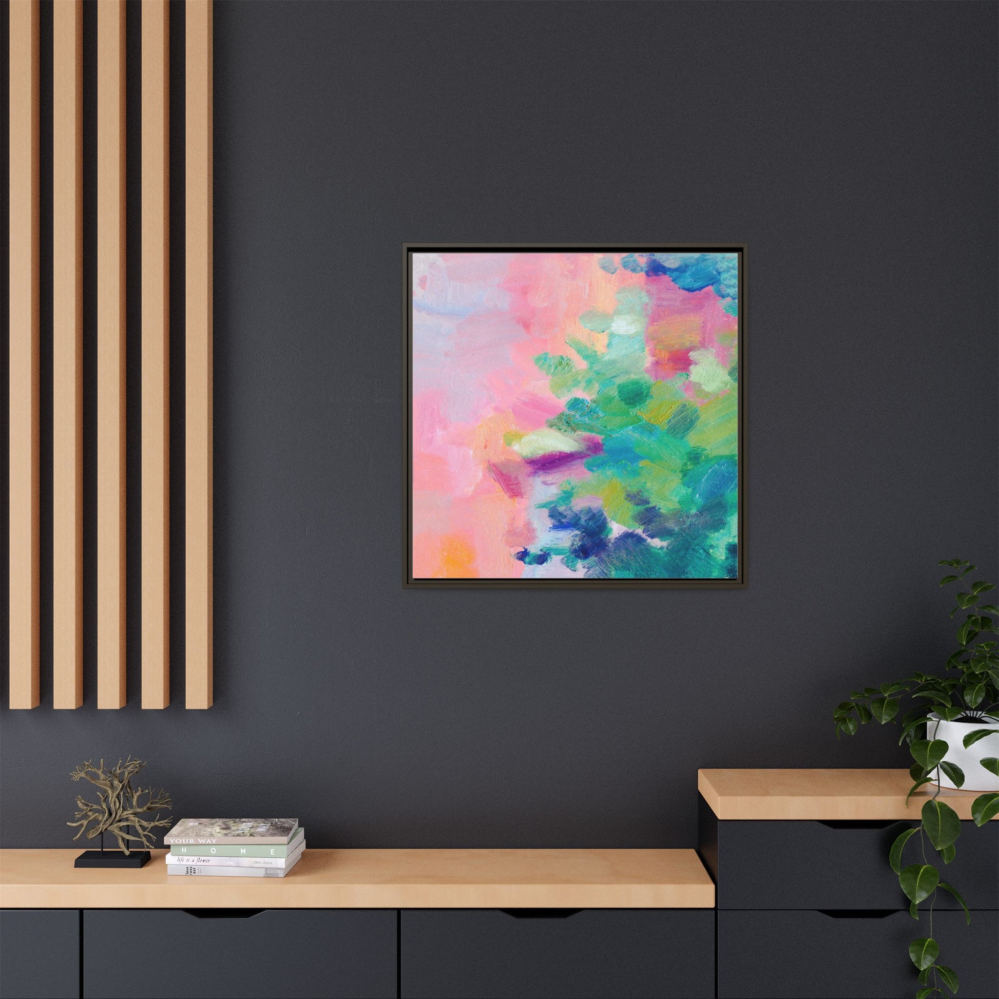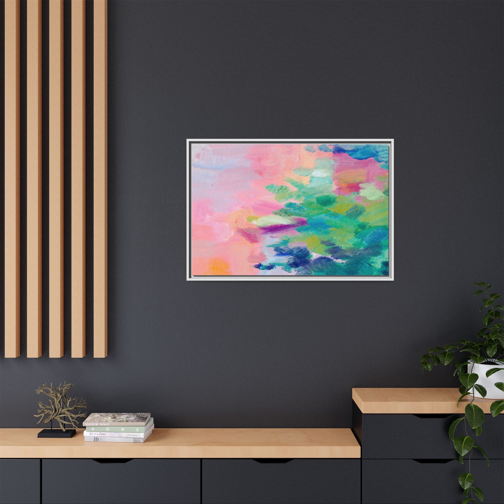 This vibrant abstract painting showcases a mesmerizing blend of soft pastel and bold, dynamic colors. The artwork features sweeping brushstrokes in shades of pink, green, blue, turquoise, and yellow, creating a fluid and organic composition. Textured layers of paint overlap and intertwine, giving the piece a sense of depth and movement. The color palette transitions smoothly from warm pink and peach tones on the left to cooler green and blue hues on the right, creating a harmonious visual flow. The painting appears to be created with oil or acrylic paints, with visible texture and impasto techniques that add rich dimensionality to the artwork.