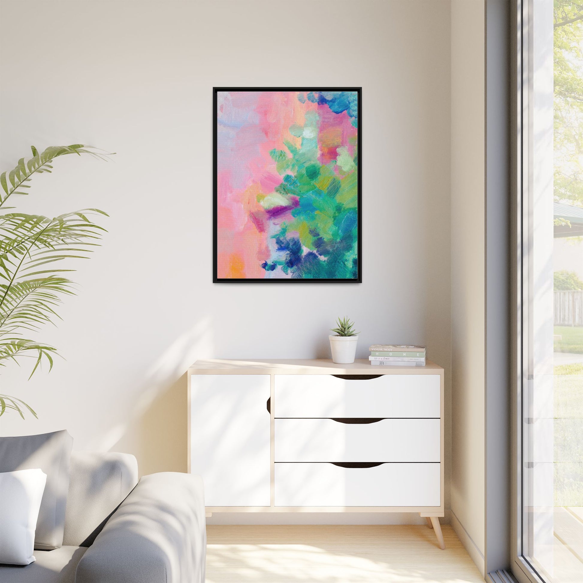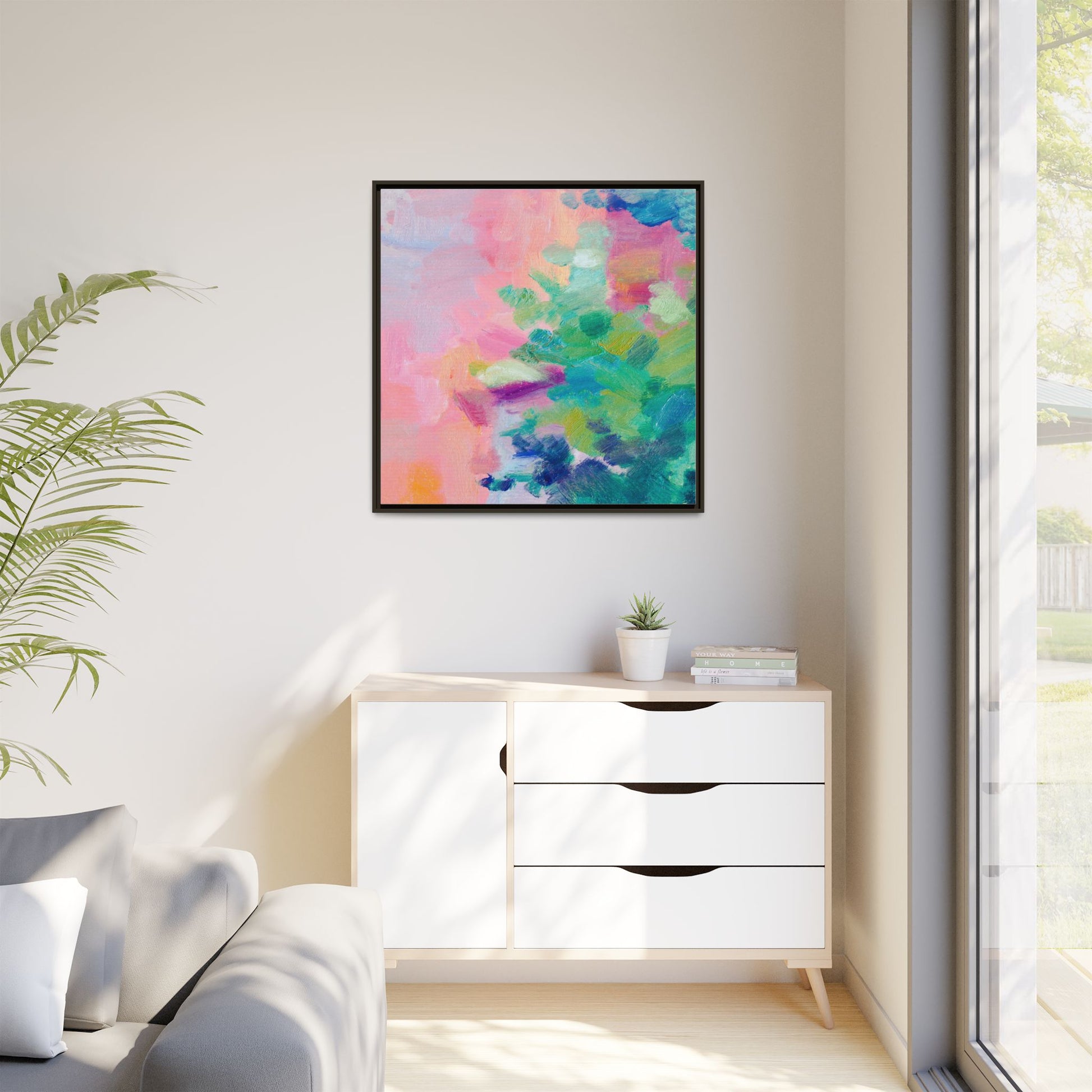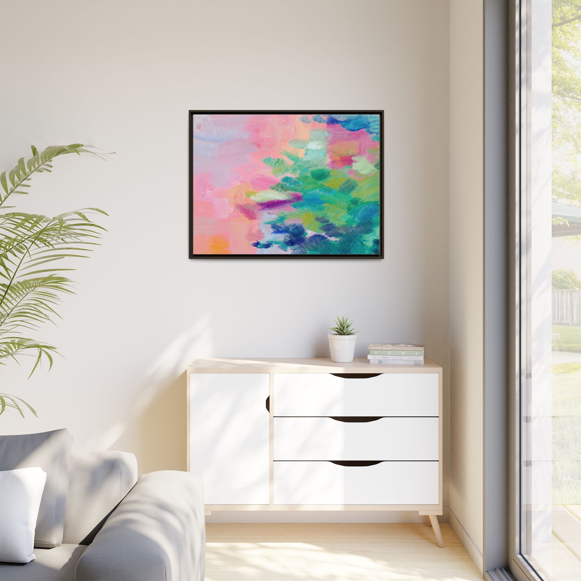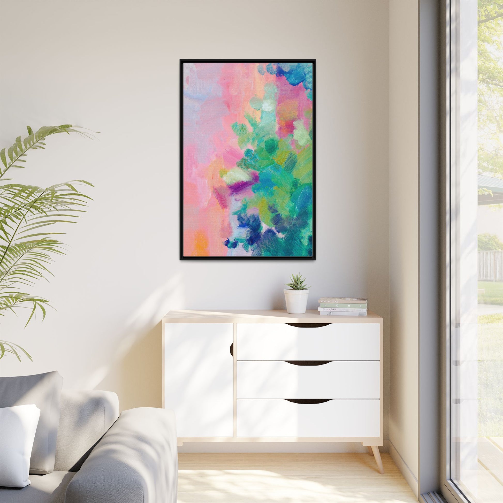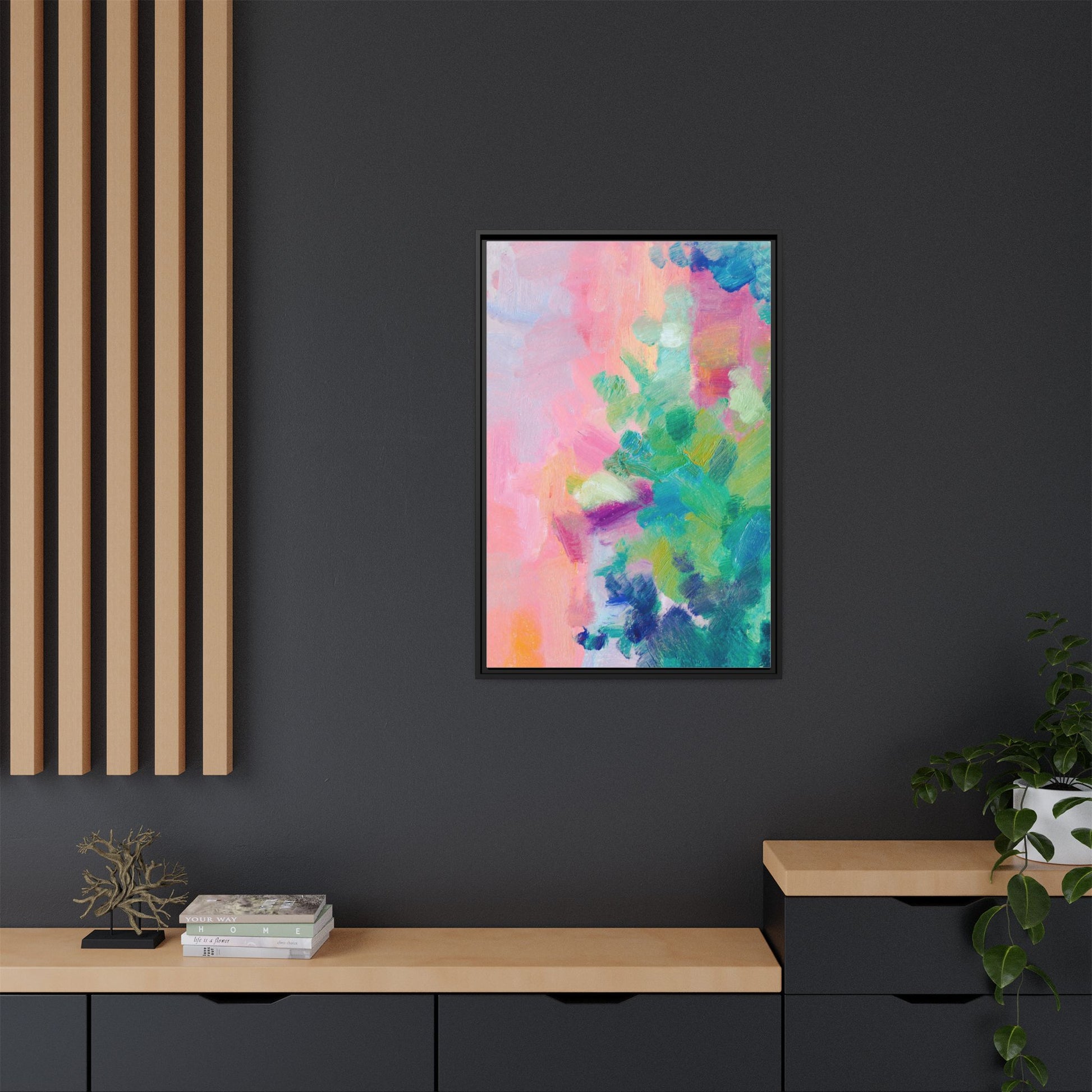 This vibrant abstract painting showcases a mesmerizing blend of soft pastel and bold, dynamic colors. The artwork features sweeping brushstrokes in shades of pink, green, blue, turquoise, and yellow, creating a fluid and organic composition. Textured layers of paint overlap and intertwine, giving the piece a sense of depth and movement. The color palette transitions smoothly from warm pink and peach tones on the left to cooler green and blue hues on the right, creating a harmonious visual flow. The painting appears to be created with oil or acrylic paints, with visible texture and impasto techniques that add rich dimensionality to the artwork.