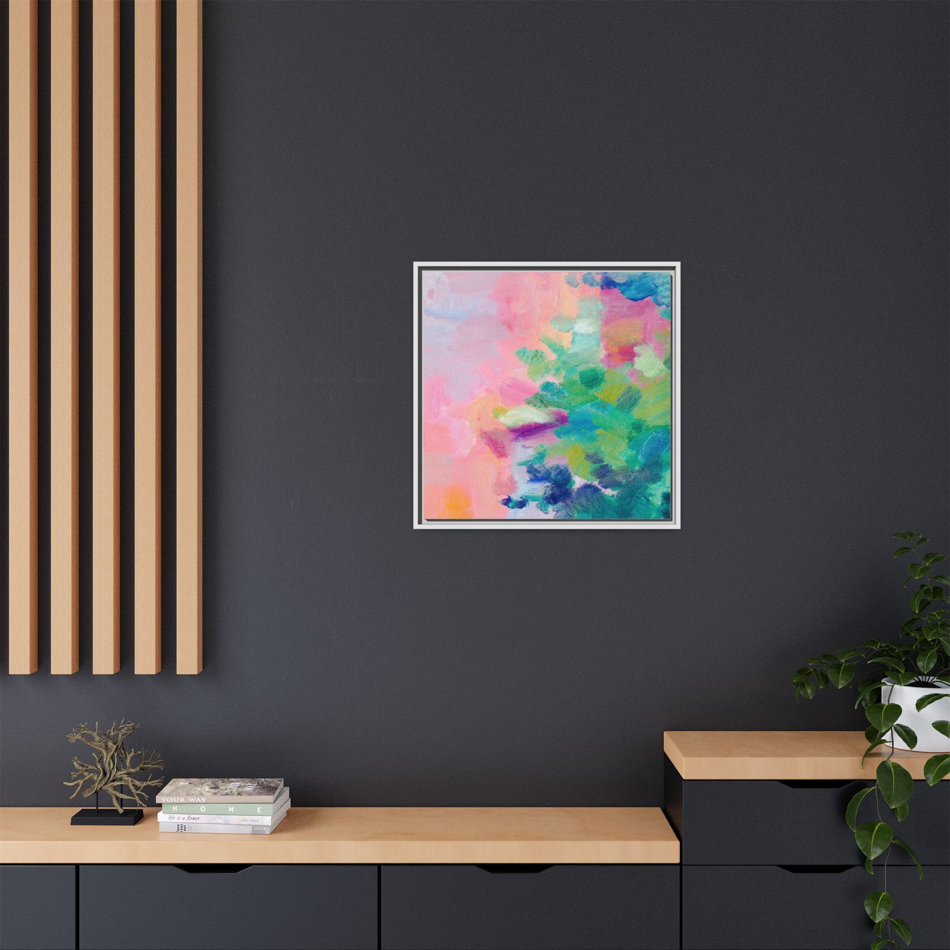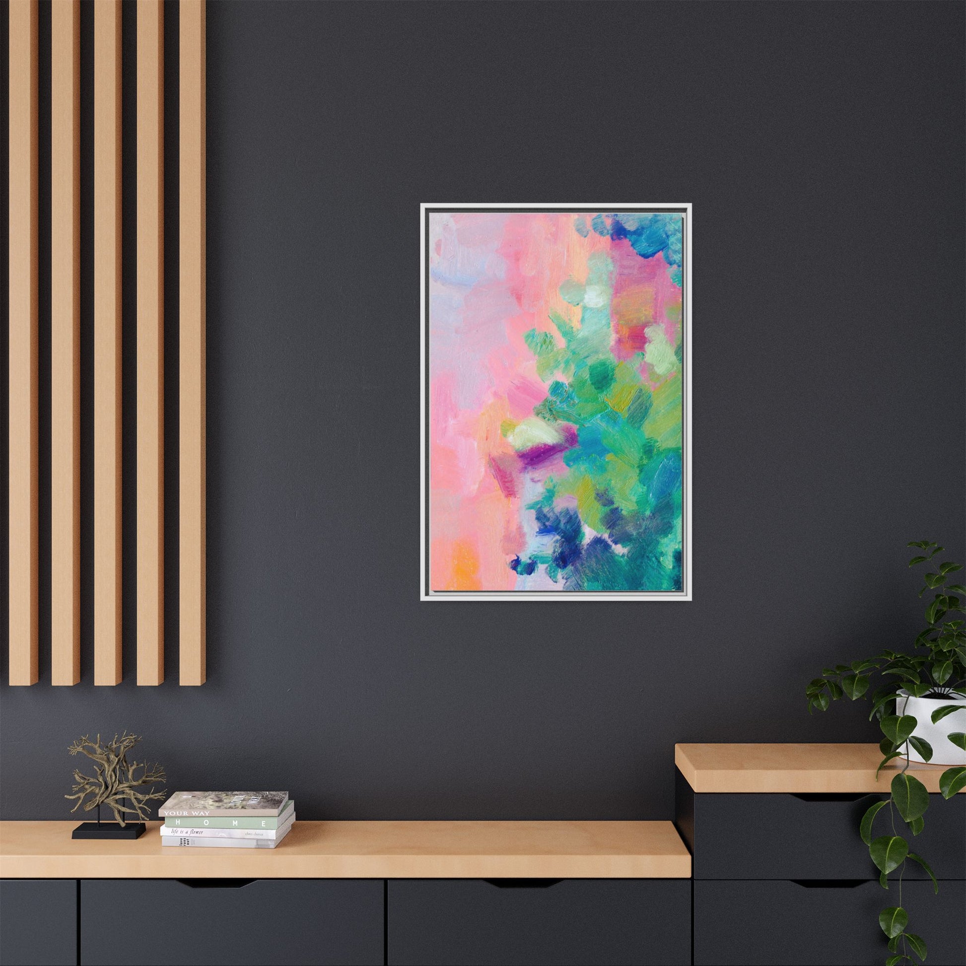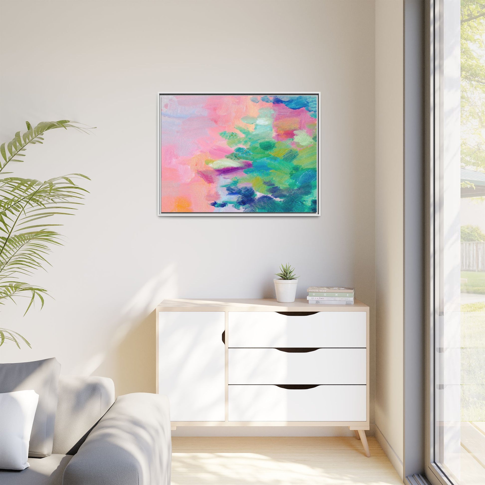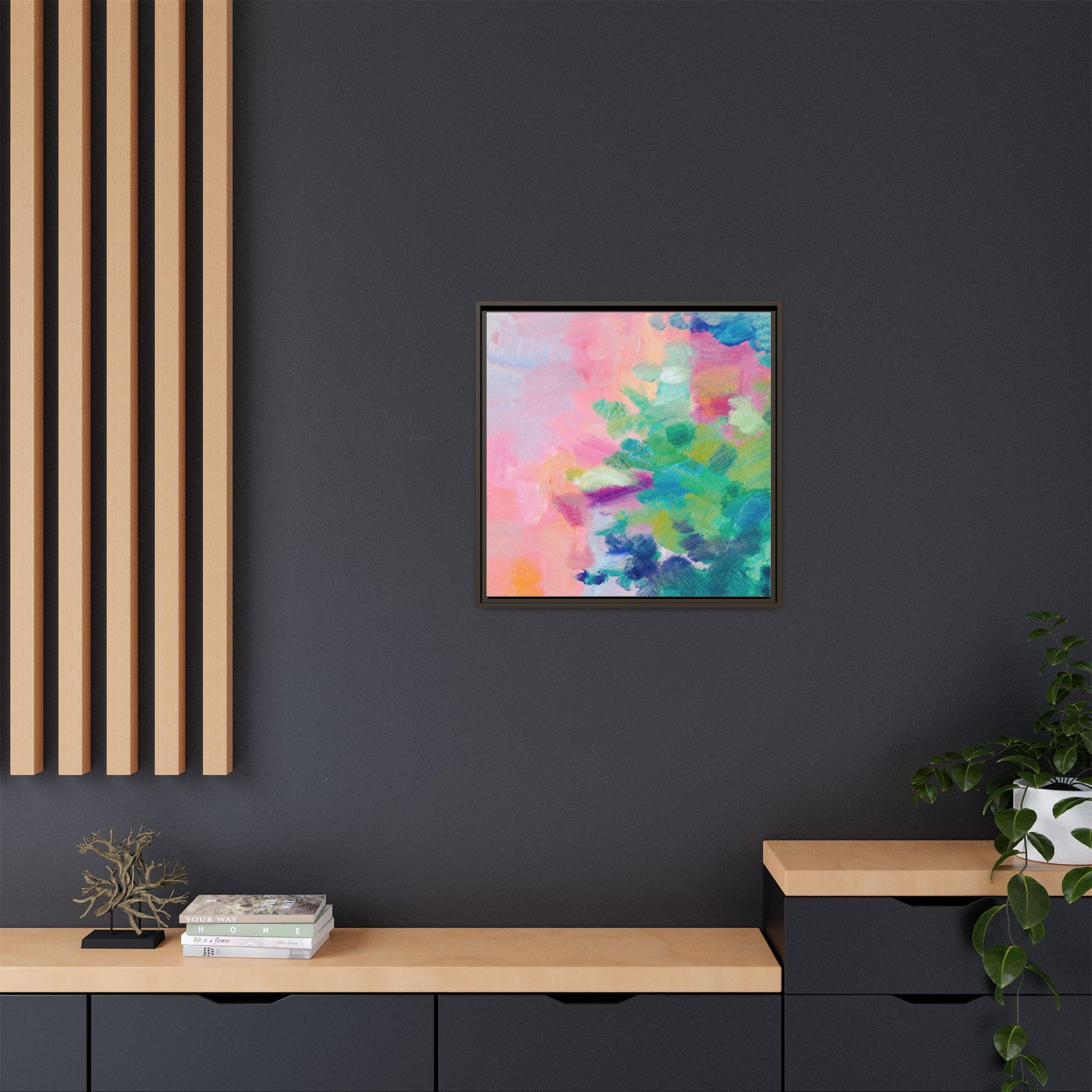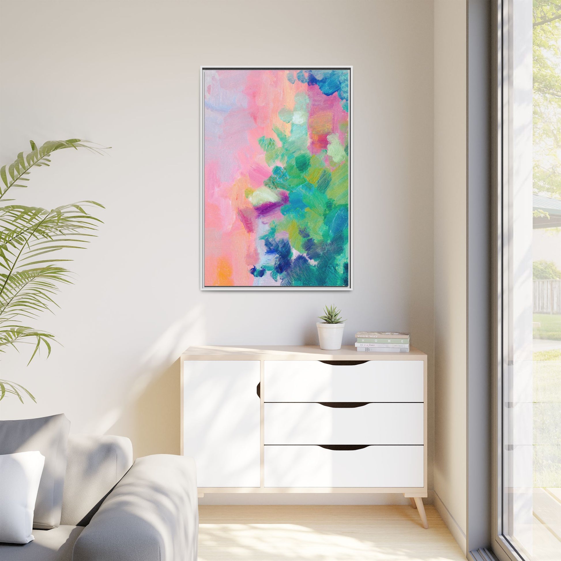This vibrant abstract painting showcases a mesmerizing blend of soft pastel and bold, dynamic colors. The artwork features sweeping brushstrokes in shades of pink, green, blue, turquoise, and yellow, creating a fluid and organic composition. Textured layers of paint overlap and intertwine, giving the piece a sense of depth and movement. The color palette transitions smoothly from warm pink and peach tones on the left to cooler green and blue hues on the right, creating a harmonious visual flow. The painting appears to be created with oil or acrylic paints, with visible texture and impasto techniques that add rich dimensionality to the artwork.