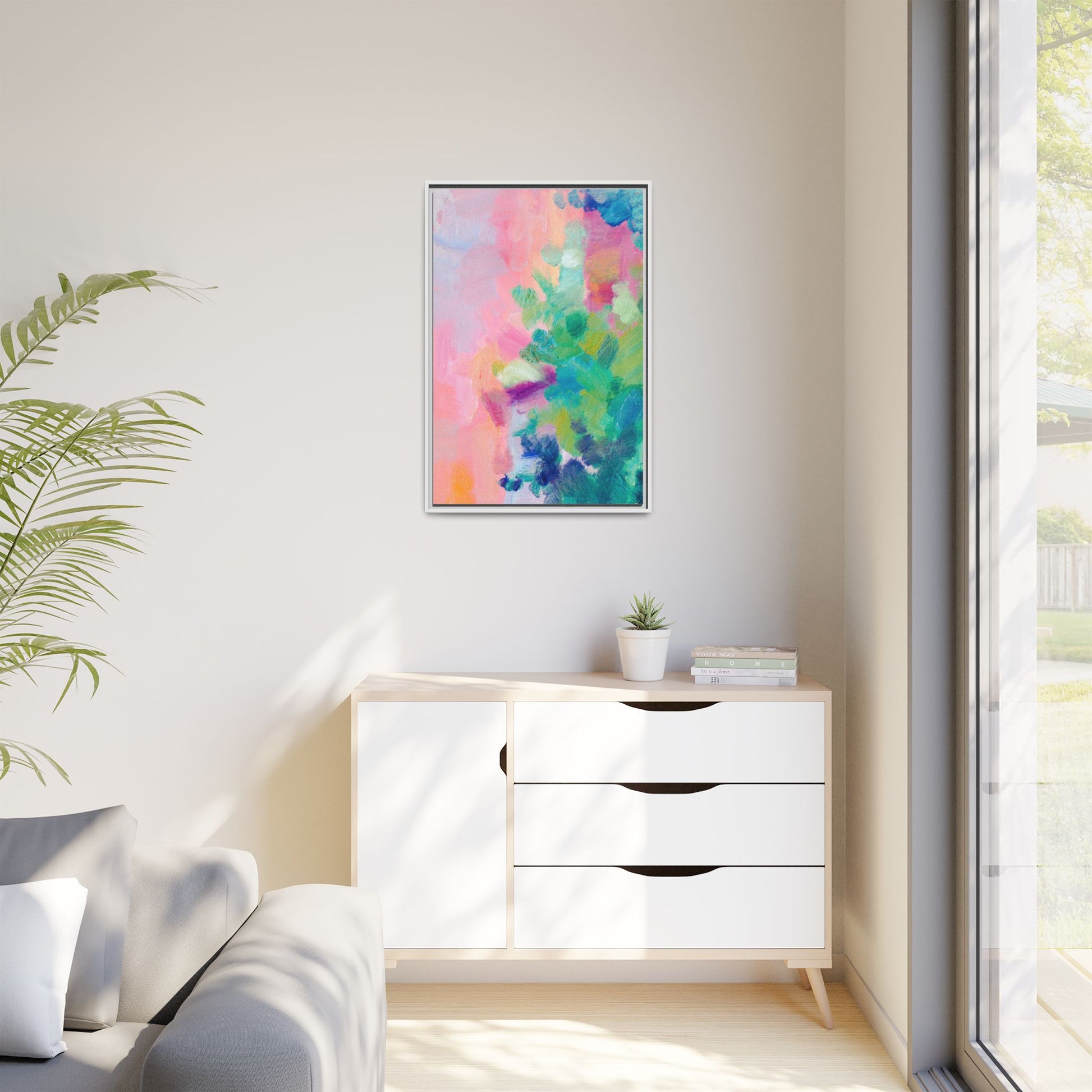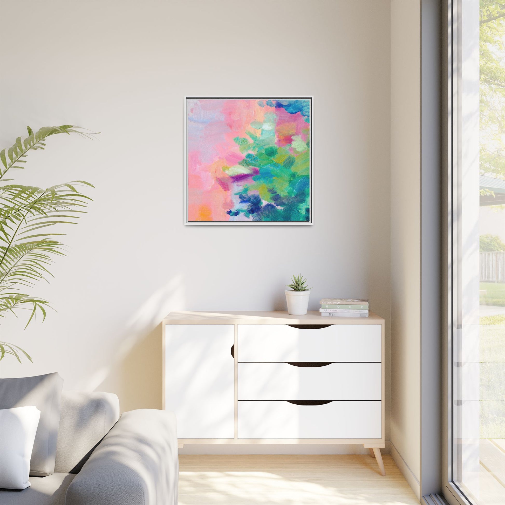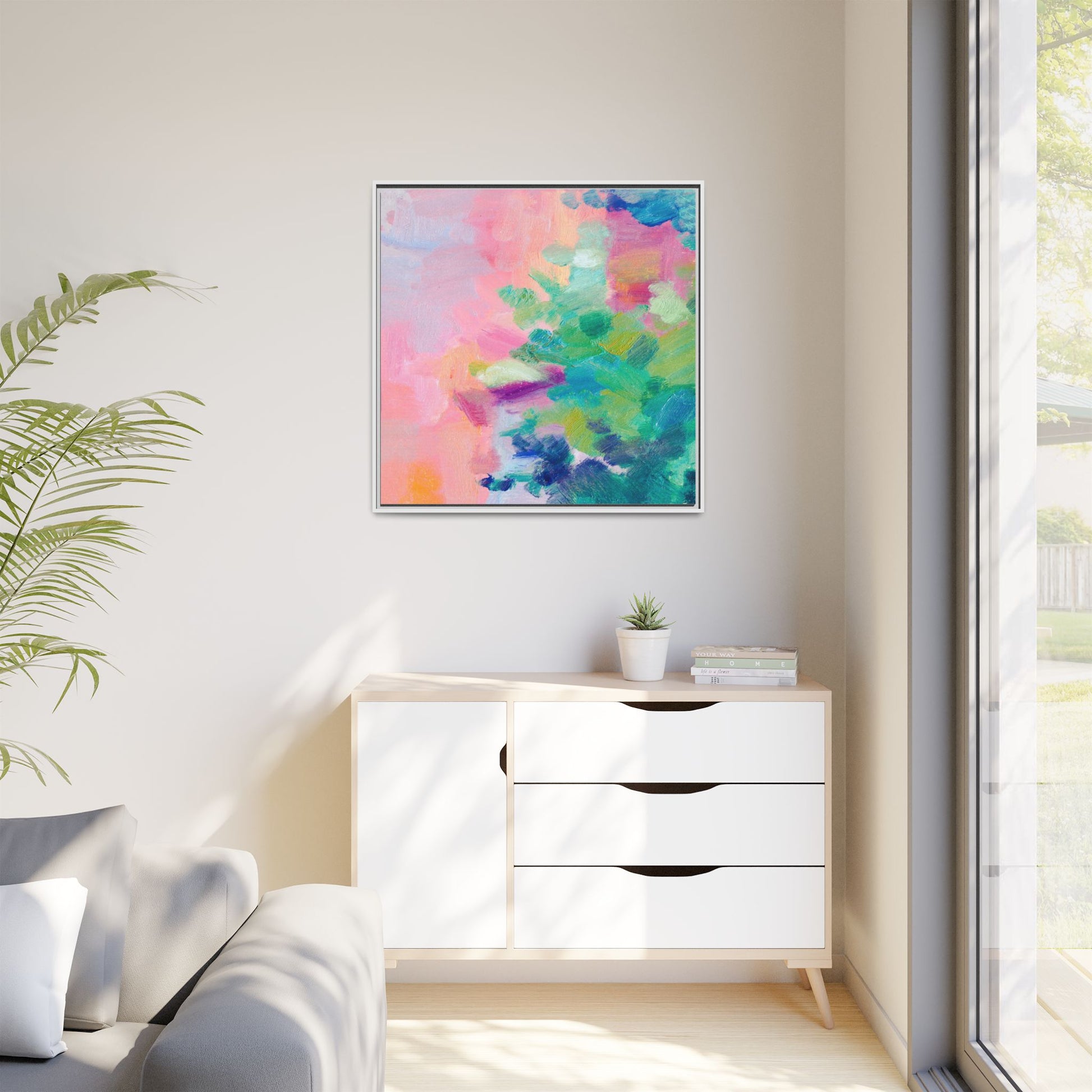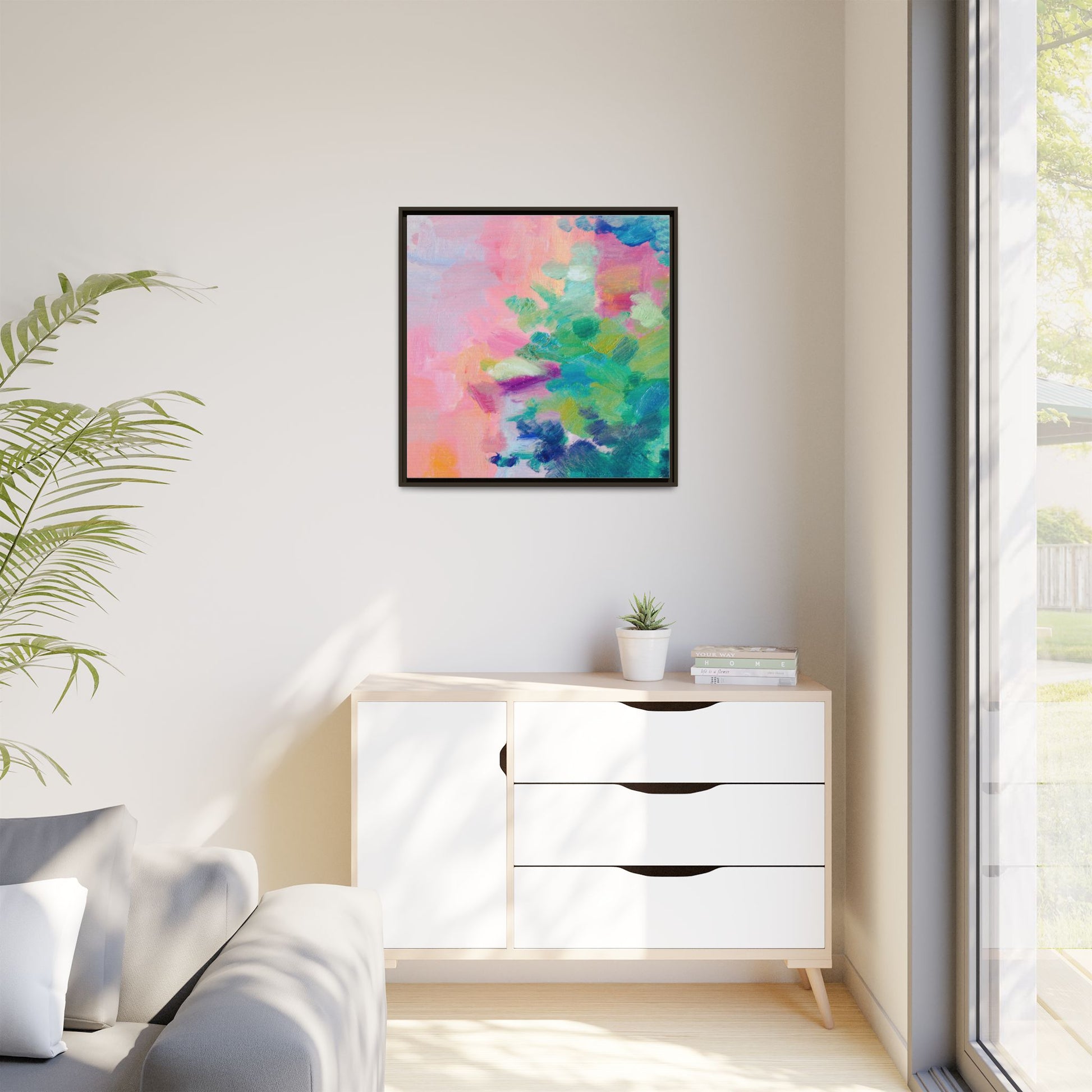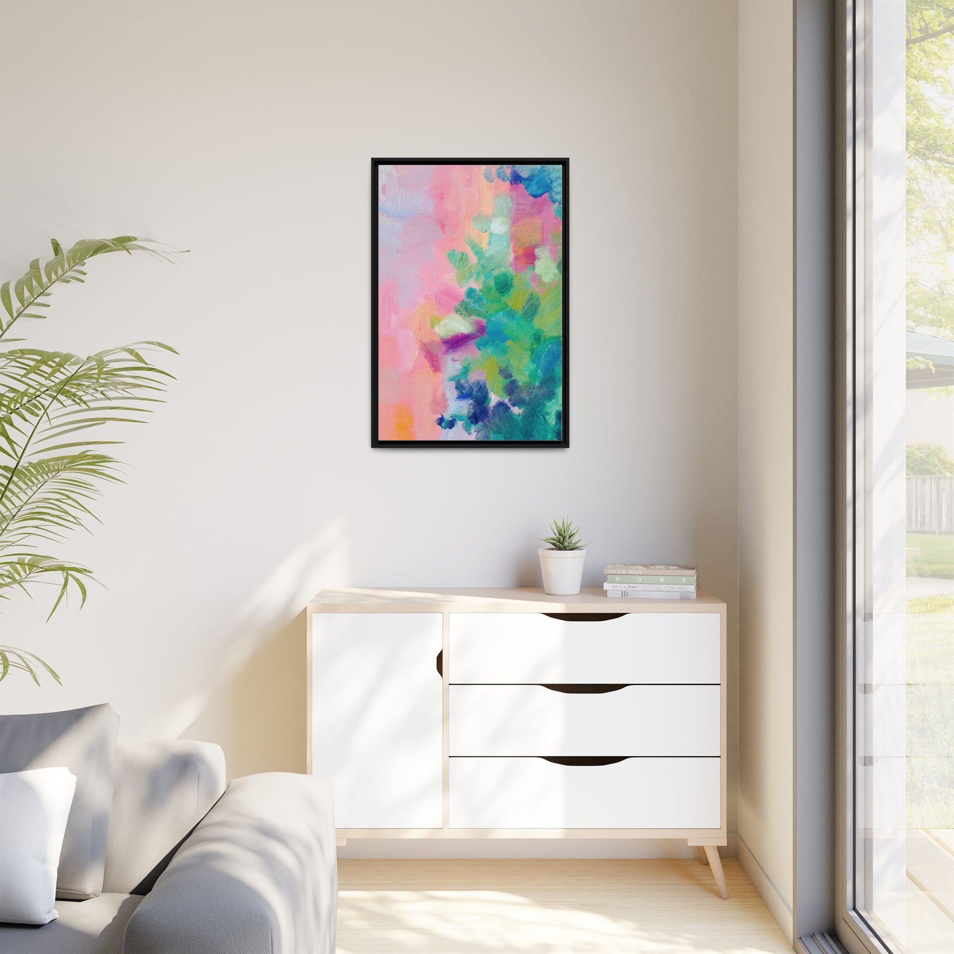 This vibrant abstract painting showcases a mesmerizing blend of soft pastel and bold, dynamic colors. The artwork features sweeping brushstrokes in shades of pink, green, blue, turquoise, and yellow, creating a fluid and organic composition. Textured layers of paint overlap and intertwine, giving the piece a sense of depth and movement. The color palette transitions smoothly from warm pink and peach tones on the left to cooler green and blue hues on the right, creating a harmonious visual flow. The painting appears to be created with oil or acrylic paints, with visible texture and impasto techniques that add rich dimensionality to the artwork.