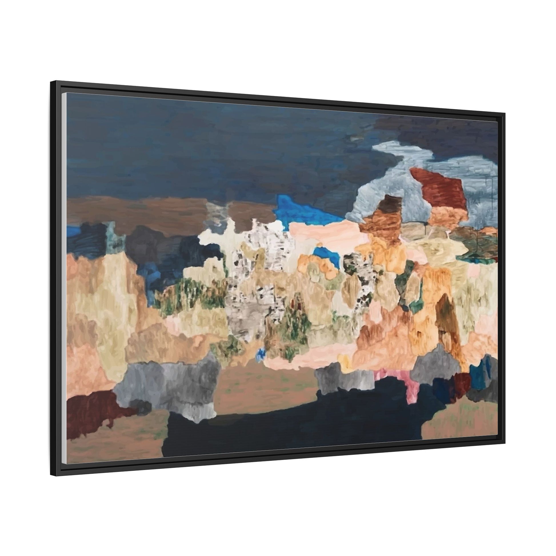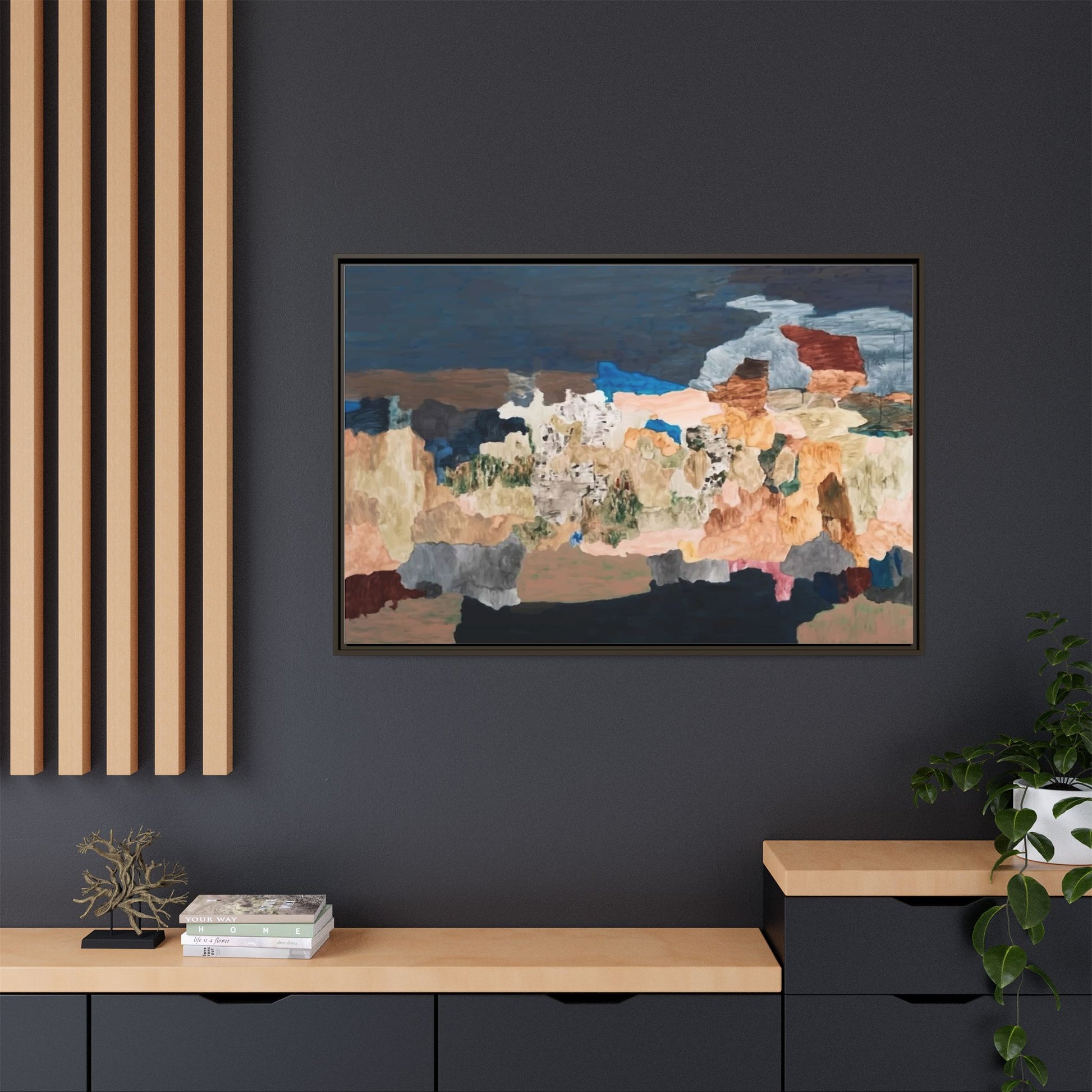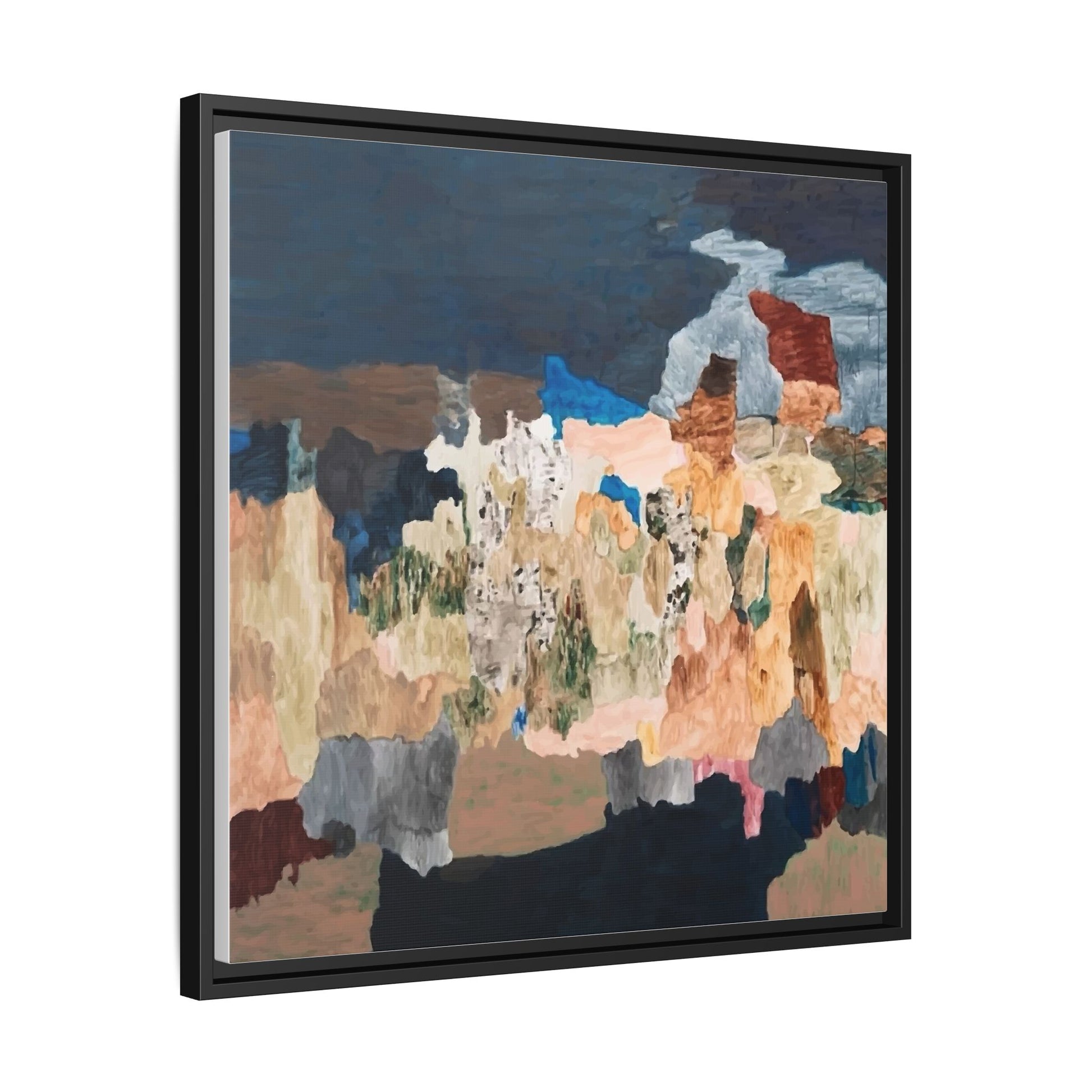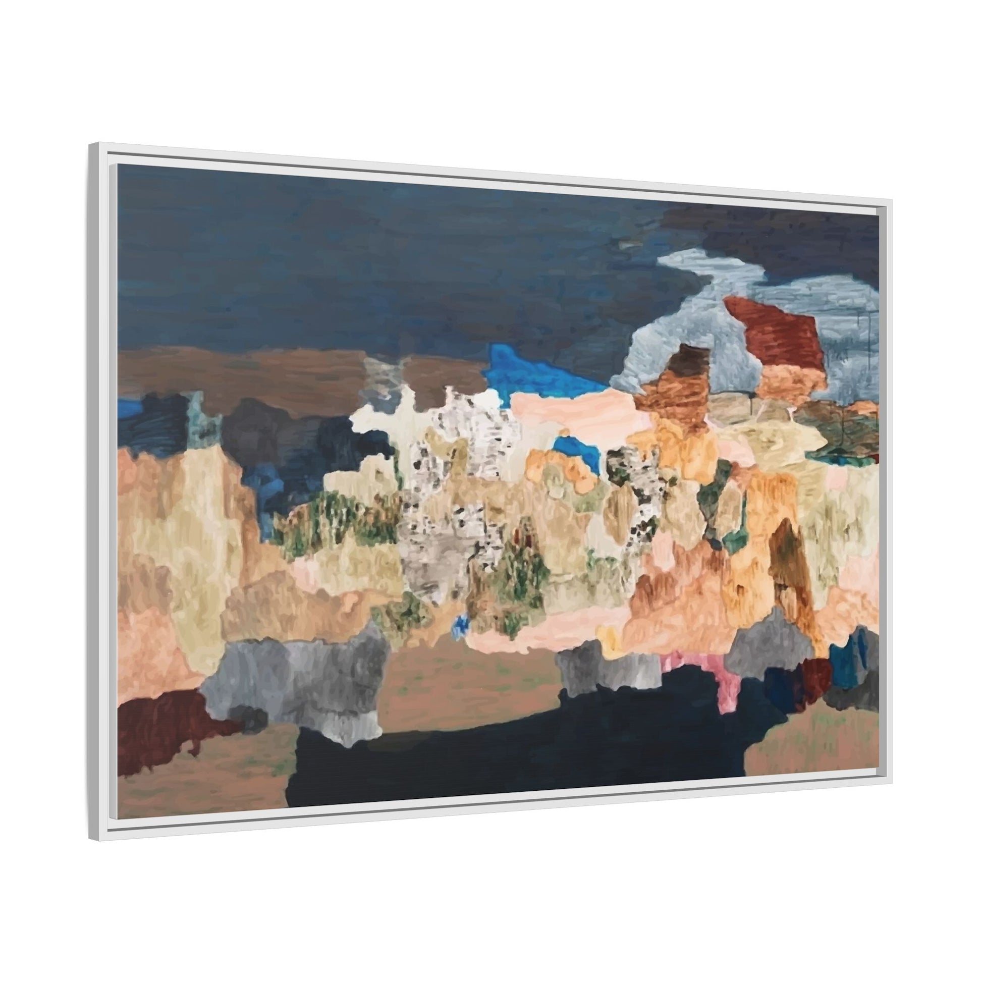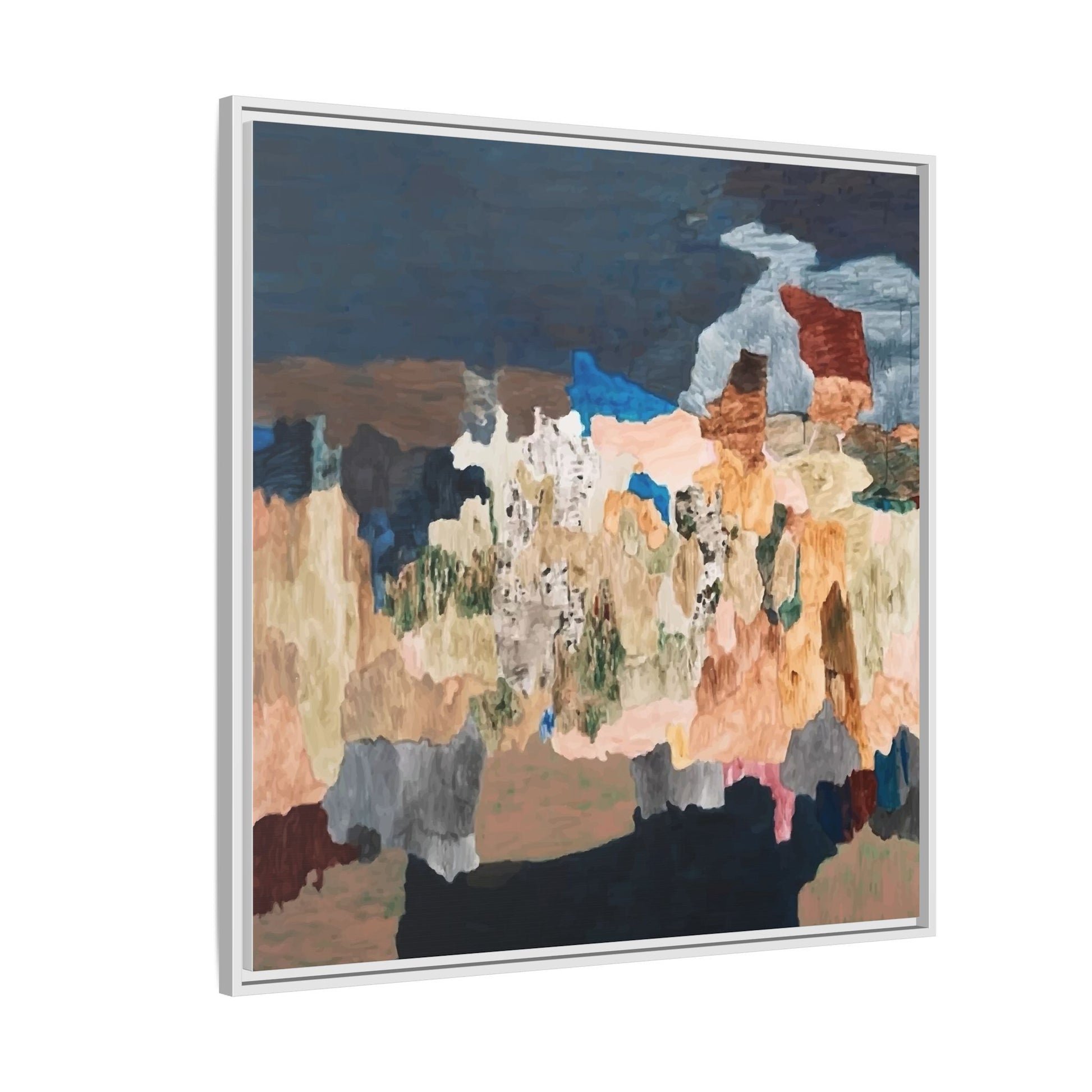 This abstract landscape painting features a complex composition of fragmented, geometric shapes in muted earth tones and cool blues. The artwork appears to depict a deconstructed, textured landscape with irregular blocks and patches representing terrain, sky, and potentially architectural elements. Soft, layered watercolor or acrylic techniques create a sense of depth and movement, with colors ranging from pale pinks and yellows to deep blues, grays, and rusty oranges. The image evokes a sense of a fractured, cubist-inspired landscape, where traditional boundaries between land, sky, and structures are deliberately blurred and reimagined. The painting's style suggests a modern, interpretive approach to landscape representation, breaking down natural forms into abstract, interlocking shapes.