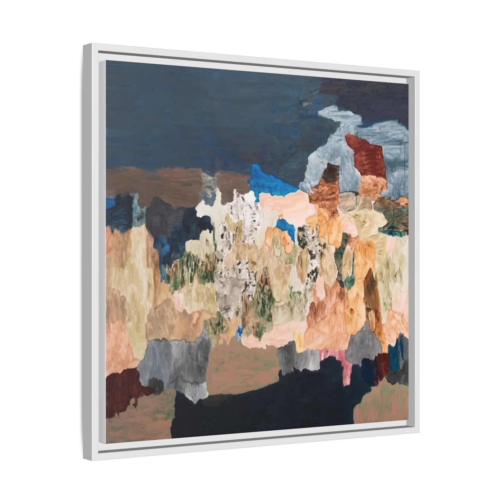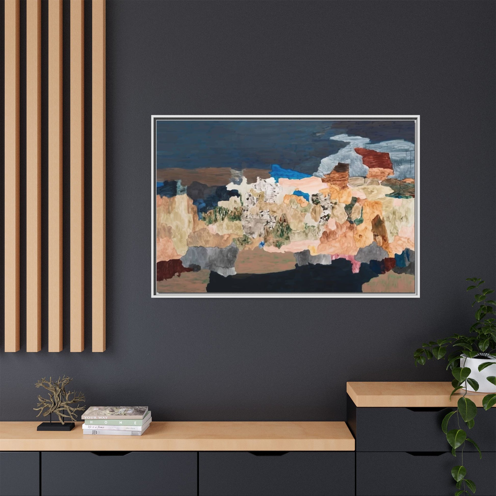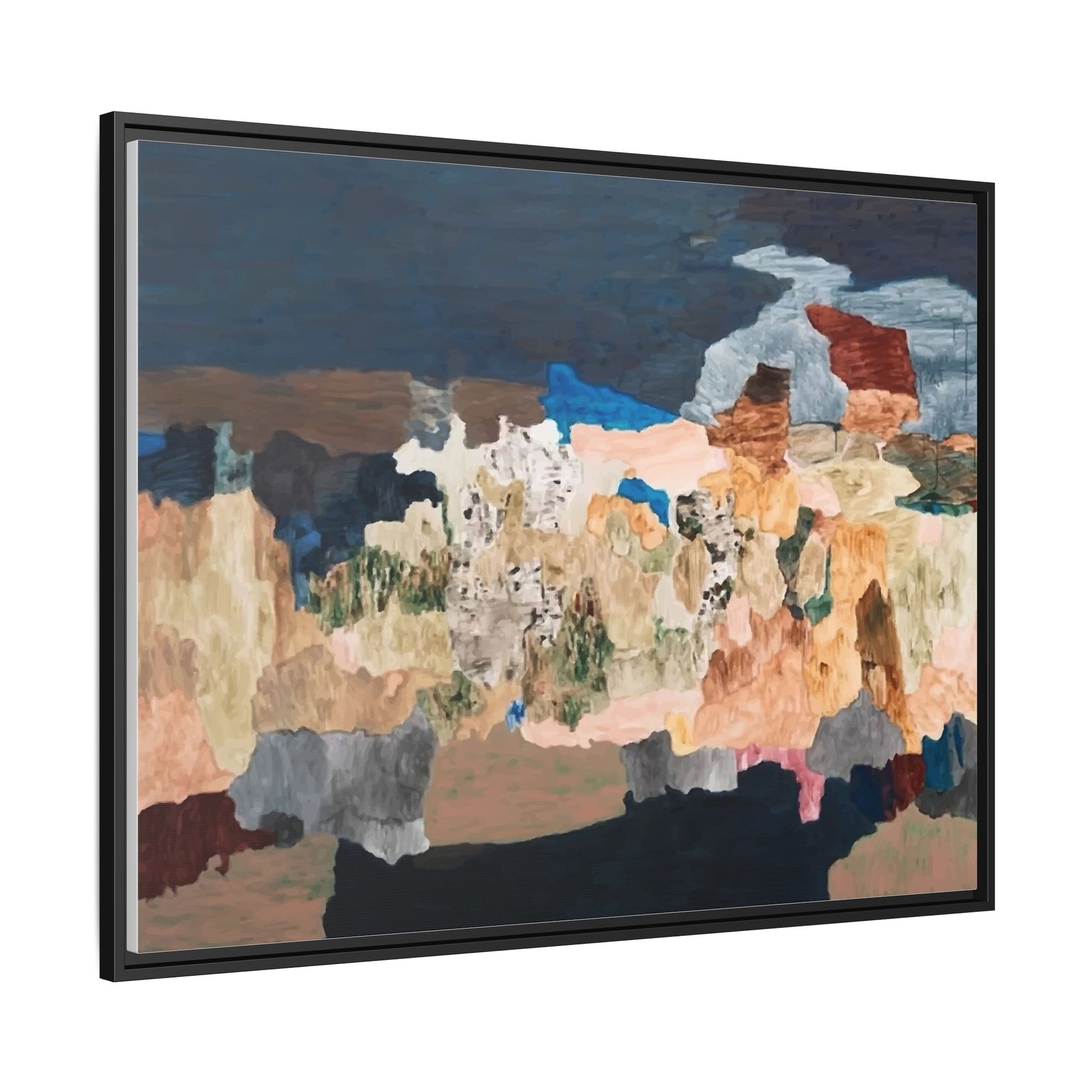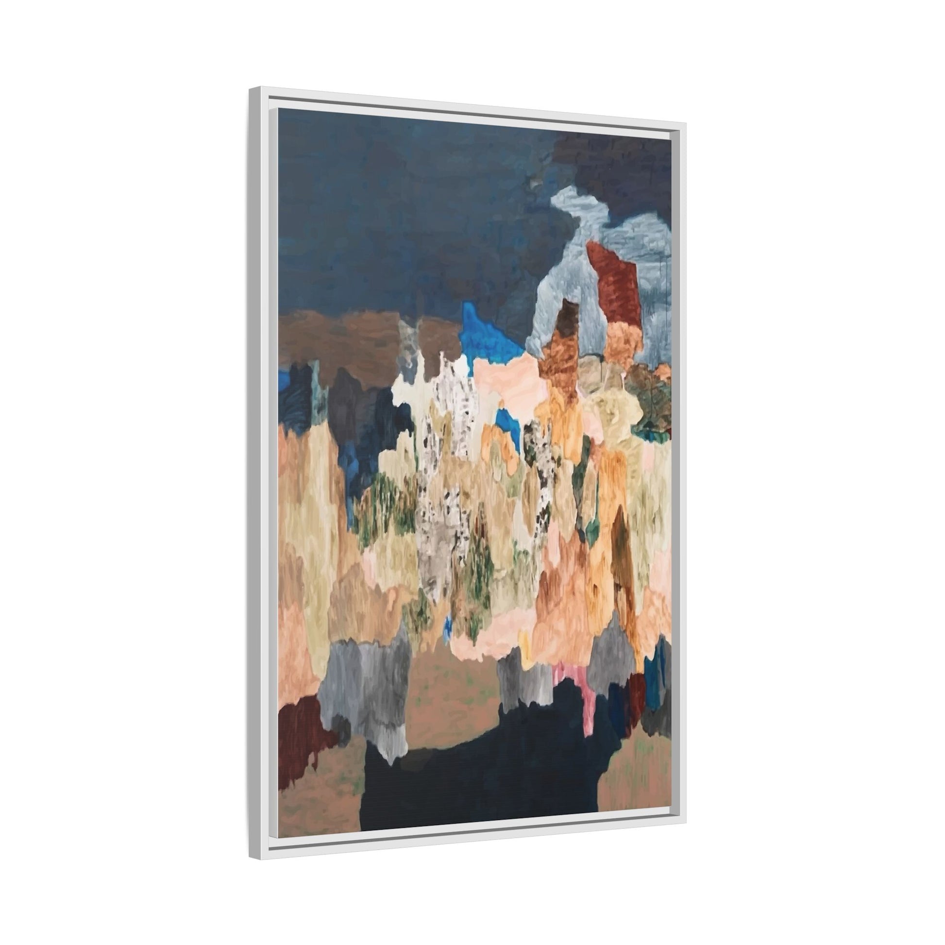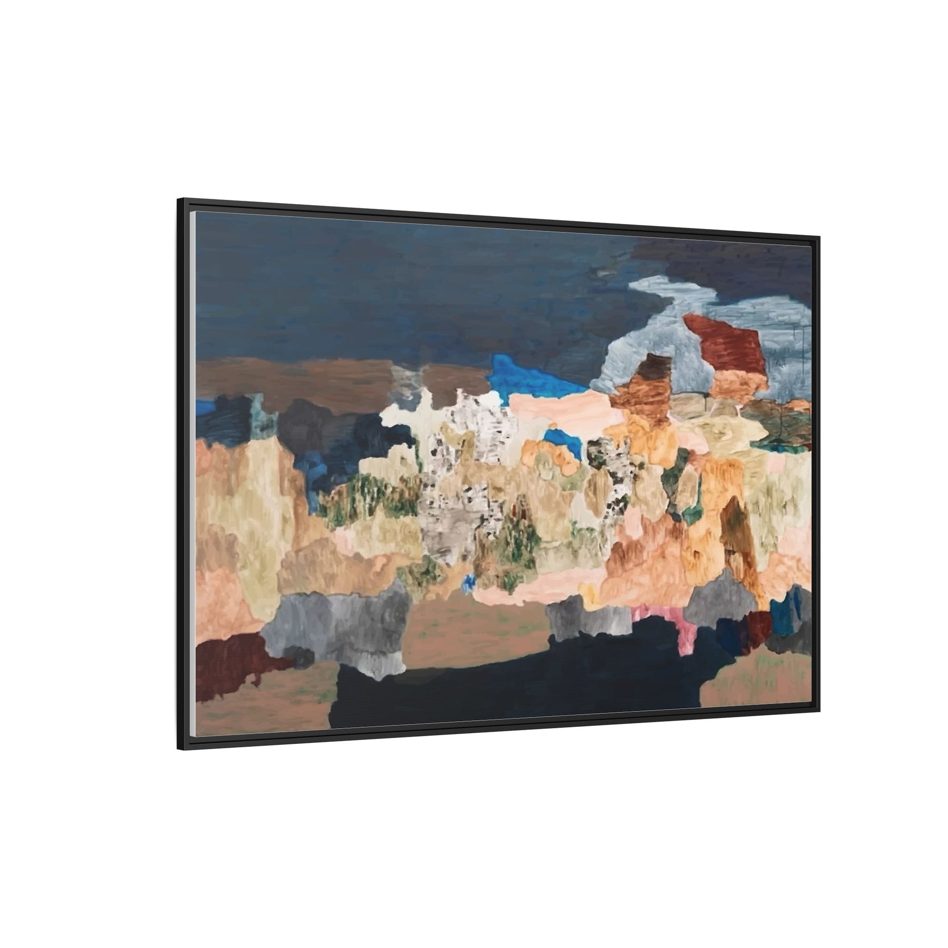 This abstract landscape painting features a complex composition of fragmented, geometric shapes in muted earth tones and cool blues. The artwork appears to depict a deconstructed, textured landscape with irregular blocks and patches representing terrain, sky, and potentially architectural elements. Soft, layered watercolor or acrylic techniques create a sense of depth and movement, with colors ranging from pale pinks and yellows to deep blues, grays, and rusty oranges. The image evokes a sense of a fractured, cubist-inspired landscape, where traditional boundaries between land, sky, and structures are deliberately blurred and reimagined. The painting's style suggests a modern, interpretive approach to landscape representation, breaking down natural forms into abstract, interlocking shapes.