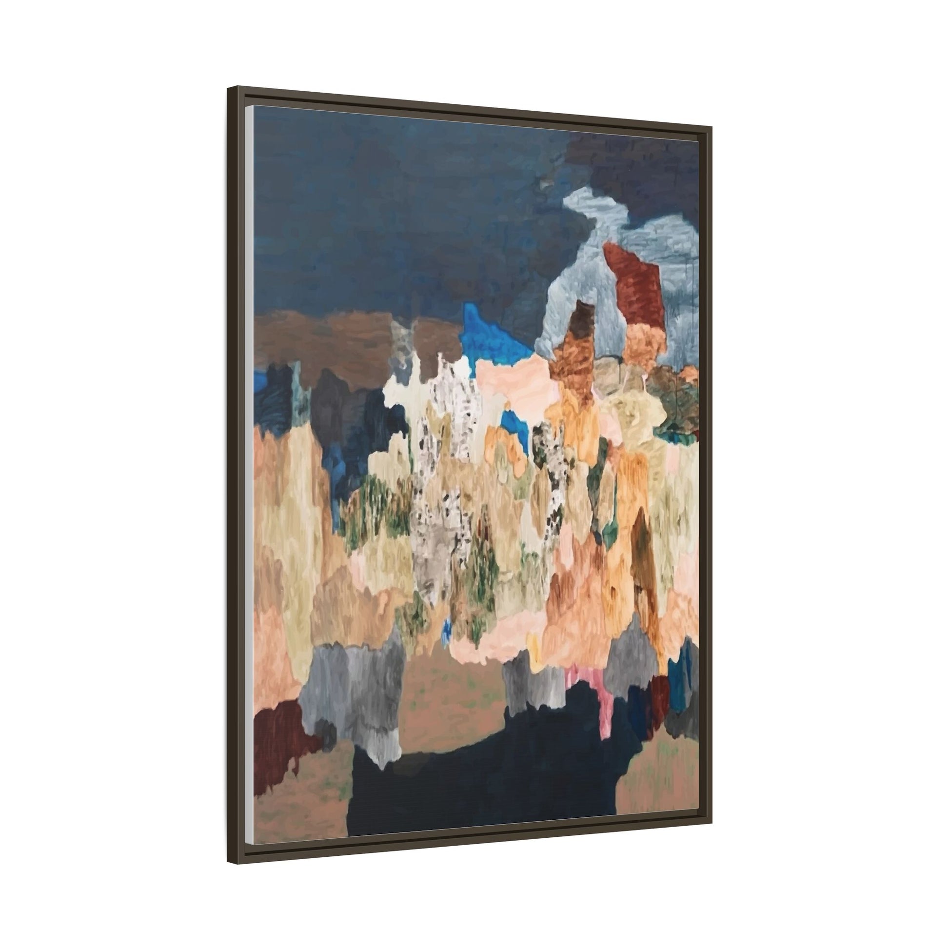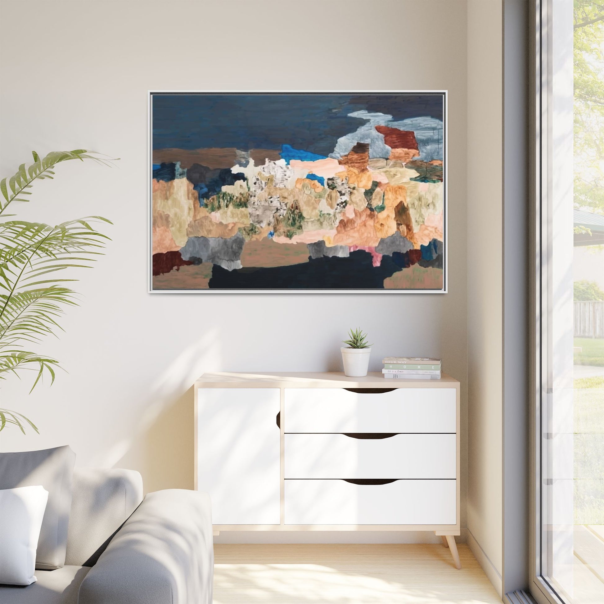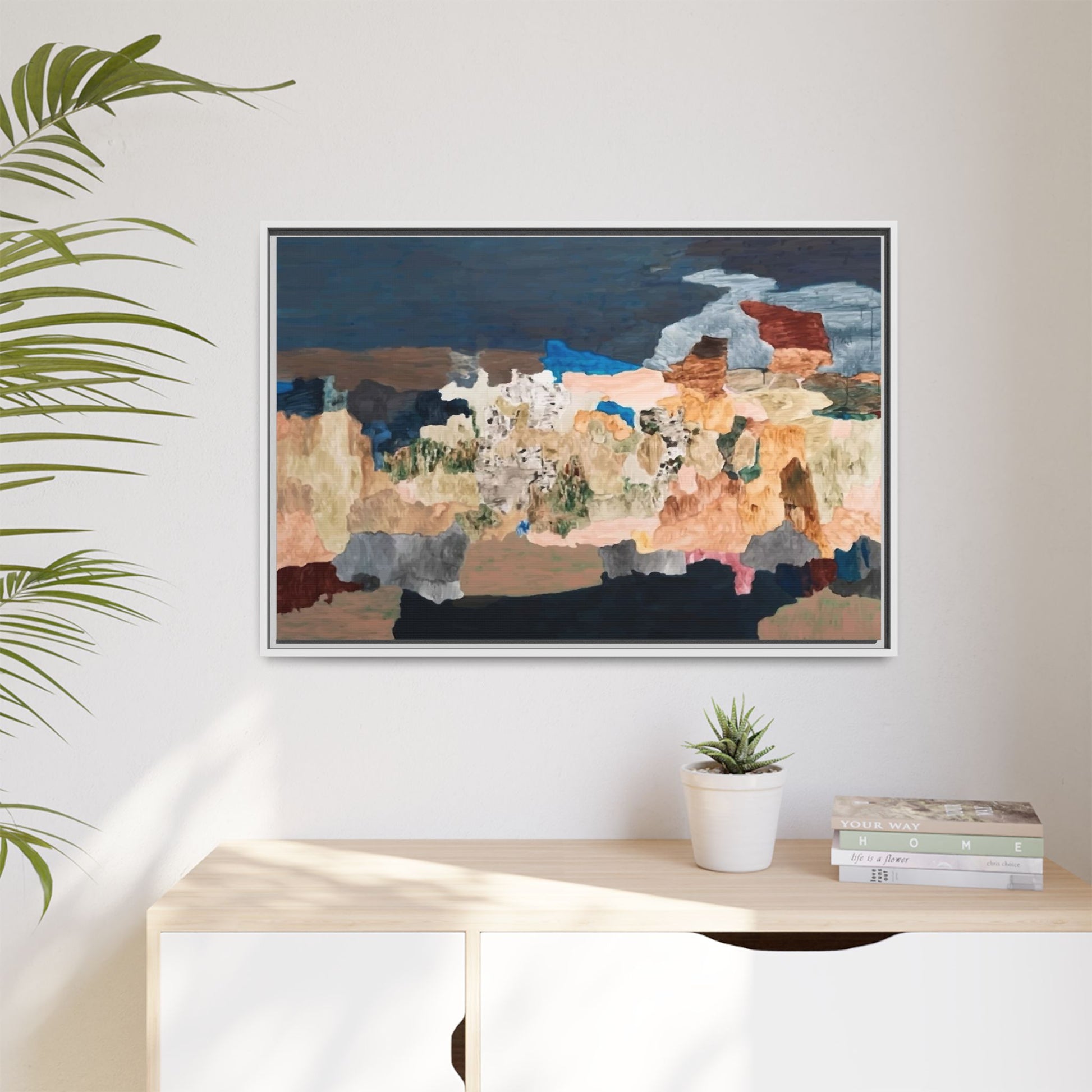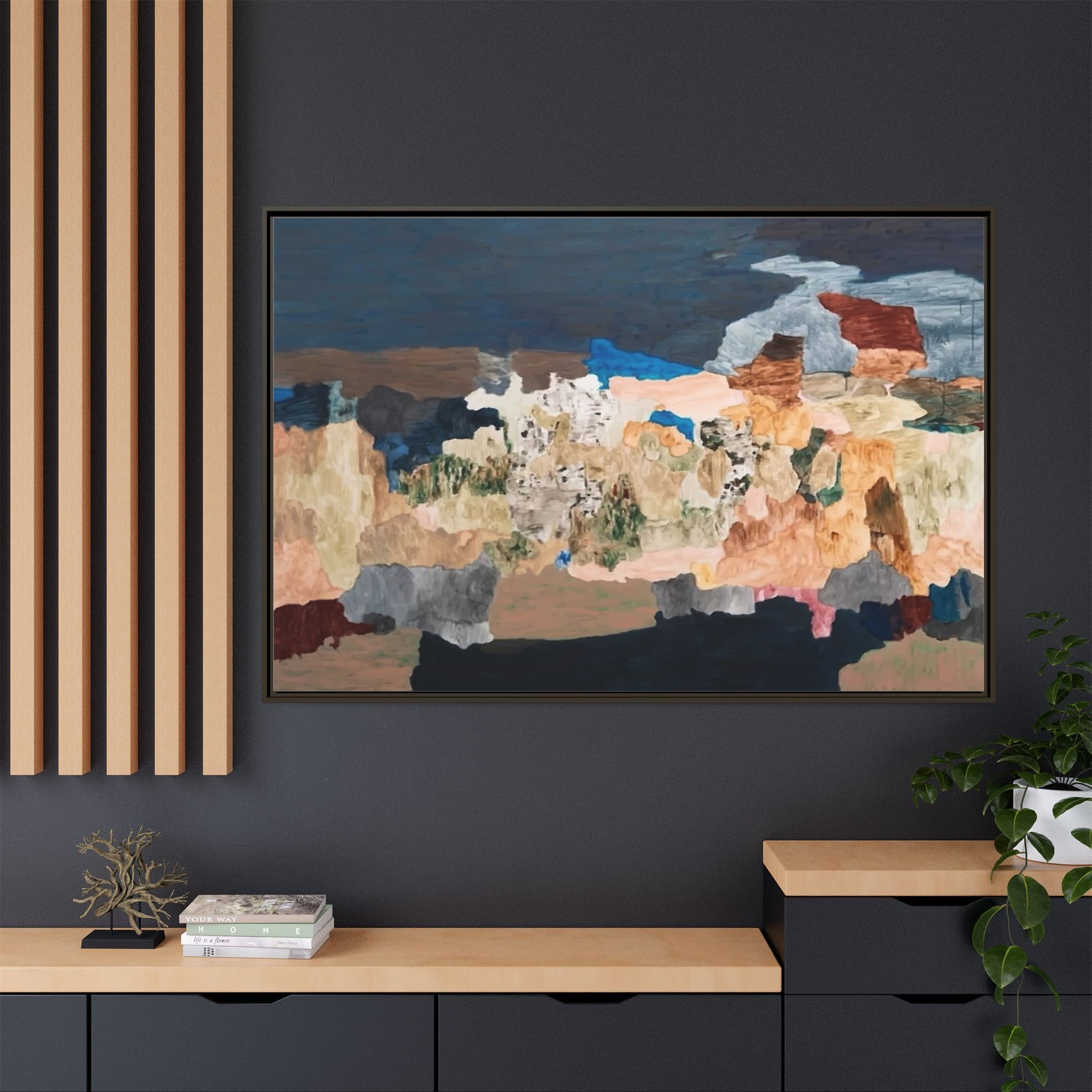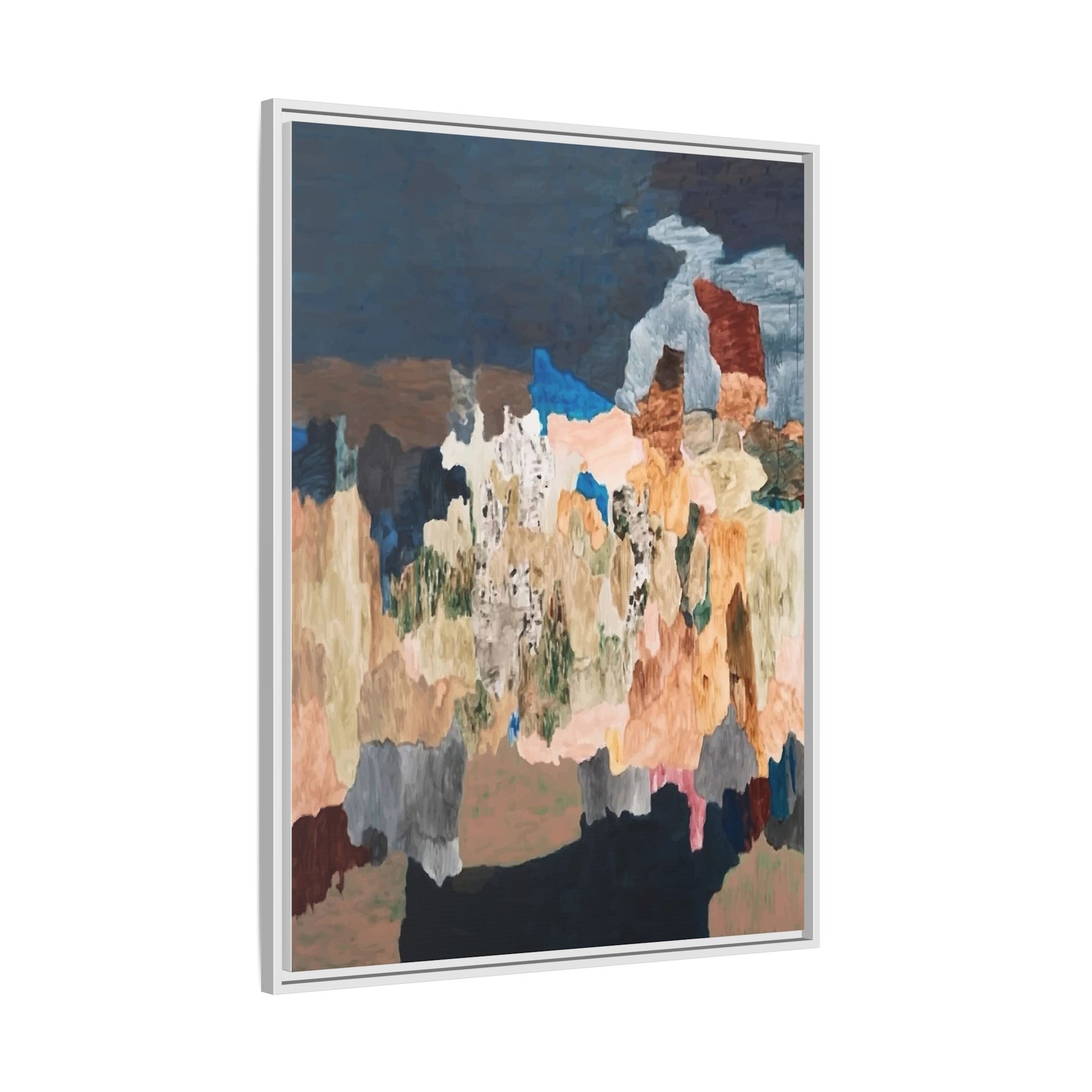 This abstract landscape painting features a complex composition of fragmented, geometric shapes in muted earth tones and cool blues. The artwork appears to depict a deconstructed, textured landscape with irregular blocks and patches representing terrain, sky, and potentially architectural elements. Soft, layered watercolor or acrylic techniques create a sense of depth and movement, with colors ranging from pale pinks and yellows to deep blues, grays, and rusty oranges. The image evokes a sense of a fractured, cubist-inspired landscape, where traditional boundaries between land, sky, and structures are deliberately blurred and reimagined. The painting's style suggests a modern, interpretive approach to landscape representation, breaking down natural forms into abstract, interlocking shapes.