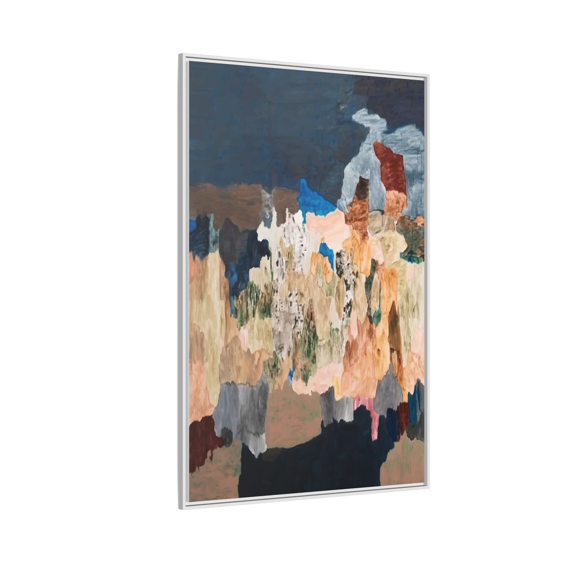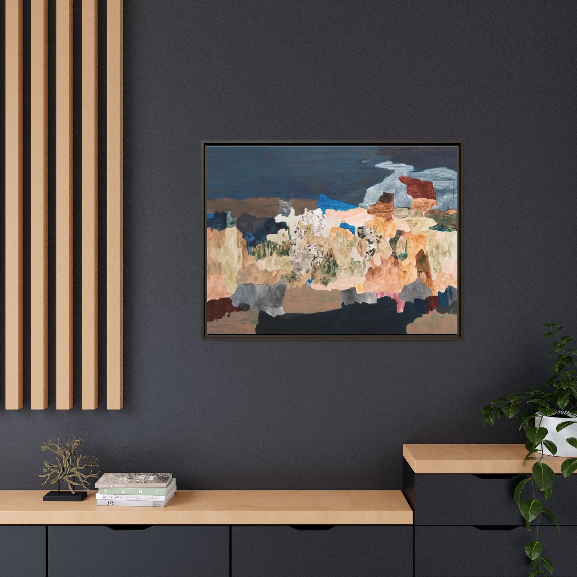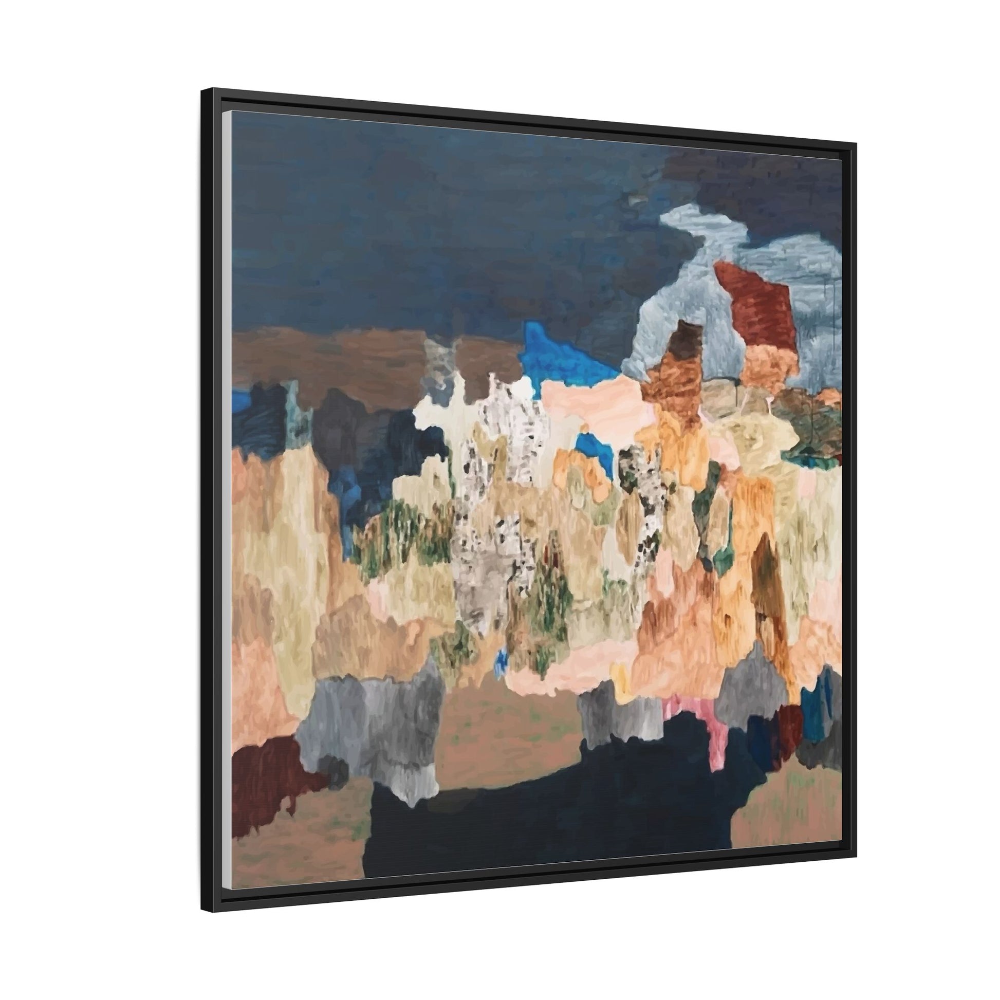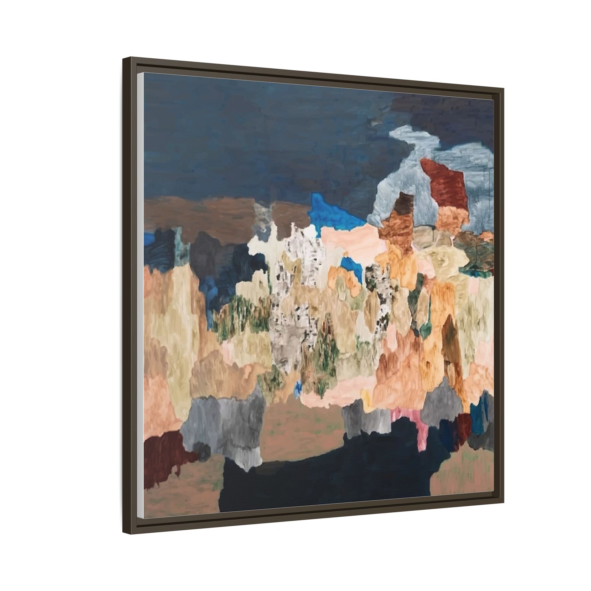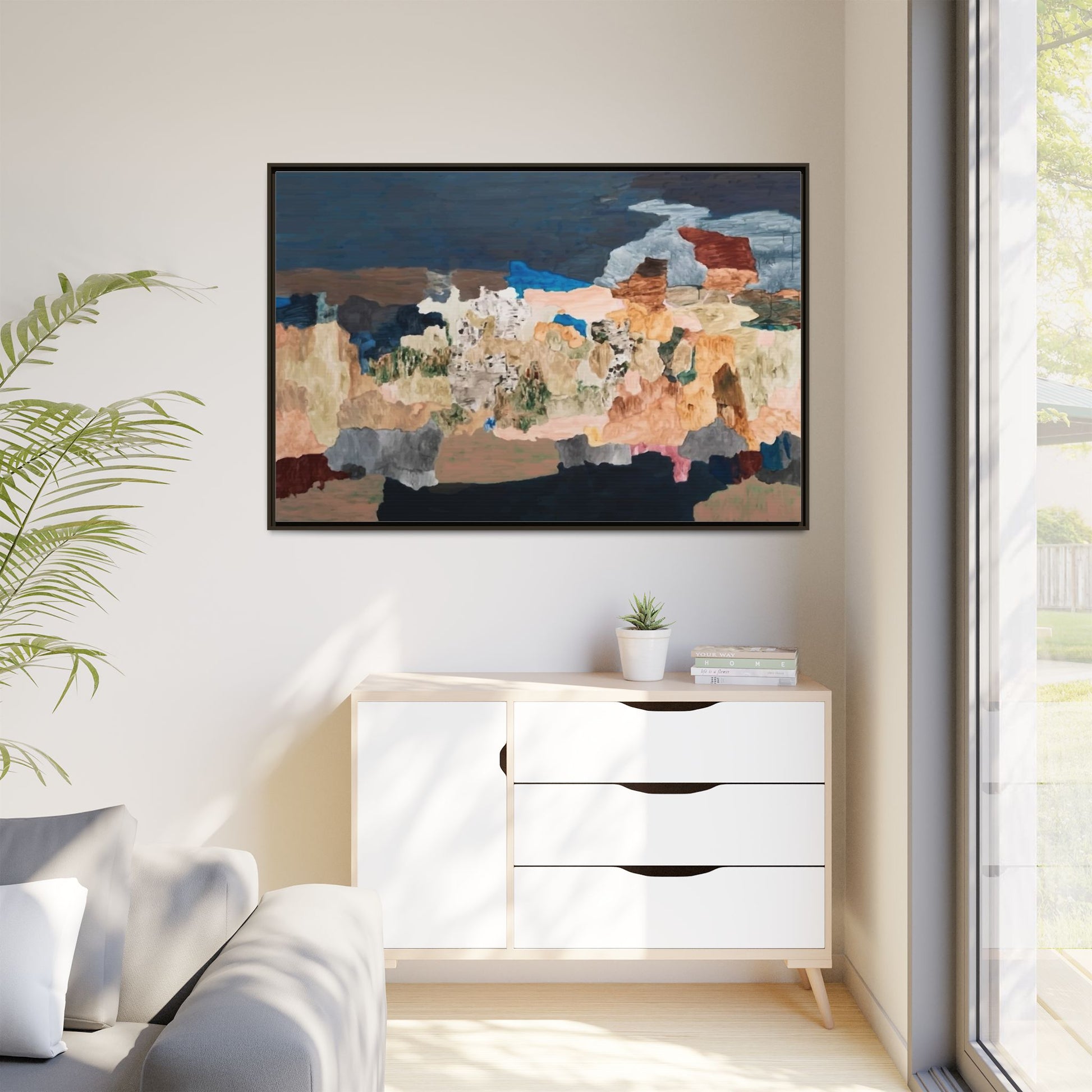 This abstract landscape painting features a complex composition of fragmented, geometric shapes in muted earth tones and cool blues. The artwork appears to depict a deconstructed, textured landscape with irregular blocks and patches representing terrain, sky, and potentially architectural elements. Soft, layered watercolor or acrylic techniques create a sense of depth and movement, with colors ranging from pale pinks and yellows to deep blues, grays, and rusty oranges. The image evokes a sense of a fractured, cubist-inspired landscape, where traditional boundaries between land, sky, and structures are deliberately blurred and reimagined. The painting's style suggests a modern, interpretive approach to landscape representation, breaking down natural forms into abstract, interlocking shapes.