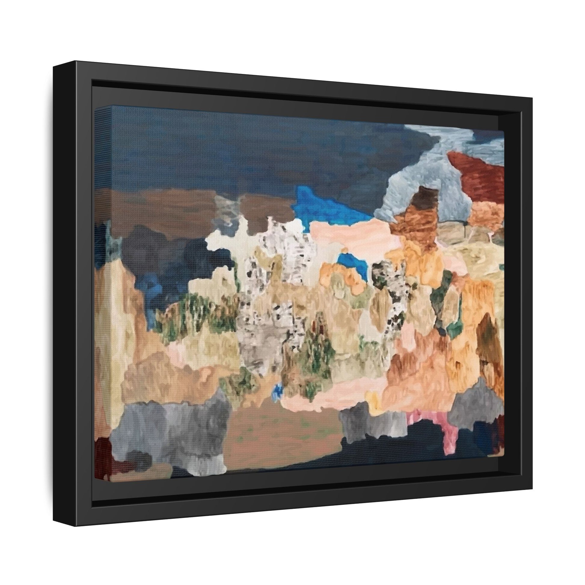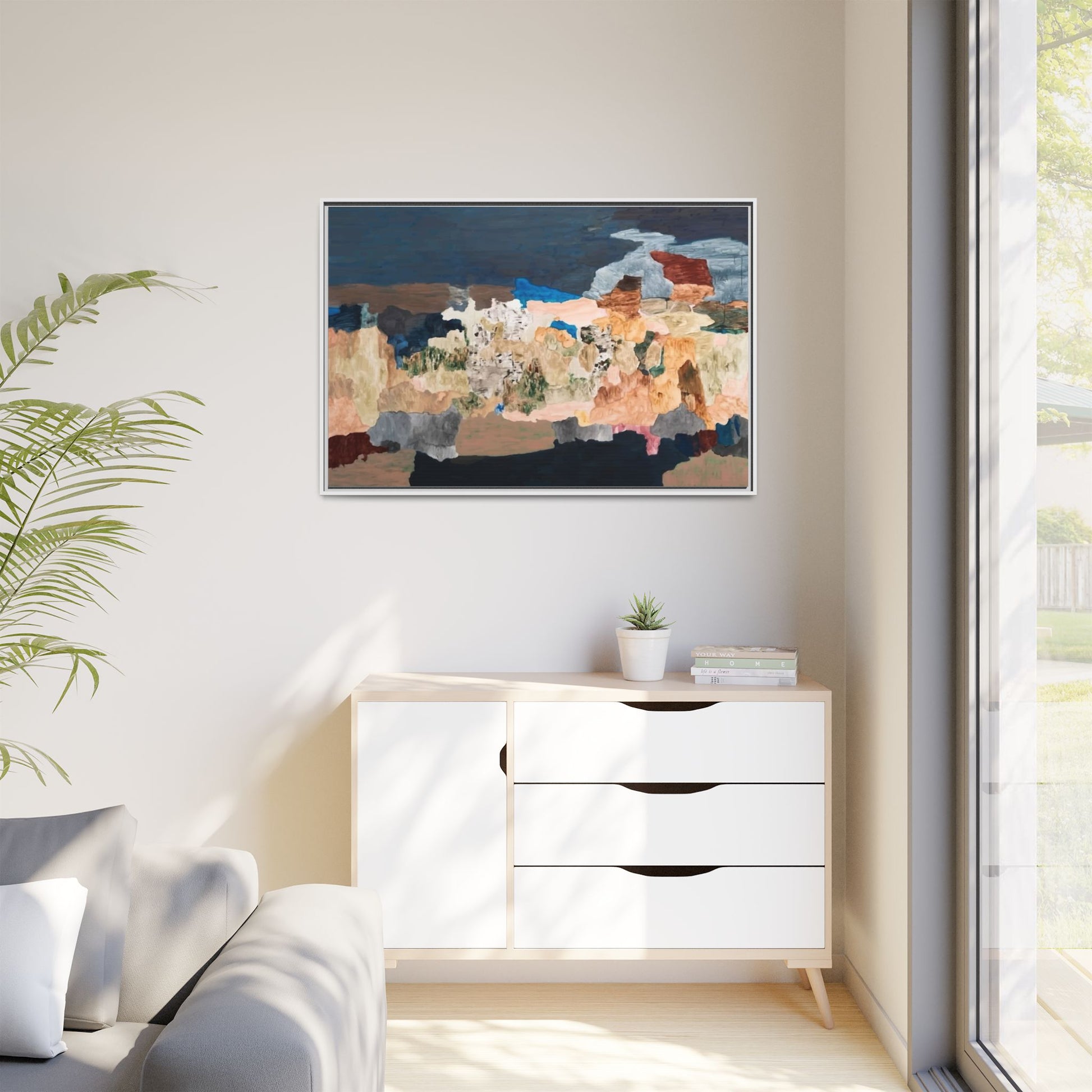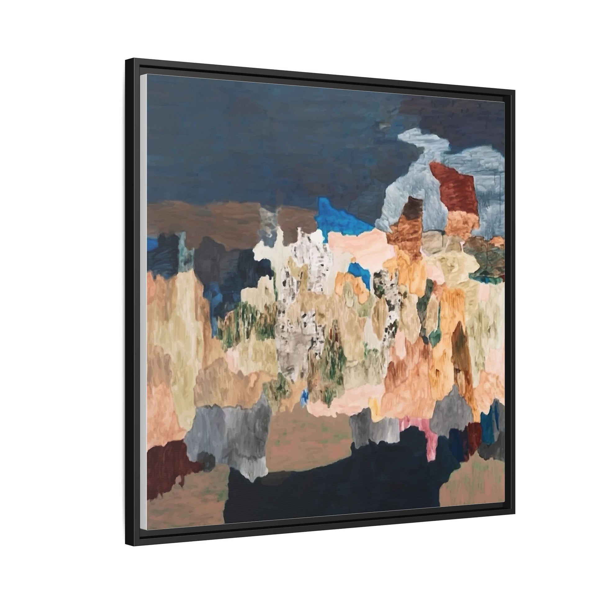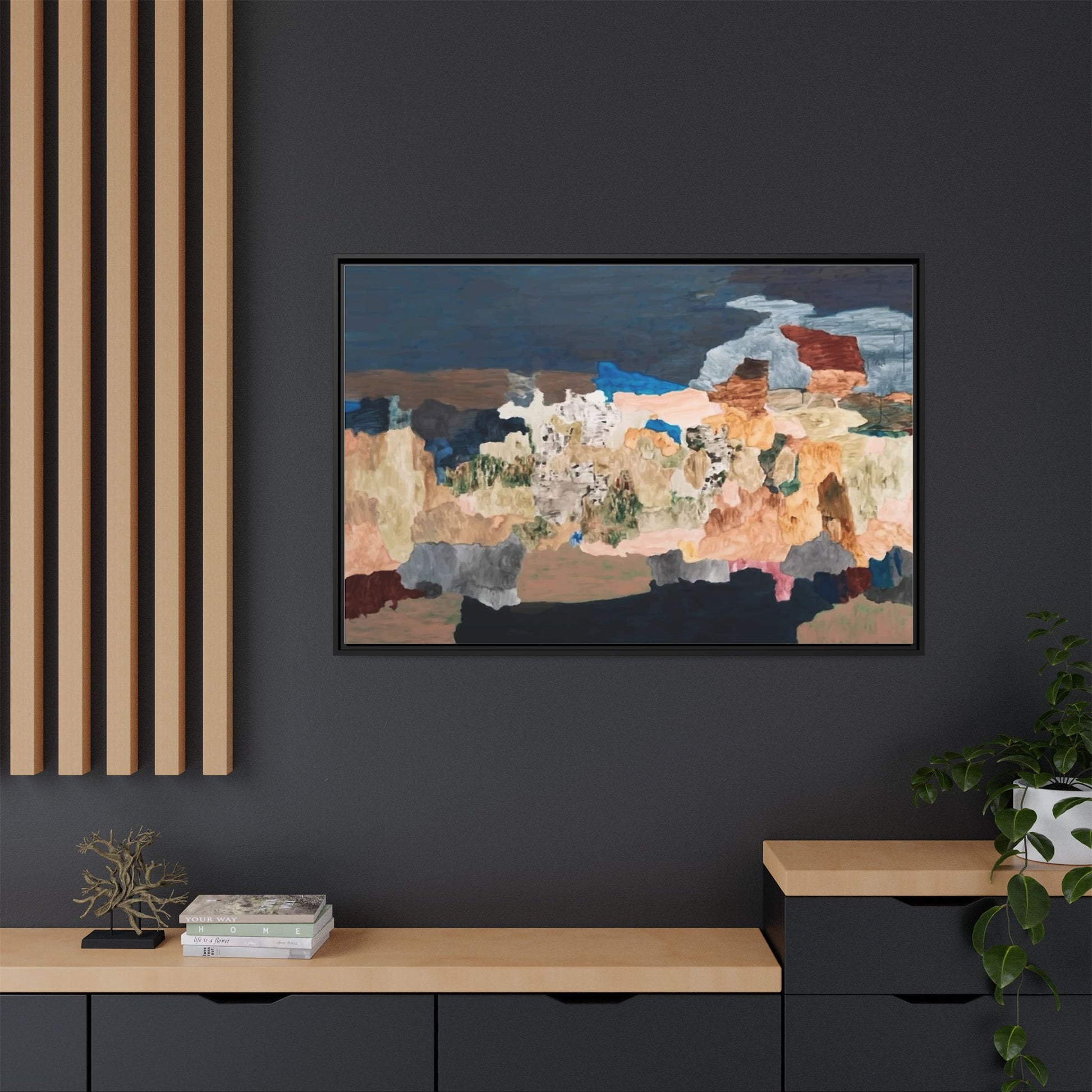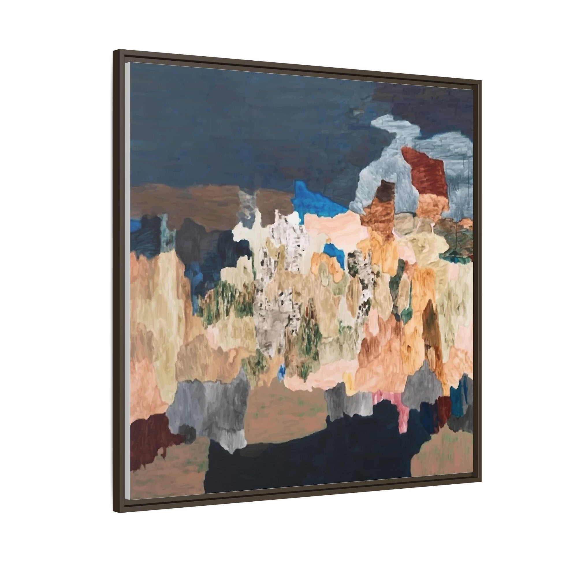 This abstract landscape painting features a complex composition of fragmented, geometric shapes in muted earth tones and cool blues. The artwork appears to depict a deconstructed, textured landscape with irregular blocks and patches representing terrain, sky, and potentially architectural elements. Soft, layered watercolor or acrylic techniques create a sense of depth and movement, with colors ranging from pale pinks and yellows to deep blues, grays, and rusty oranges. The image evokes a sense of a fractured, cubist-inspired landscape, where traditional boundaries between land, sky, and structures are deliberately blurred and reimagined. The painting's style suggests a modern, interpretive approach to landscape representation, breaking down natural forms into abstract, interlocking shapes.