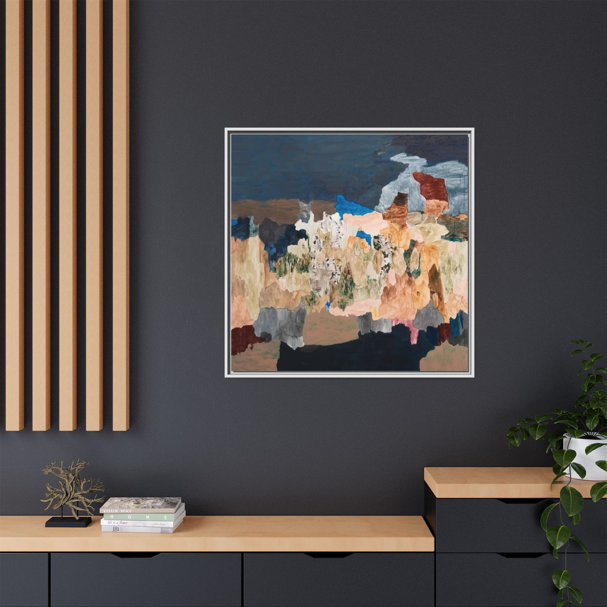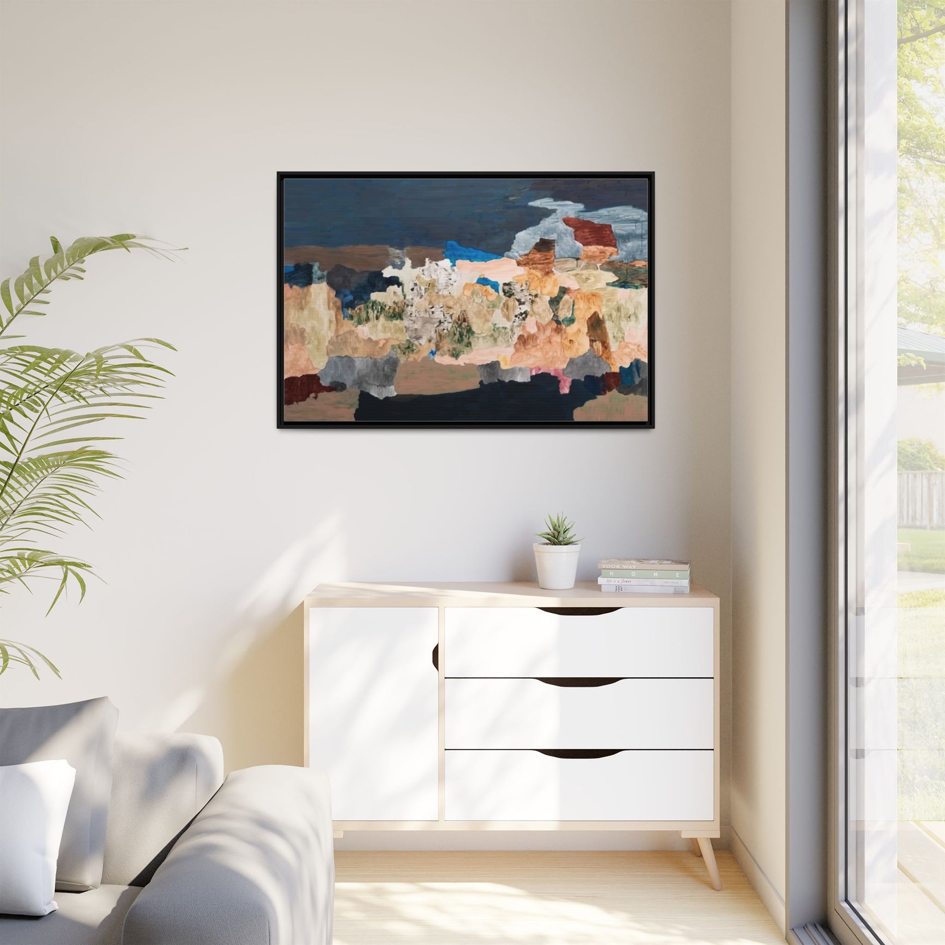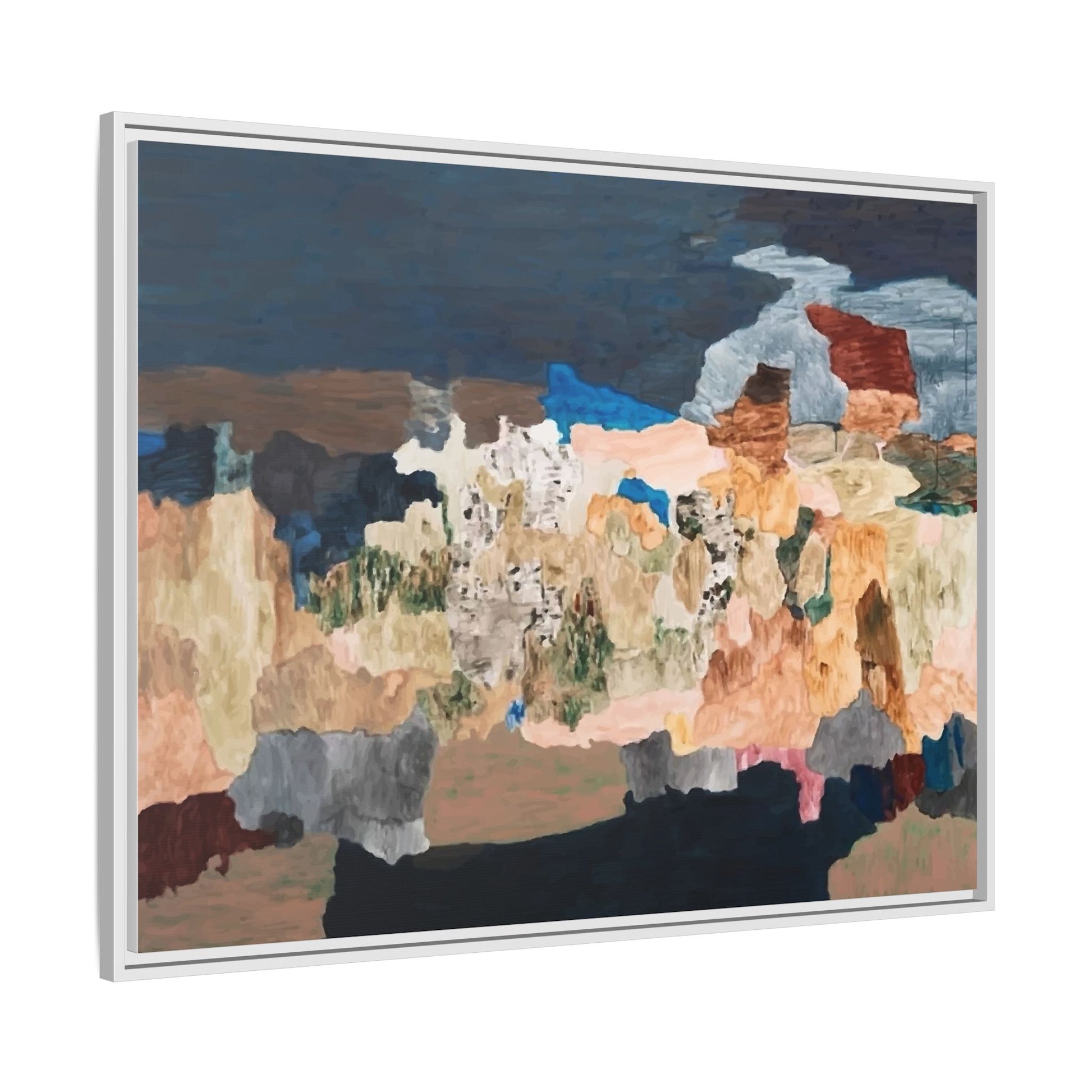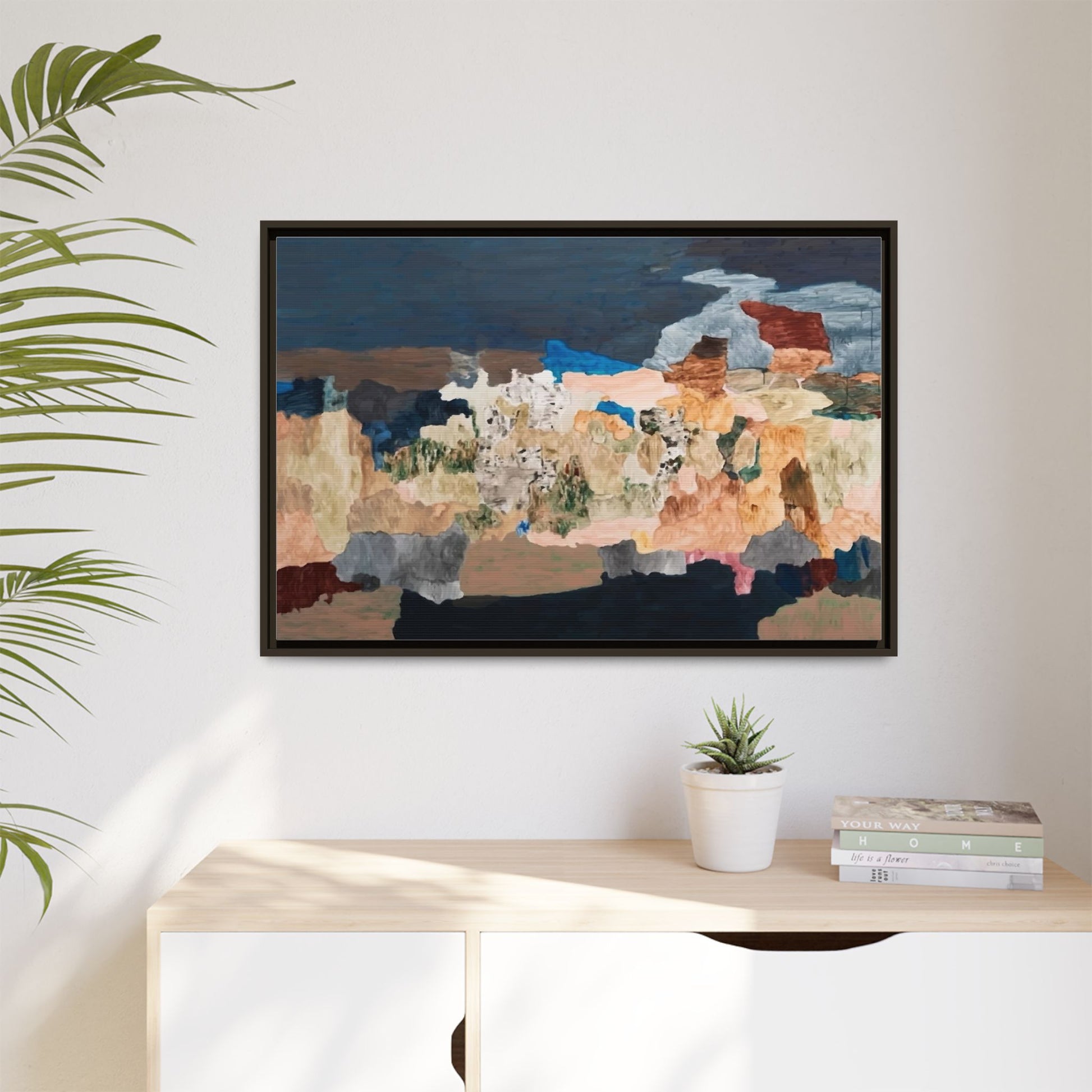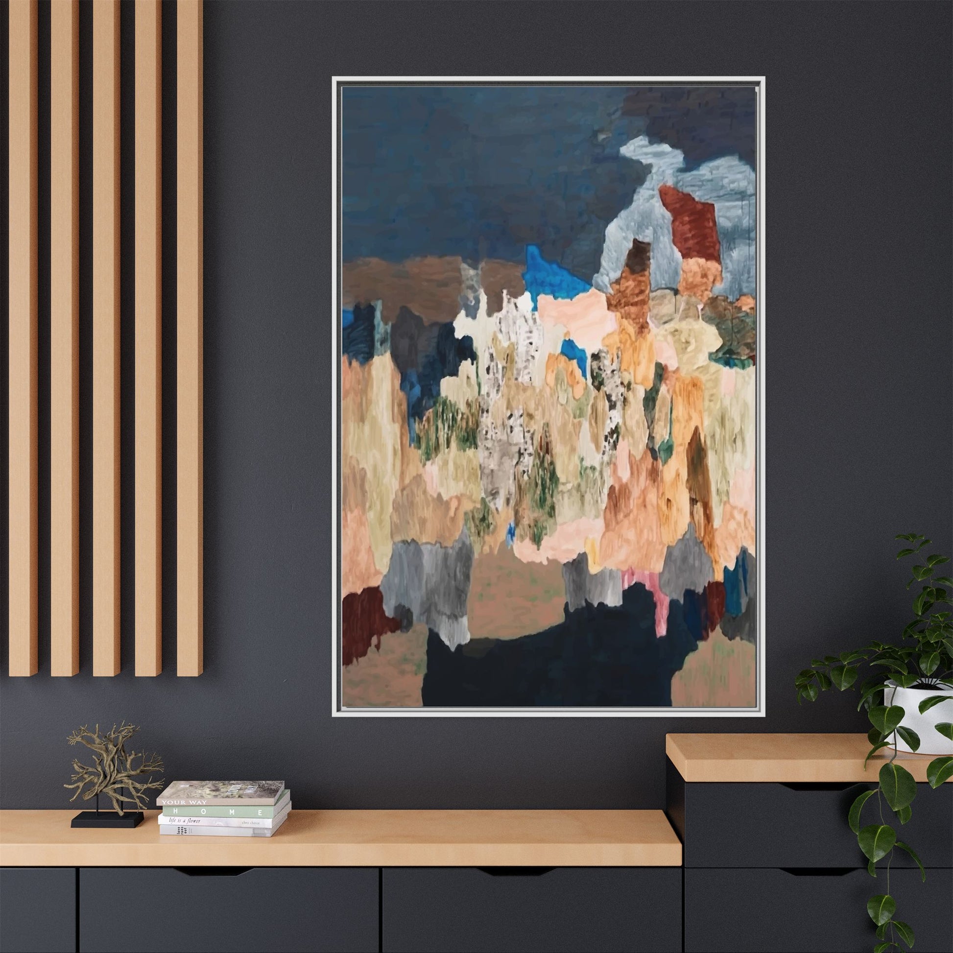 This abstract landscape painting features a complex composition of fragmented, geometric shapes in muted earth tones and cool blues. The artwork appears to depict a deconstructed, textured landscape with irregular blocks and patches representing terrain, sky, and potentially architectural elements. Soft, layered watercolor or acrylic techniques create a sense of depth and movement, with colors ranging from pale pinks and yellows to deep blues, grays, and rusty oranges. The image evokes a sense of a fractured, cubist-inspired landscape, where traditional boundaries between land, sky, and structures are deliberately blurred and reimagined. The painting's style suggests a modern, interpretive approach to landscape representation, breaking down natural forms into abstract, interlocking shapes.