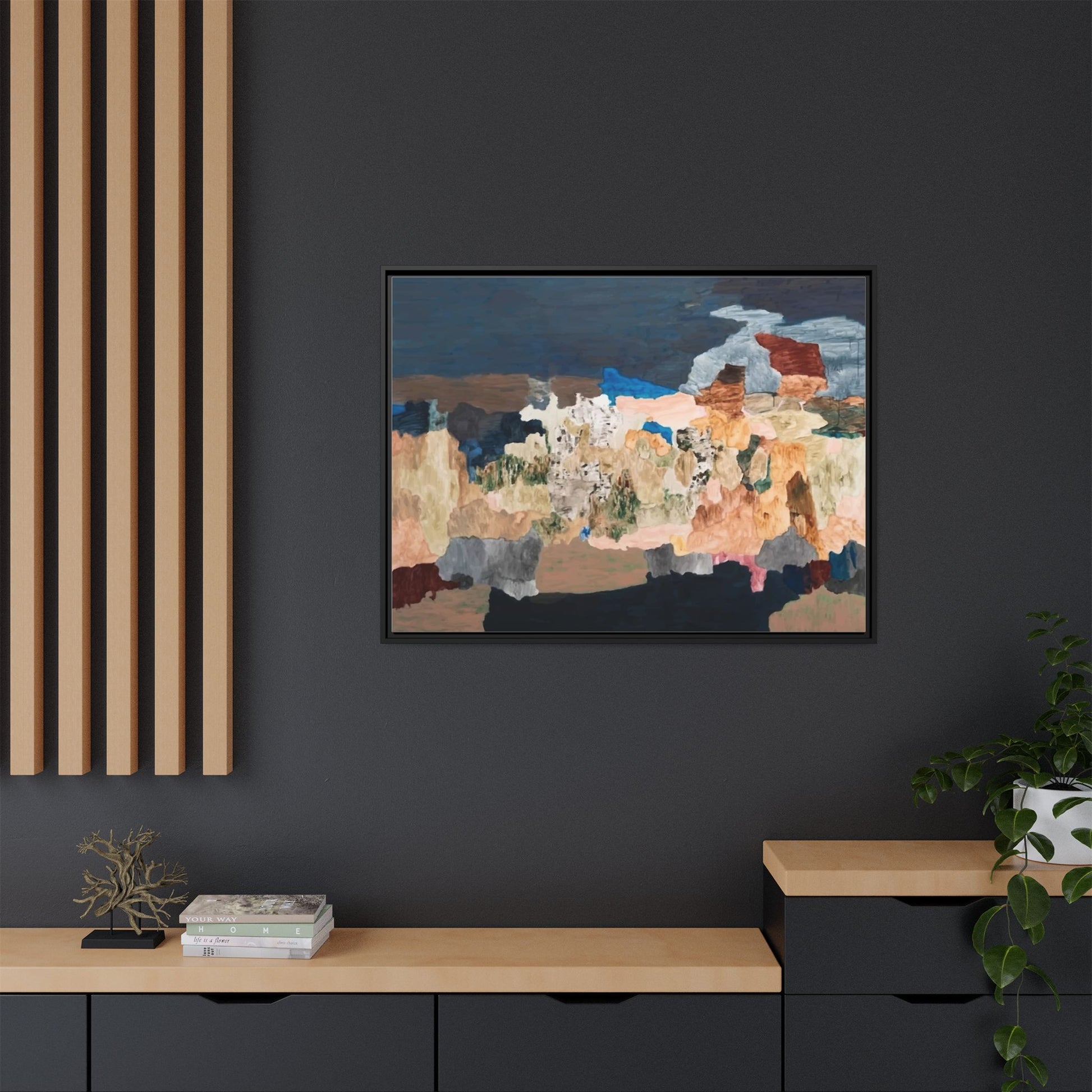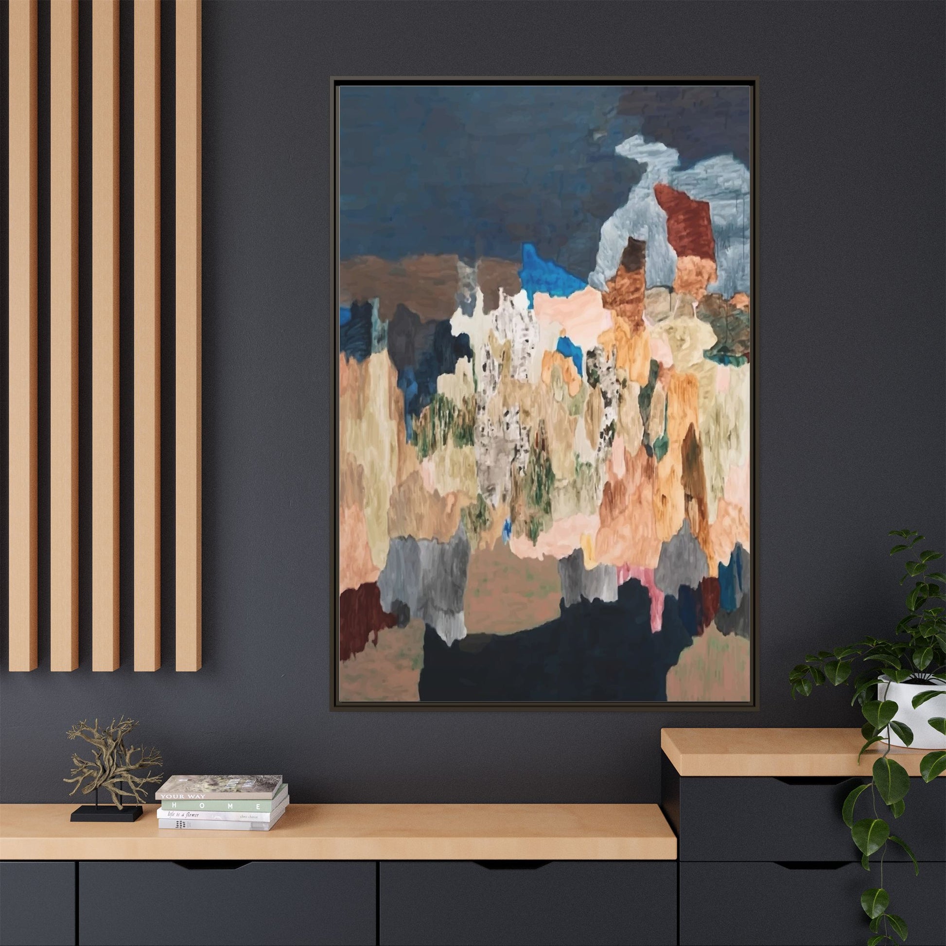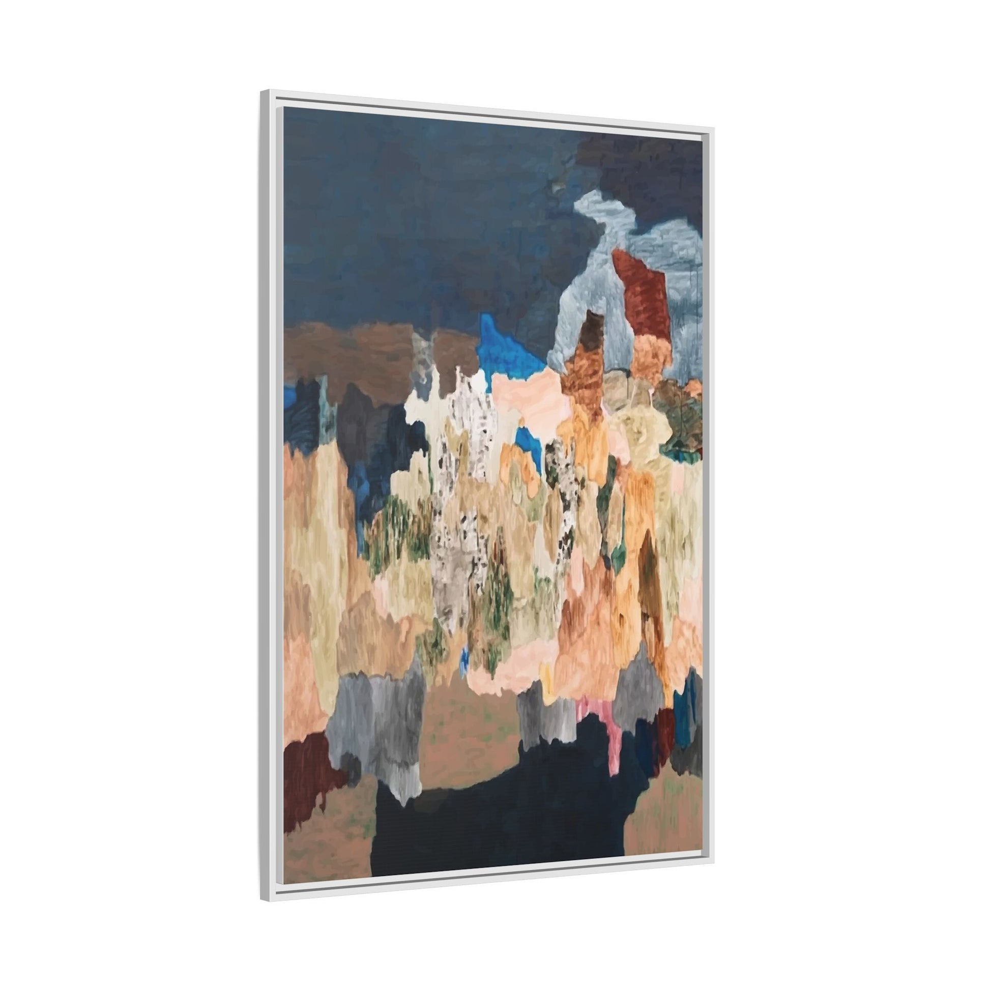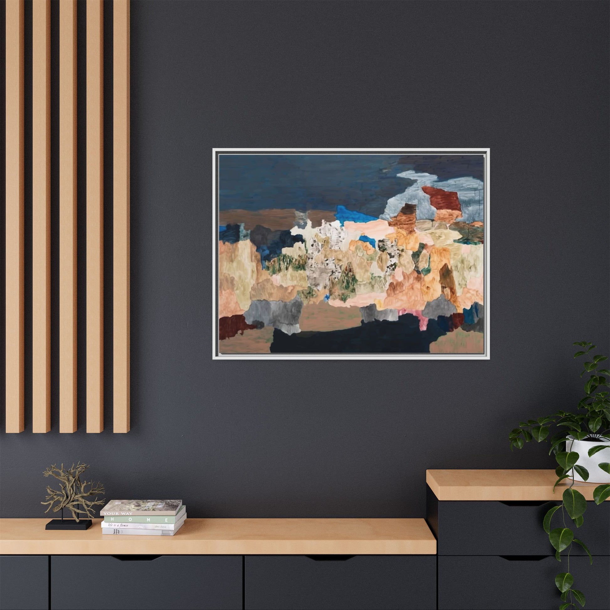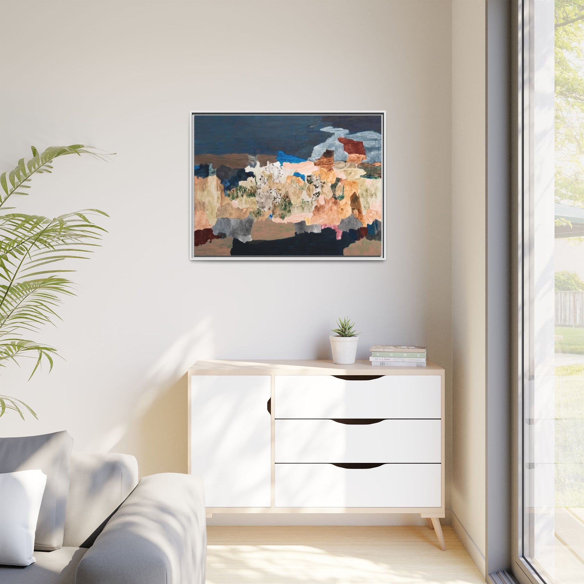 This abstract landscape painting features a complex composition of fragmented, geometric shapes in muted earth tones and cool blues. The artwork appears to depict a deconstructed, textured landscape with irregular blocks and patches representing terrain, sky, and potentially architectural elements. Soft, layered watercolor or acrylic techniques create a sense of depth and movement, with colors ranging from pale pinks and yellows to deep blues, grays, and rusty oranges. The image evokes a sense of a fractured, cubist-inspired landscape, where traditional boundaries between land, sky, and structures are deliberately blurred and reimagined. The painting's style suggests a modern, interpretive approach to landscape representation, breaking down natural forms into abstract, interlocking shapes.