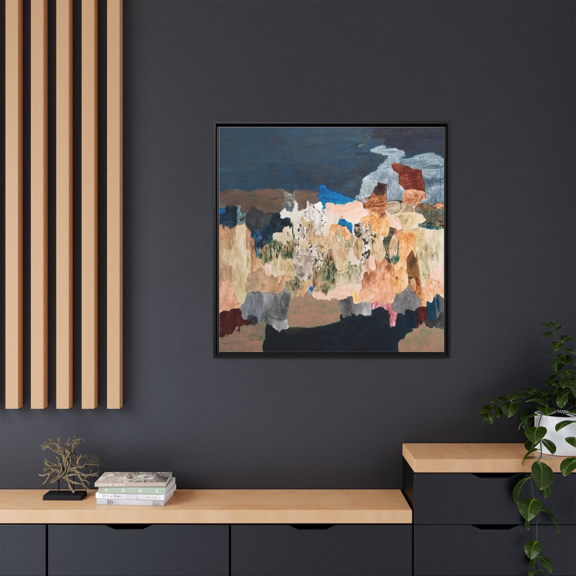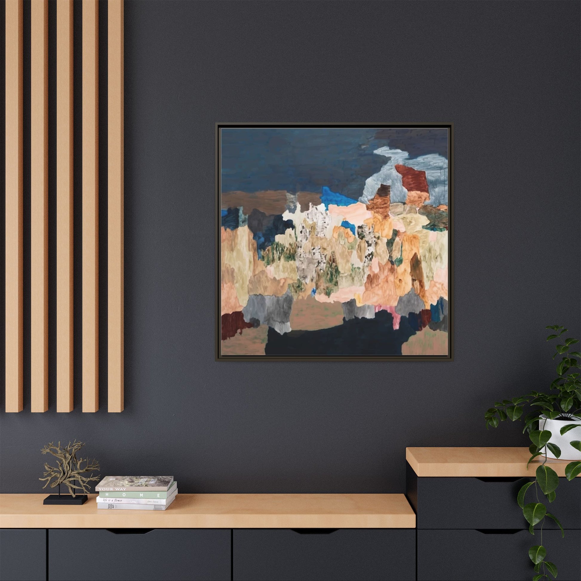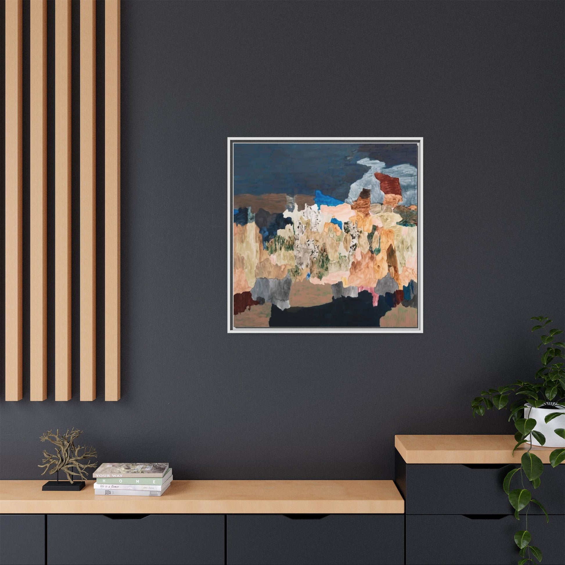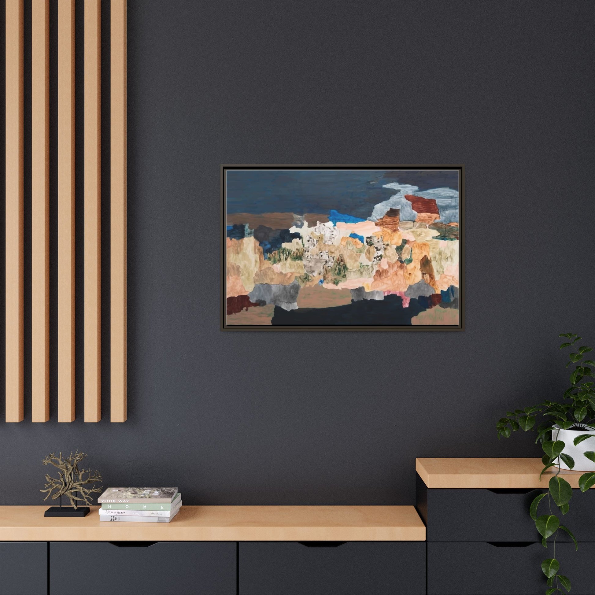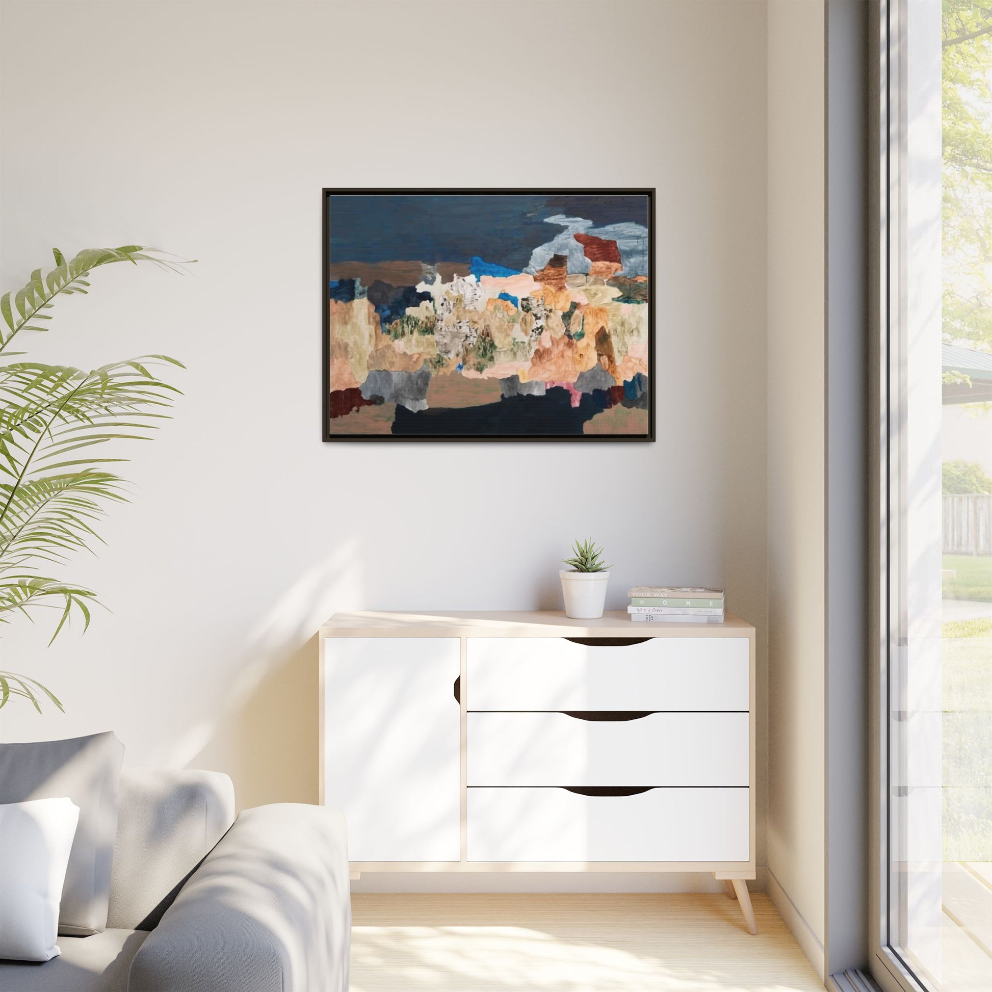 This abstract landscape painting features a complex composition of fragmented, geometric shapes in muted earth tones and cool blues. The artwork appears to depict a deconstructed, textured landscape with irregular blocks and patches representing terrain, sky, and potentially architectural elements. Soft, layered watercolor or acrylic techniques create a sense of depth and movement, with colors ranging from pale pinks and yellows to deep blues, grays, and rusty oranges. The image evokes a sense of a fractured, cubist-inspired landscape, where traditional boundaries between land, sky, and structures are deliberately blurred and reimagined. The painting's style suggests a modern, interpretive approach to landscape representation, breaking down natural forms into abstract, interlocking shapes.