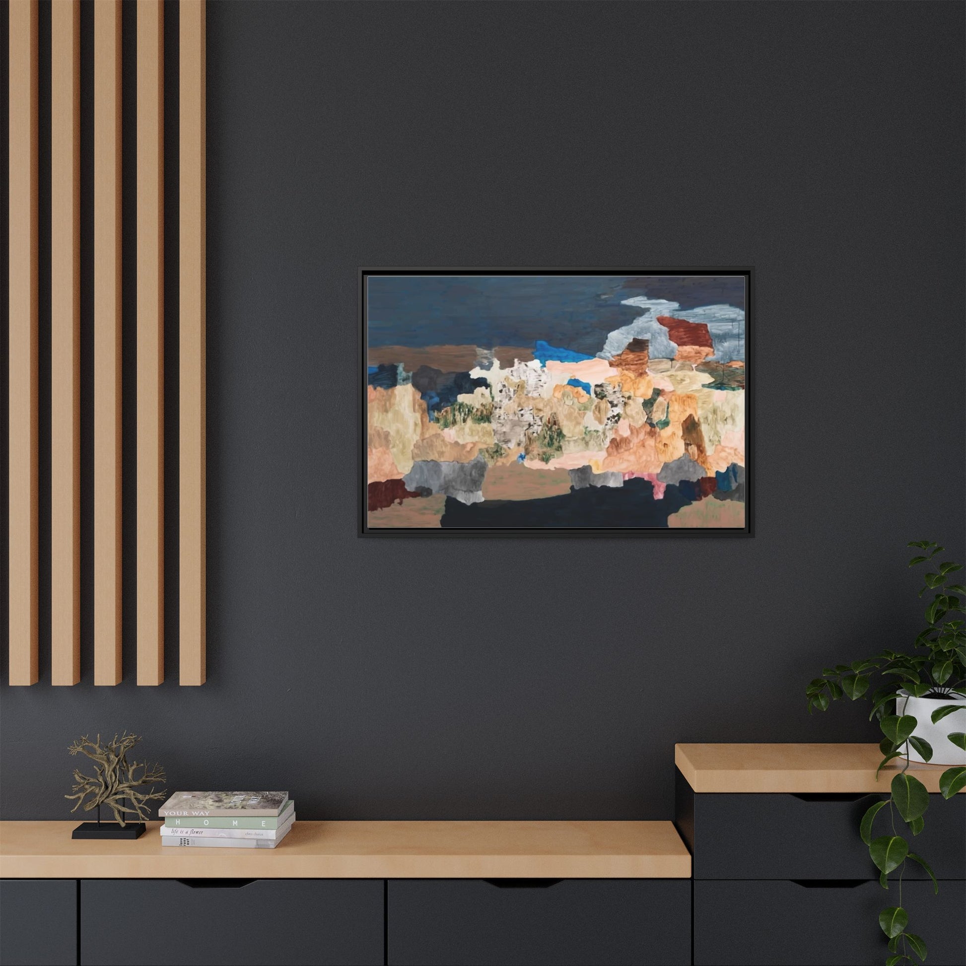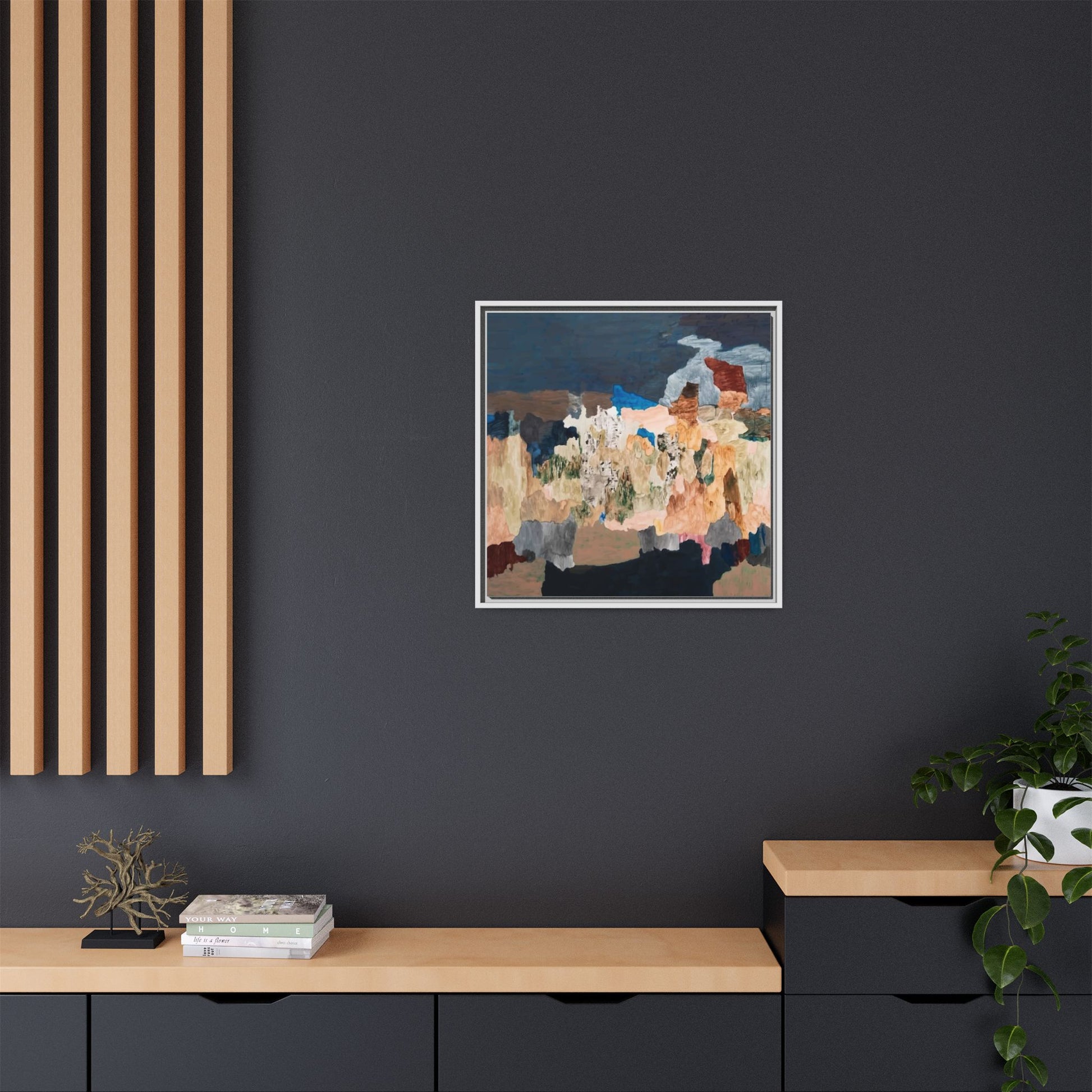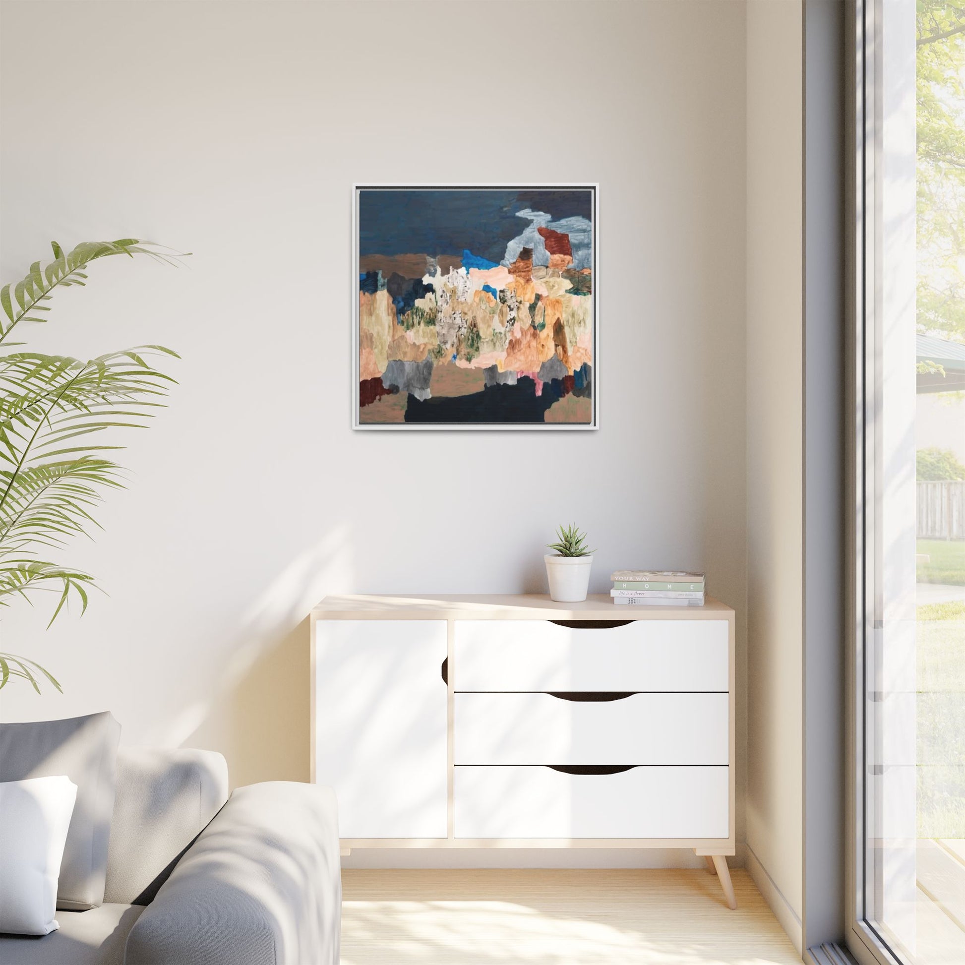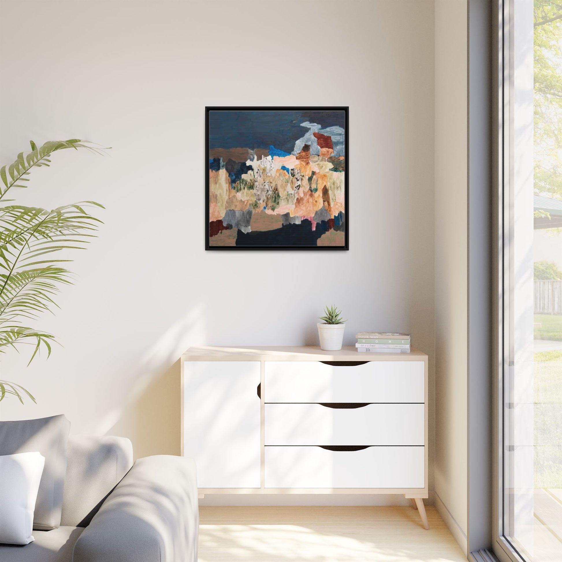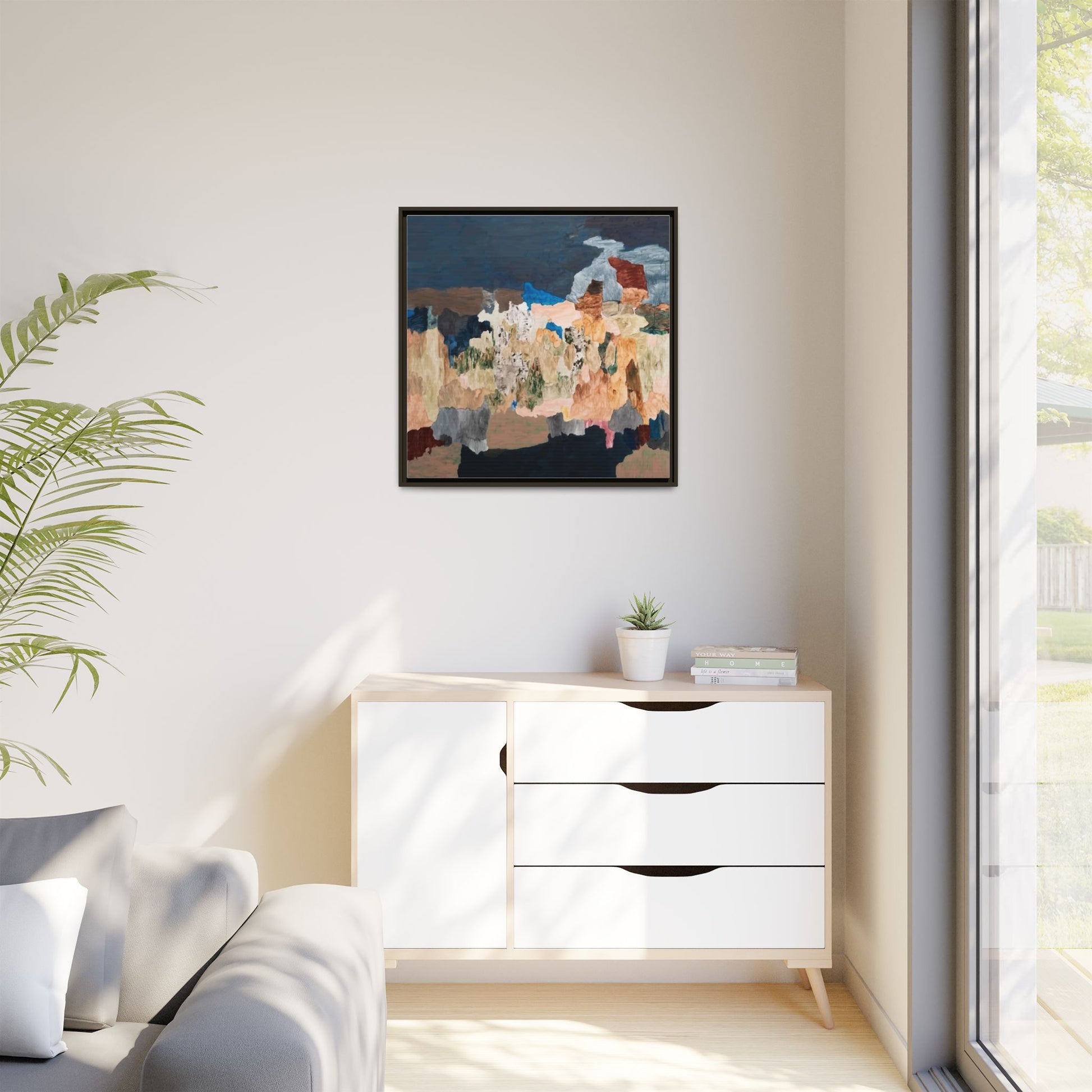 This abstract landscape painting features a complex composition of fragmented, geometric shapes in muted earth tones and cool blues. The artwork appears to depict a deconstructed, textured landscape with irregular blocks and patches representing terrain, sky, and potentially architectural elements. Soft, layered watercolor or acrylic techniques create a sense of depth and movement, with colors ranging from pale pinks and yellows to deep blues, grays, and rusty oranges. The image evokes a sense of a fractured, cubist-inspired landscape, where traditional boundaries between land, sky, and structures are deliberately blurred and reimagined. The painting's style suggests a modern, interpretive approach to landscape representation, breaking down natural forms into abstract, interlocking shapes.