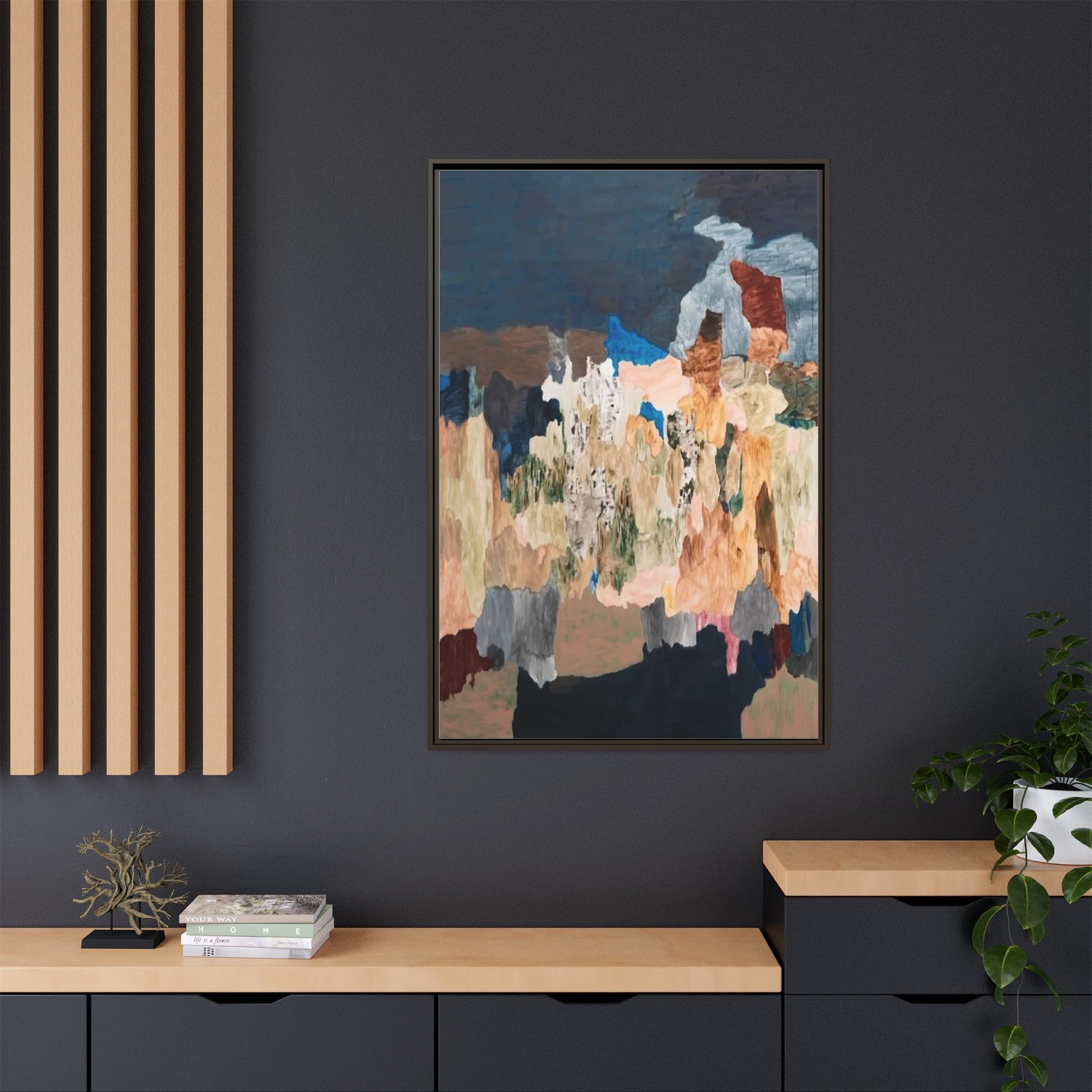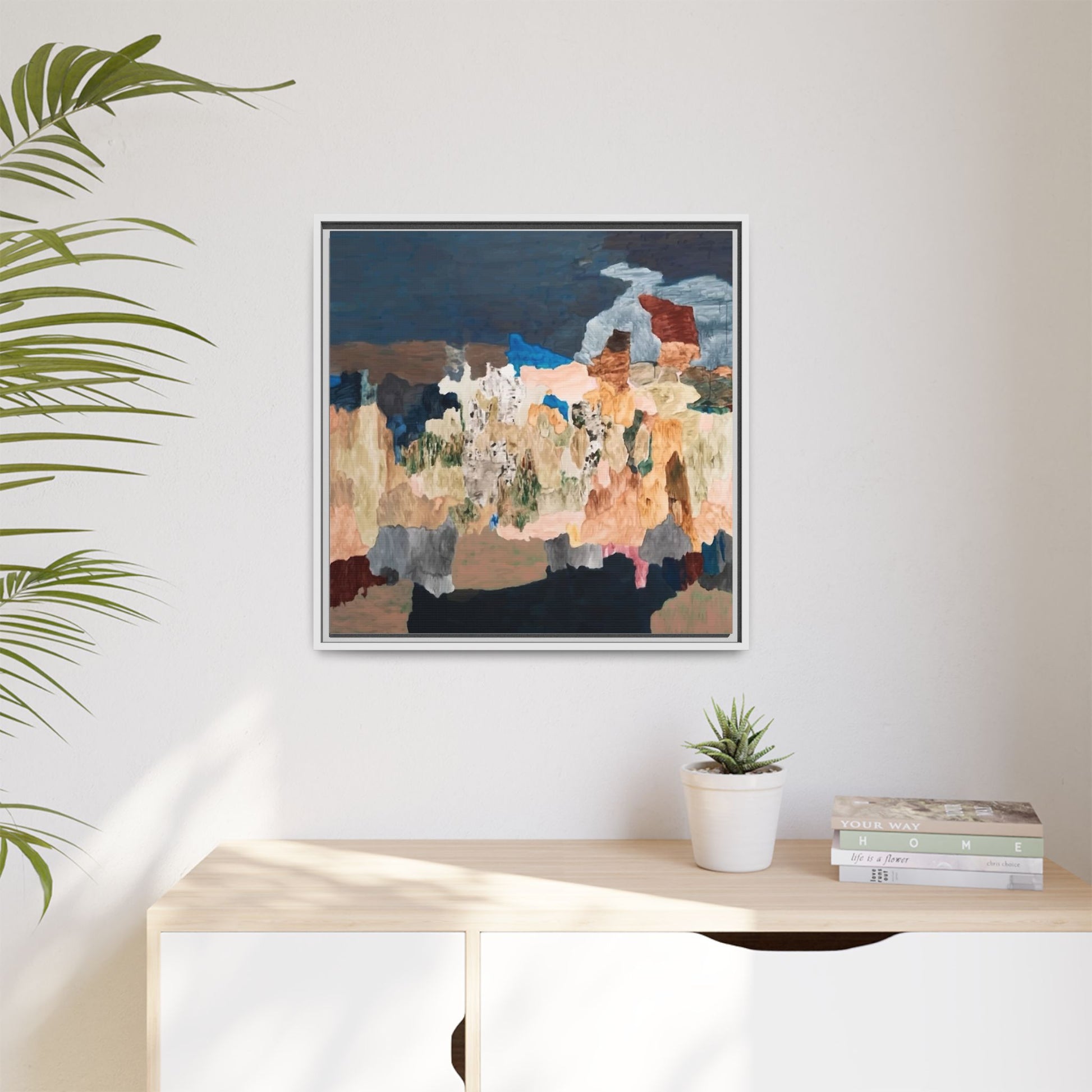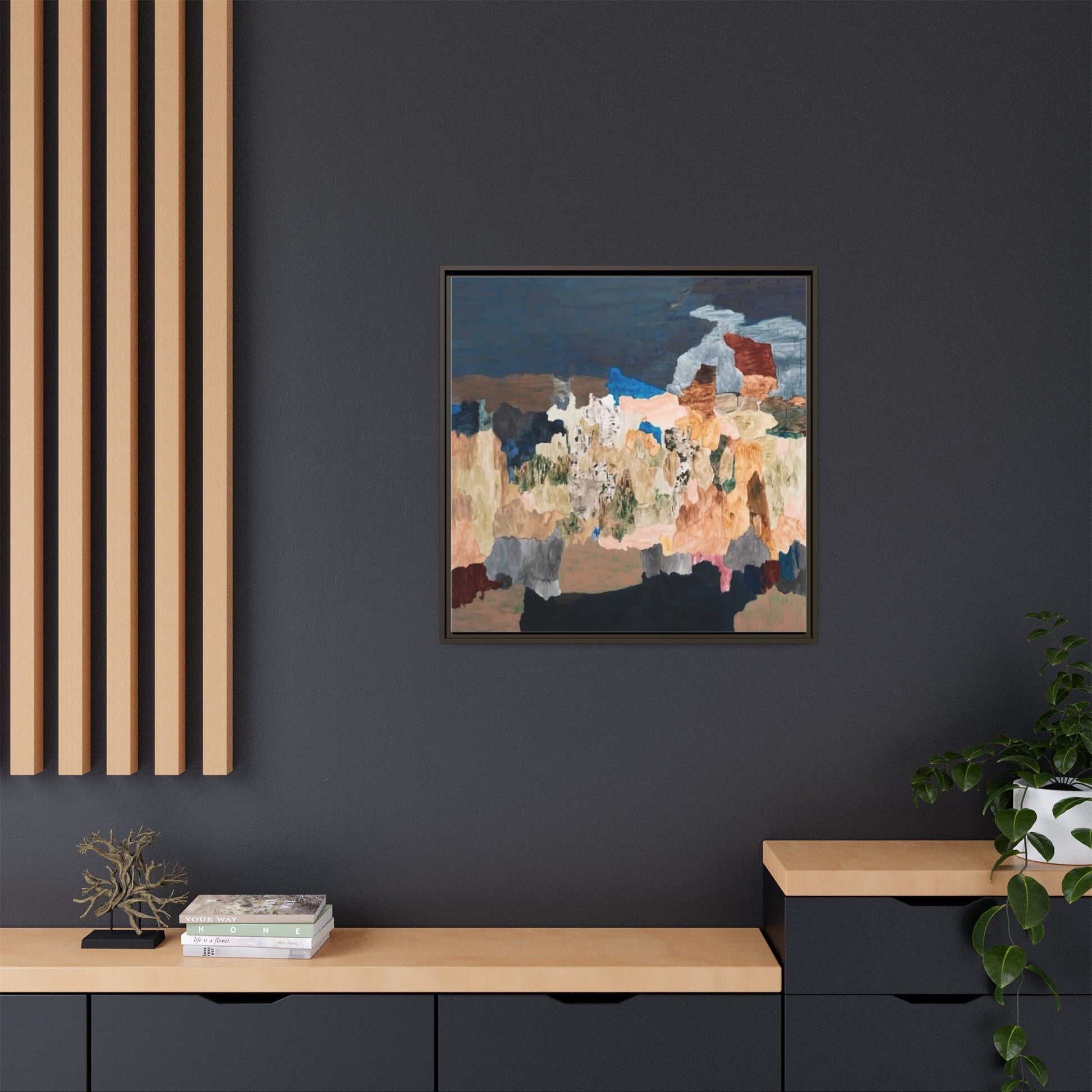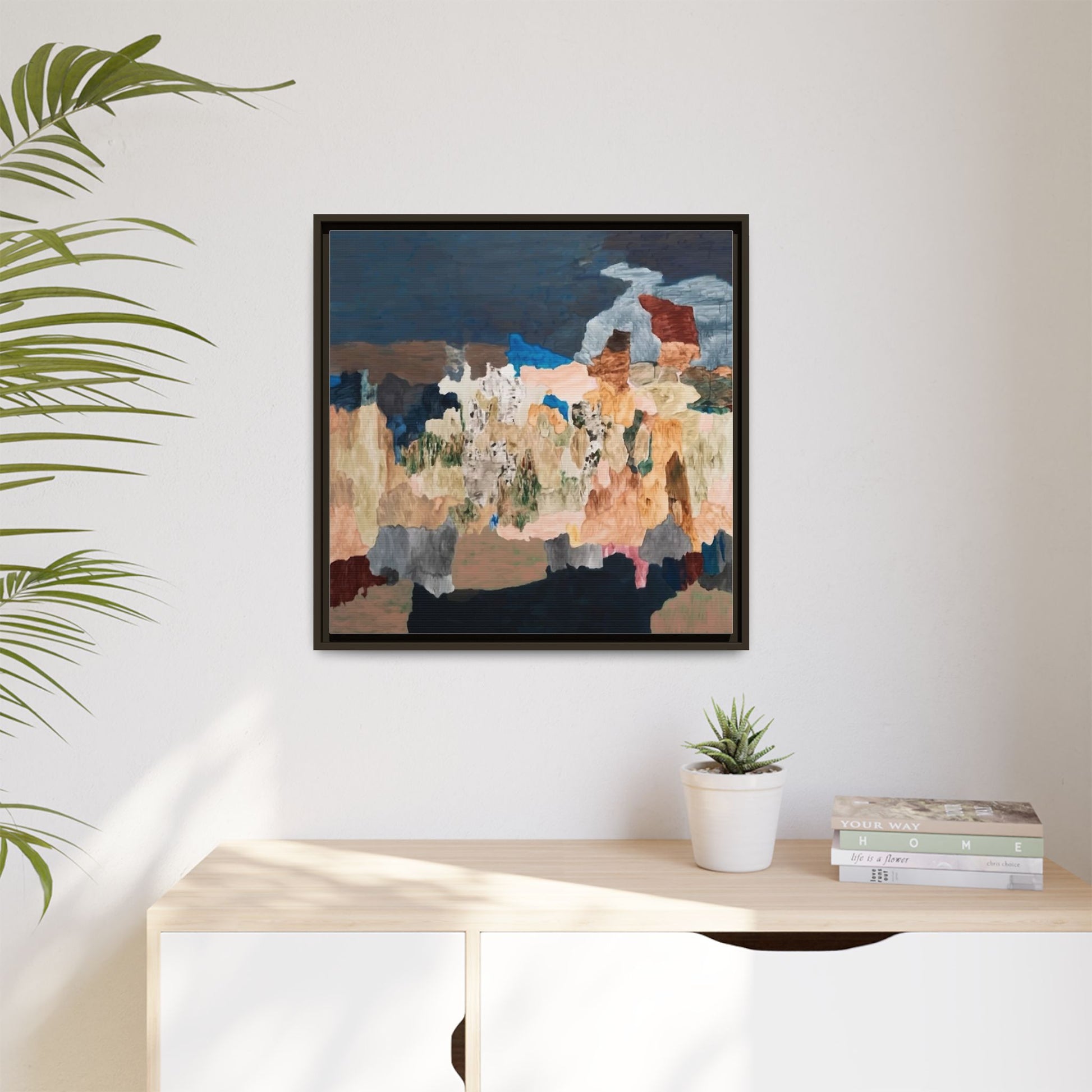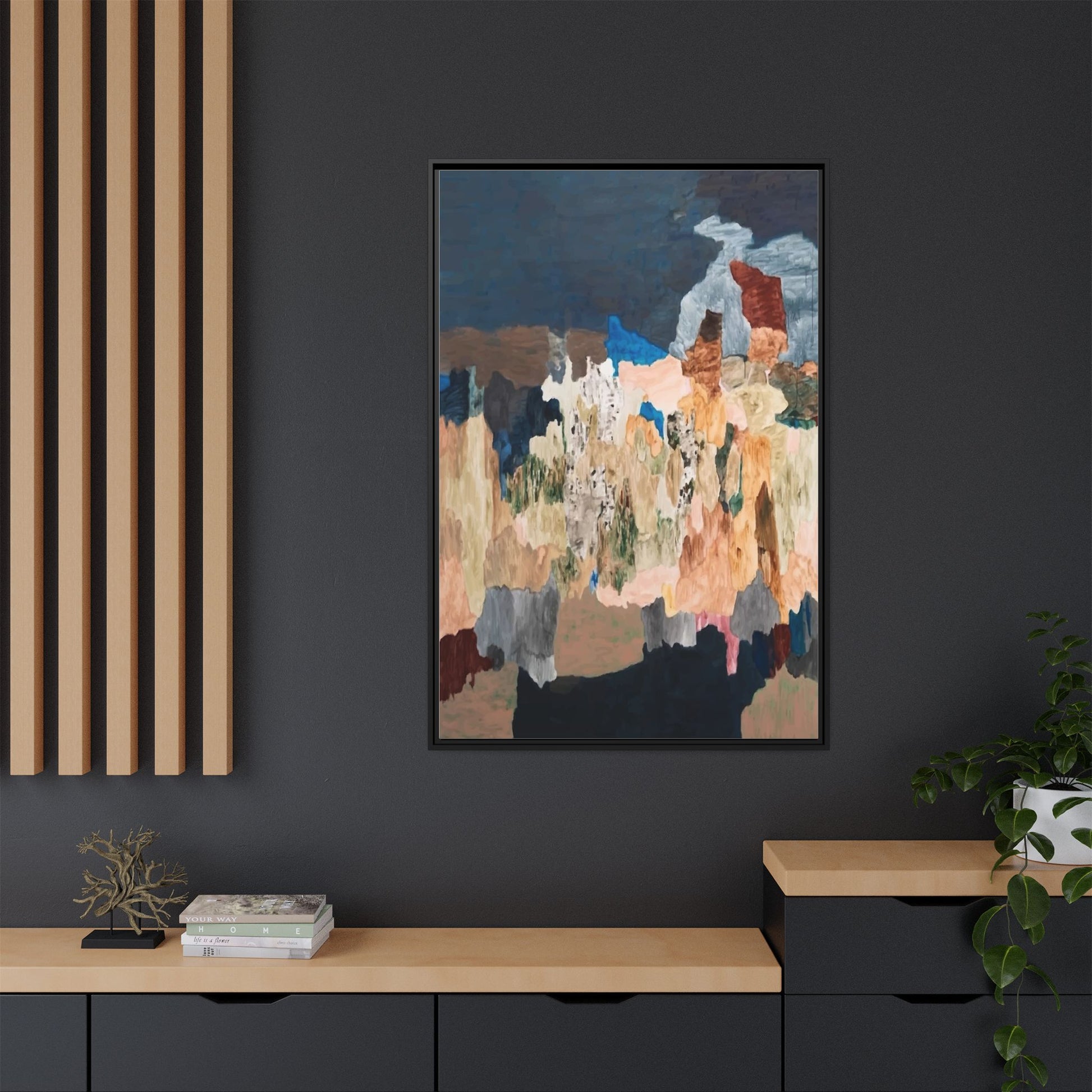 This abstract landscape painting features a complex composition of fragmented, geometric shapes in muted earth tones and cool blues. The artwork appears to depict a deconstructed, textured landscape with irregular blocks and patches representing terrain, sky, and potentially architectural elements. Soft, layered watercolor or acrylic techniques create a sense of depth and movement, with colors ranging from pale pinks and yellows to deep blues, grays, and rusty oranges. The image evokes a sense of a fractured, cubist-inspired landscape, where traditional boundaries between land, sky, and structures are deliberately blurred and reimagined. The painting's style suggests a modern, interpretive approach to landscape representation, breaking down natural forms into abstract, interlocking shapes.