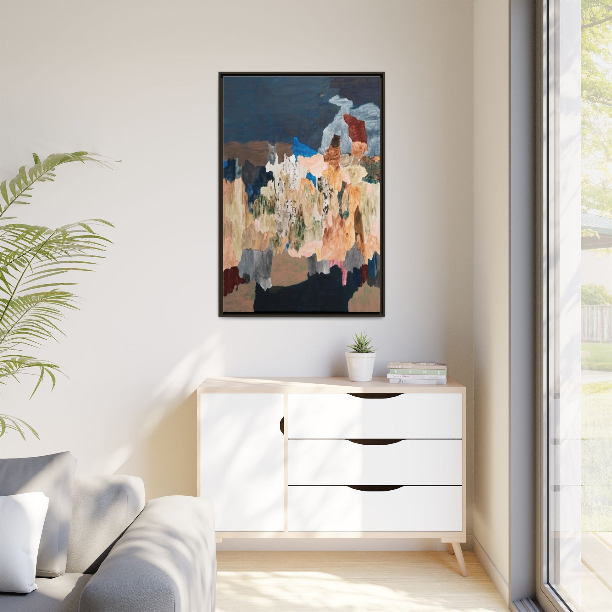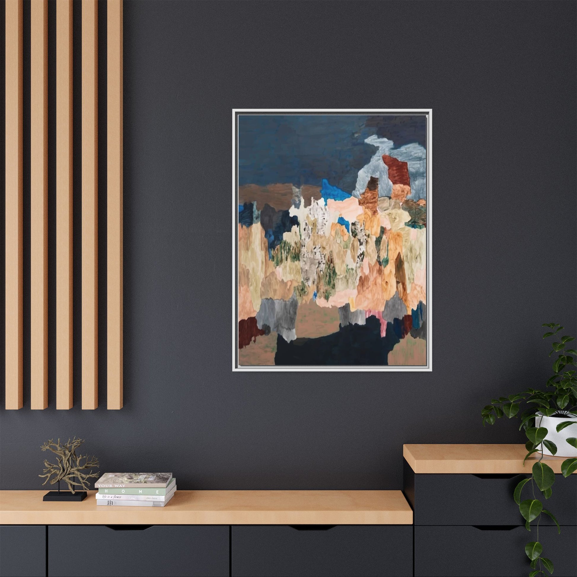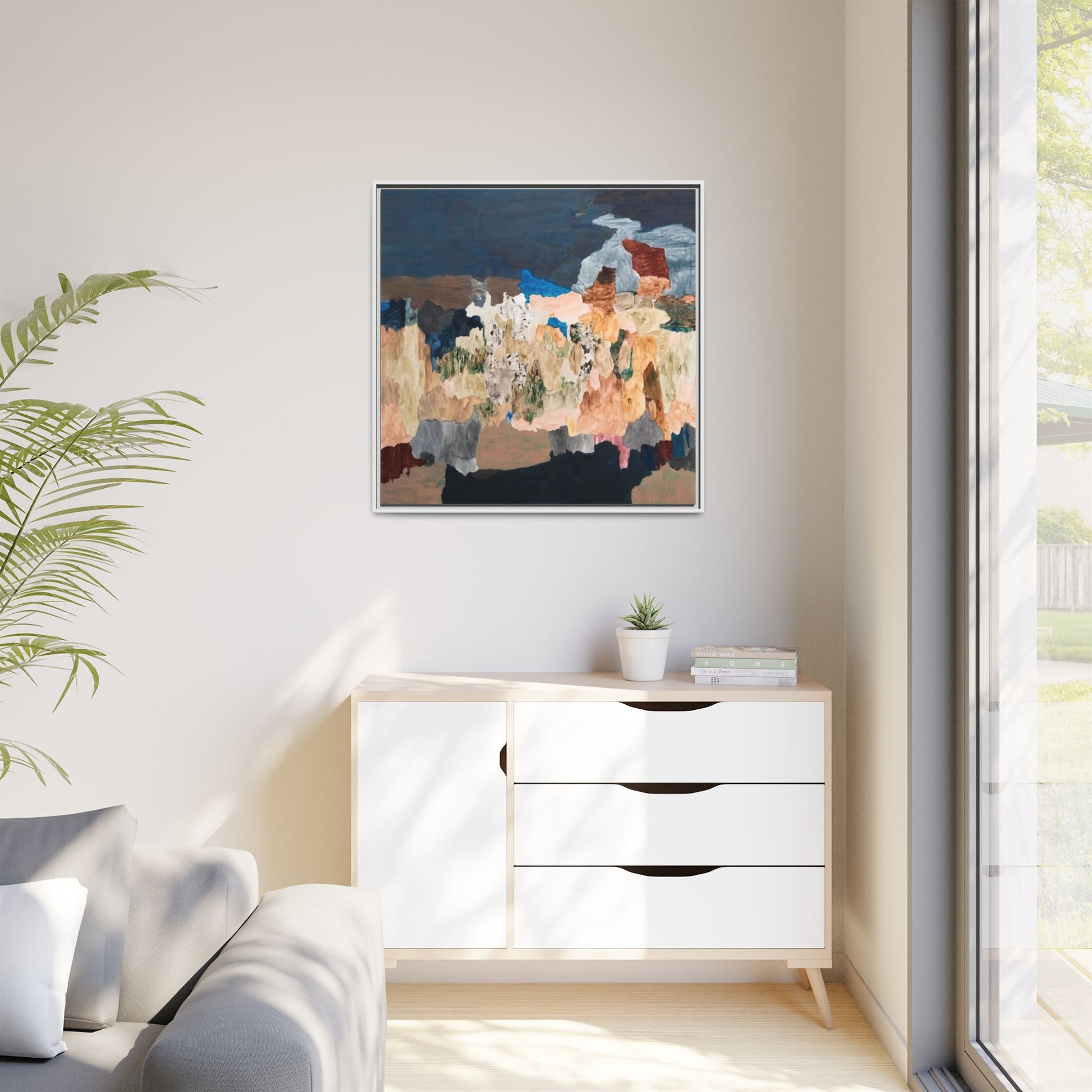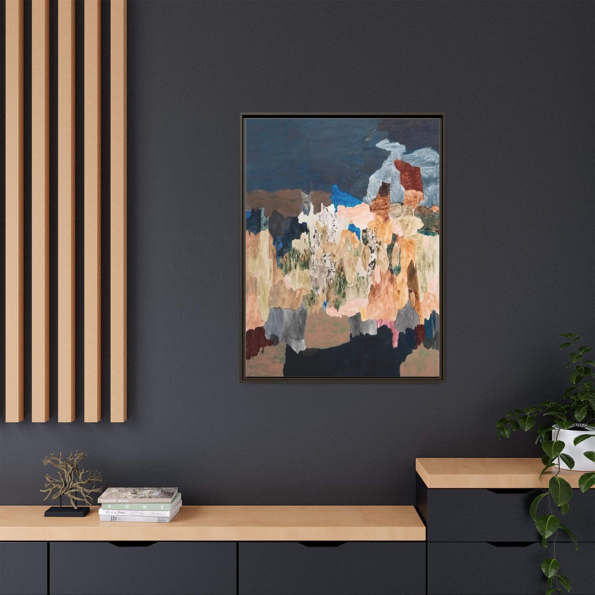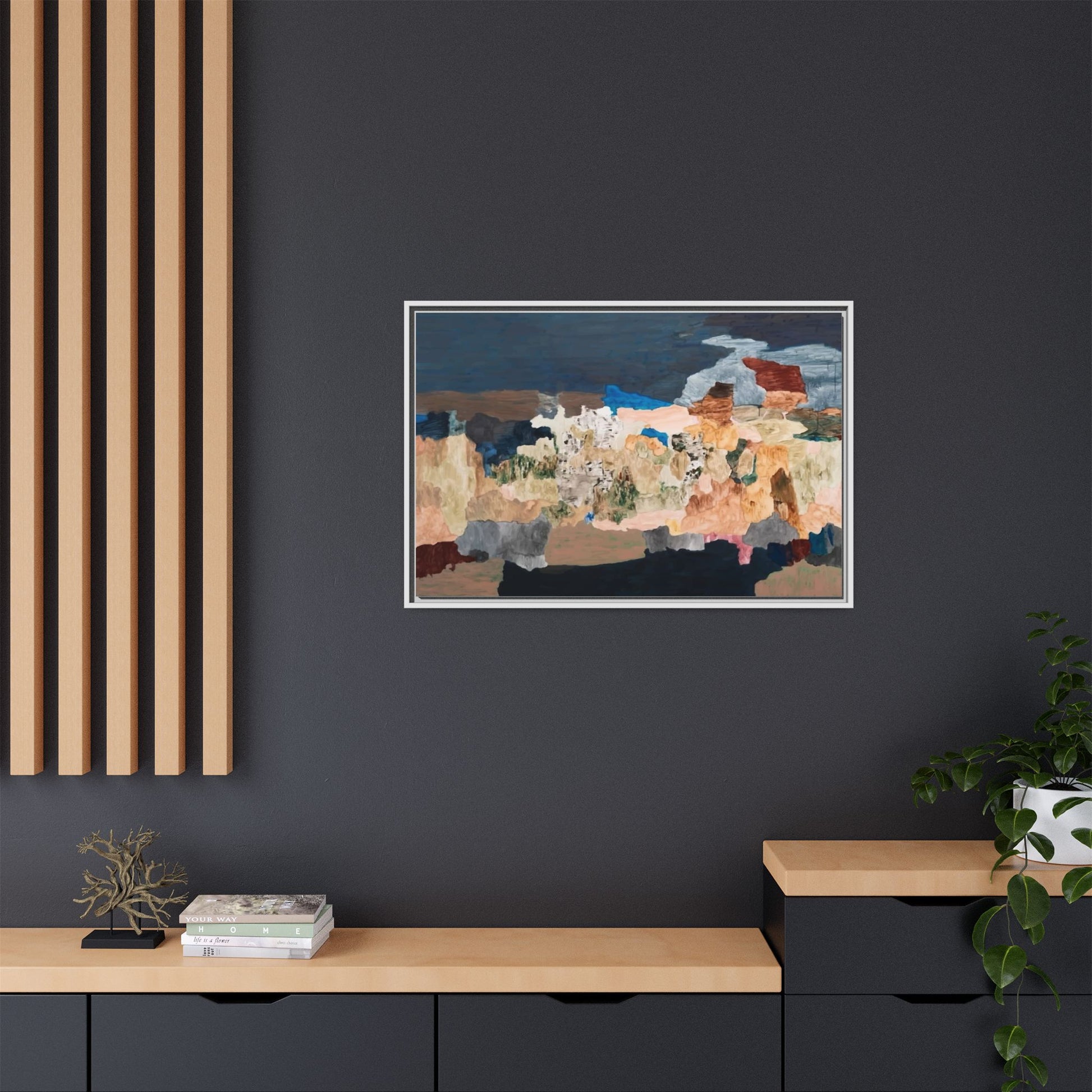 This abstract landscape painting features a complex composition of fragmented, geometric shapes in muted earth tones and cool blues. The artwork appears to depict a deconstructed, textured landscape with irregular blocks and patches representing terrain, sky, and potentially architectural elements. Soft, layered watercolor or acrylic techniques create a sense of depth and movement, with colors ranging from pale pinks and yellows to deep blues, grays, and rusty oranges. The image evokes a sense of a fractured, cubist-inspired landscape, where traditional boundaries between land, sky, and structures are deliberately blurred and reimagined. The painting's style suggests a modern, interpretive approach to landscape representation, breaking down natural forms into abstract, interlocking shapes.