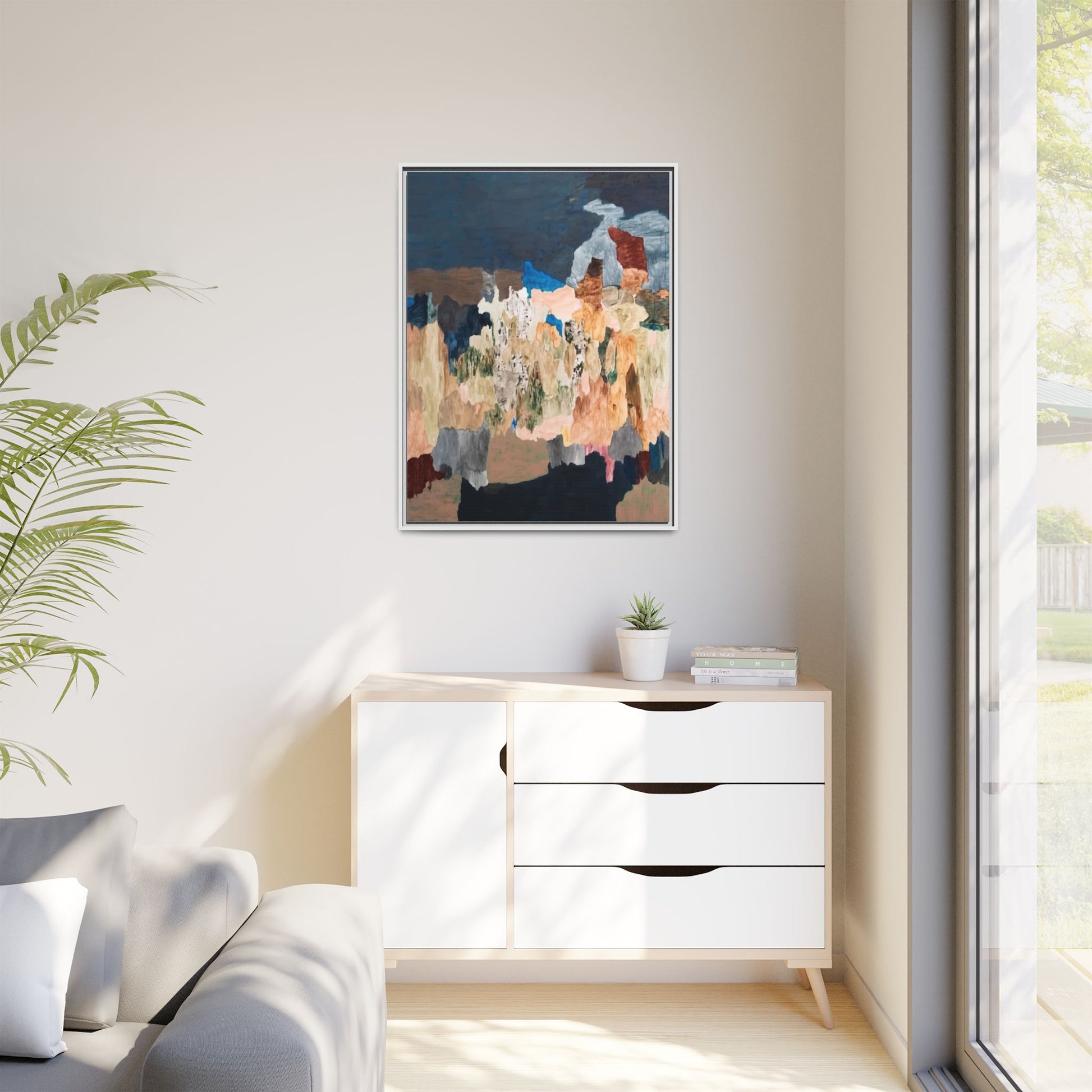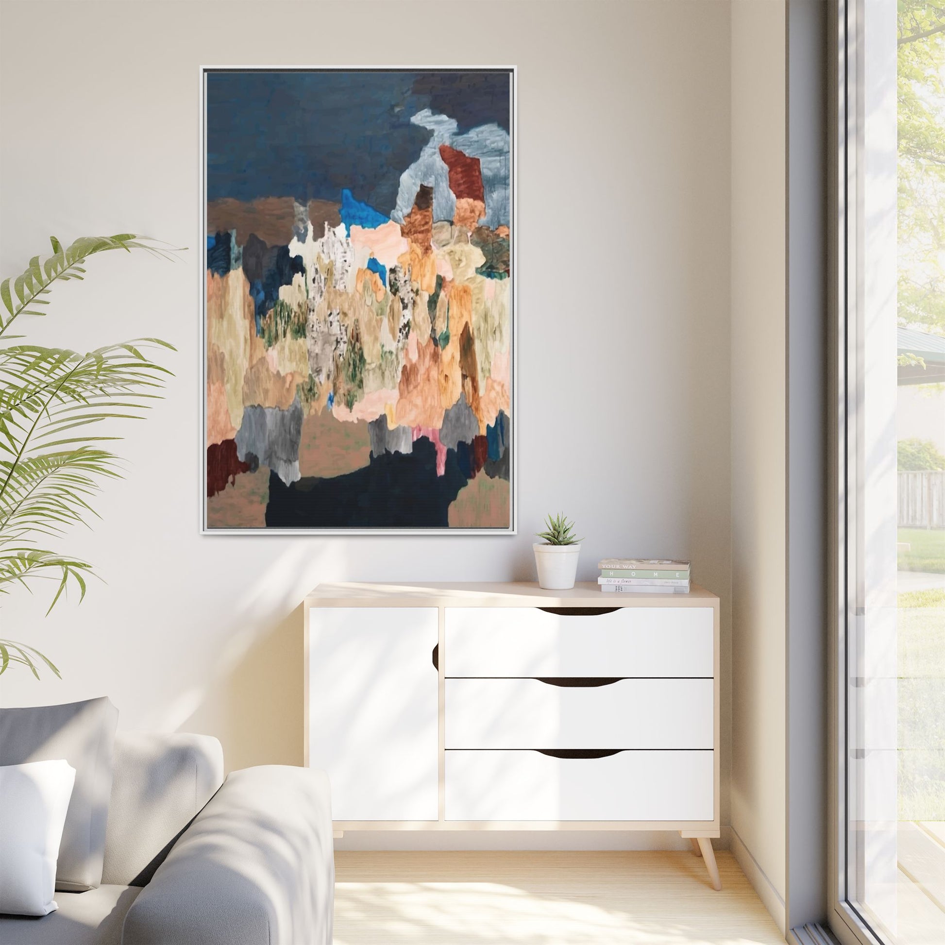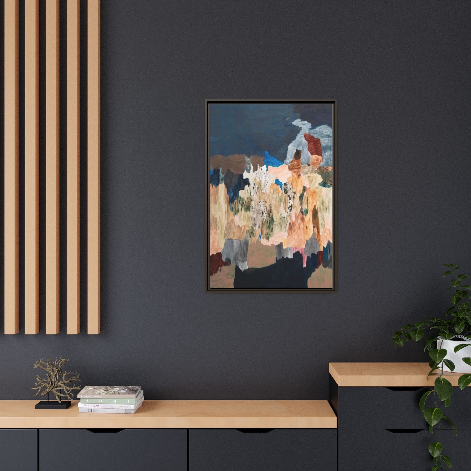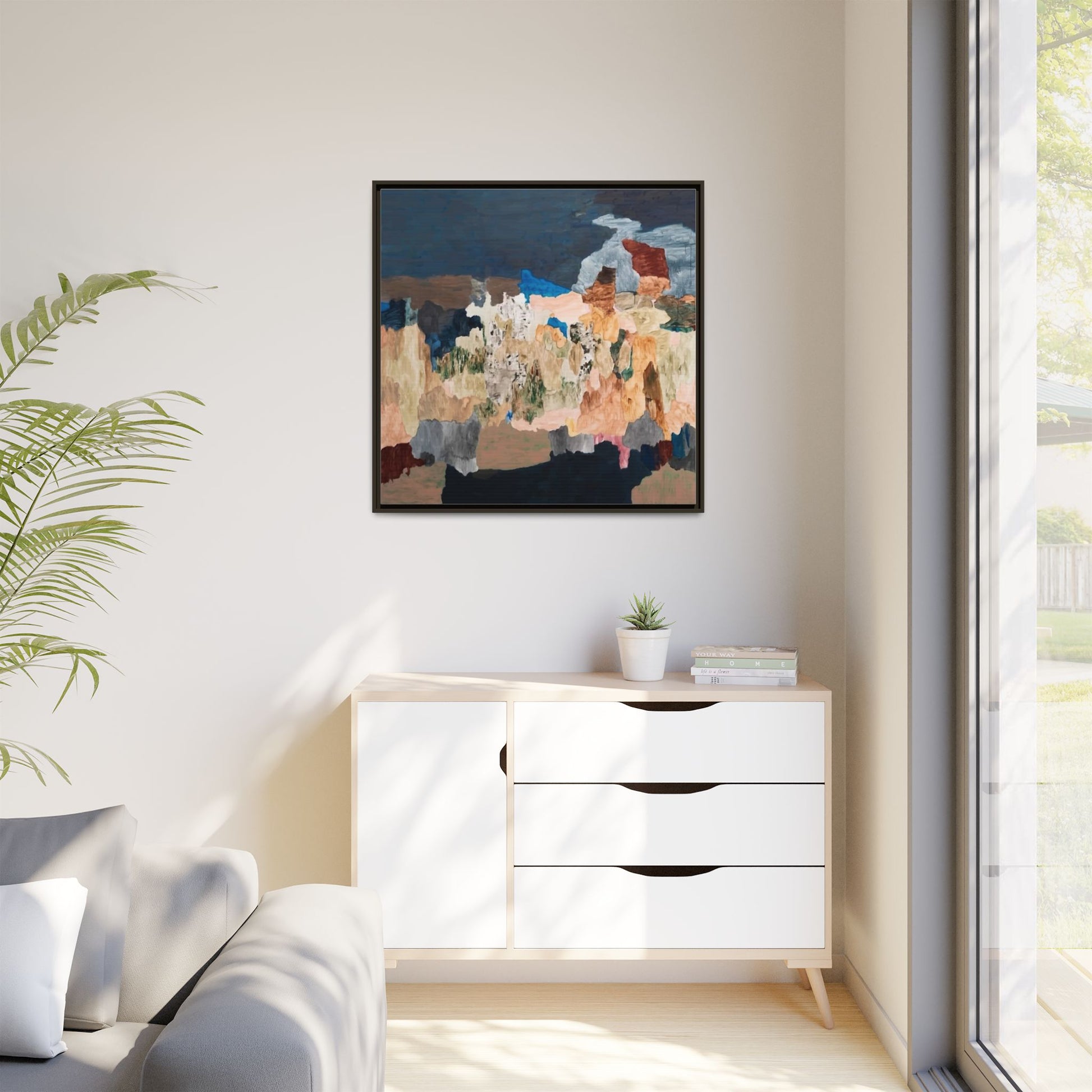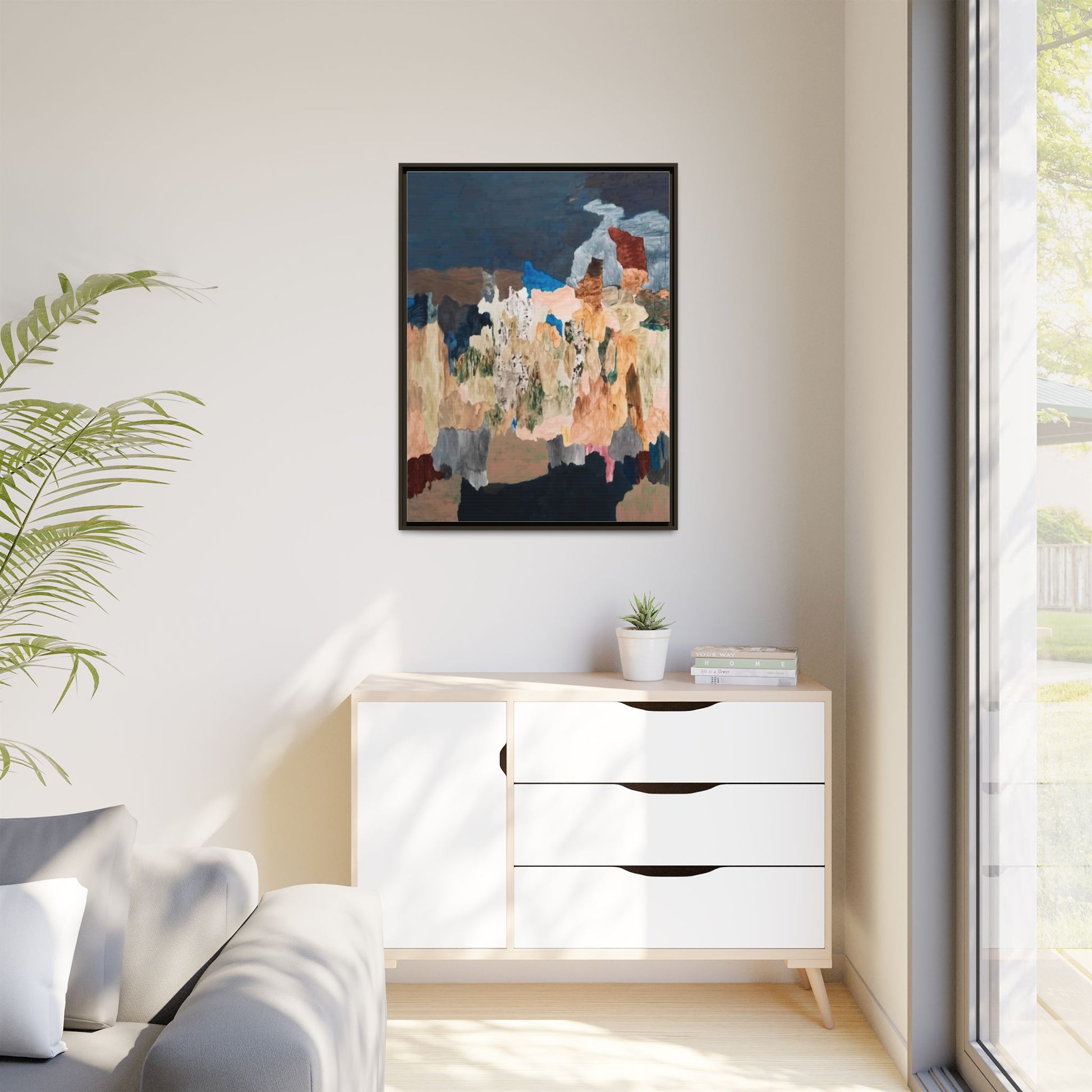 This abstract landscape painting features a complex composition of fragmented, geometric shapes in muted earth tones and cool blues. The artwork appears to depict a deconstructed, textured landscape with irregular blocks and patches representing terrain, sky, and potentially architectural elements. Soft, layered watercolor or acrylic techniques create a sense of depth and movement, with colors ranging from pale pinks and yellows to deep blues, grays, and rusty oranges. The image evokes a sense of a fractured, cubist-inspired landscape, where traditional boundaries between land, sky, and structures are deliberately blurred and reimagined. The painting's style suggests a modern, interpretive approach to landscape representation, breaking down natural forms into abstract, interlocking shapes.