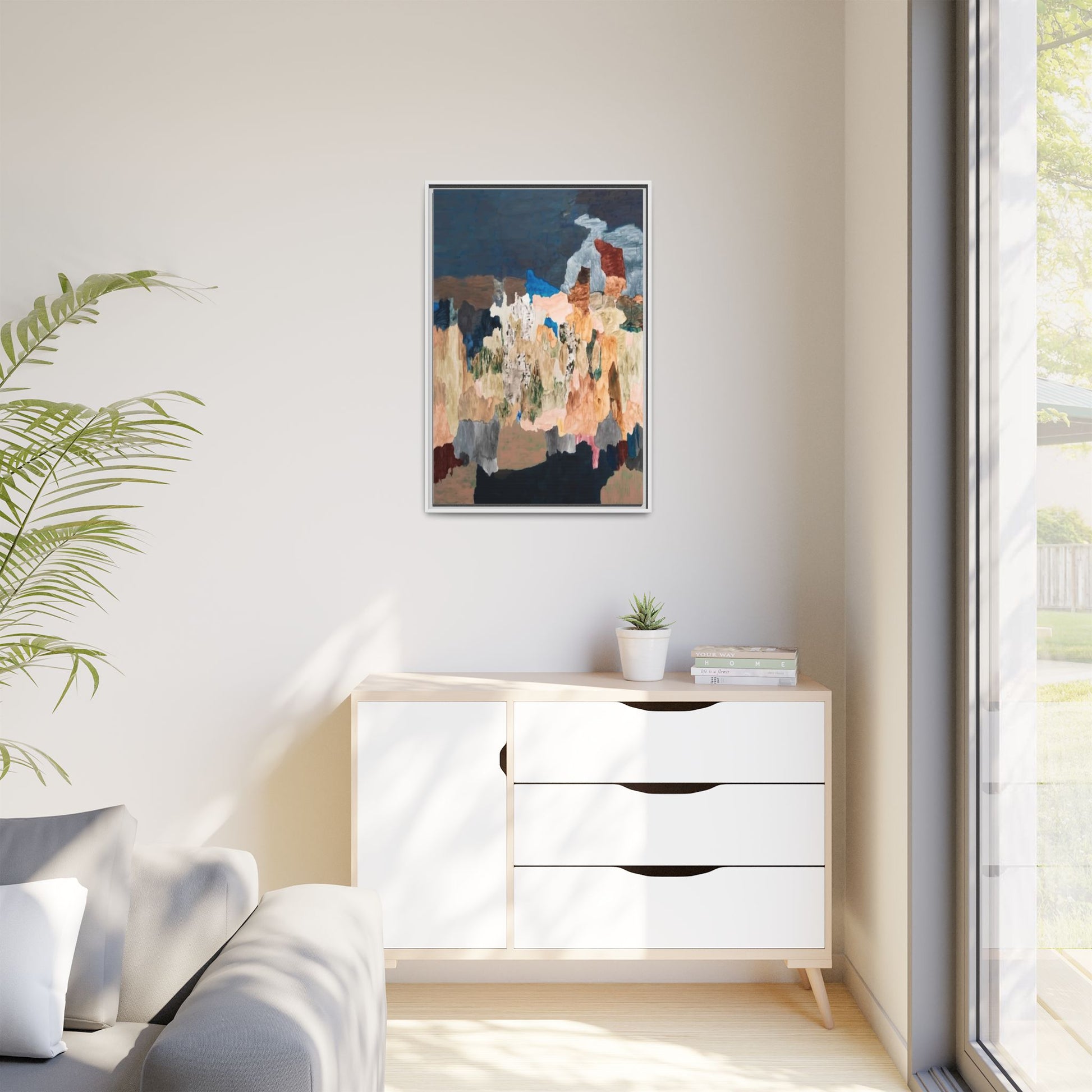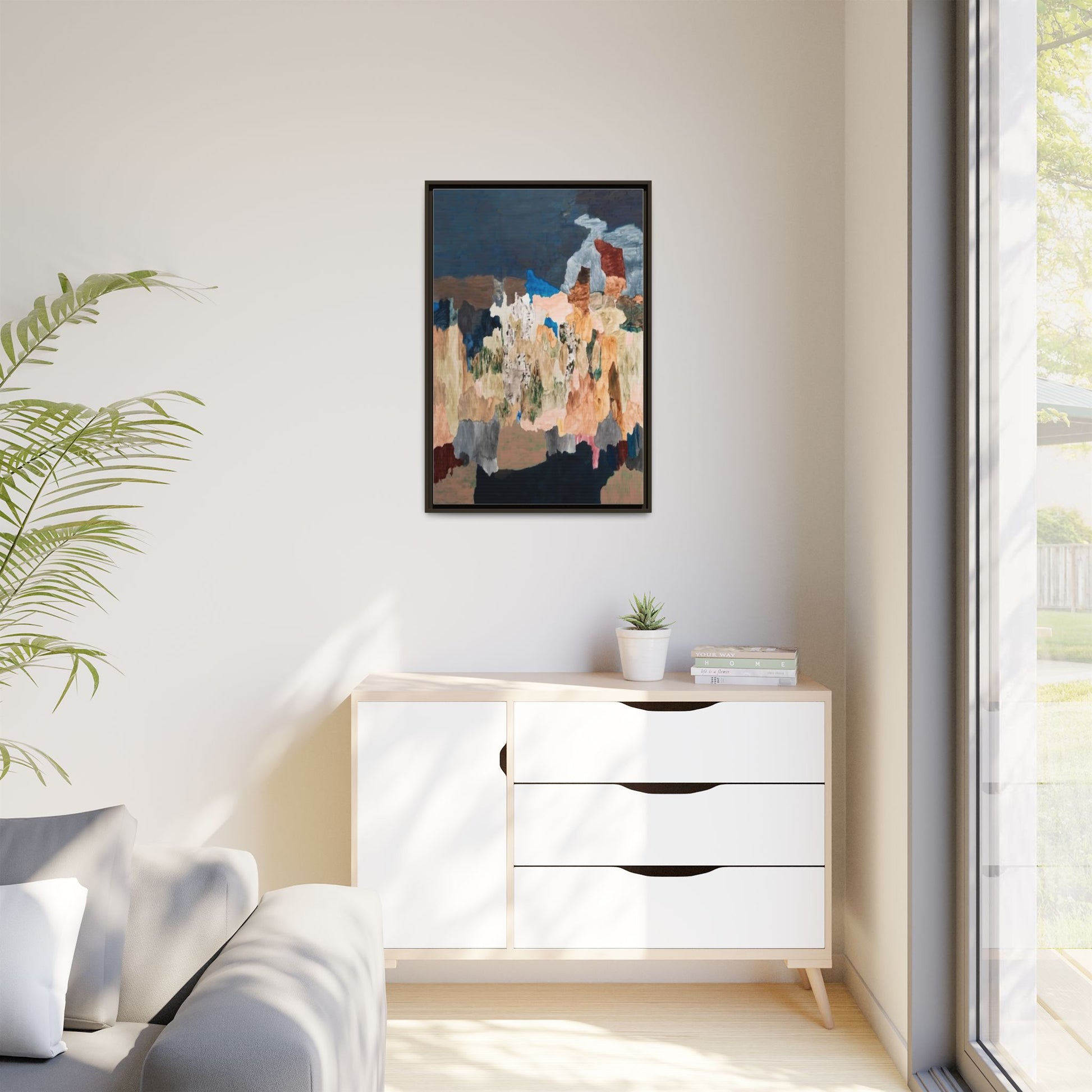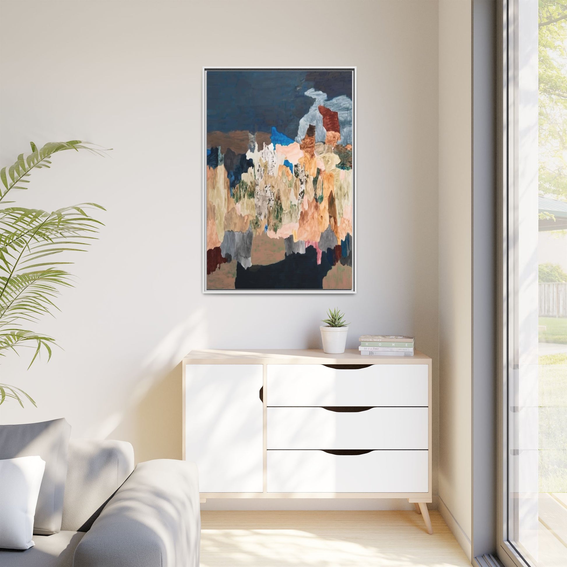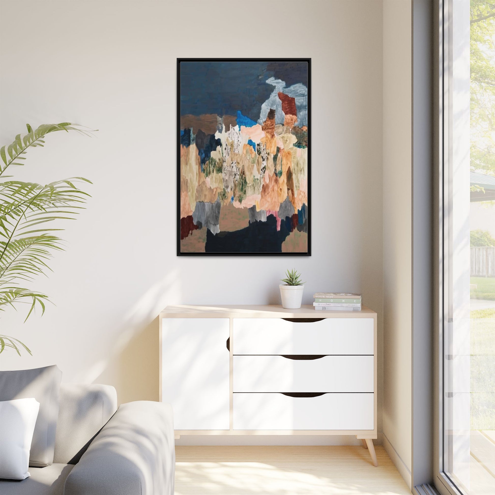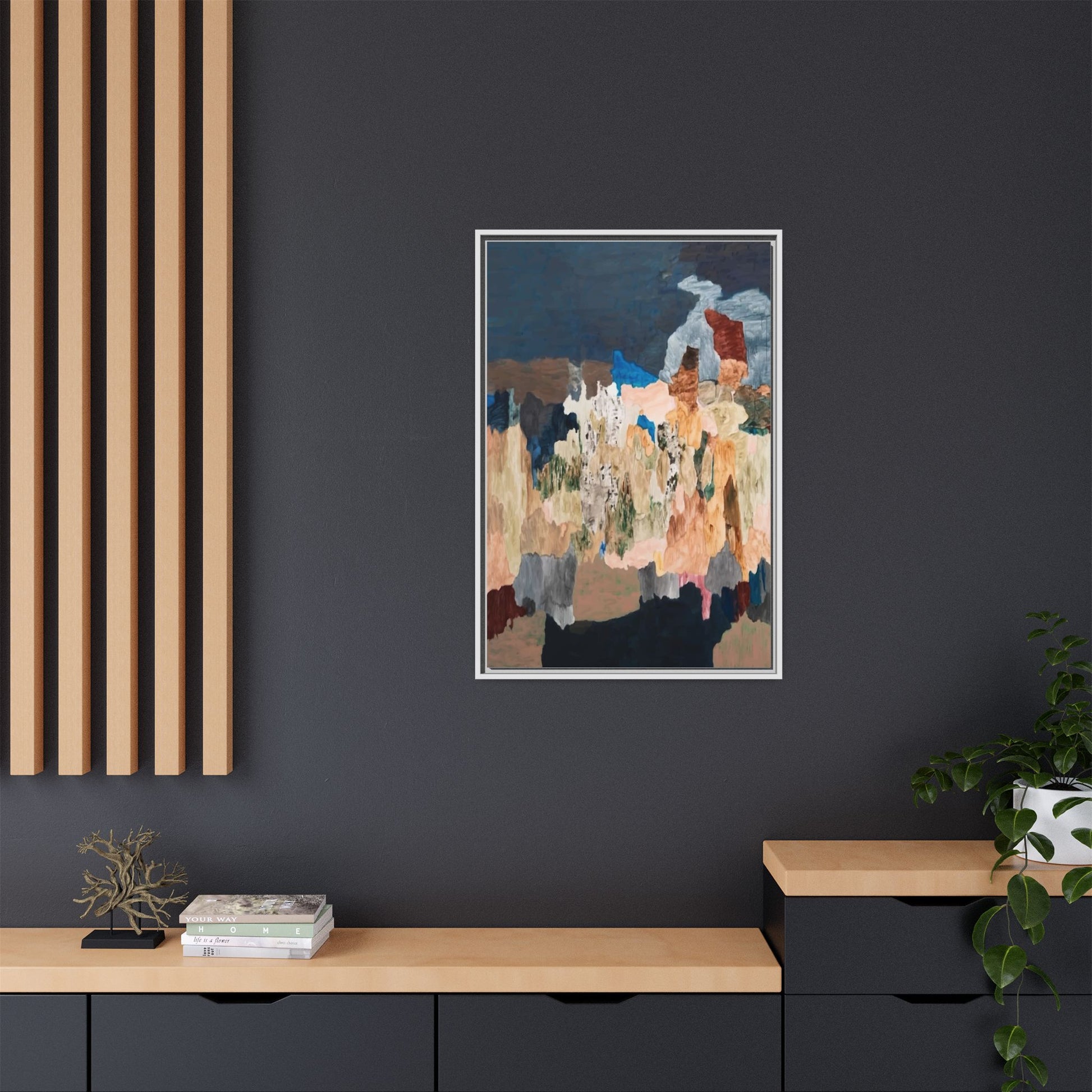 This abstract landscape painting features a complex composition of fragmented, geometric shapes in muted earth tones and cool blues. The artwork appears to depict a deconstructed, textured landscape with irregular blocks and patches representing terrain, sky, and potentially architectural elements. Soft, layered watercolor or acrylic techniques create a sense of depth and movement, with colors ranging from pale pinks and yellows to deep blues, grays, and rusty oranges. The image evokes a sense of a fractured, cubist-inspired landscape, where traditional boundaries between land, sky, and structures are deliberately blurred and reimagined. The painting's style suggests a modern, interpretive approach to landscape representation, breaking down natural forms into abstract, interlocking shapes.