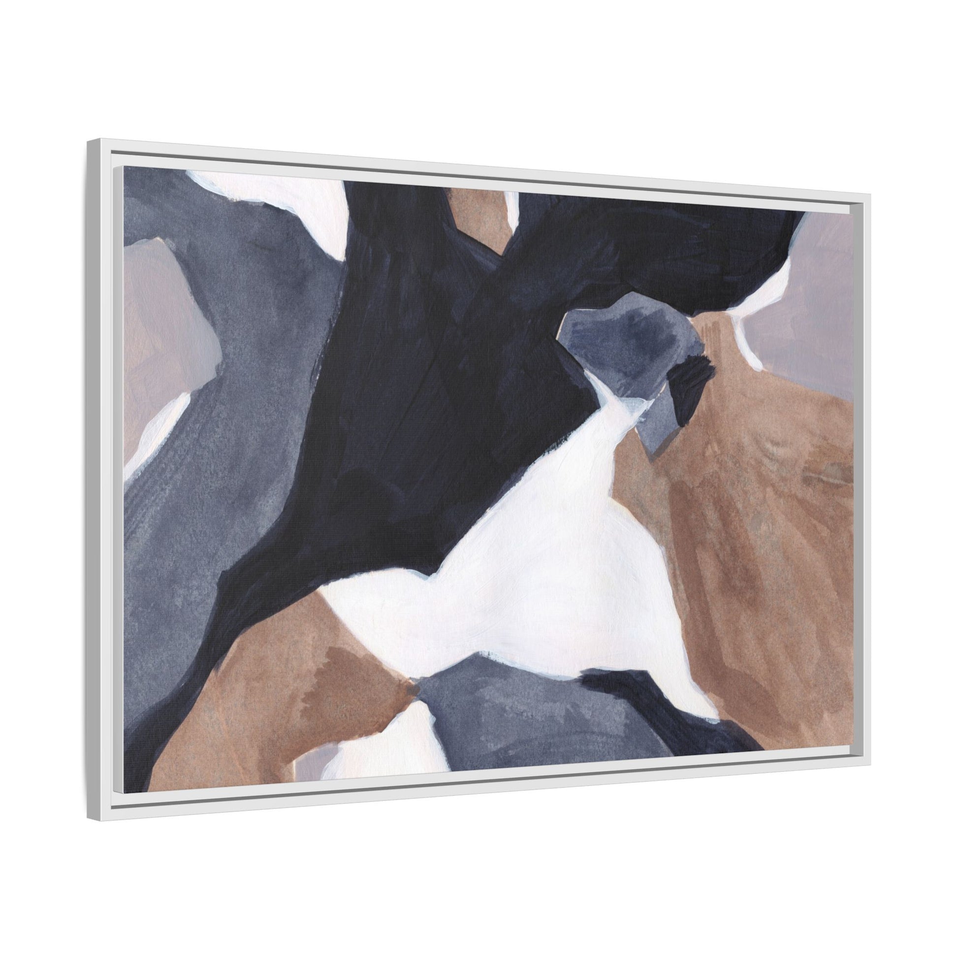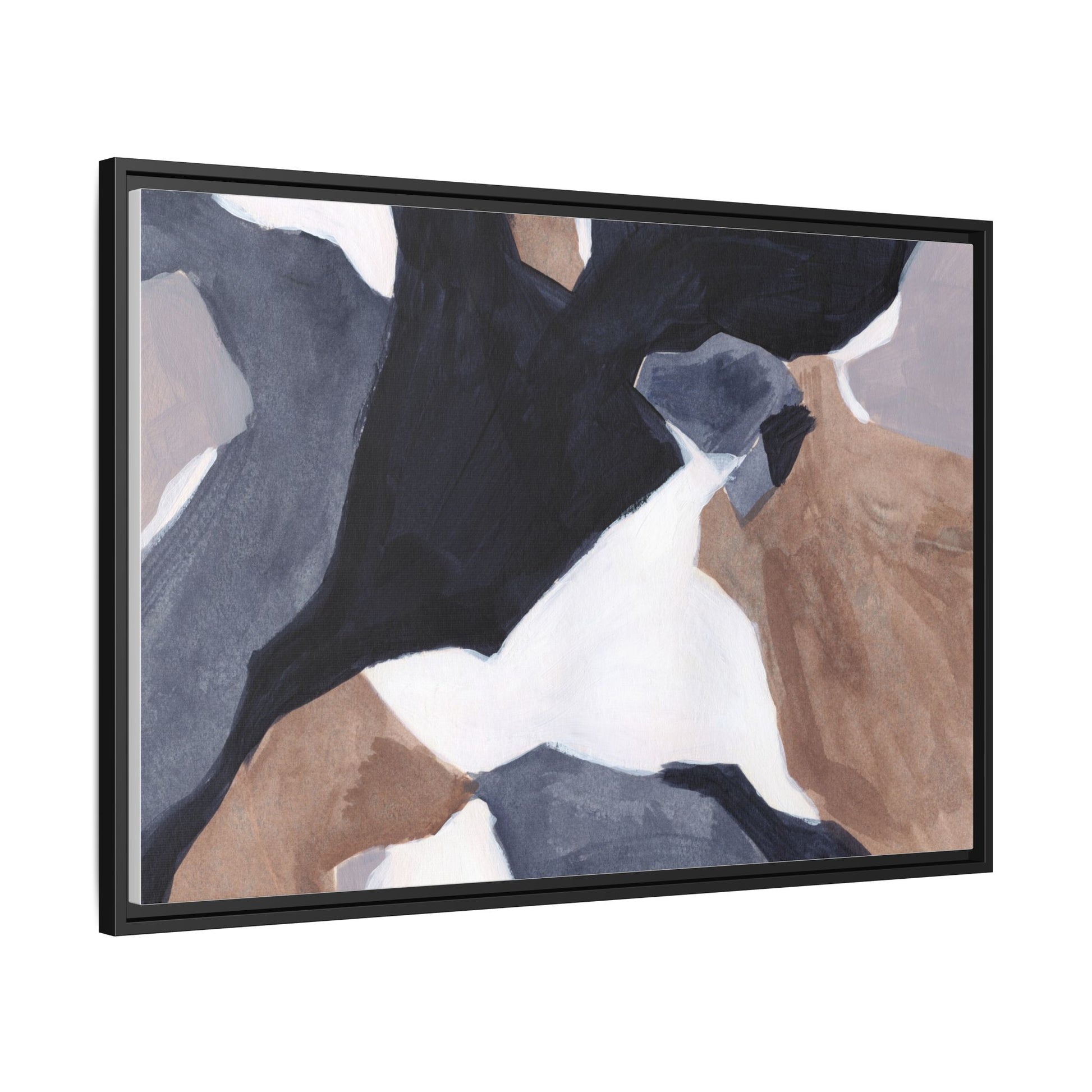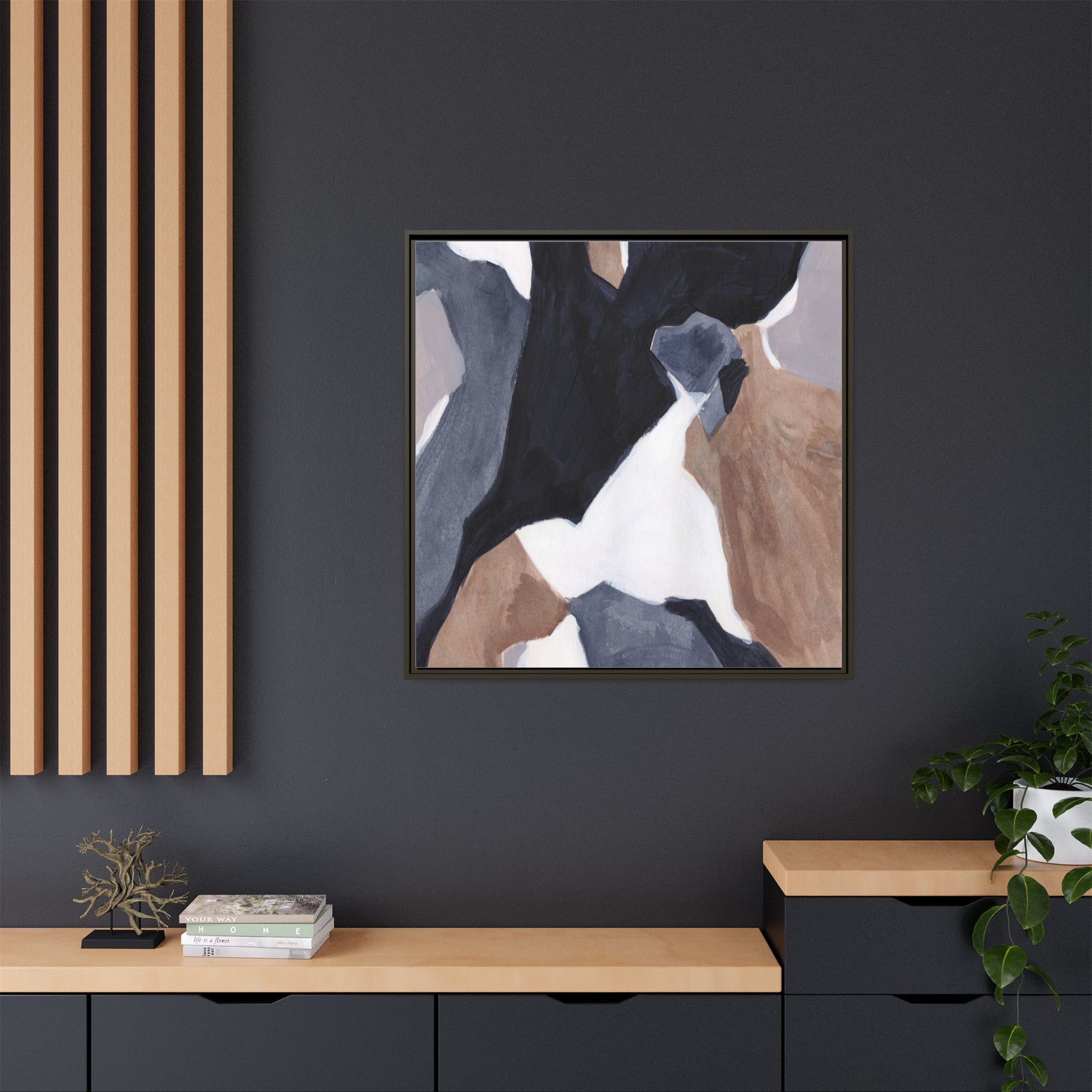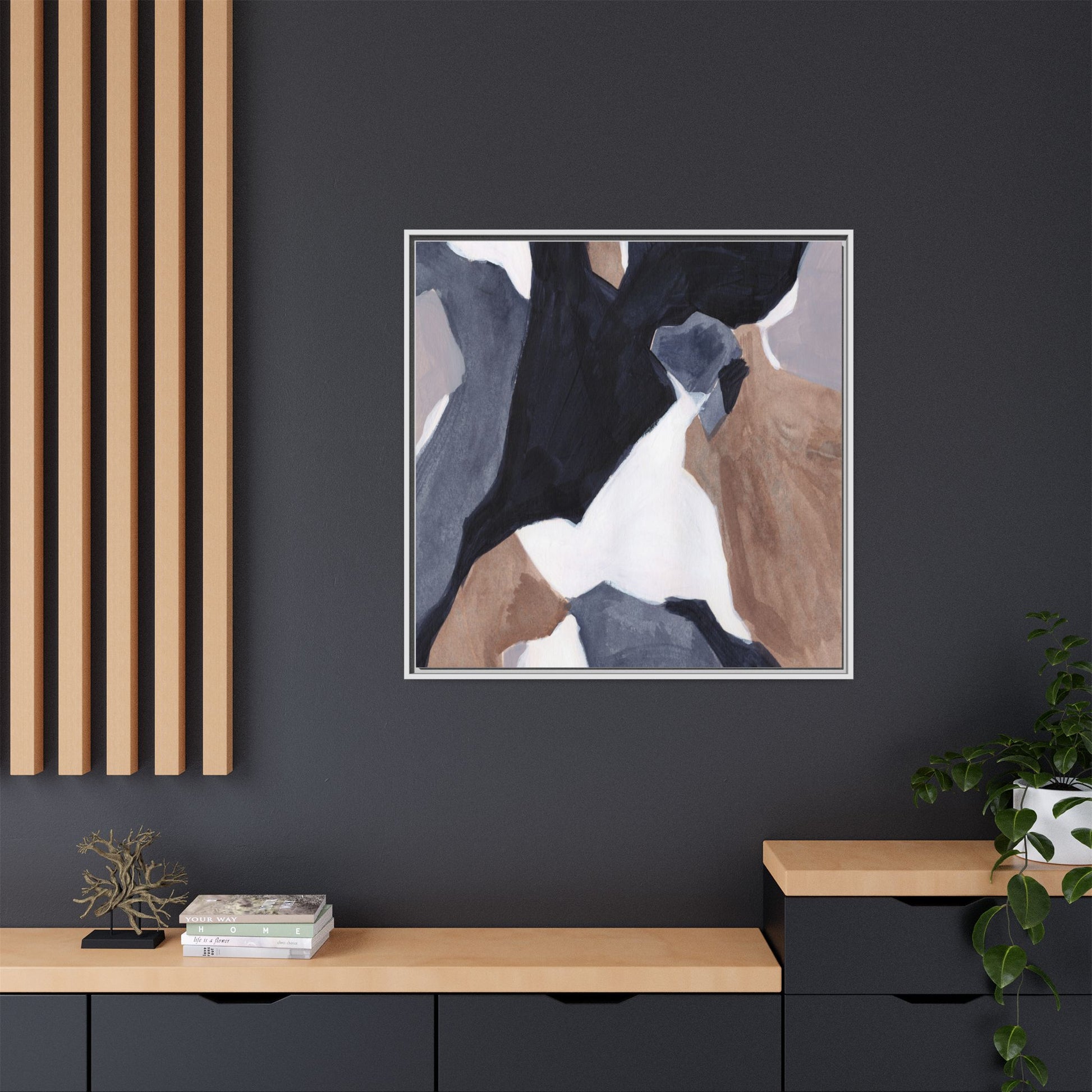 This abstract watercolor painting features a dynamic composition of geometric shapes in a muted color palette of white, black, gray, and tan. The artwork employs a fragmented, angular design with sharp-edged forms that intersect and overlap, creating a sense of movement and depth. Soft, blended watercolor textures give the painting a fluid quality, despite the hard-edged shapes. The color scheme suggests a minimalist, contemporary aesthetic, with the white sections providing a stark contrast against the darker gray and black elements. The painting's style evokes a sense of architectural or landscape abstraction, with its angular forms reminiscent of fractured terrain or urban landscapes.