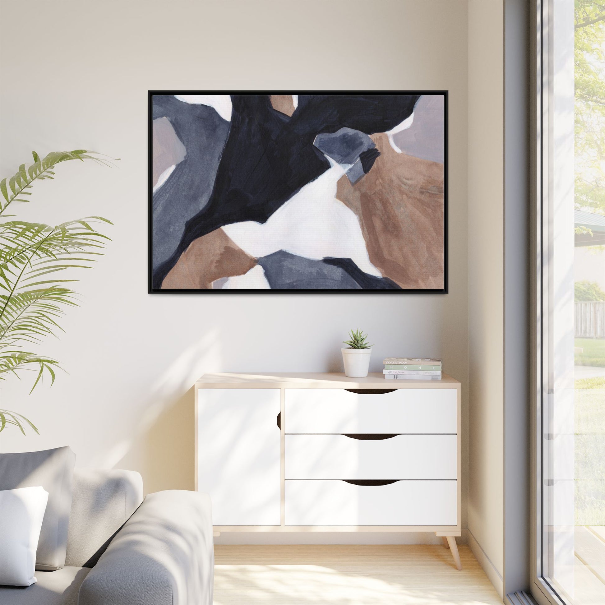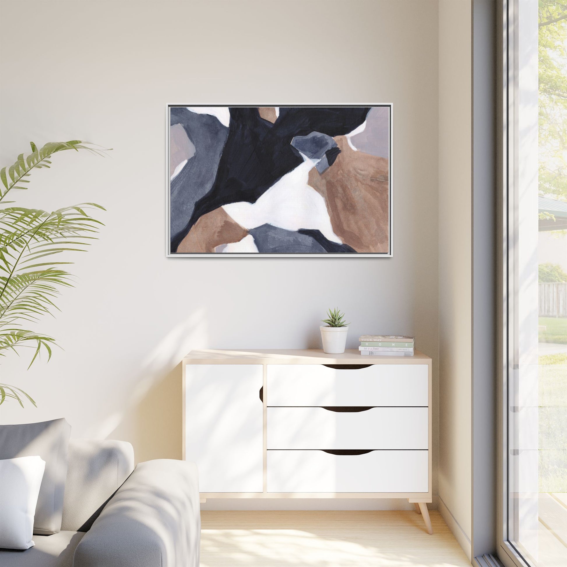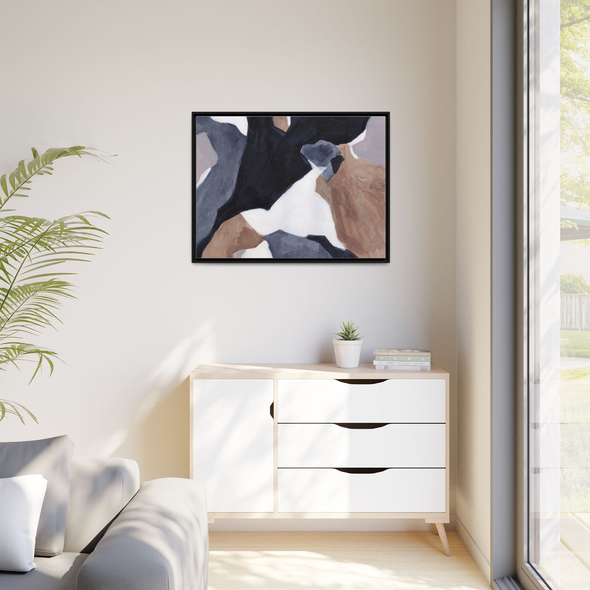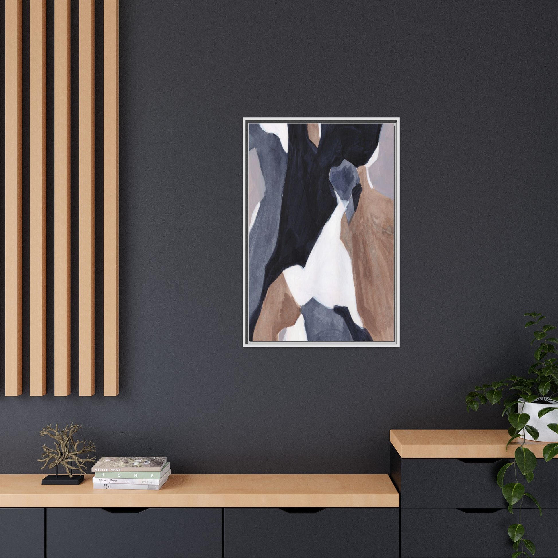 This abstract watercolor painting features a dynamic composition of geometric shapes in a muted color palette of white, black, gray, and tan. The artwork employs a fragmented, angular design with sharp-edged forms that intersect and overlap, creating a sense of movement and depth. Soft, blended watercolor textures give the painting a fluid quality, despite the hard-edged shapes. The color scheme suggests a minimalist, contemporary aesthetic, with the white sections providing a stark contrast against the darker gray and black elements. The painting's style evokes a sense of architectural or landscape abstraction, with its angular forms reminiscent of fractured terrain or urban landscapes.