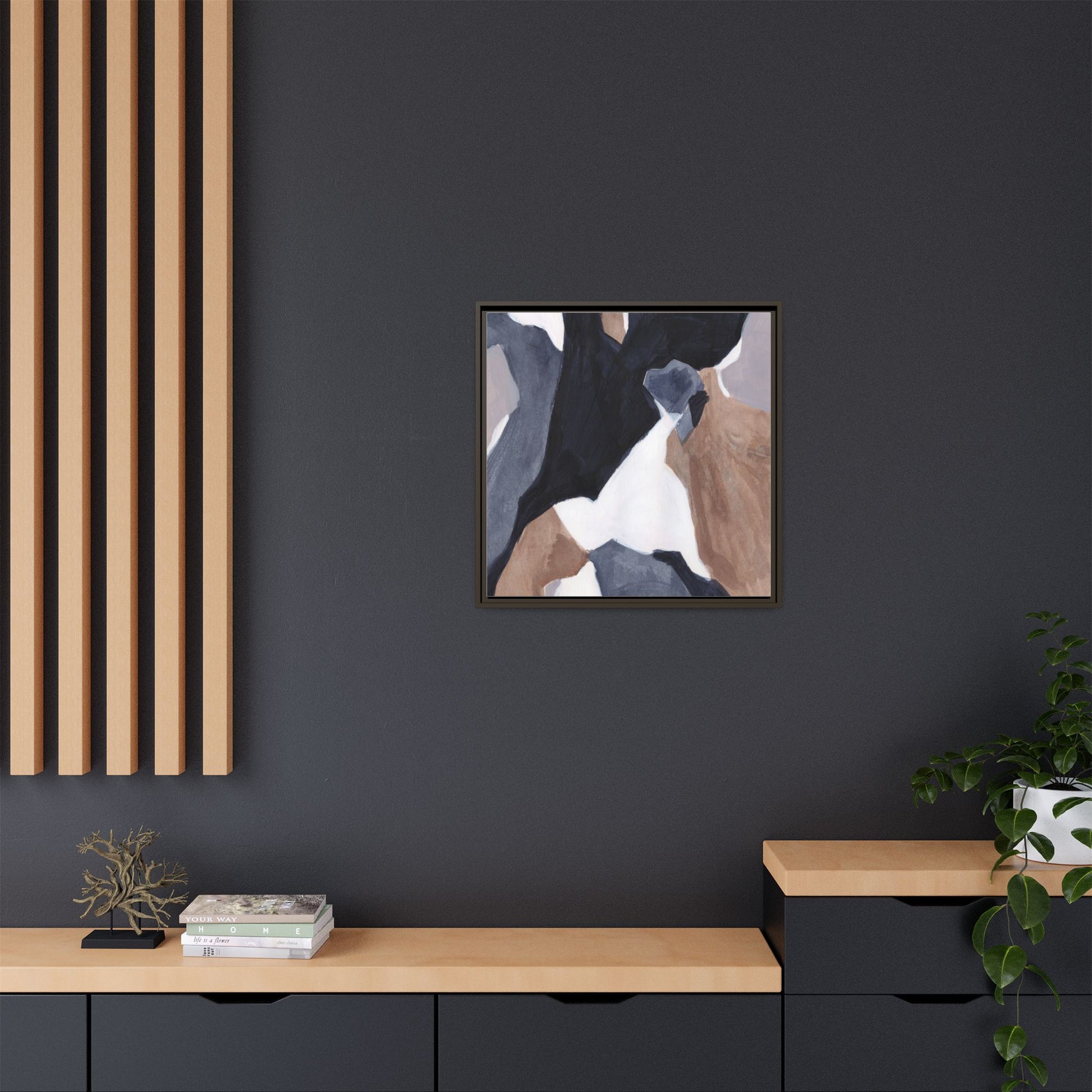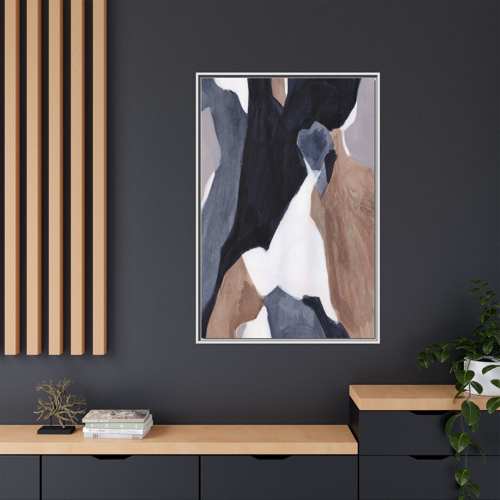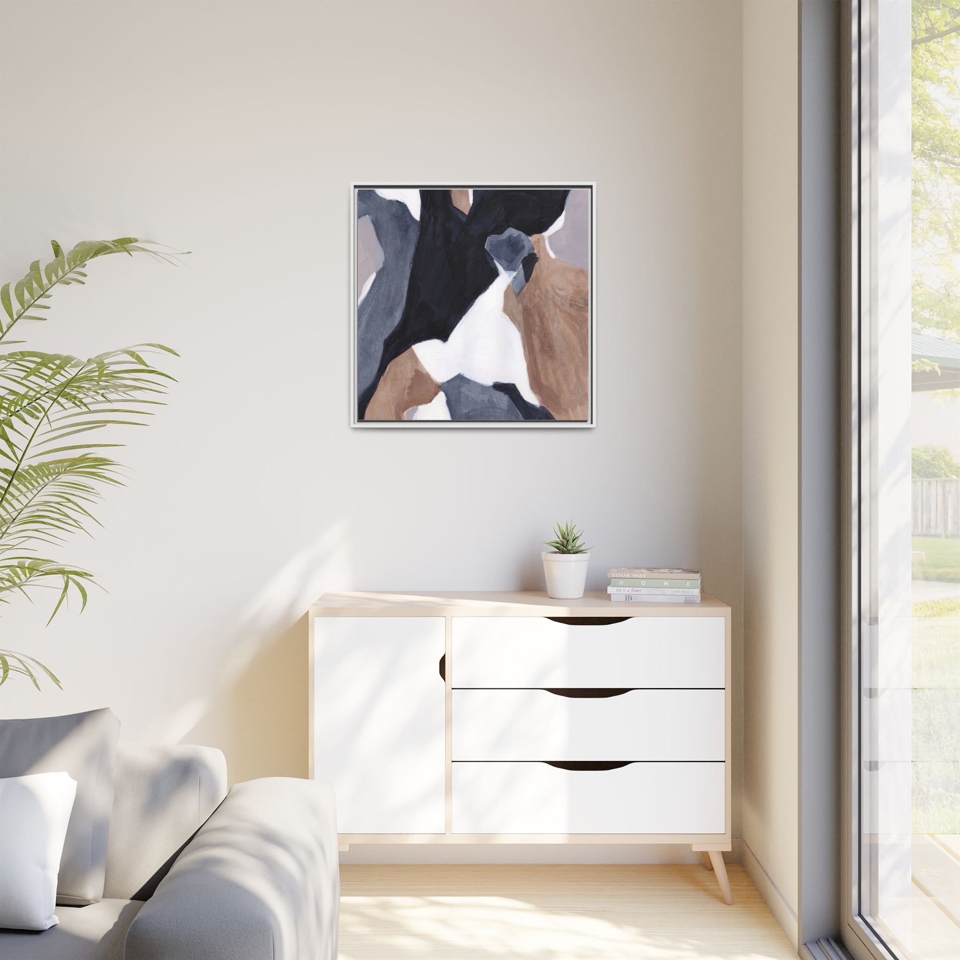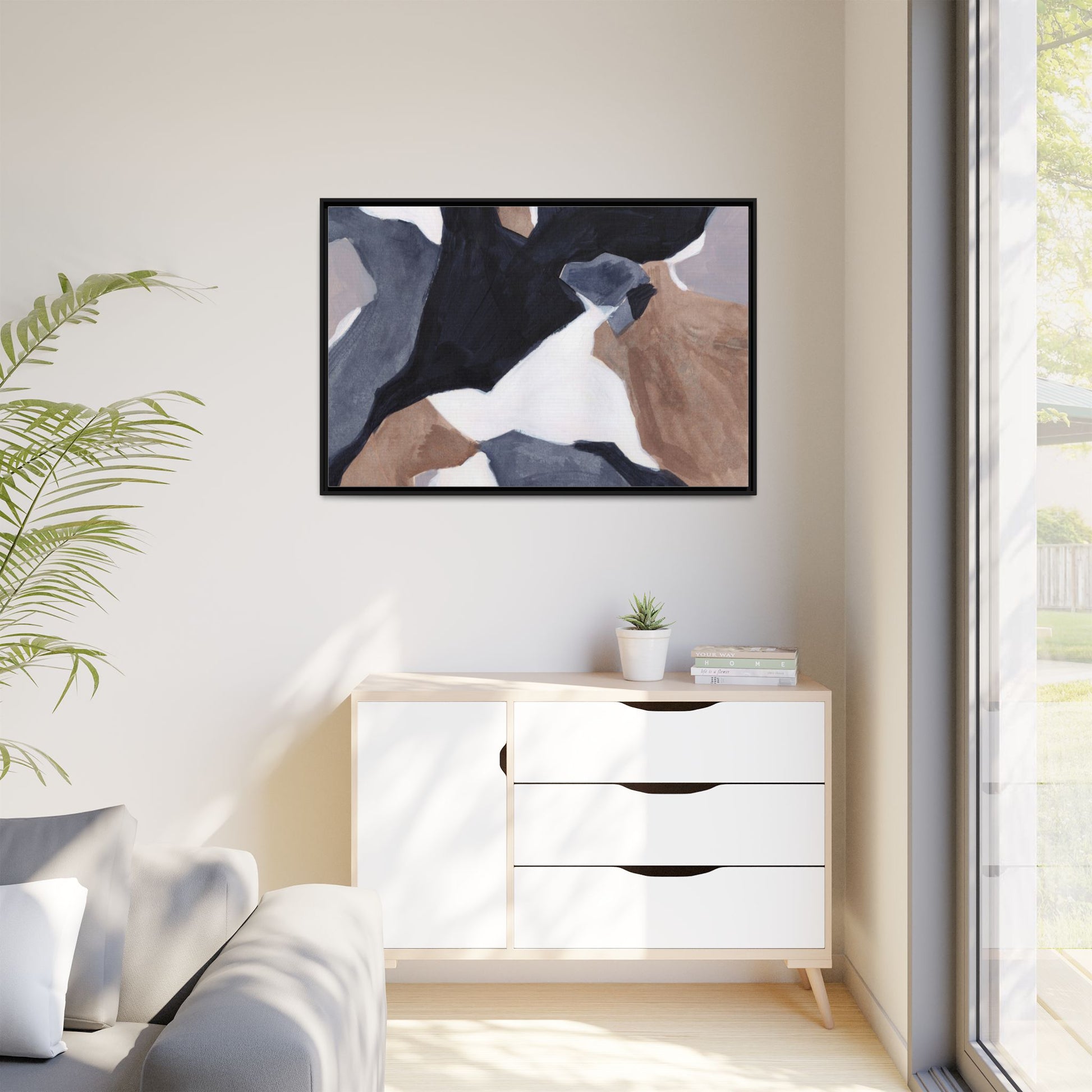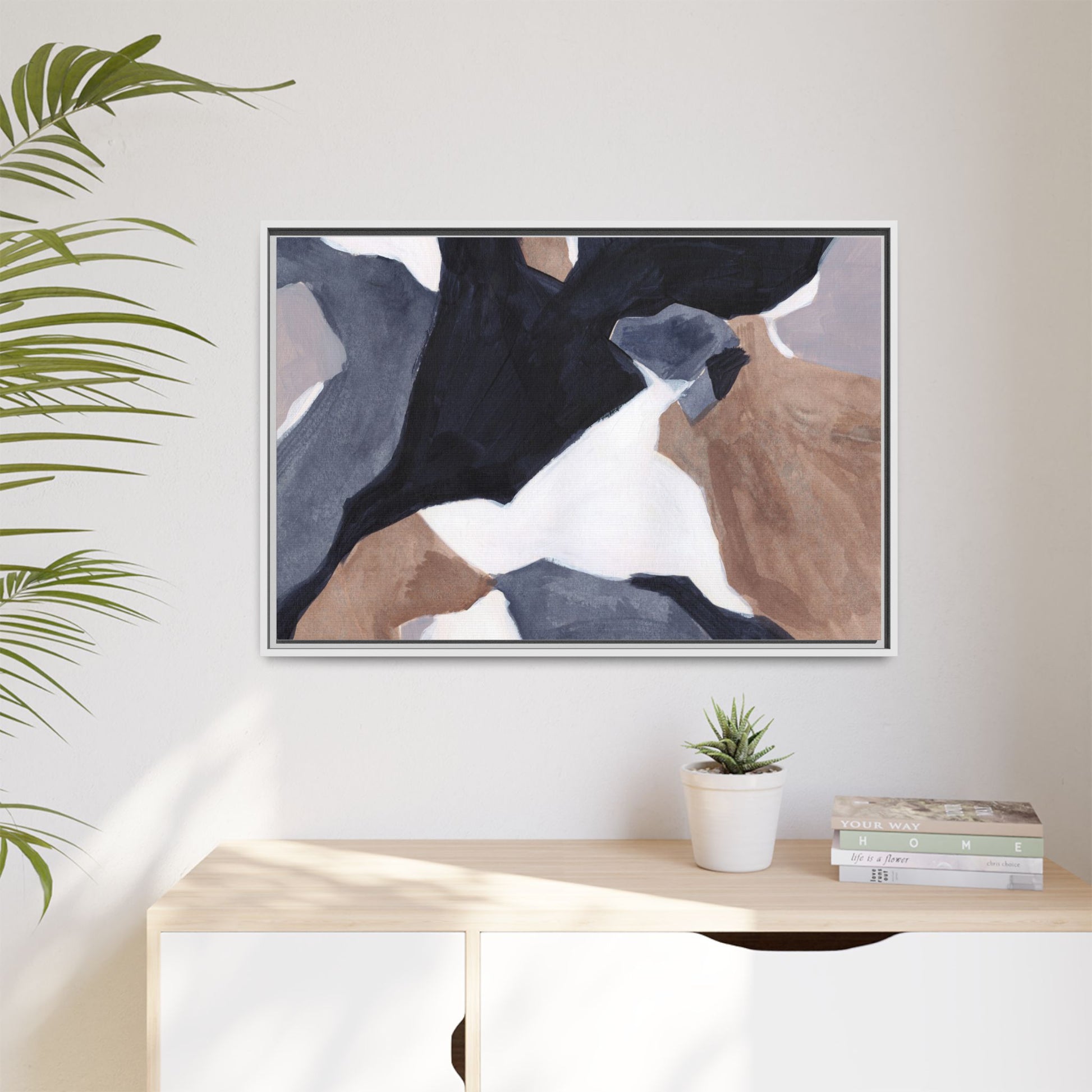 This abstract watercolor painting features a dynamic composition of geometric shapes in a muted color palette of white, black, gray, and tan. The artwork employs a fragmented, angular design with sharp-edged forms that intersect and overlap, creating a sense of movement and depth. Soft, blended watercolor textures give the painting a fluid quality, despite the hard-edged shapes. The color scheme suggests a minimalist, contemporary aesthetic, with the white sections providing a stark contrast against the darker gray and black elements. The painting's style evokes a sense of architectural or landscape abstraction, with its angular forms reminiscent of fractured terrain or urban landscapes.
