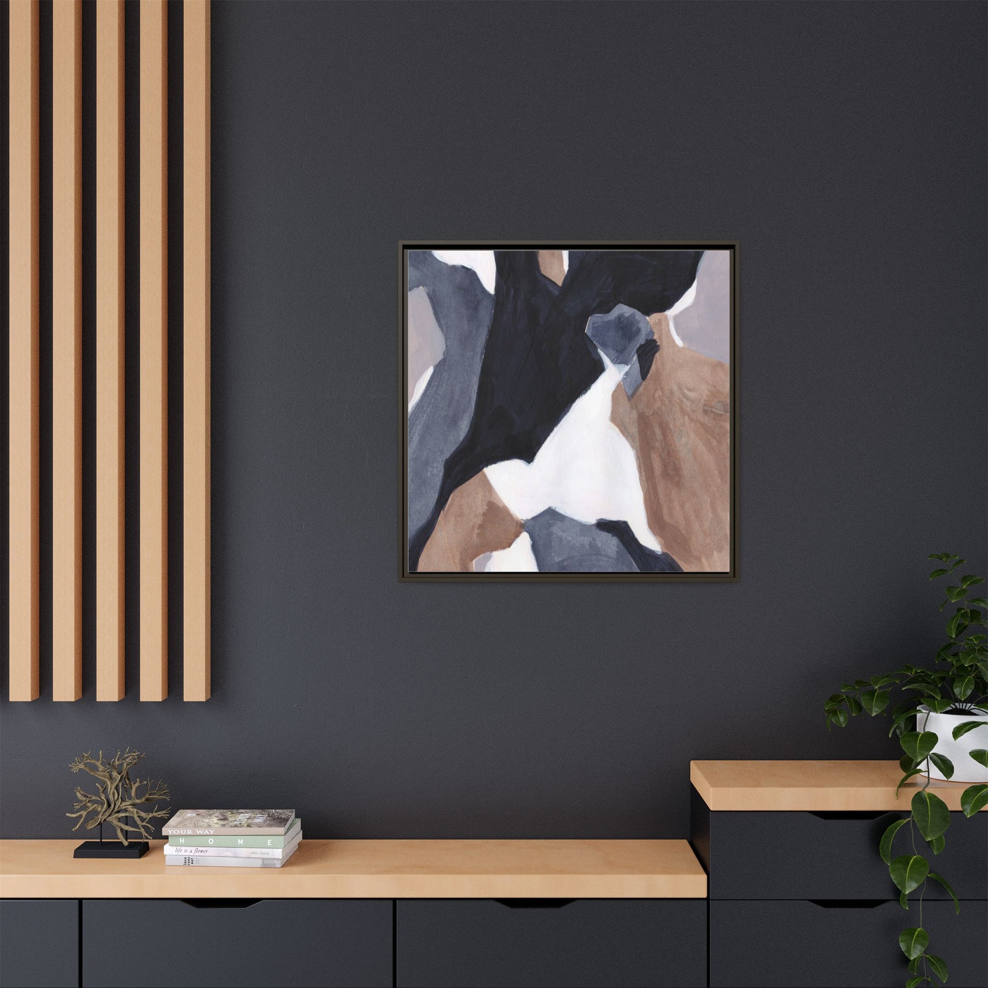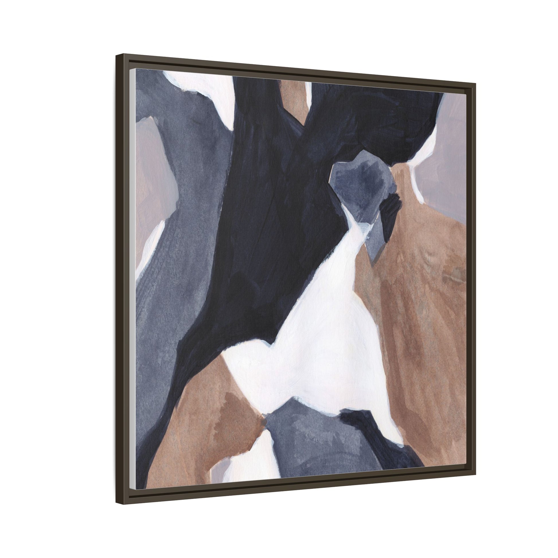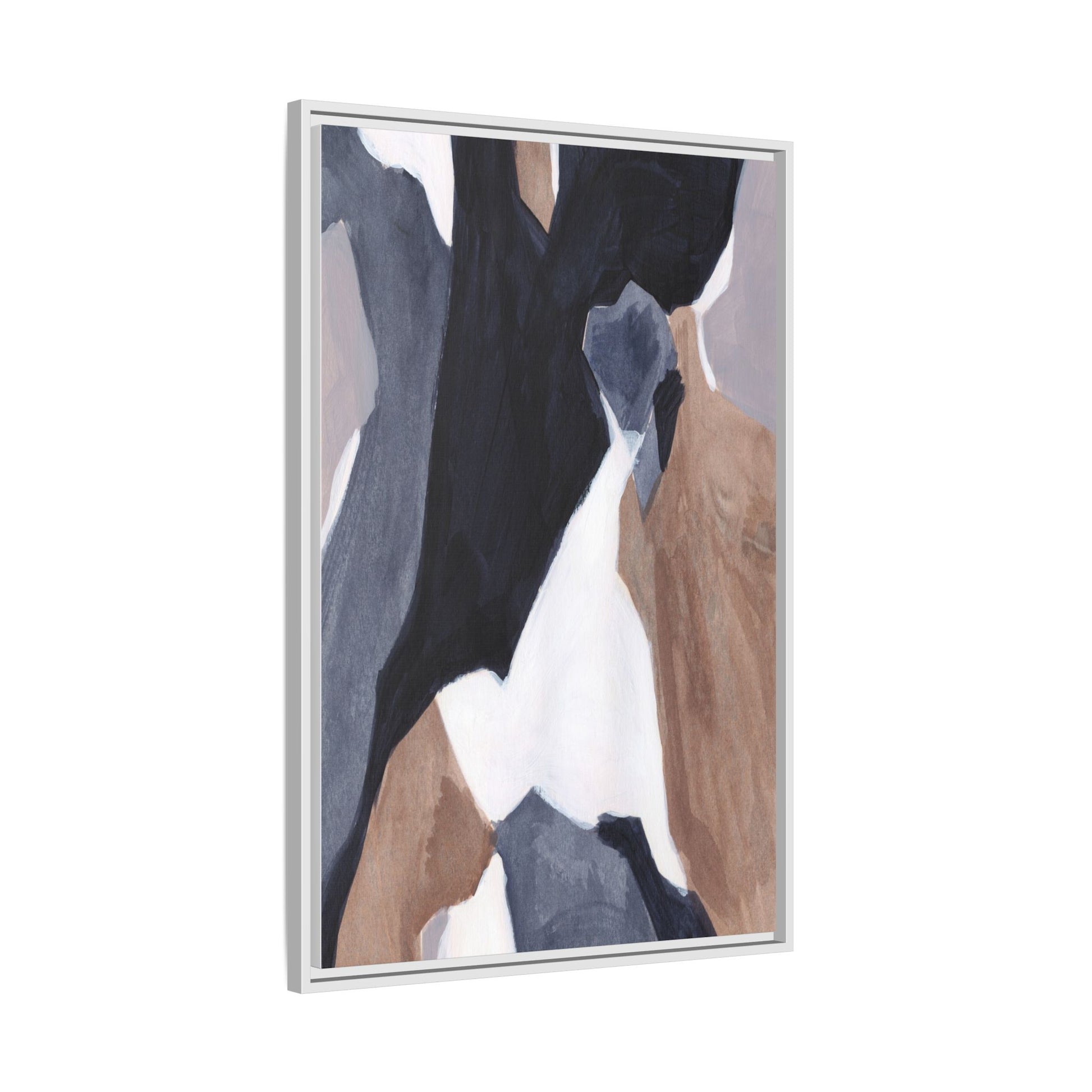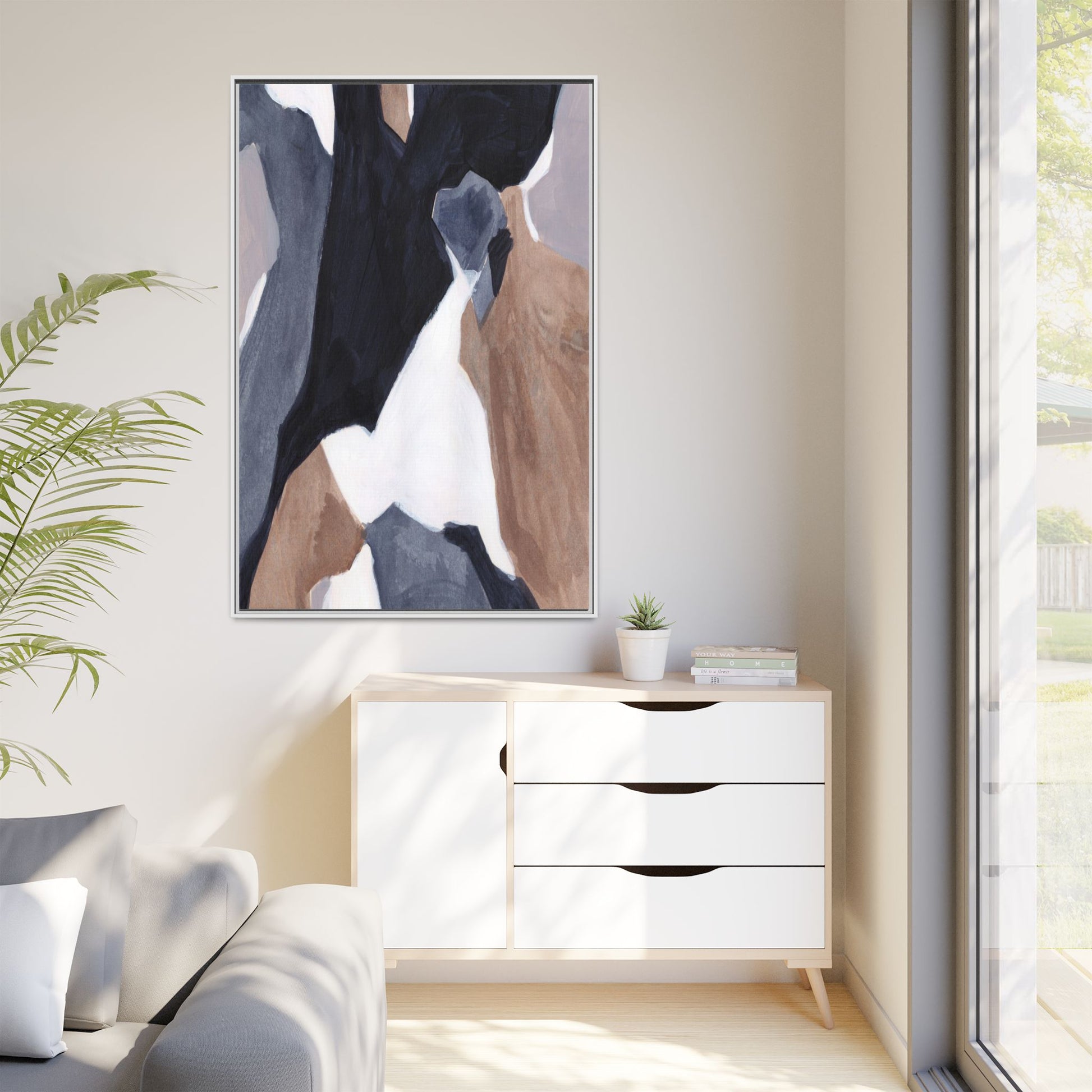 This abstract watercolor painting features a dynamic composition of geometric shapes in a muted color palette of white, black, gray, and tan. The artwork employs a fragmented, angular design with sharp-edged forms that intersect and overlap, creating a sense of movement and depth. Soft, blended watercolor textures give the painting a fluid quality, despite the hard-edged shapes. The color scheme suggests a minimalist, contemporary aesthetic, with the white sections providing a stark contrast against the darker gray and black elements. The painting's style evokes a sense of architectural or landscape abstraction, with its angular forms reminiscent of fractured terrain or urban landscapes.