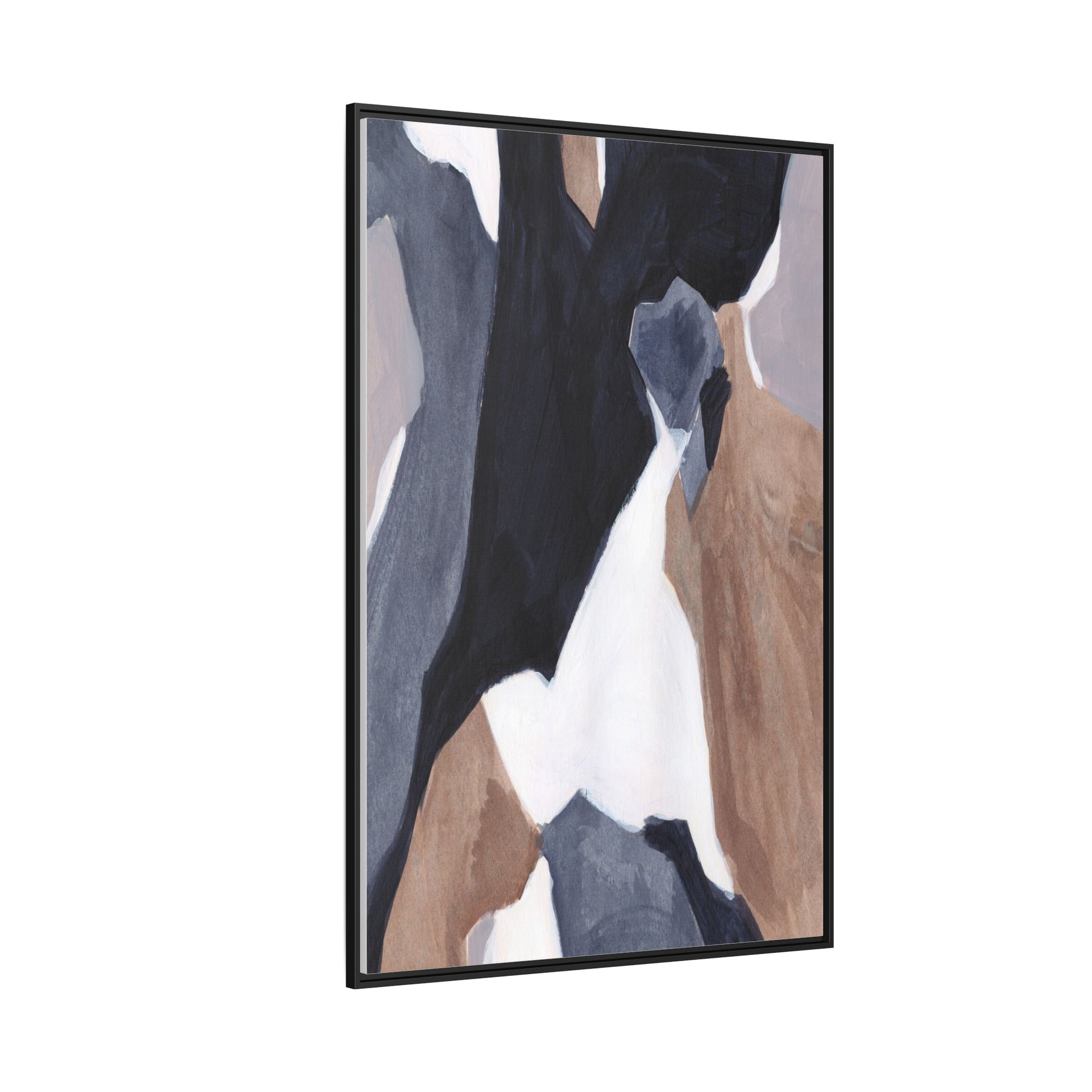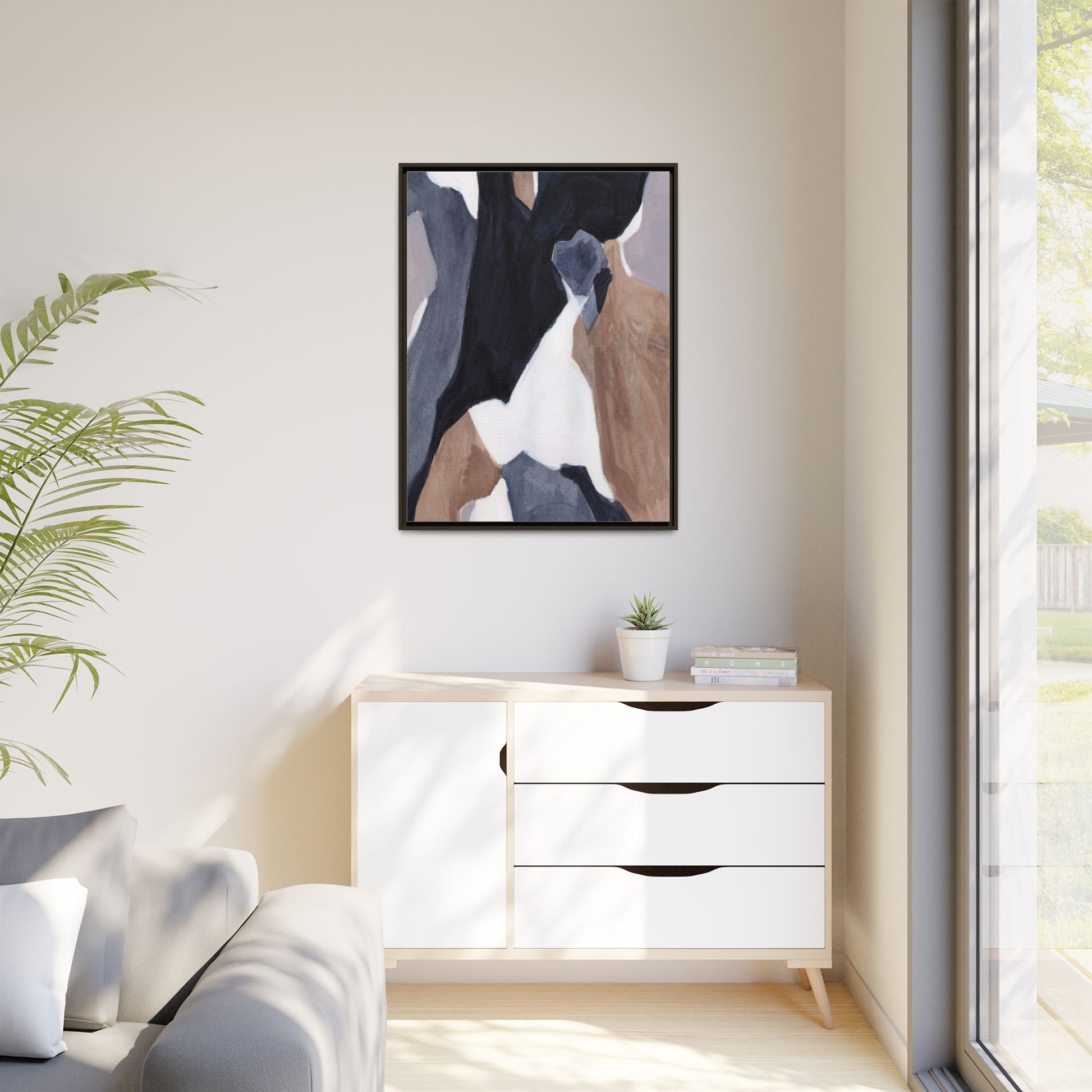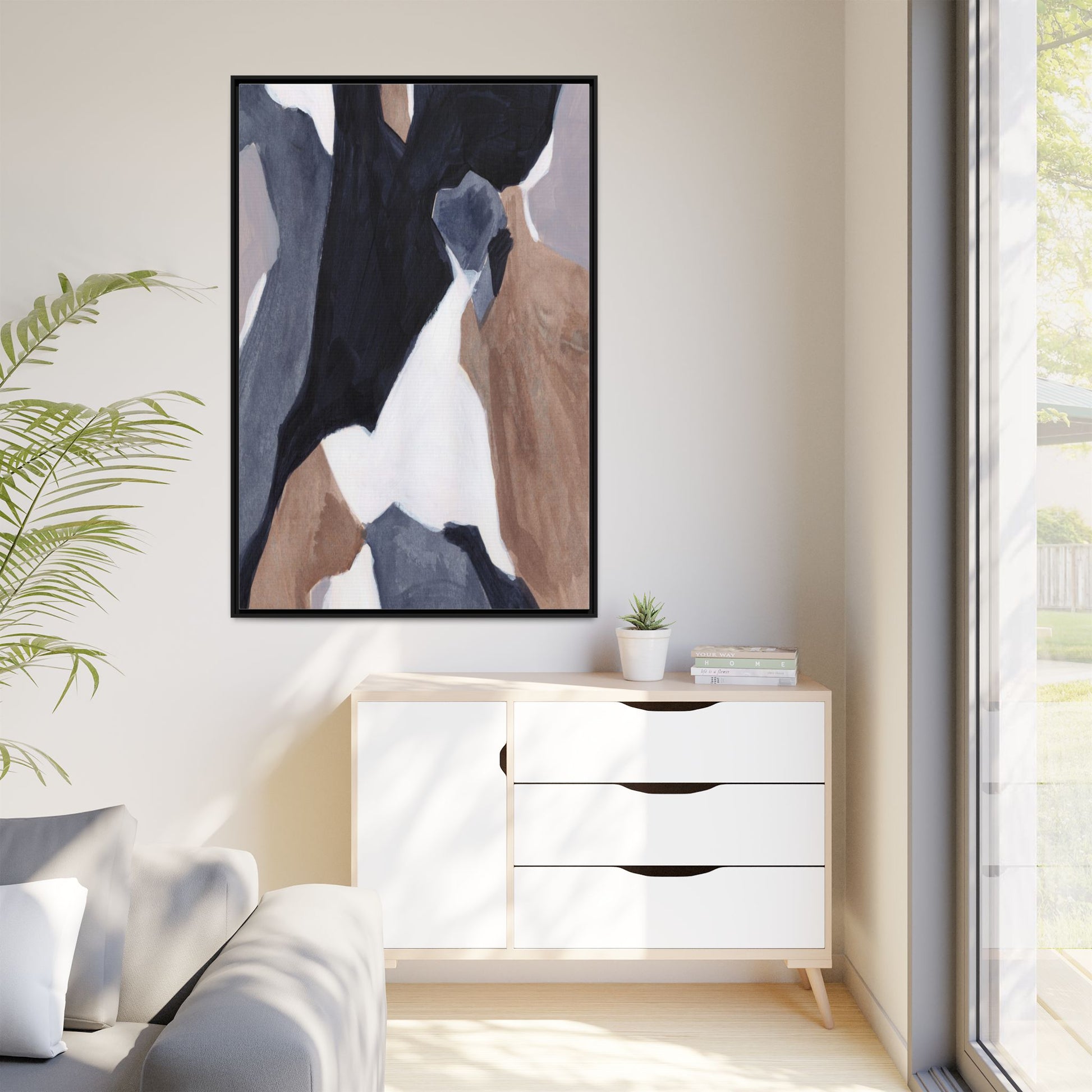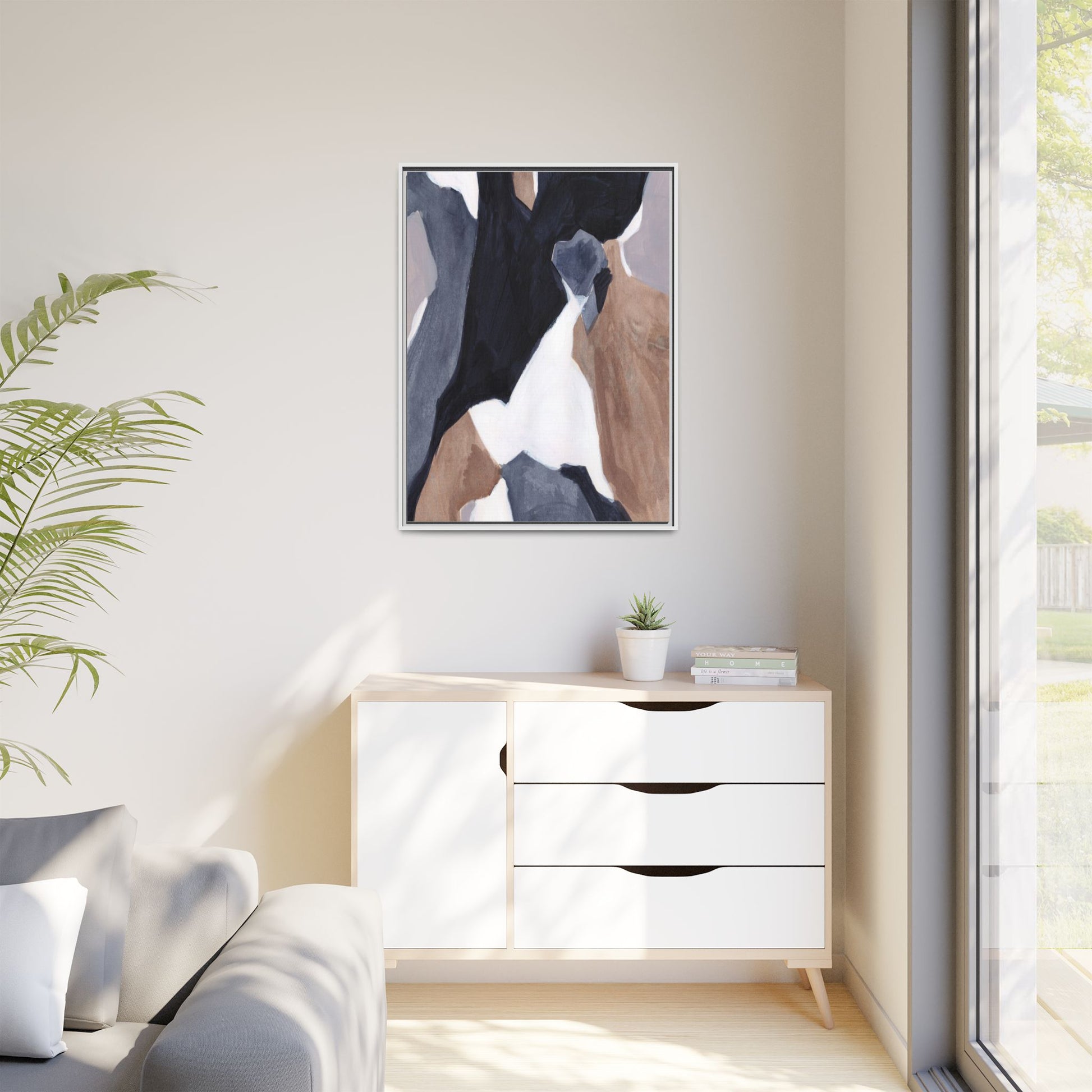 This abstract watercolor painting features a dynamic composition of geometric shapes in a muted color palette of white, black, gray, and tan. The artwork employs a fragmented, angular design with sharp-edged forms that intersect and overlap, creating a sense of movement and depth. Soft, blended watercolor textures give the painting a fluid quality, despite the hard-edged shapes. The color scheme suggests a minimalist, contemporary aesthetic, with the white sections providing a stark contrast against the darker gray and black elements. The painting's style evokes a sense of architectural or landscape abstraction, with its angular forms reminiscent of fractured terrain or urban landscapes.