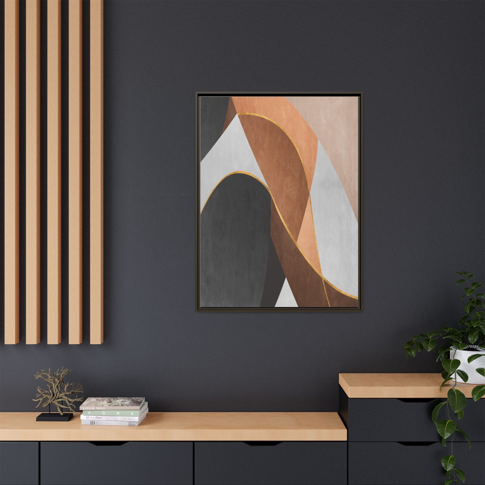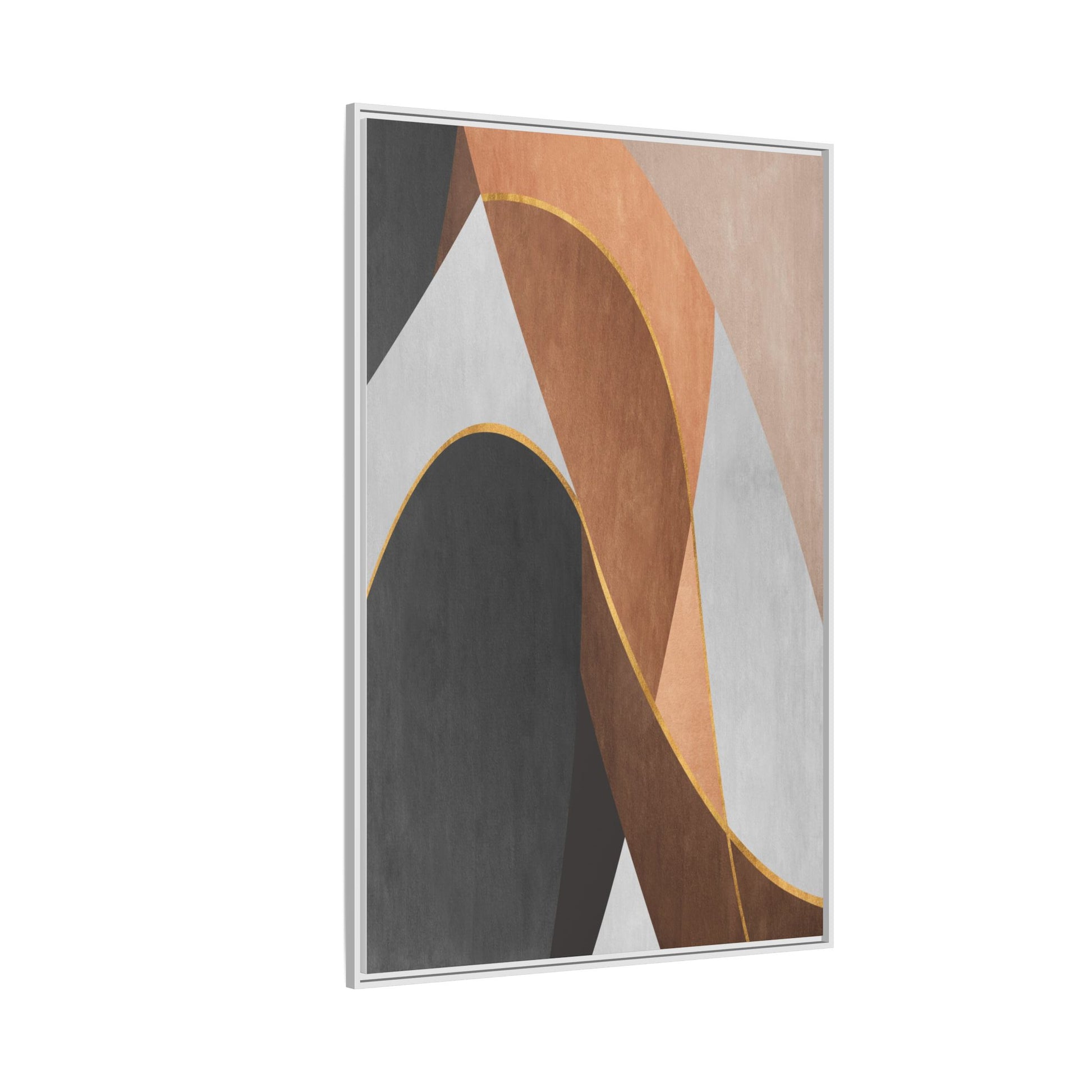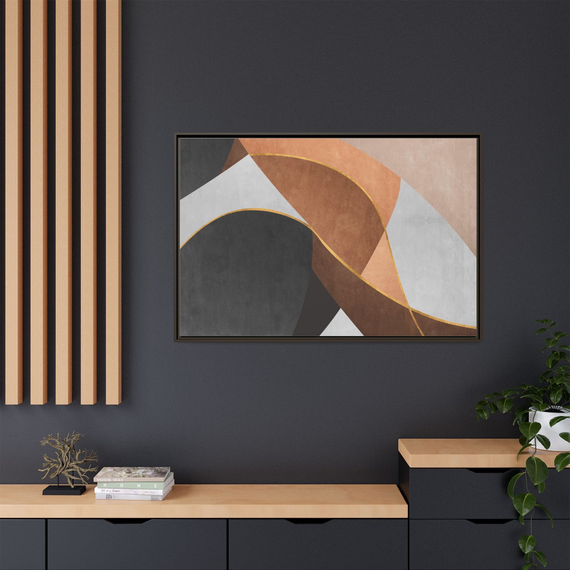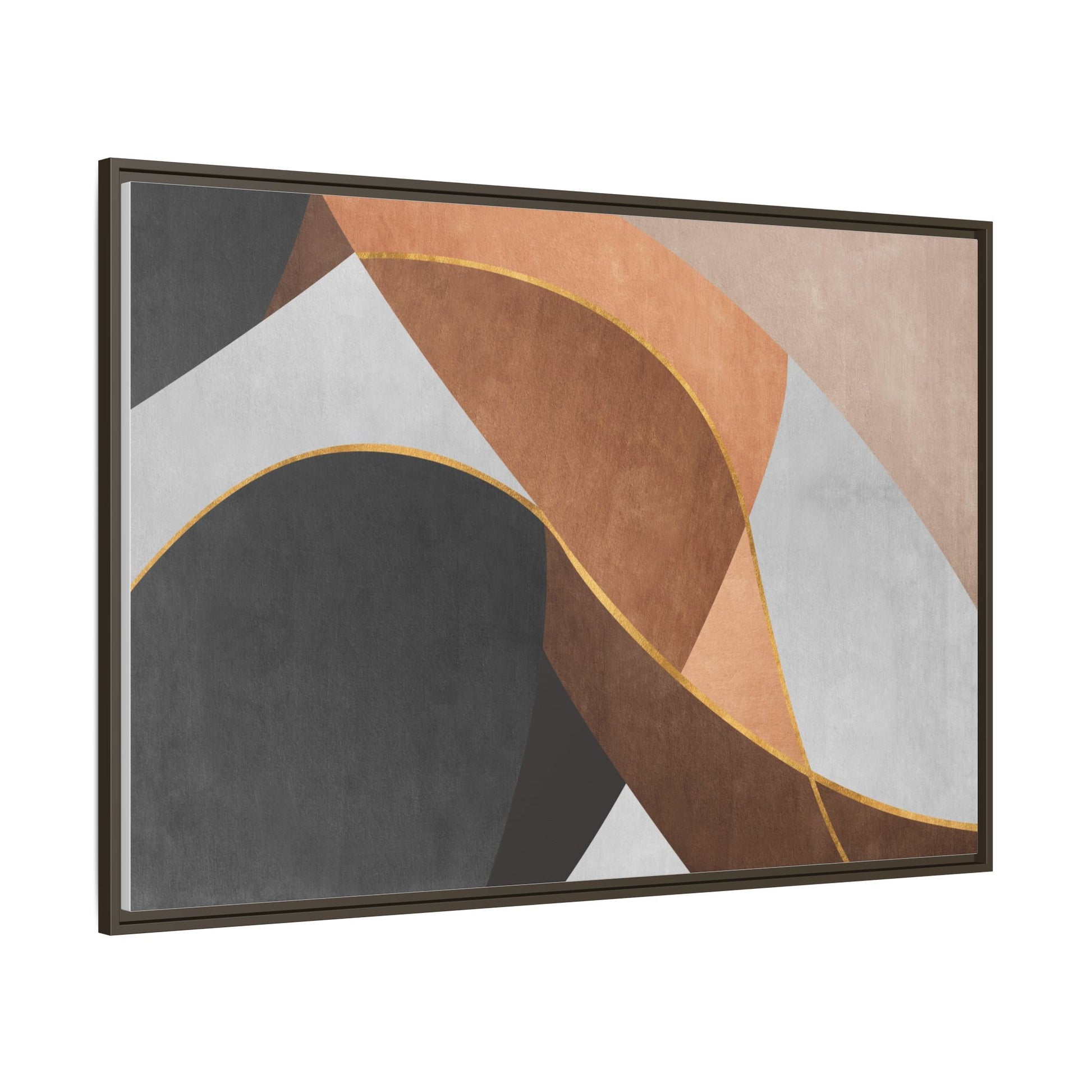 This abstract geometric artwork features a sophisticated palette of gray, brown, and beige tones, elegantly intersected by thin golden lines. The composition consists of overlapping curved and angular shapes that create a sense of depth and movement, reminiscent of mid-century modern design. Soft, textured surfaces give the image a tactile quality, with each geometric section displaying a slightly different shade and gradient. The color scheme evokes a sense of warmth and elegance, with charcoal gray contrasting against soft terracotta and light neutral tones. The golden lines act as visual separators, adding a luxurious metallic accent that defines and highlights the various geometric segments.