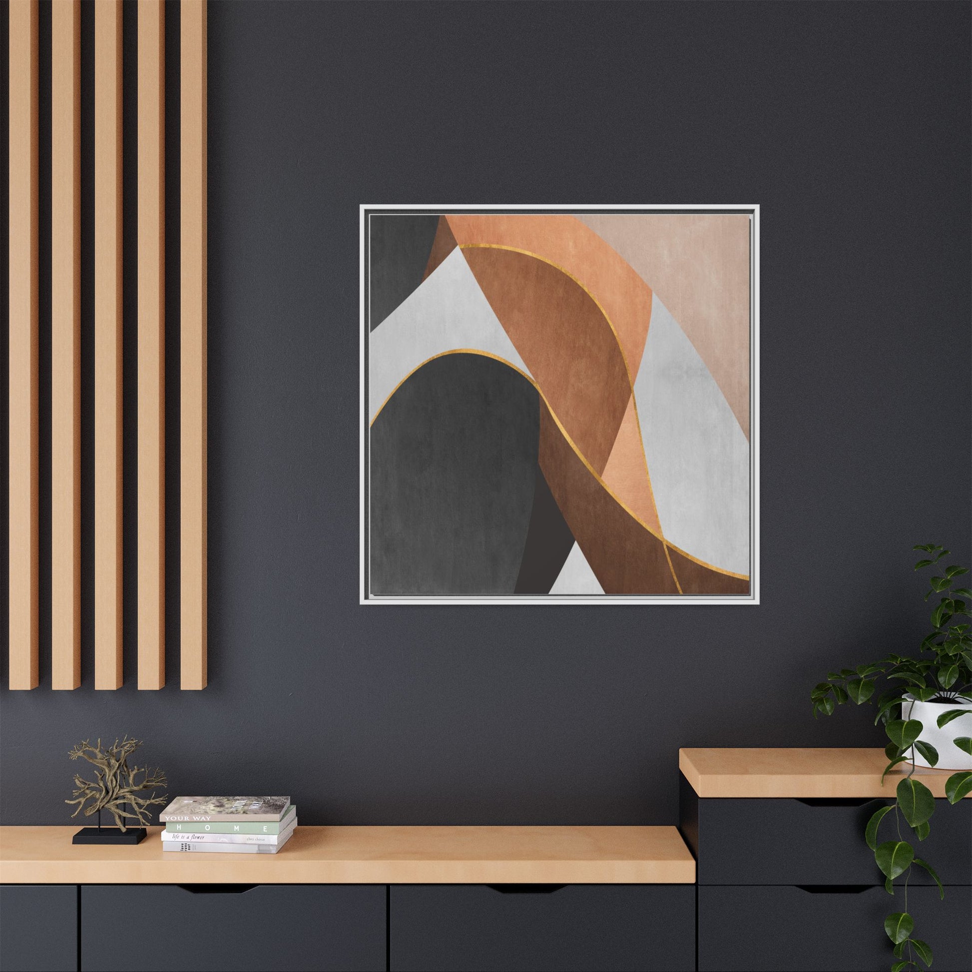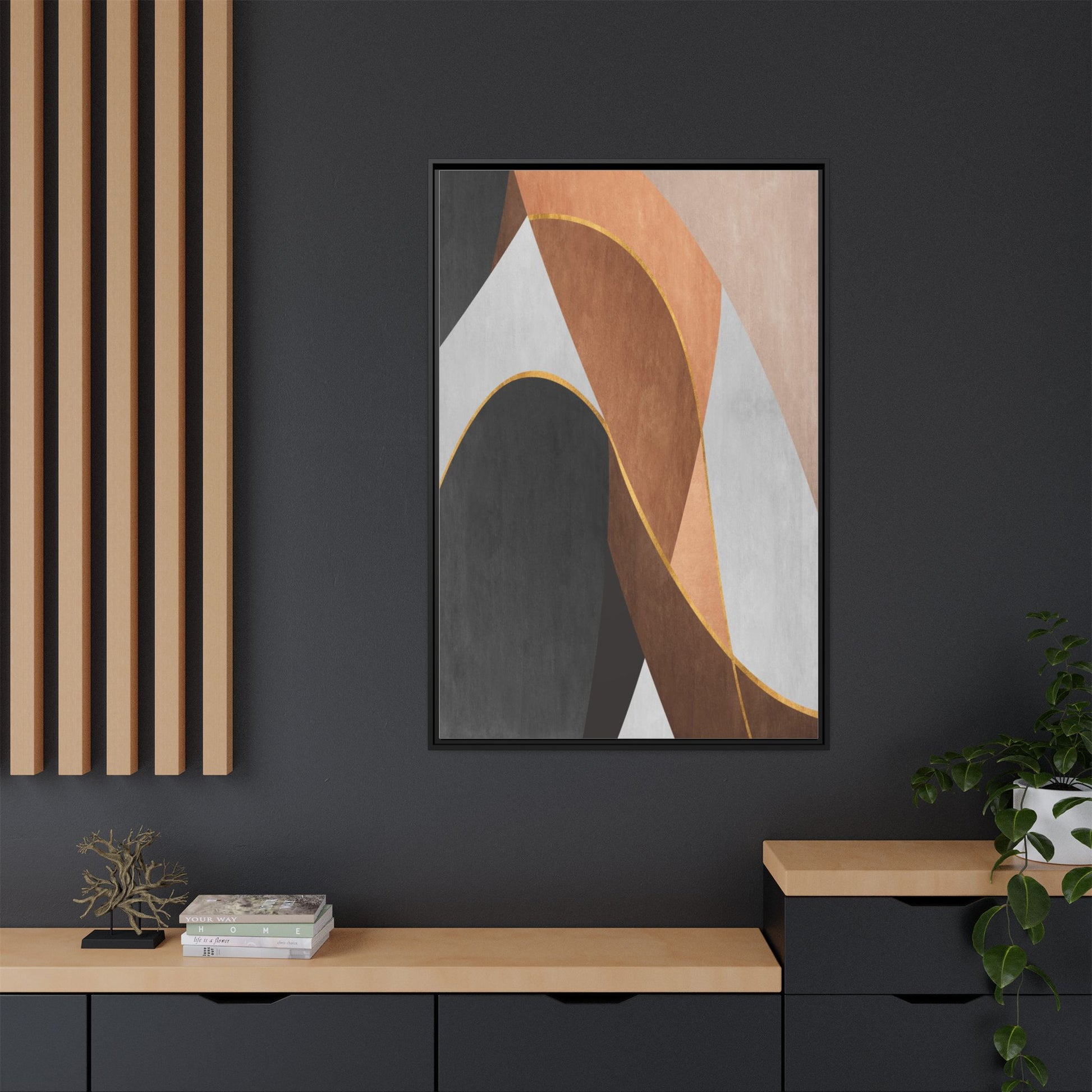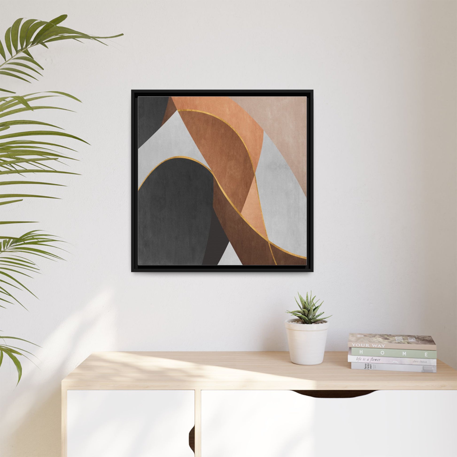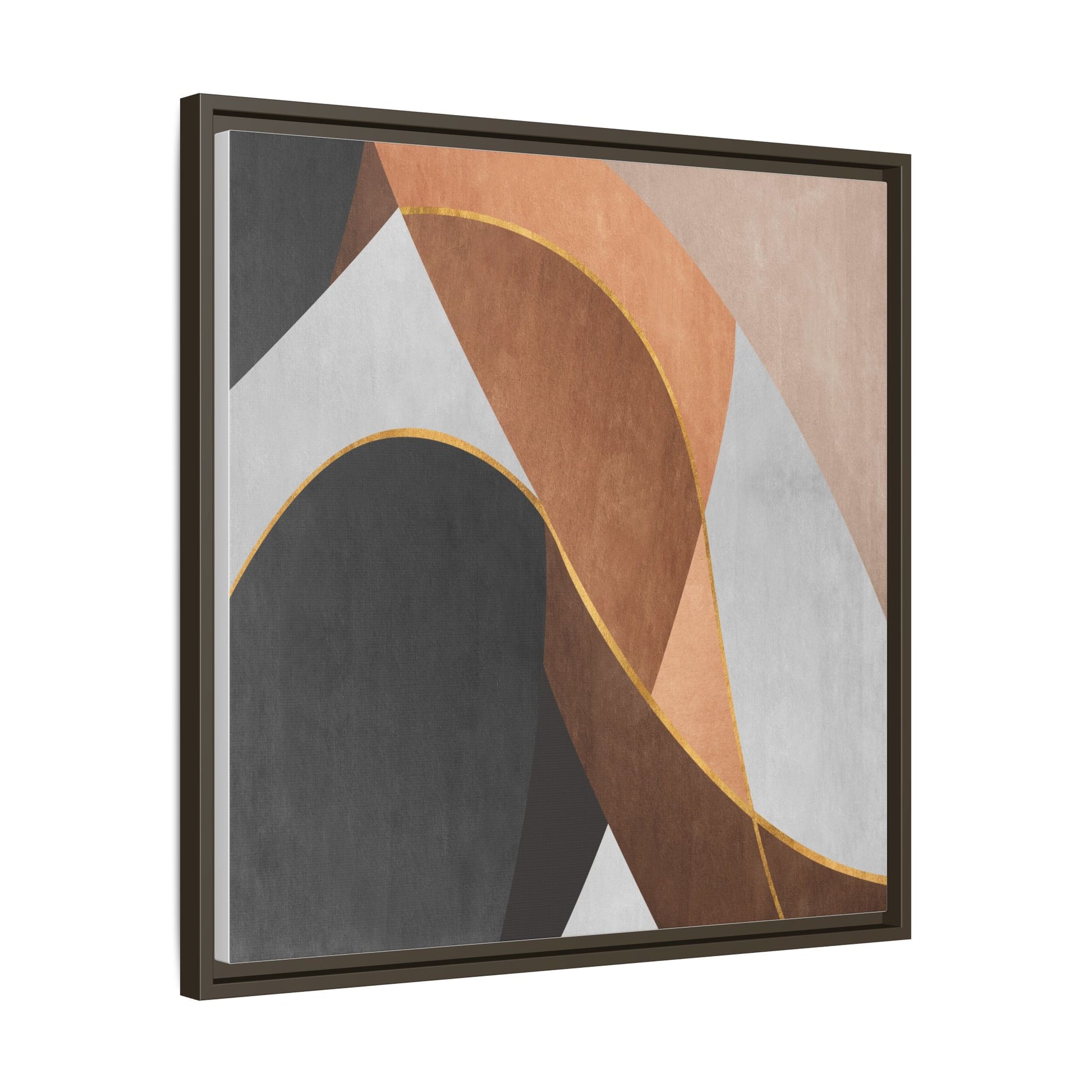 This abstract geometric artwork features a sophisticated palette of gray, brown, and beige tones, elegantly intersected by thin golden lines. The composition consists of overlapping curved and angular shapes that create a sense of depth and movement, reminiscent of mid-century modern design. Soft, textured surfaces give the image a tactile quality, with each geometric section displaying a slightly different shade and gradient. The color scheme evokes a sense of warmth and elegance, with charcoal gray contrasting against soft terracotta and light neutral tones. The golden lines act as visual separators, adding a luxurious metallic accent that defines and highlights the various geometric segments.