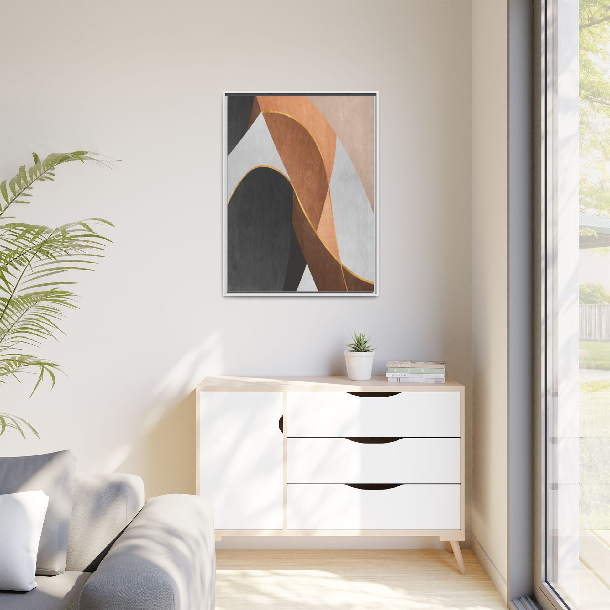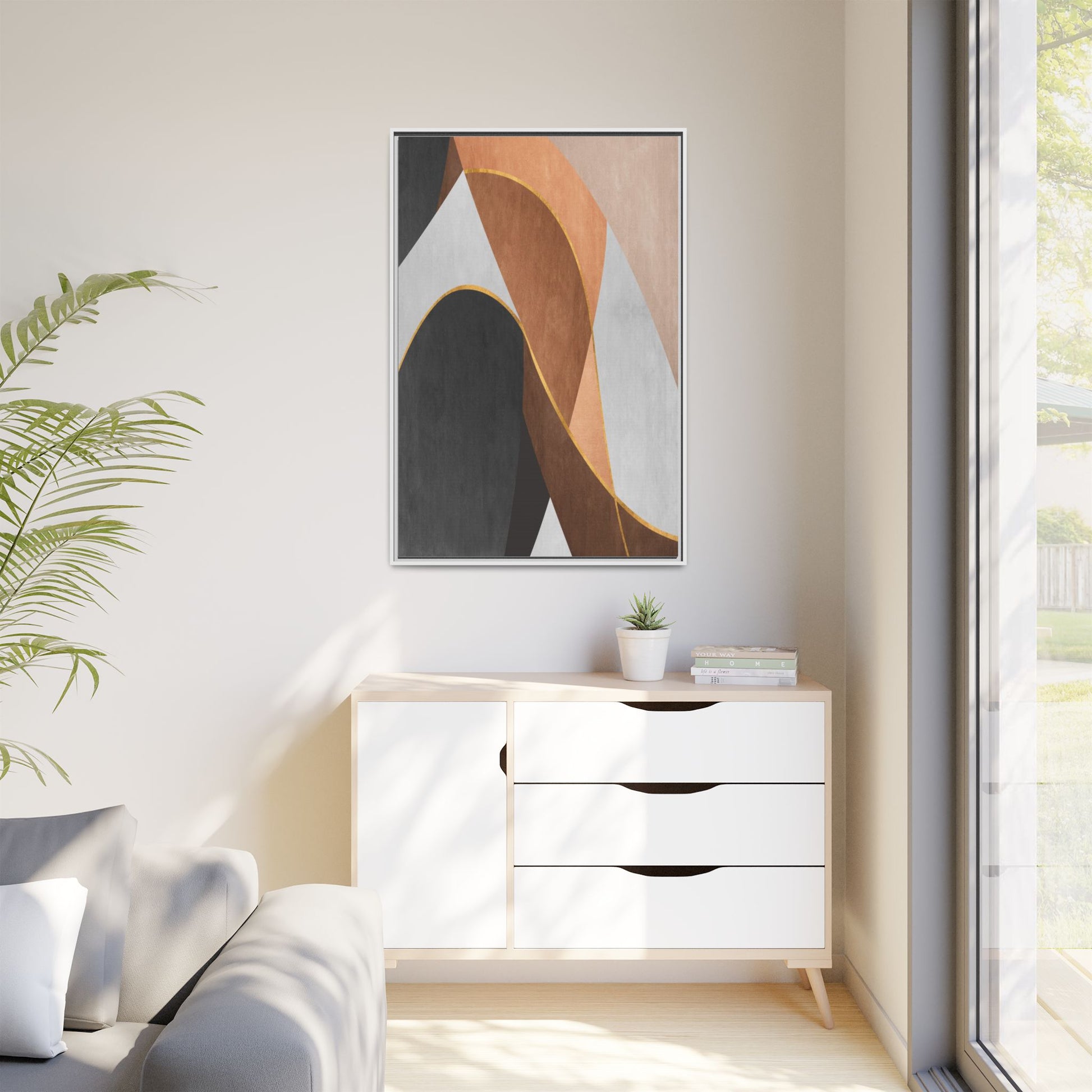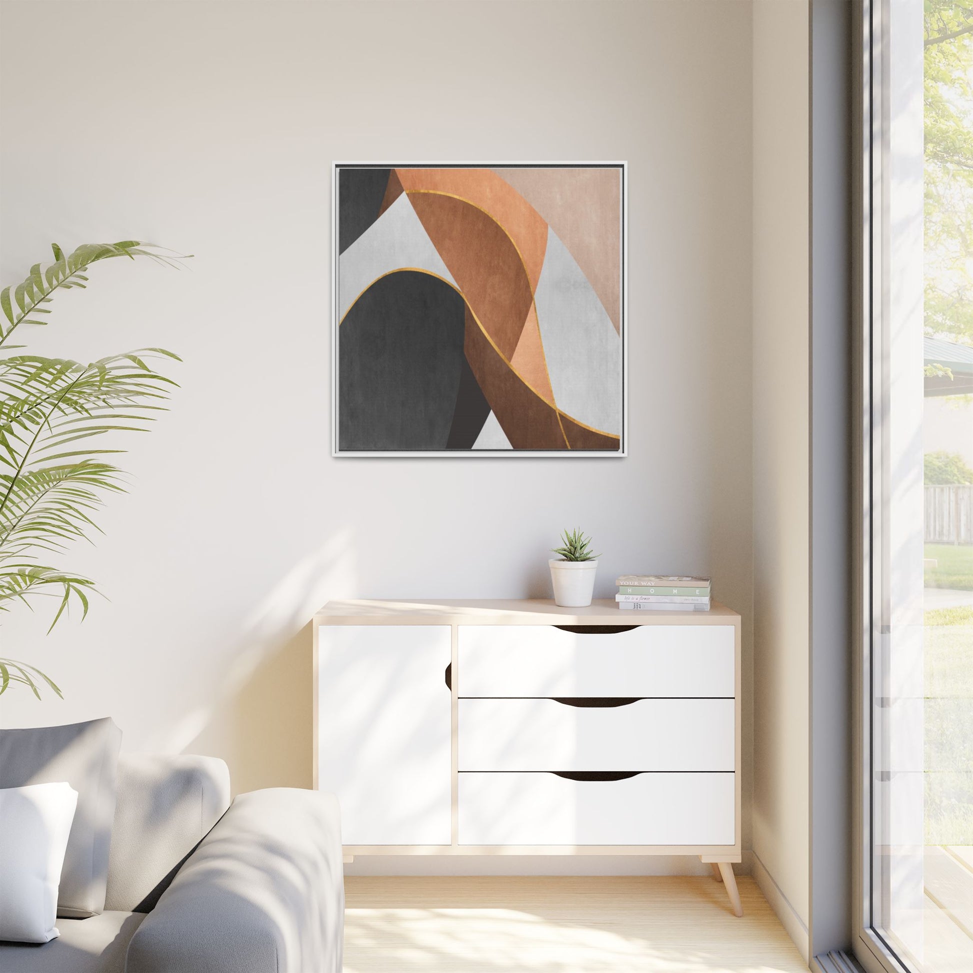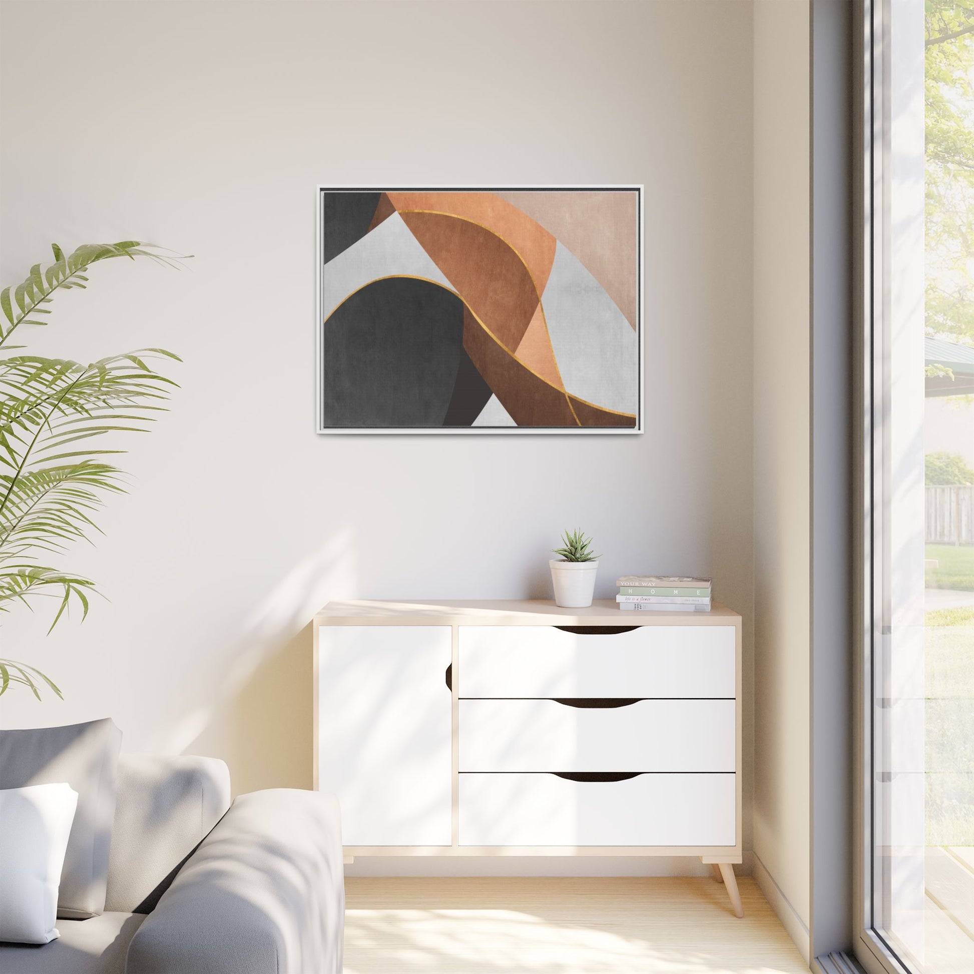 This abstract geometric artwork features a sophisticated palette of gray, brown, and beige tones, elegantly intersected by thin golden lines. The composition consists of overlapping curved and angular shapes that create a sense of depth and movement, reminiscent of mid-century modern design. Soft, textured surfaces give the image a tactile quality, with each geometric section displaying a slightly different shade and gradient. The color scheme evokes a sense of warmth and elegance, with charcoal gray contrasting against soft terracotta and light neutral tones. The golden lines act as visual separators, adding a luxurious metallic accent that defines and highlights the various geometric segments.