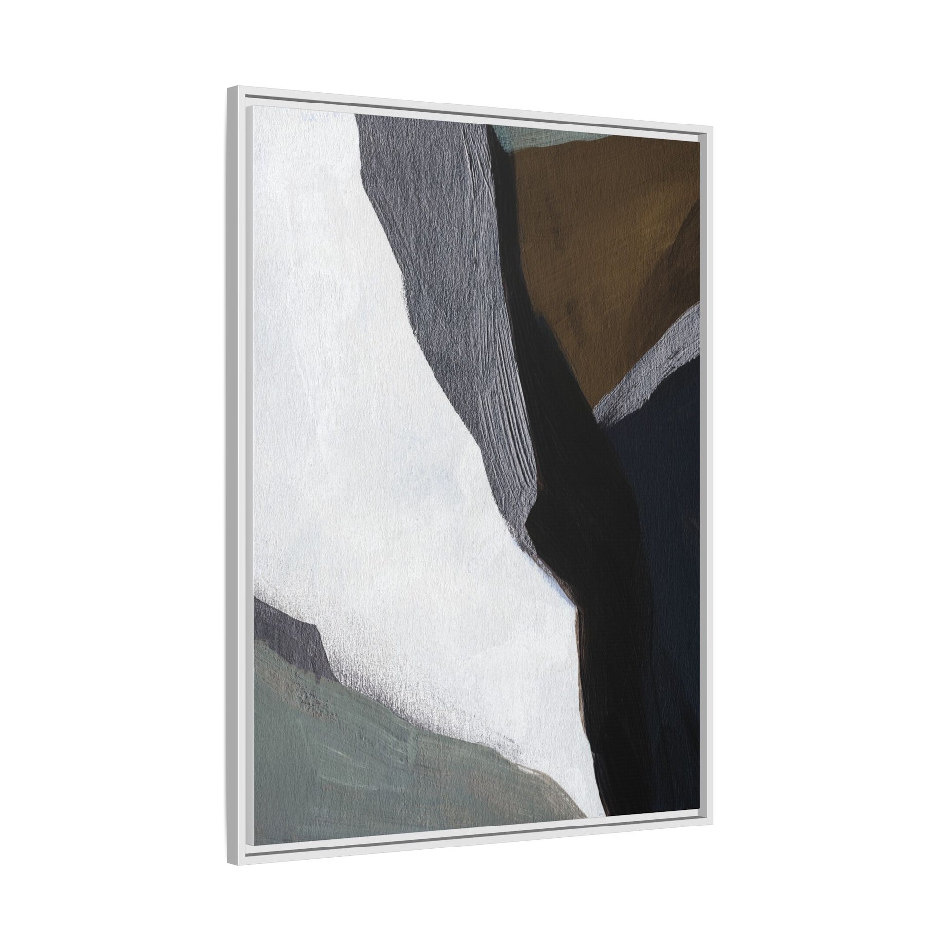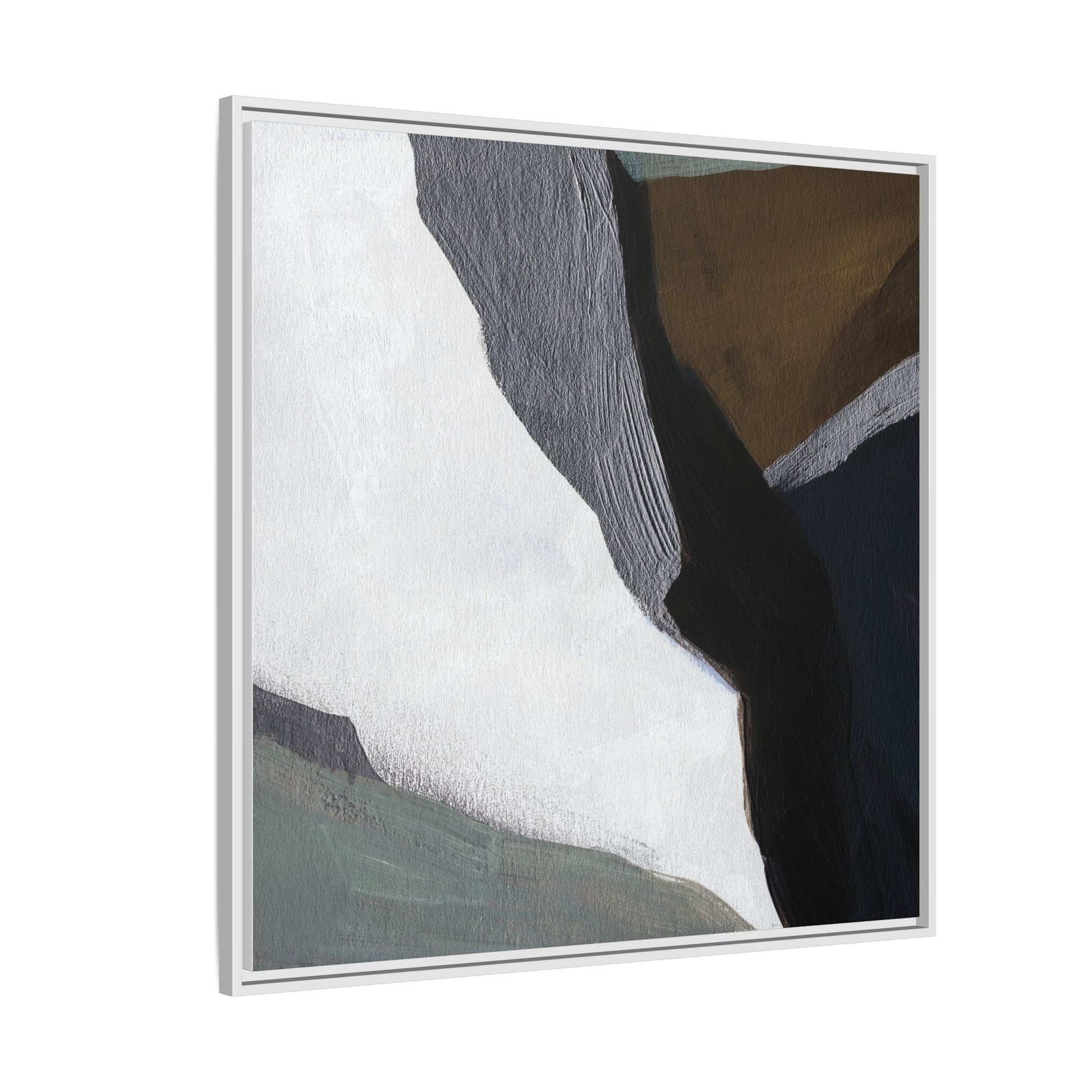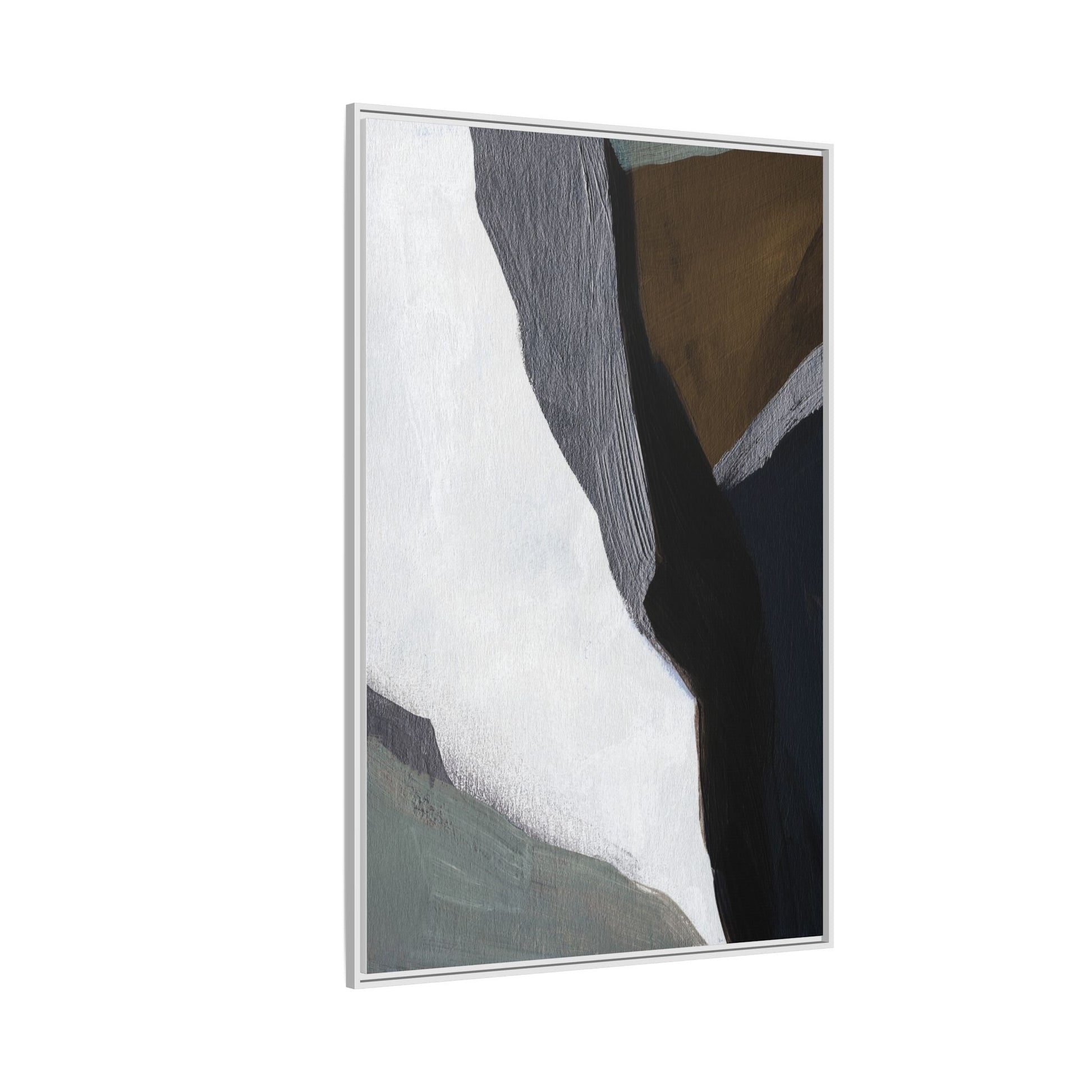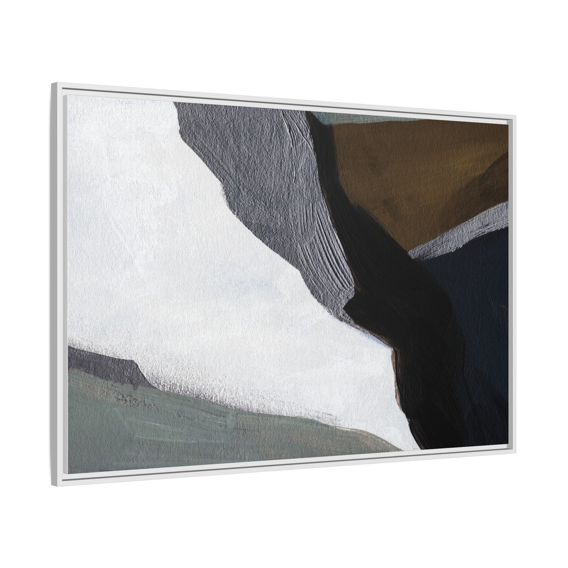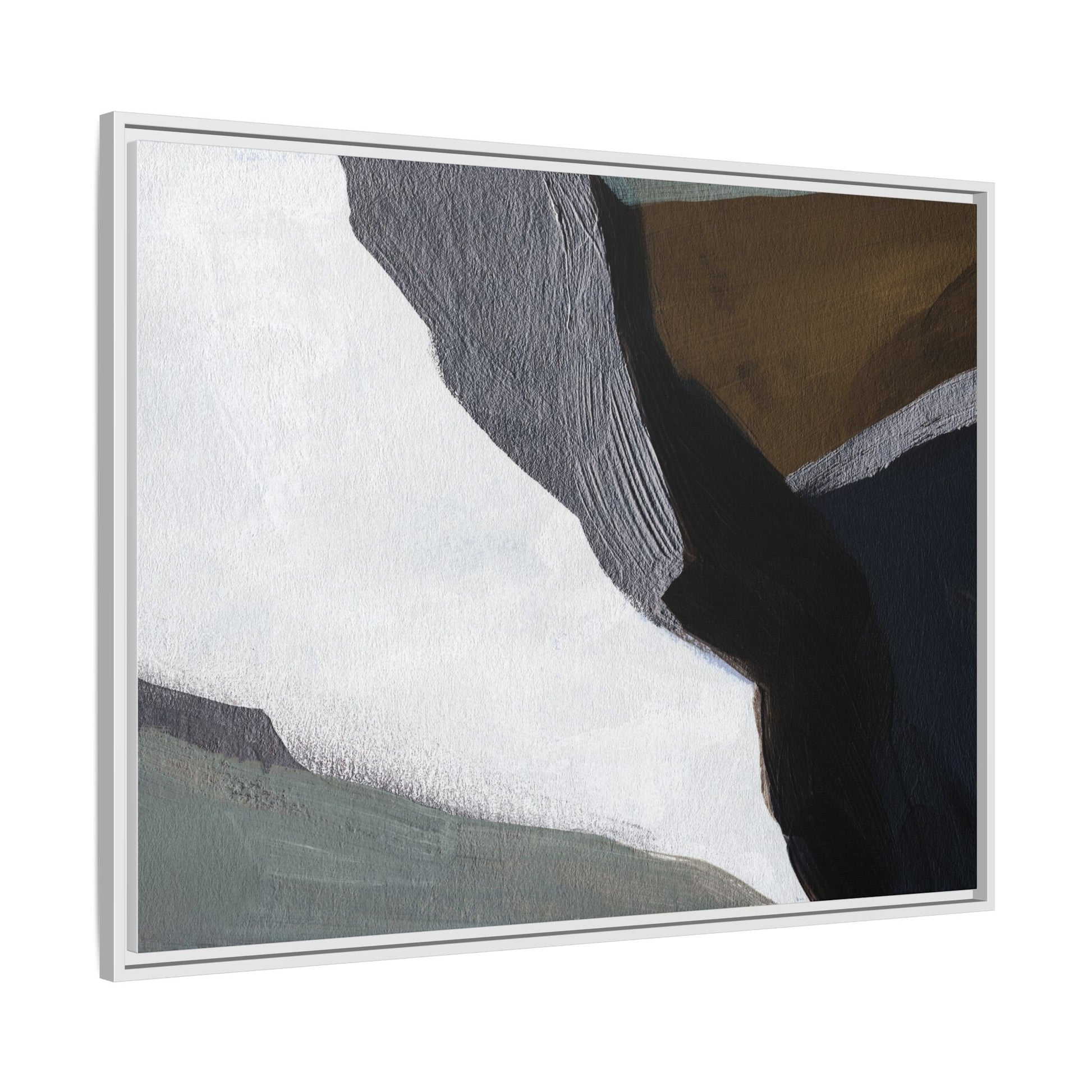 This abstract artistic image features a sophisticated composition of geometric shapes and textured surfaces in a muted color palette. Soft, layered forms in shades of white, gray, black, green, and brown create a dynamic visual landscape with distinct angular transitions. The texture appears to be reminiscent of painted or sculpted surfaces, with subtle variations in depth and a slightly rough, almost tactile quality that suggests brush or palette knife application. Diagonal lines and sharp contrasts between the color blocks create a sense of movement and depth, drawing the viewer's eye across the artistic arrangement. The overall aesthetic evokes a minimalist, contemporary art style that balances geometric precision with organic, softly blended edges.