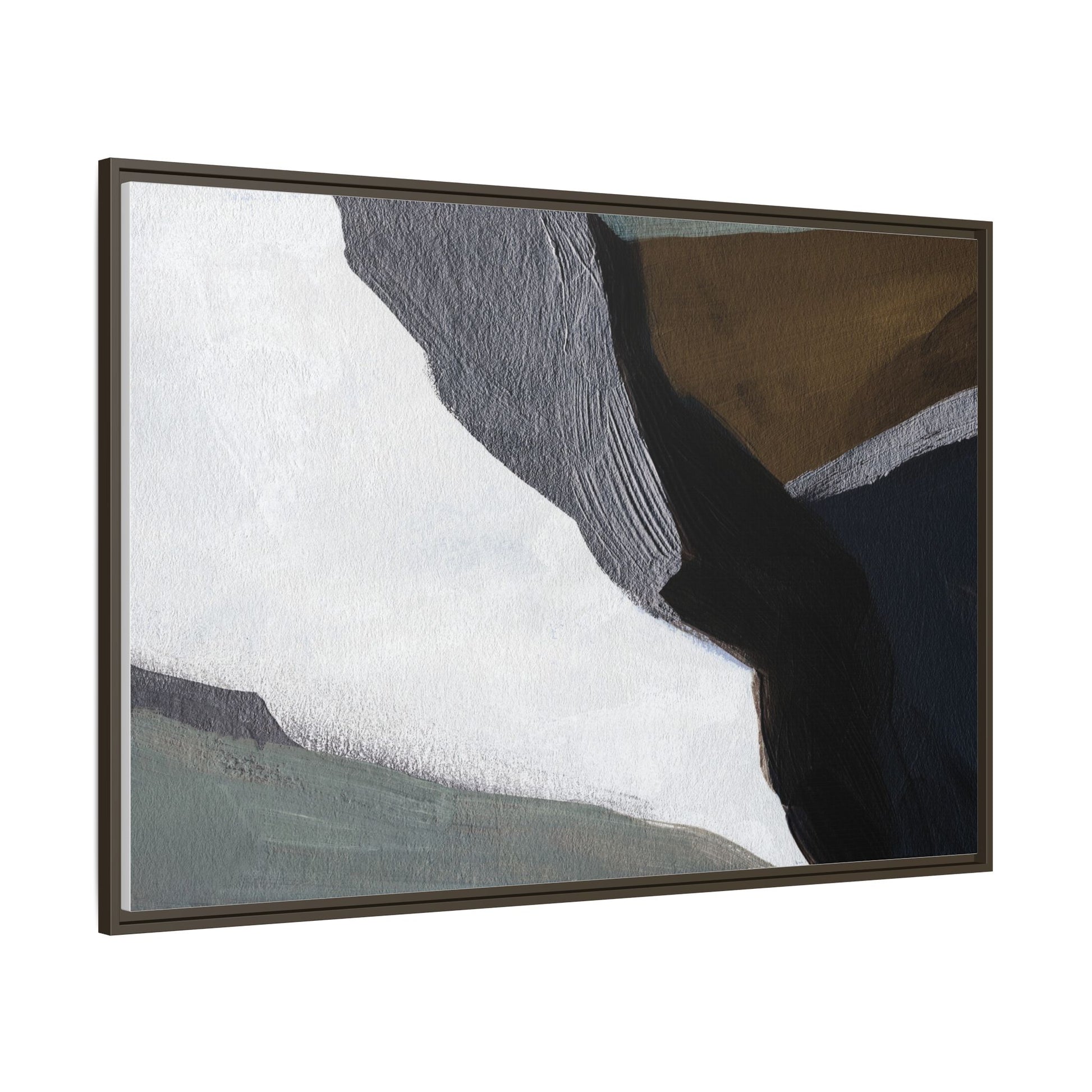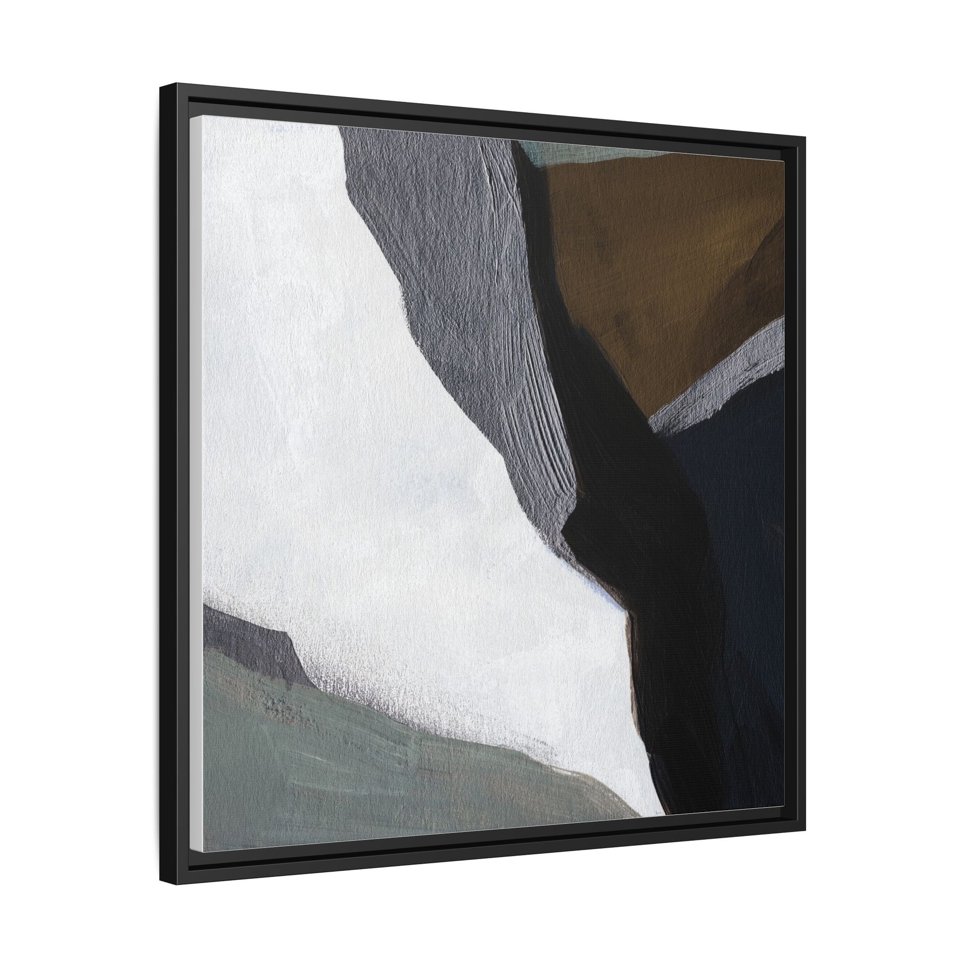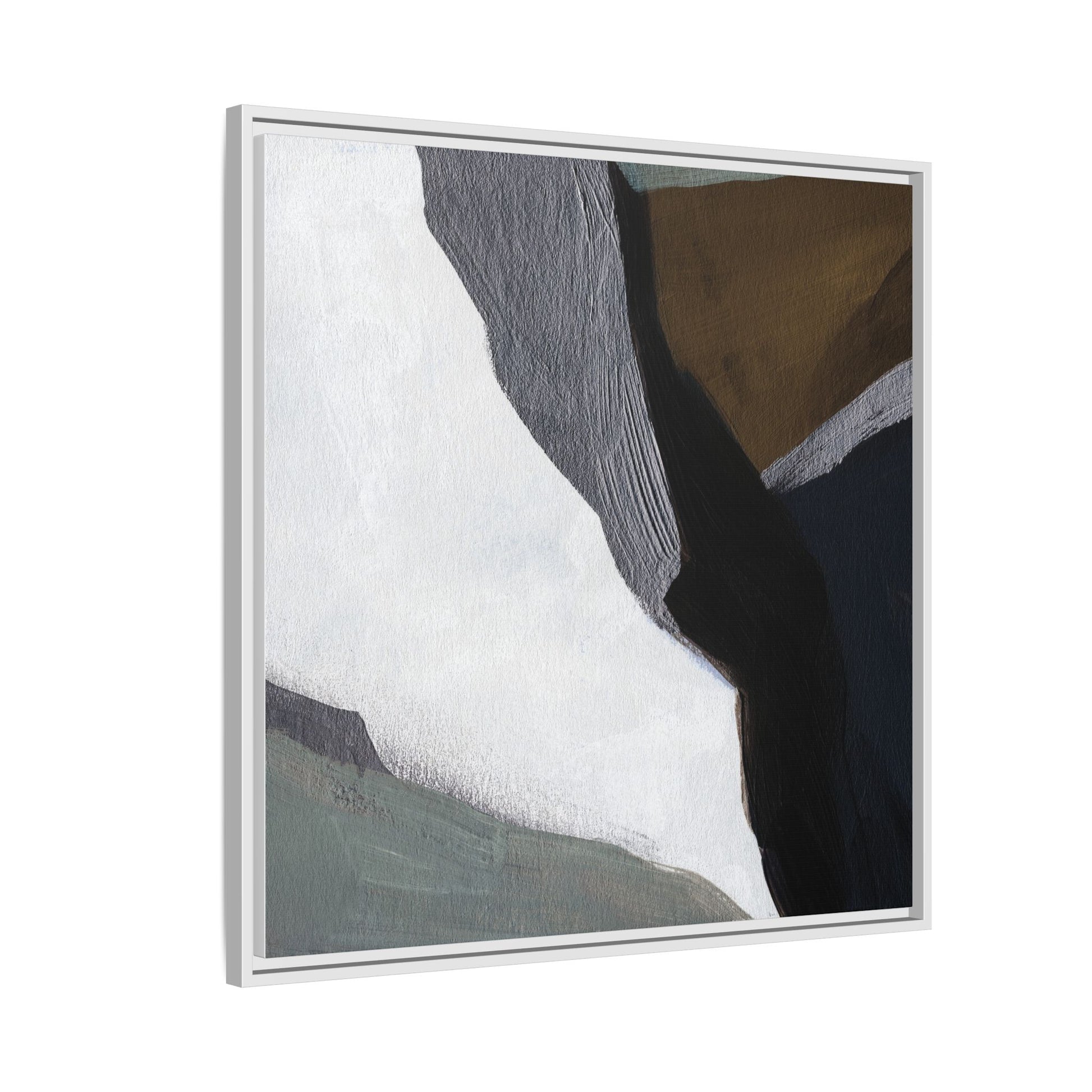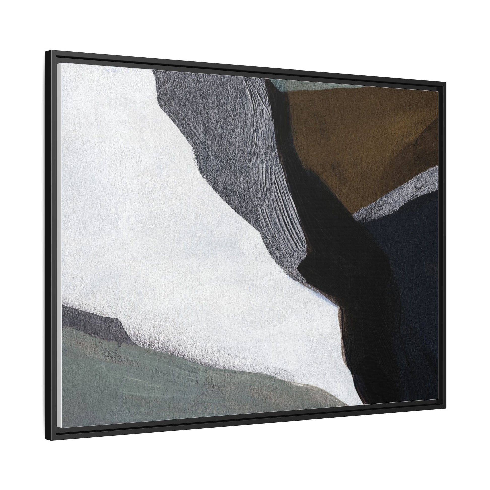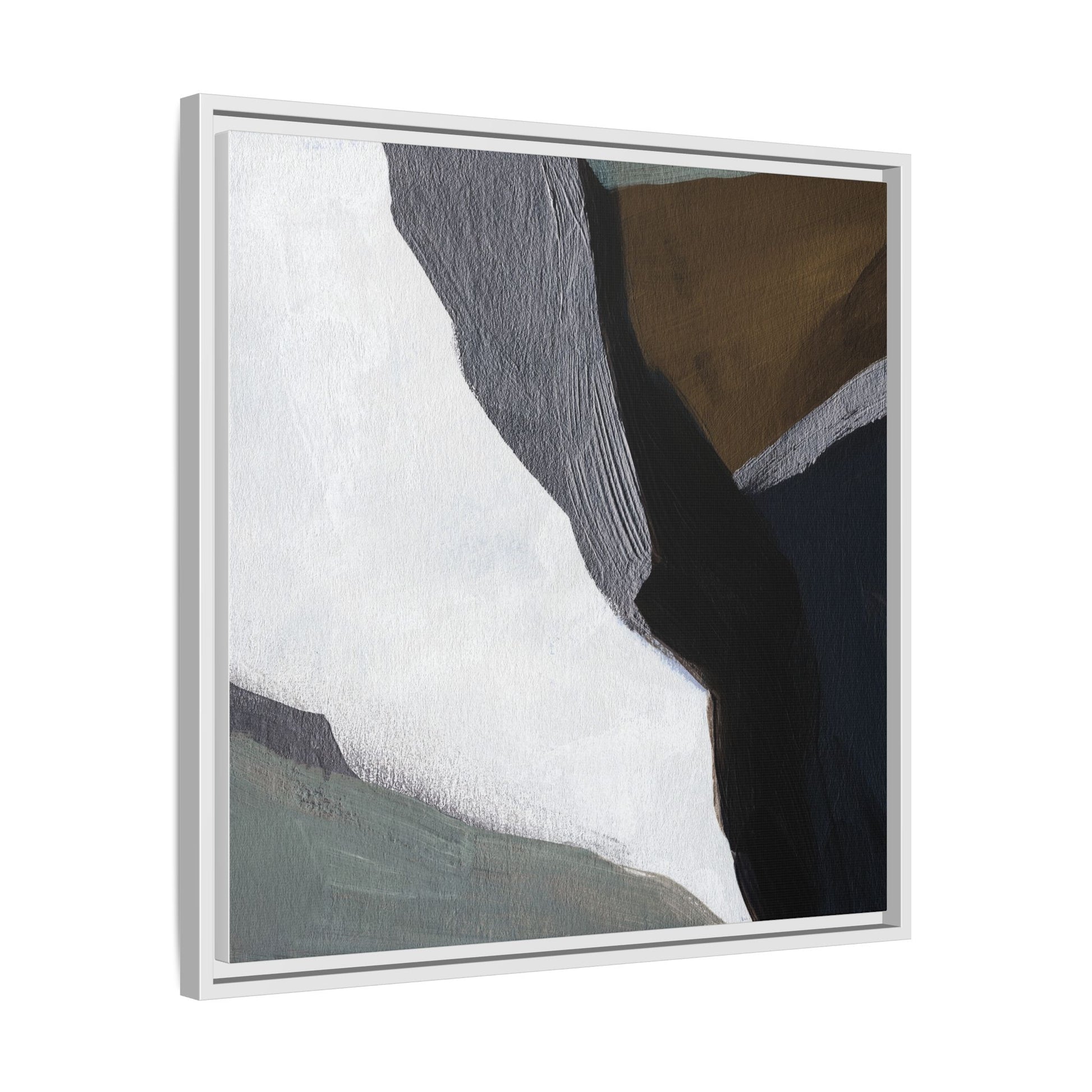 This abstract artistic image features a sophisticated composition of geometric shapes and textured surfaces in a muted color palette. Soft, layered forms in shades of white, gray, black, green, and brown create a dynamic visual landscape with distinct angular transitions. The texture appears to be reminiscent of painted or sculpted surfaces, with subtle variations in depth and a slightly rough, almost tactile quality that suggests brush or palette knife application. Diagonal lines and sharp contrasts between the color blocks create a sense of movement and depth, drawing the viewer's eye across the artistic arrangement. The overall aesthetic evokes a minimalist, contemporary art style that balances geometric precision with organic, softly blended edges.
