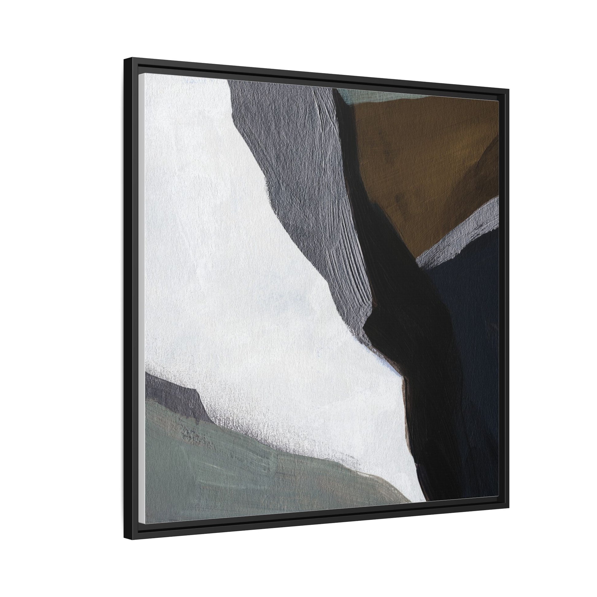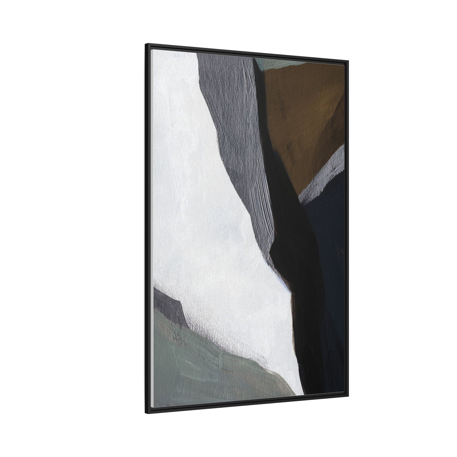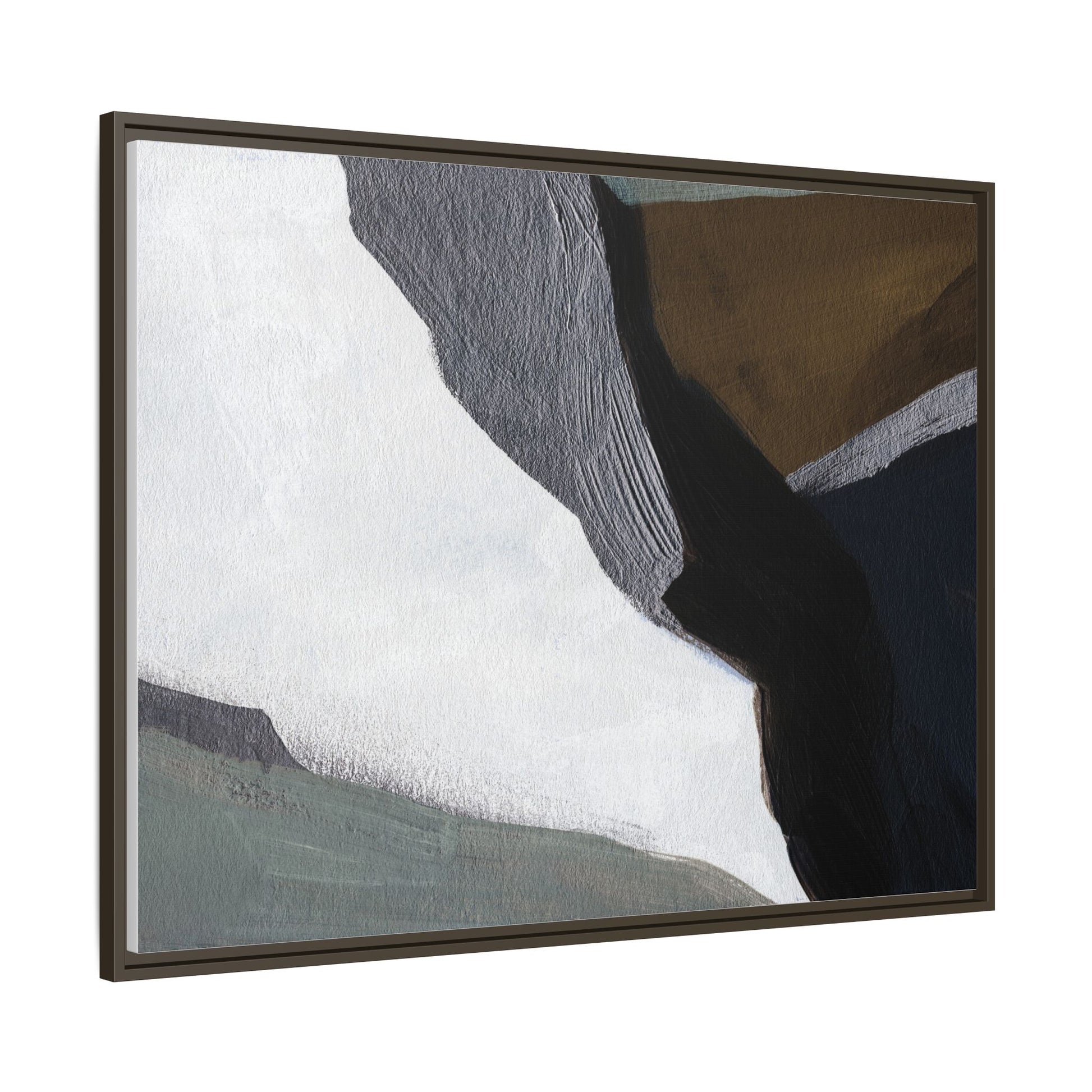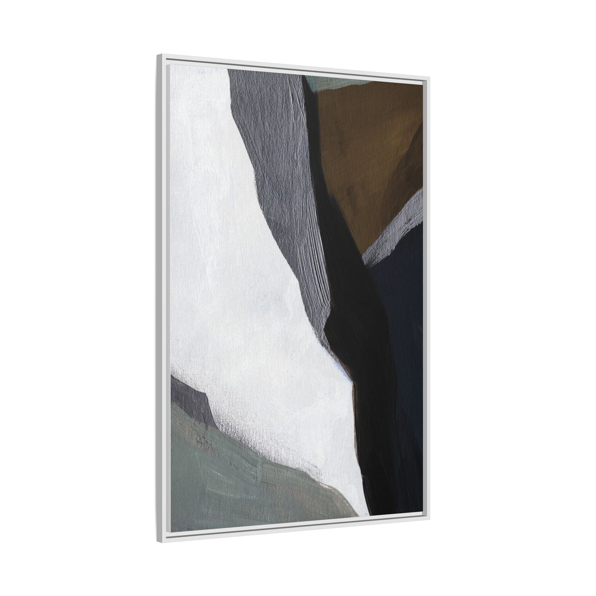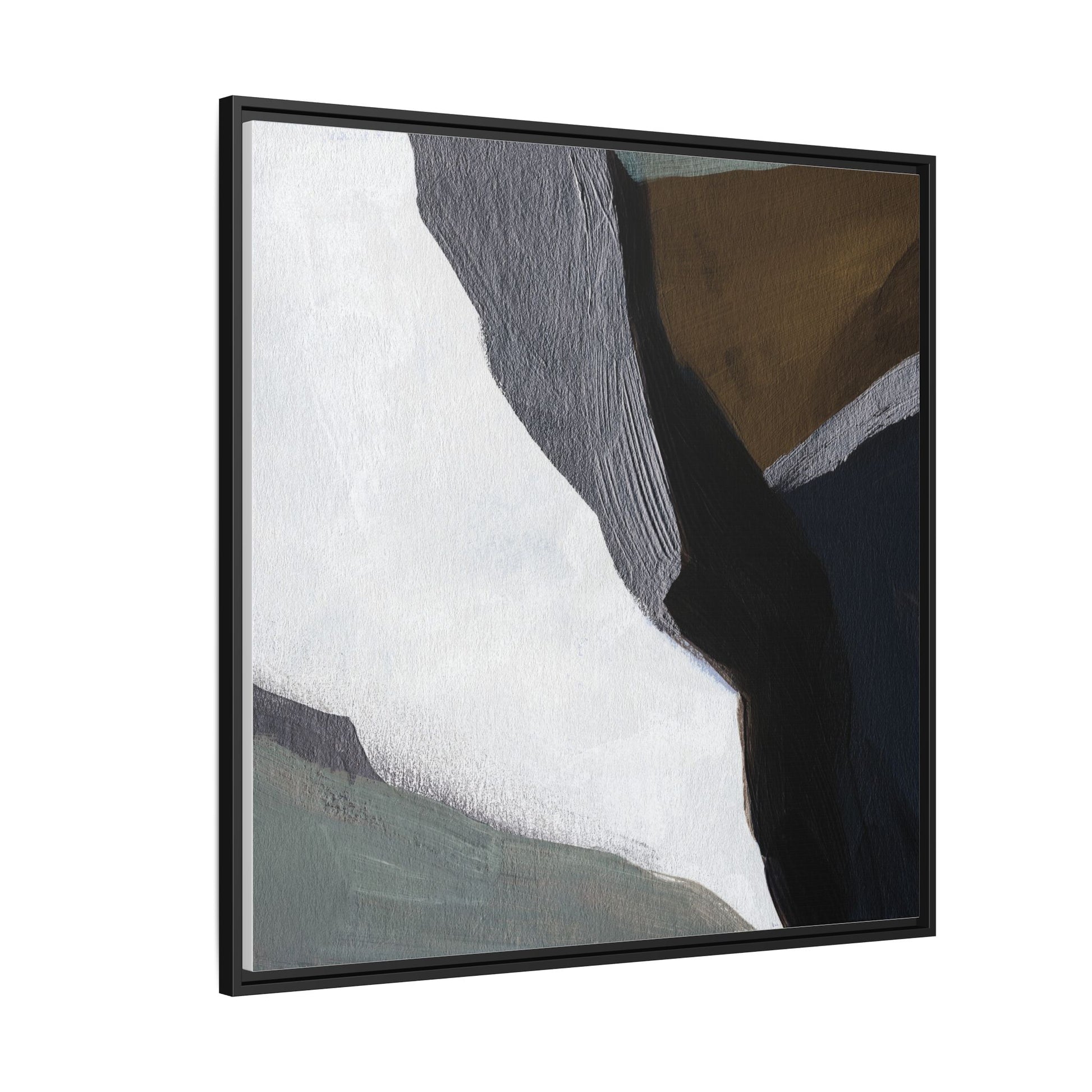 This abstract artistic image features a sophisticated composition of geometric shapes and textured surfaces in a muted color palette. Soft, layered forms in shades of white, gray, black, green, and brown create a dynamic visual landscape with distinct angular transitions. The texture appears to be reminiscent of painted or sculpted surfaces, with subtle variations in depth and a slightly rough, almost tactile quality that suggests brush or palette knife application. Diagonal lines and sharp contrasts between the color blocks create a sense of movement and depth, drawing the viewer's eye across the artistic arrangement. The overall aesthetic evokes a minimalist, contemporary art style that balances geometric precision with organic, softly blended edges.
