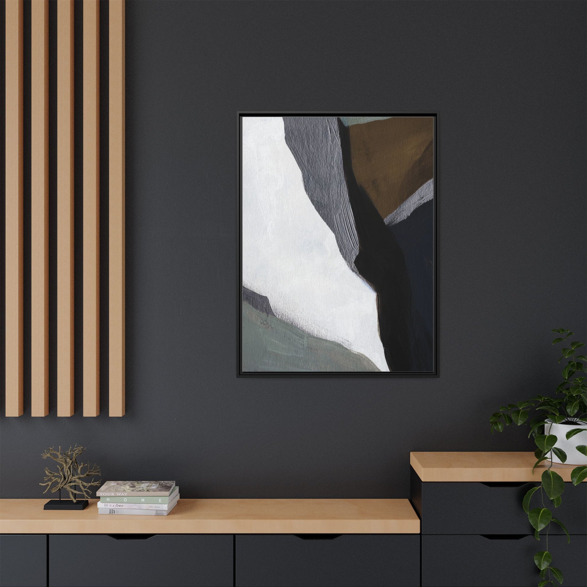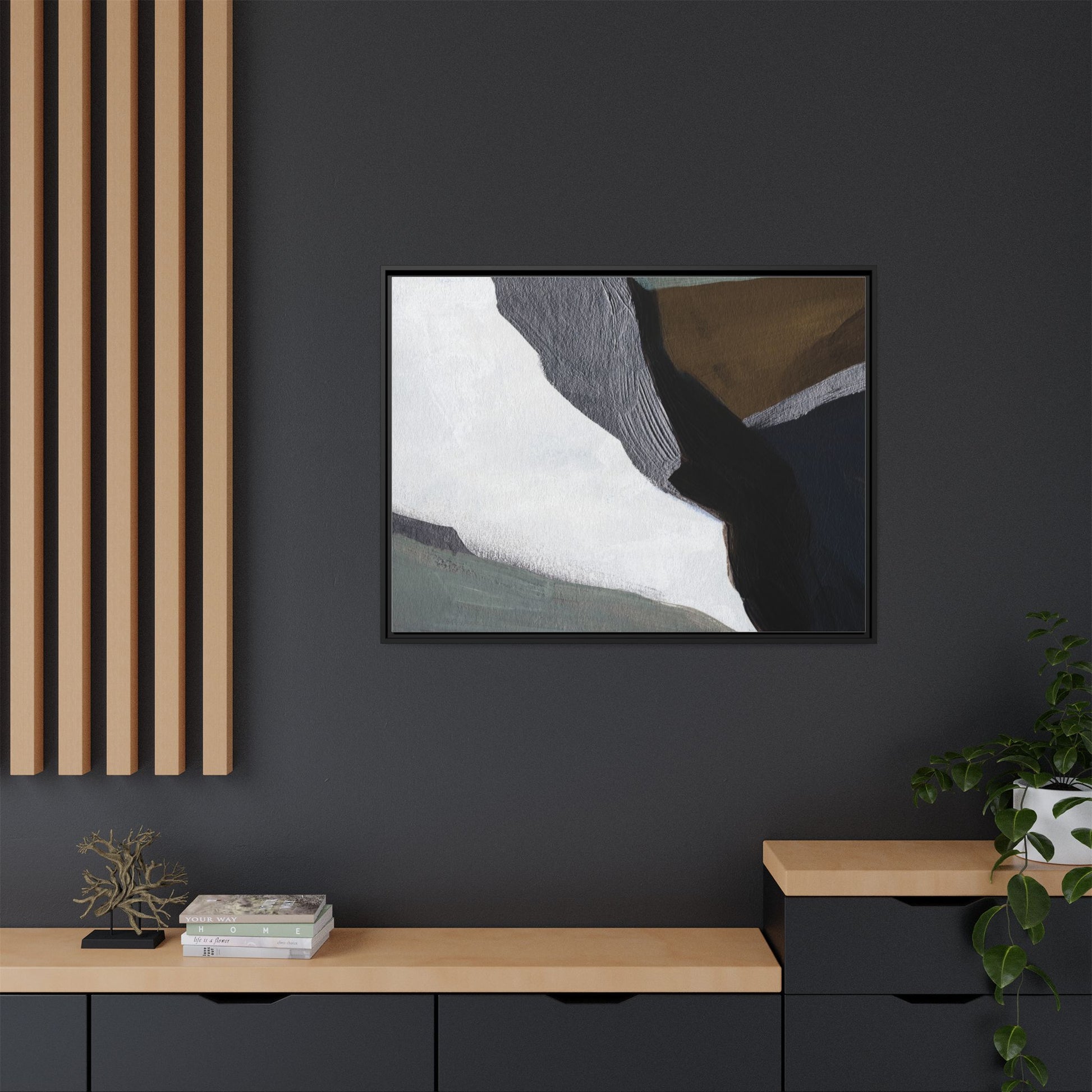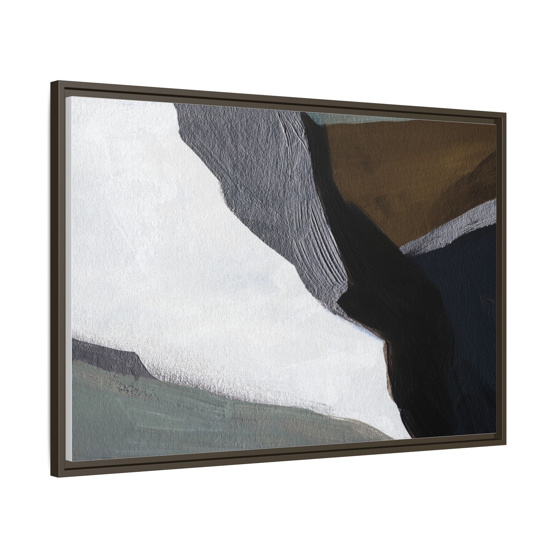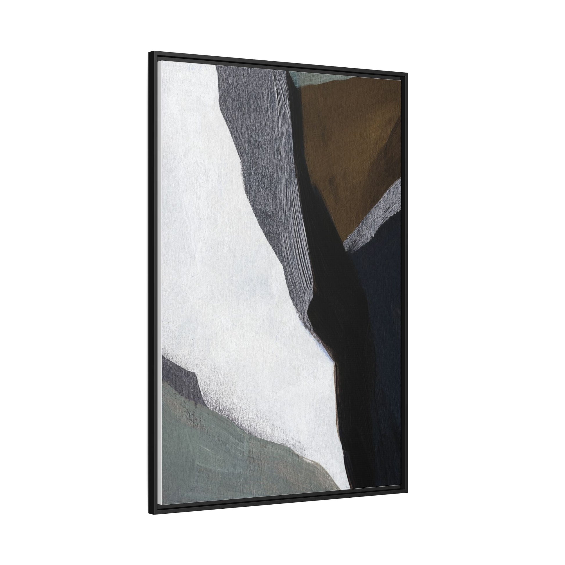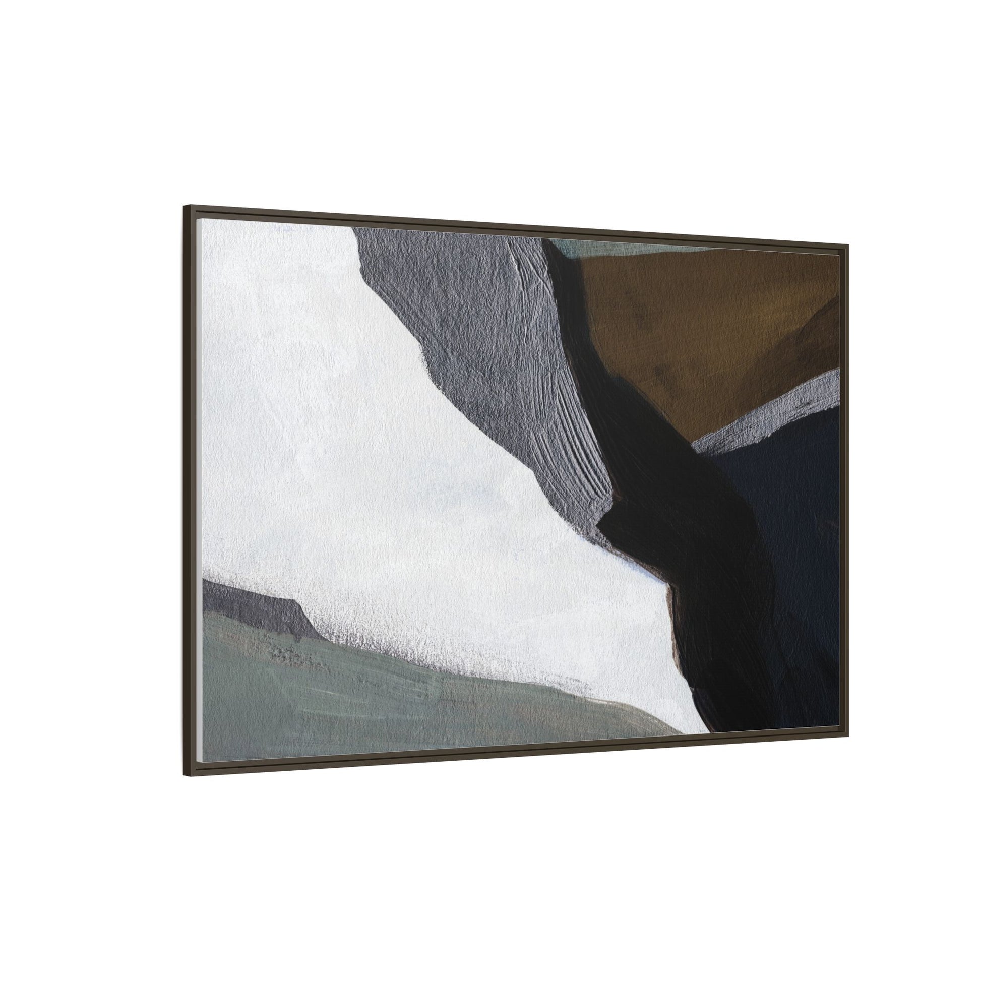 This abstract artistic image features a sophisticated composition of geometric shapes and textured surfaces in a muted color palette. Soft, layered forms in shades of white, gray, black, green, and brown create a dynamic visual landscape with distinct angular transitions. The texture appears to be reminiscent of painted or sculpted surfaces, with subtle variations in depth and a slightly rough, almost tactile quality that suggests brush or palette knife application. Diagonal lines and sharp contrasts between the color blocks create a sense of movement and depth, drawing the viewer's eye across the artistic arrangement. The overall aesthetic evokes a minimalist, contemporary art style that balances geometric precision with organic, softly blended edges.