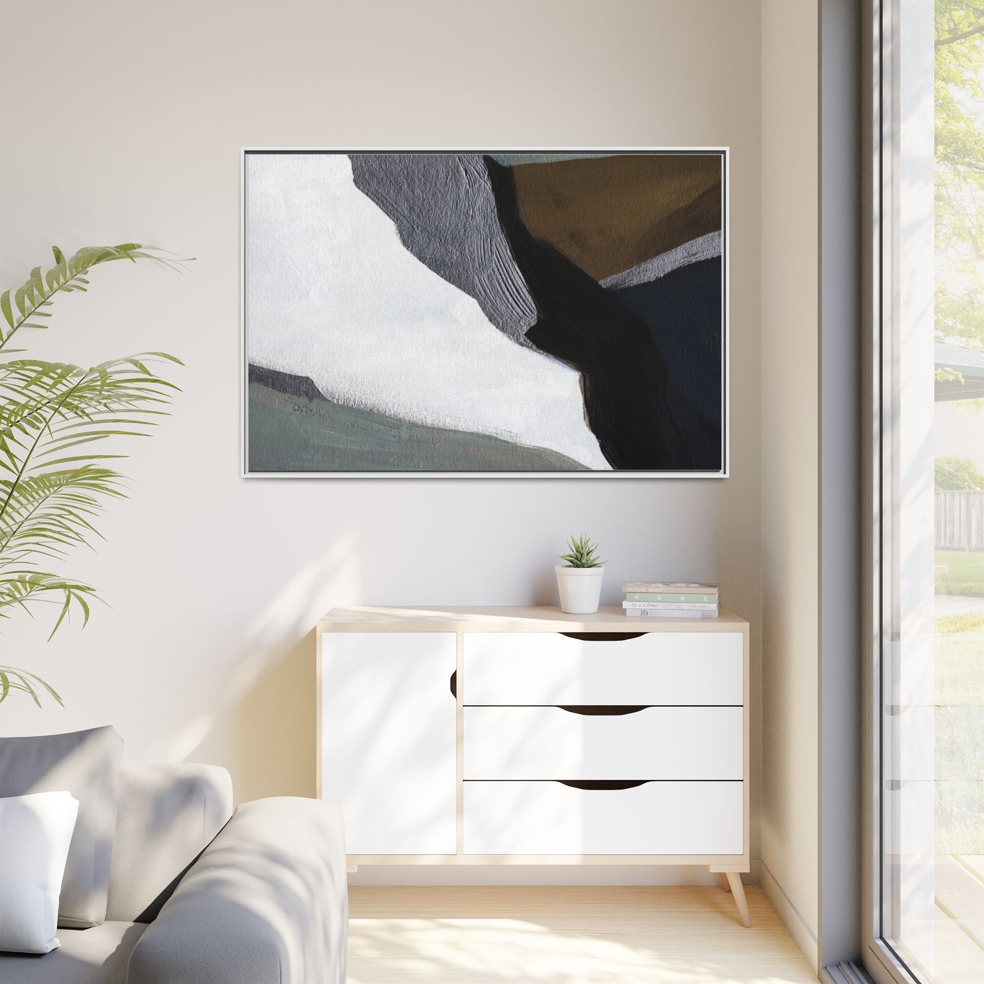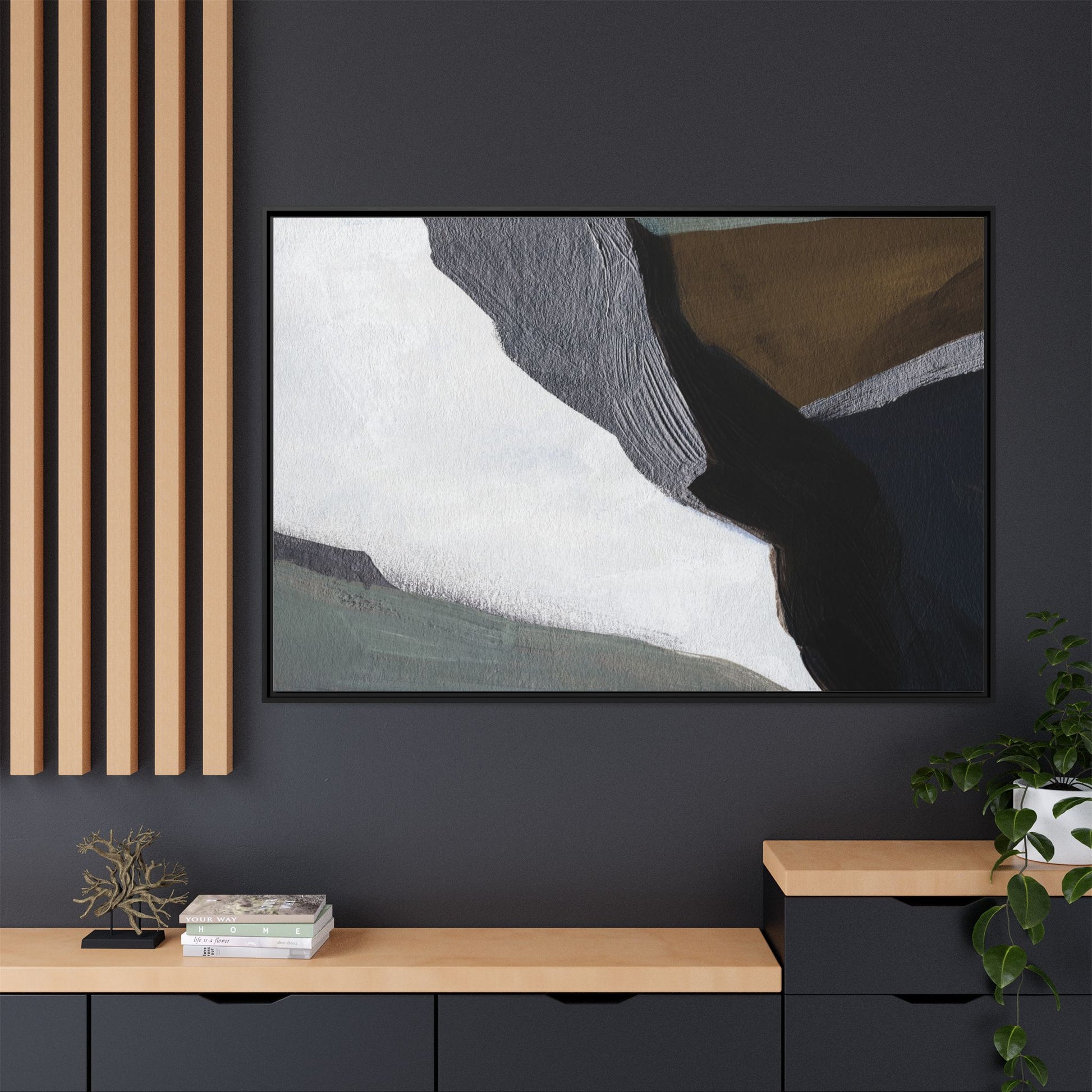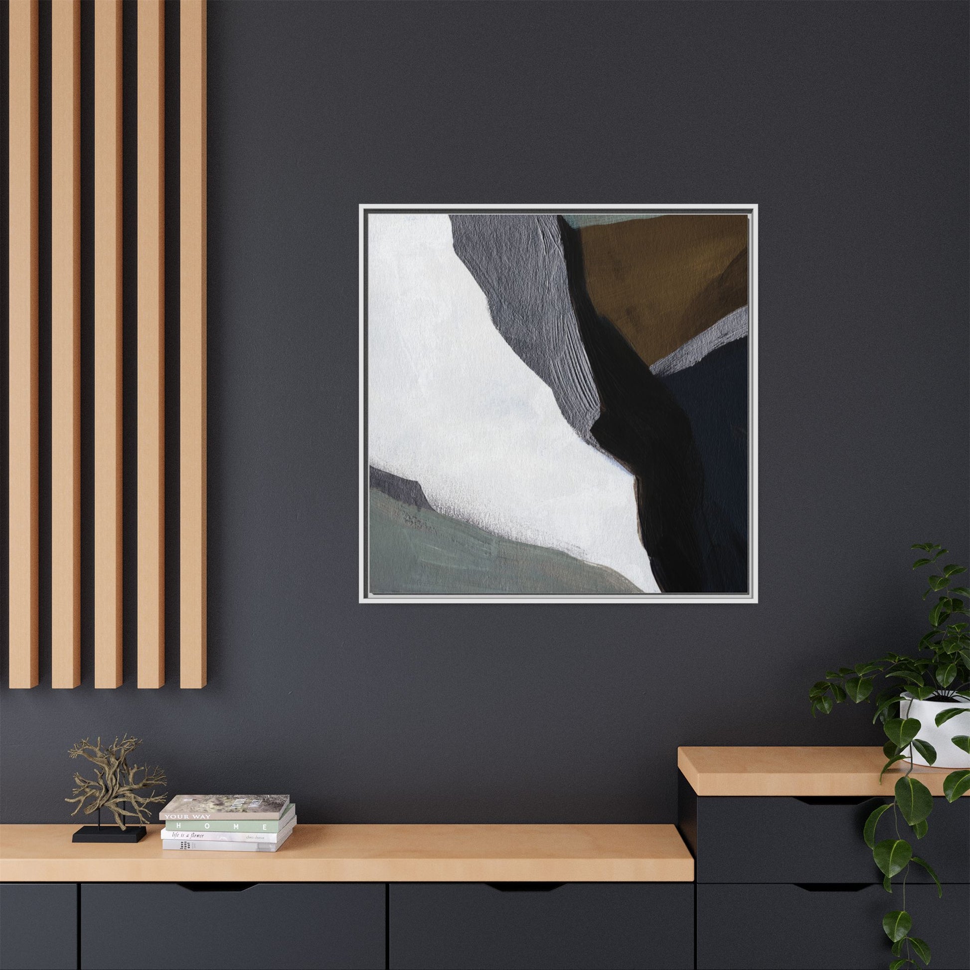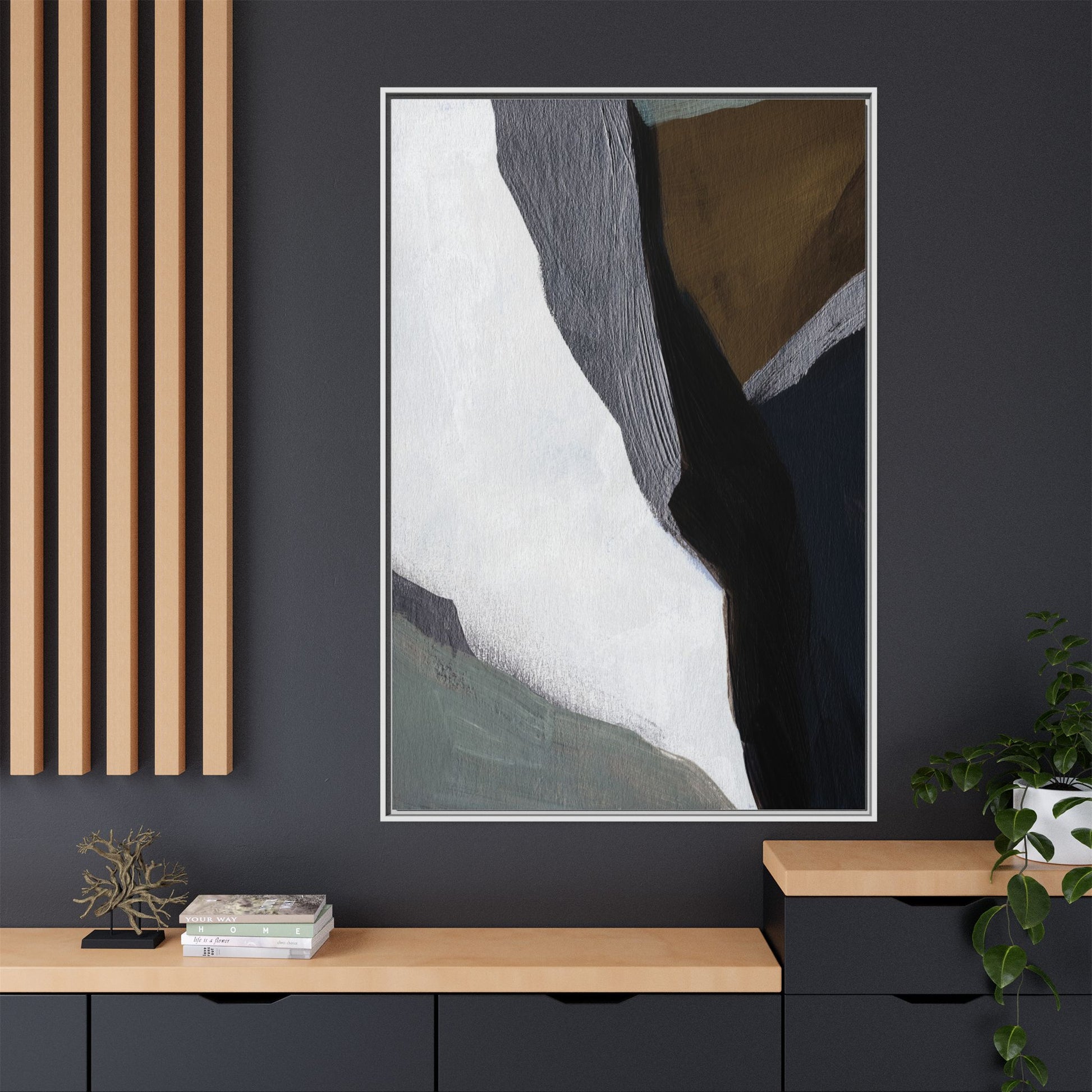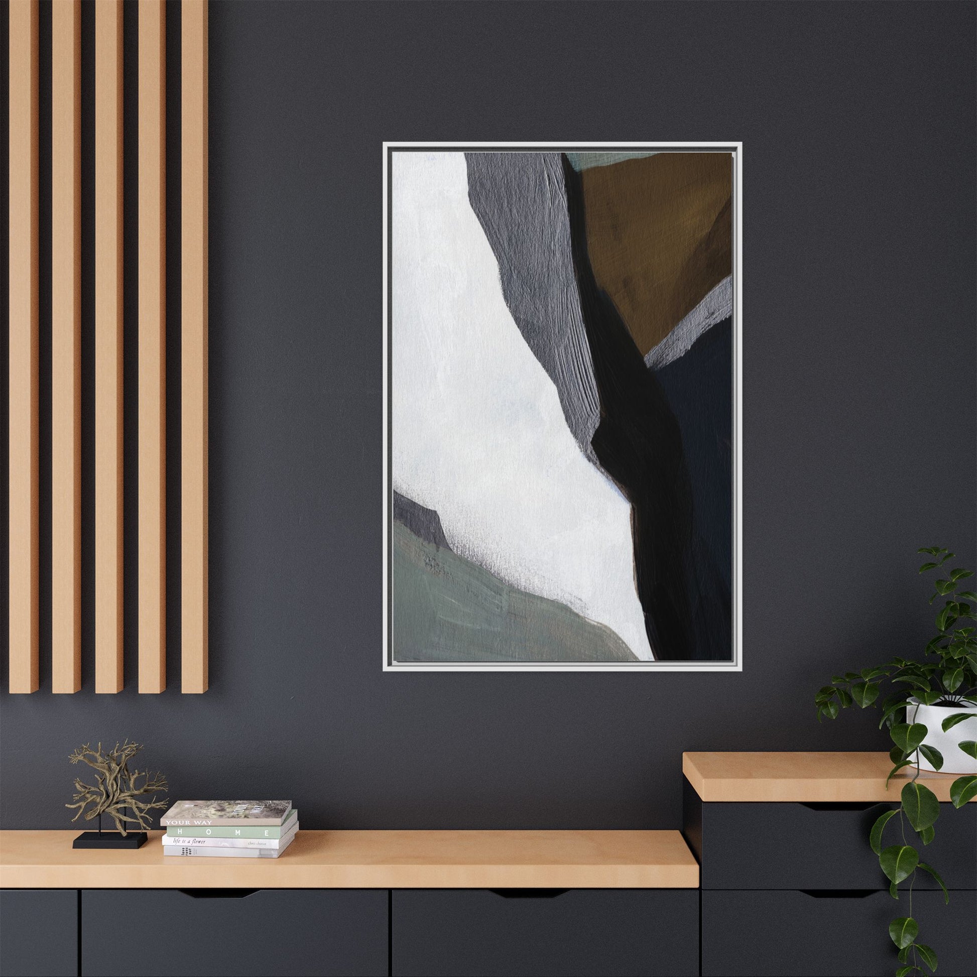 This abstract artistic image features a sophisticated composition of geometric shapes and textured surfaces in a muted color palette. Soft, layered forms in shades of white, gray, black, green, and brown create a dynamic visual landscape with distinct angular transitions. The texture appears to be reminiscent of painted or sculpted surfaces, with subtle variations in depth and a slightly rough, almost tactile quality that suggests brush or palette knife application. Diagonal lines and sharp contrasts between the color blocks create a sense of movement and depth, drawing the viewer's eye across the artistic arrangement. The overall aesthetic evokes a minimalist, contemporary art style that balances geometric precision with organic, softly blended edges.