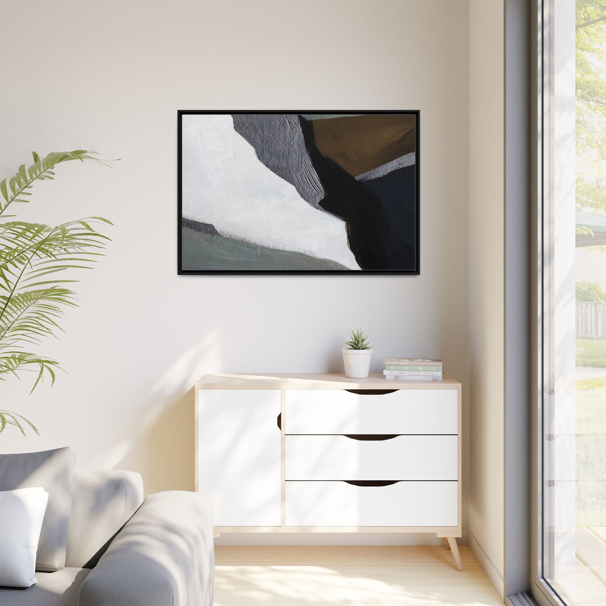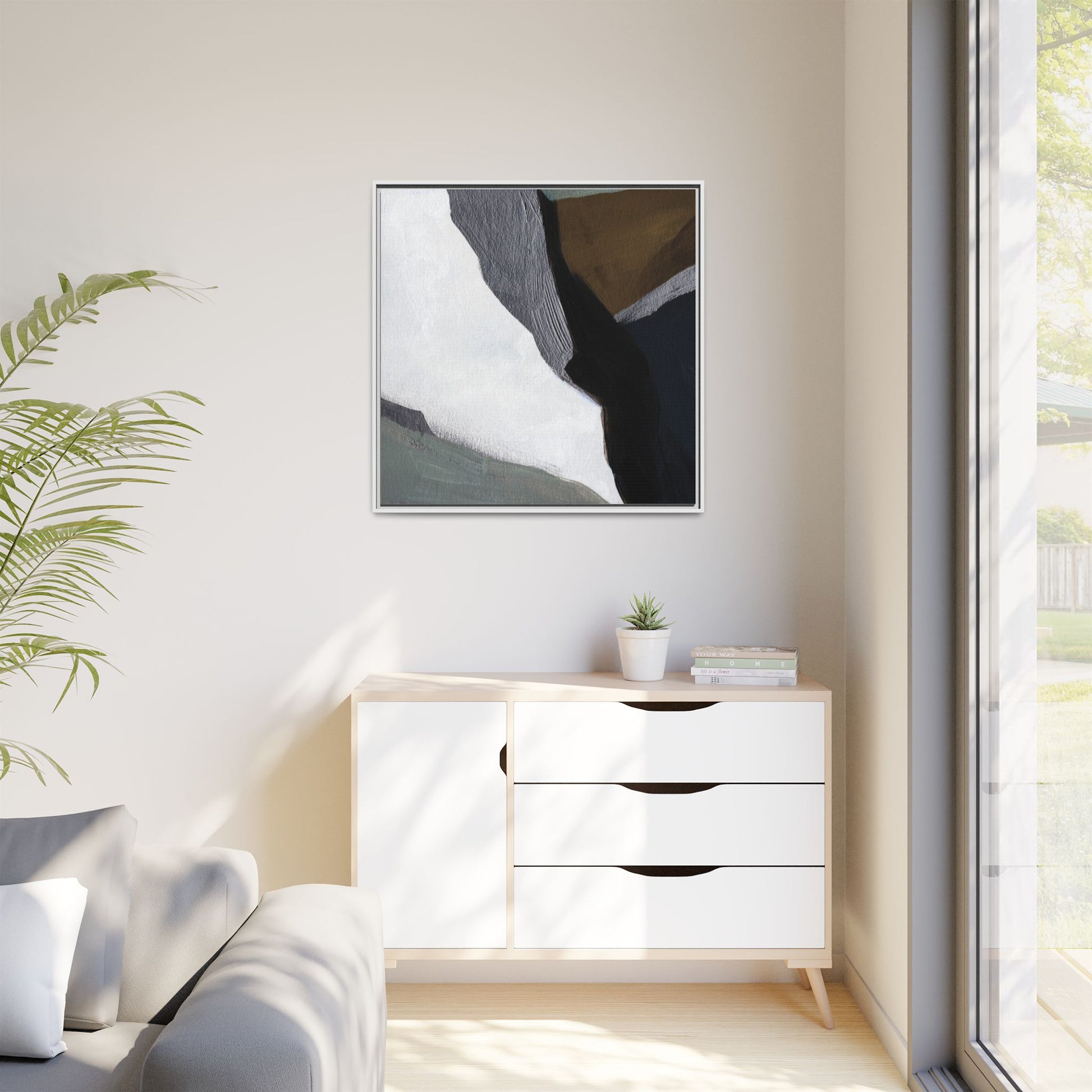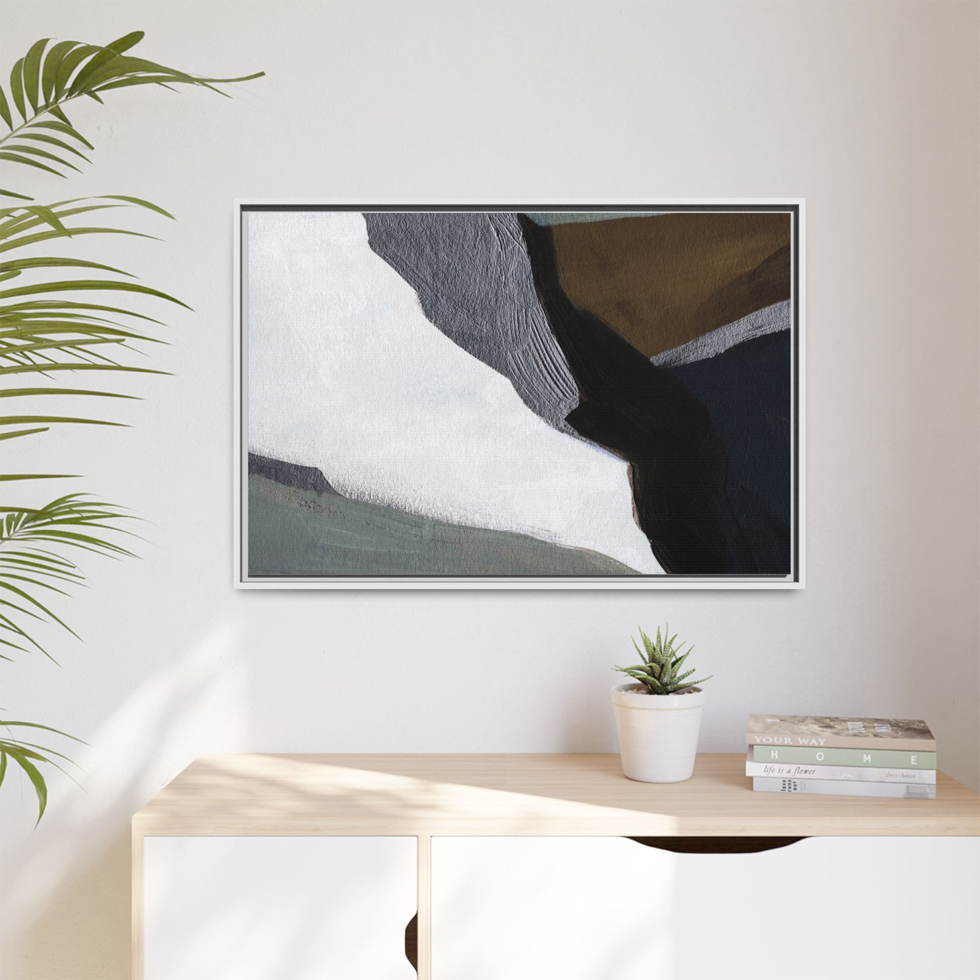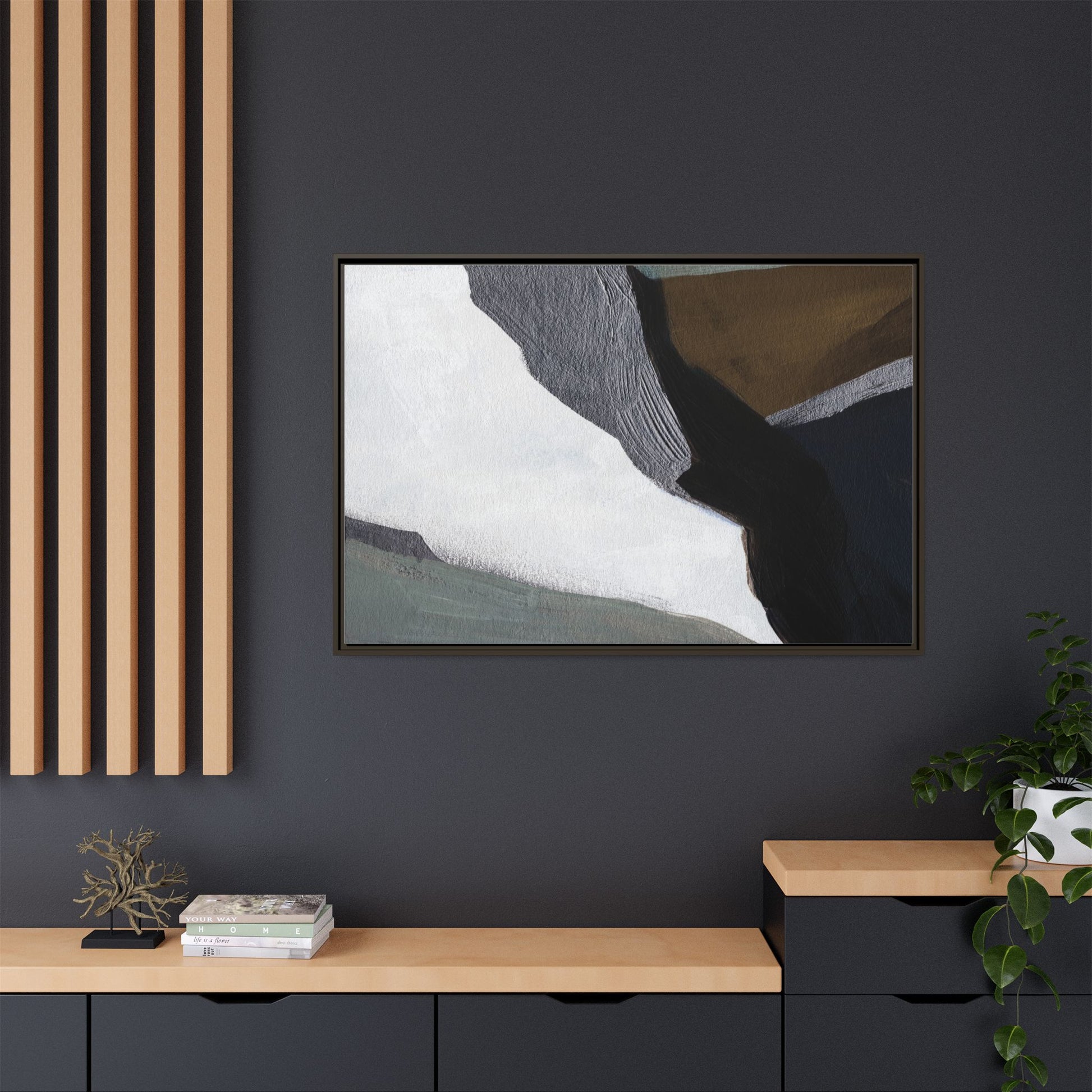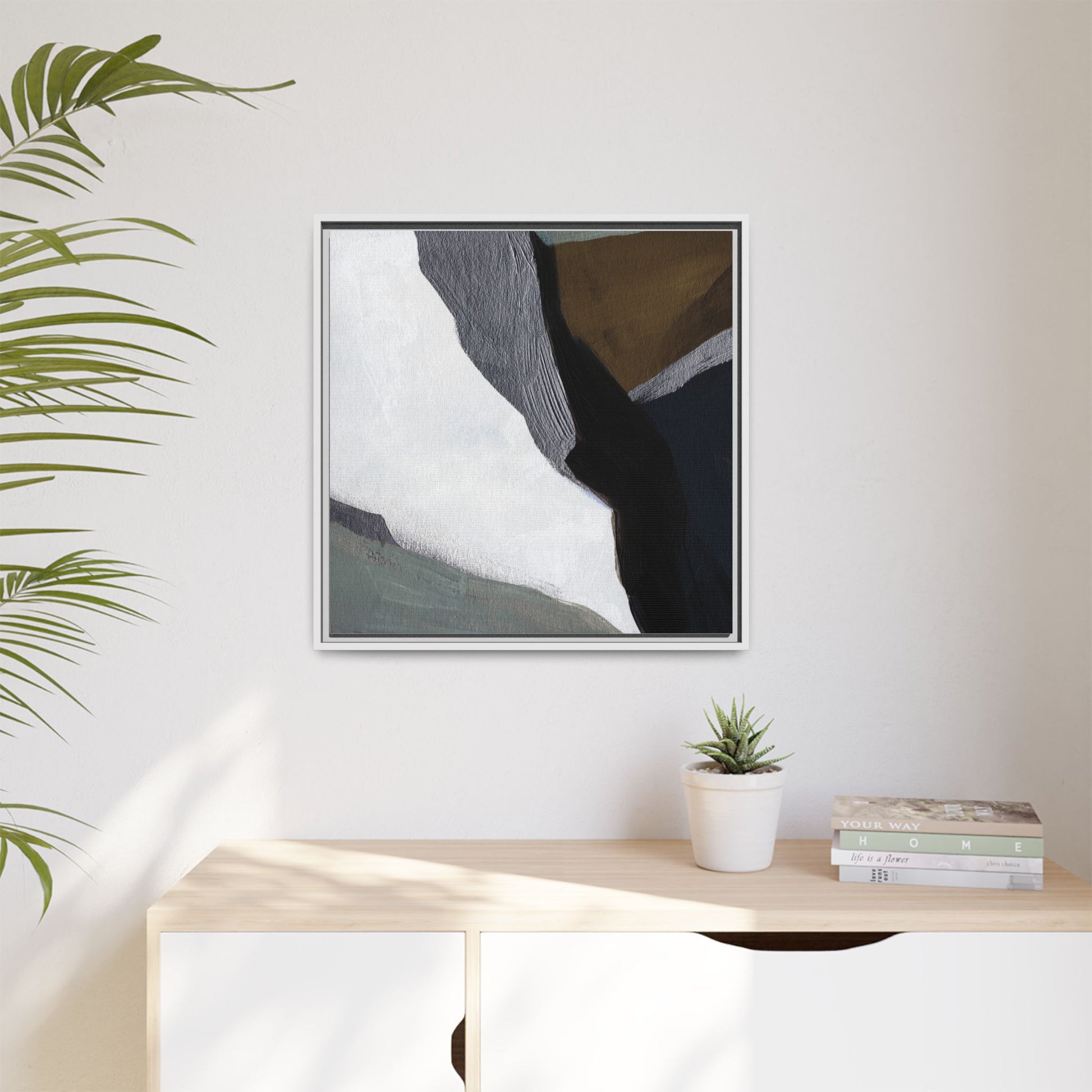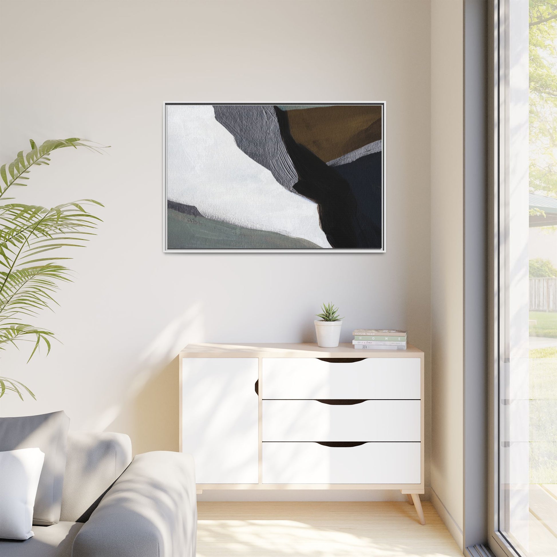 This abstract artistic image features a sophisticated composition of geometric shapes and textured surfaces in a muted color palette. Soft, layered forms in shades of white, gray, black, green, and brown create a dynamic visual landscape with distinct angular transitions. The texture appears to be reminiscent of painted or sculpted surfaces, with subtle variations in depth and a slightly rough, almost tactile quality that suggests brush or palette knife application. Diagonal lines and sharp contrasts between the color blocks create a sense of movement and depth, drawing the viewer's eye across the artistic arrangement. The overall aesthetic evokes a minimalist, contemporary art style that balances geometric precision with organic, softly blended edges.