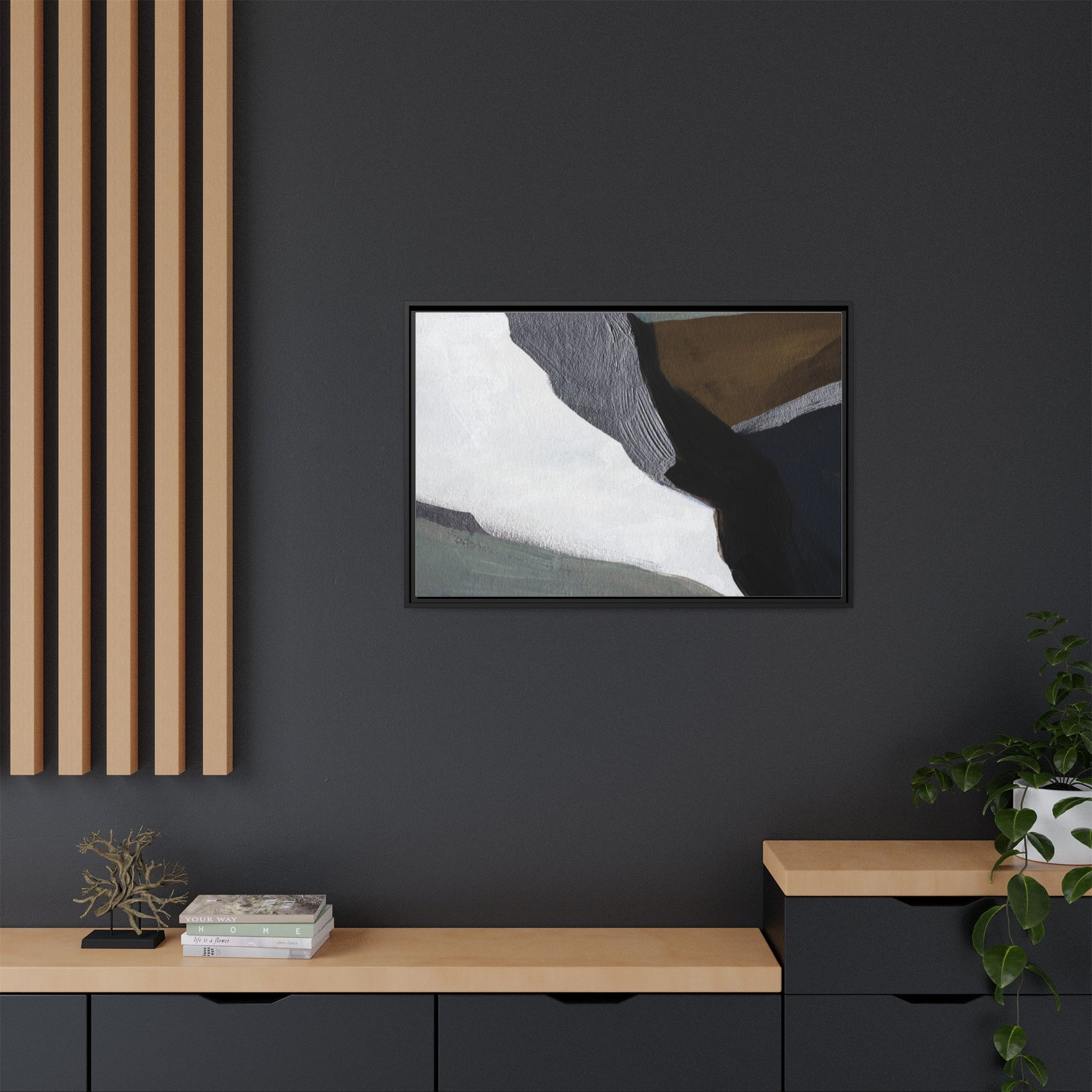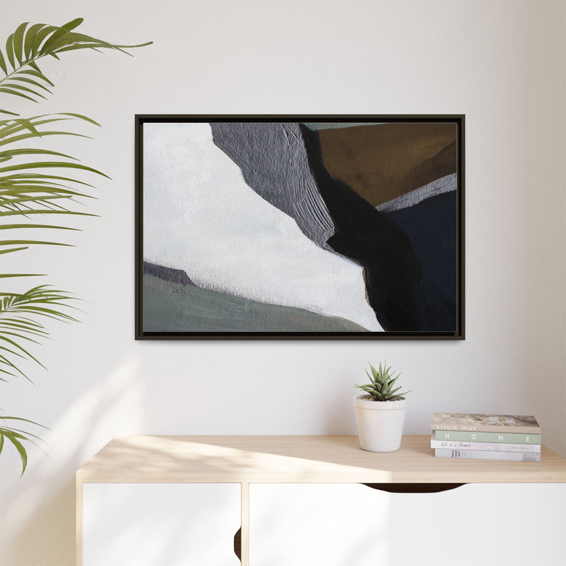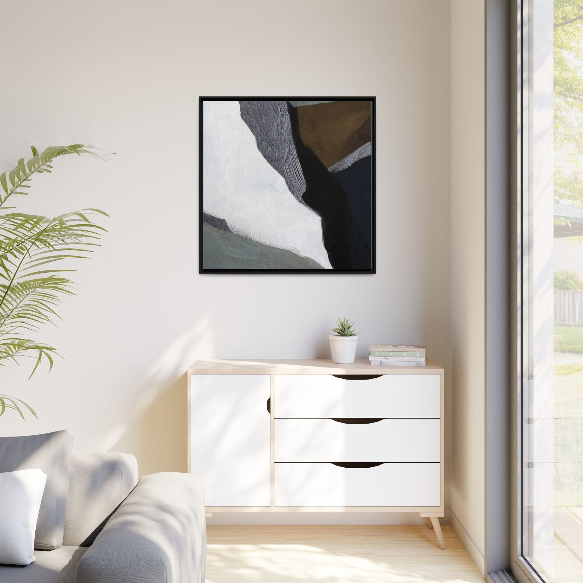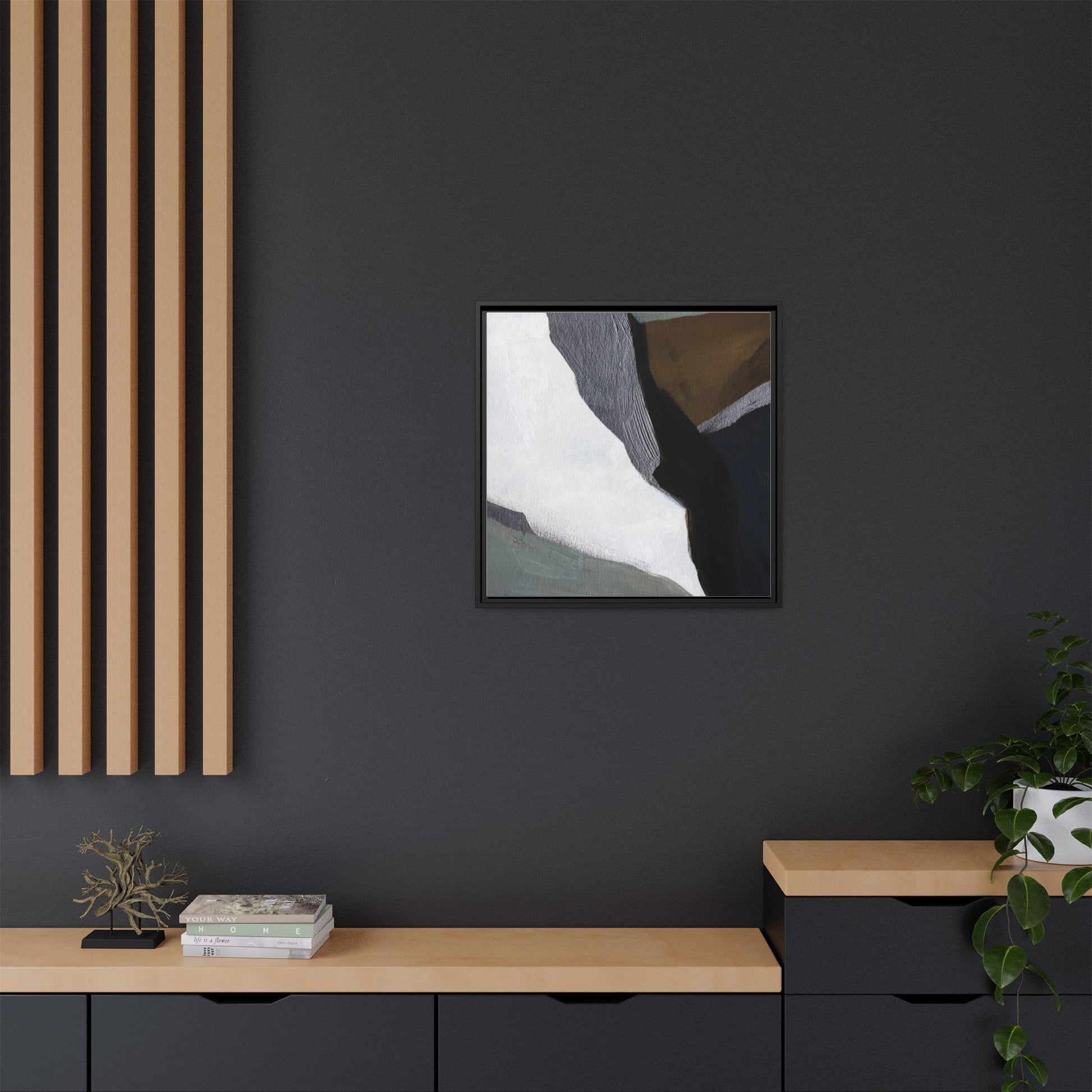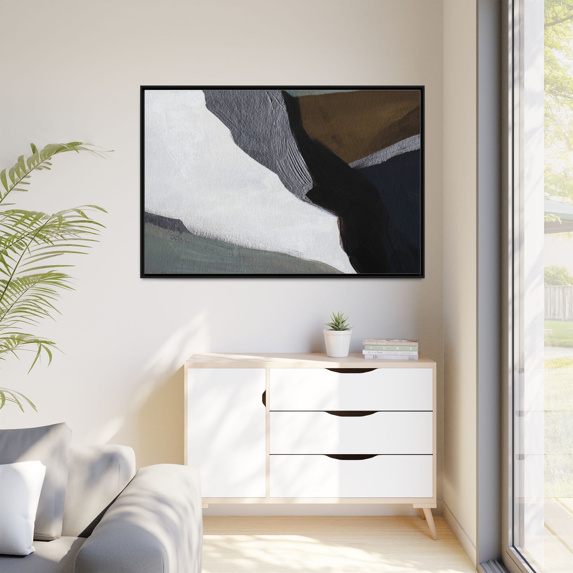 This abstract artistic image features a sophisticated composition of geometric shapes and textured surfaces in a muted color palette. Soft, layered forms in shades of white, gray, black, green, and brown create a dynamic visual landscape with distinct angular transitions. The texture appears to be reminiscent of painted or sculpted surfaces, with subtle variations in depth and a slightly rough, almost tactile quality that suggests brush or palette knife application. Diagonal lines and sharp contrasts between the color blocks create a sense of movement and depth, drawing the viewer's eye across the artistic arrangement. The overall aesthetic evokes a minimalist, contemporary art style that balances geometric precision with organic, softly blended edges.