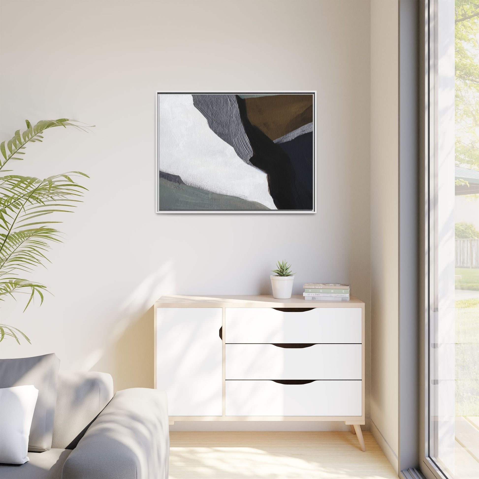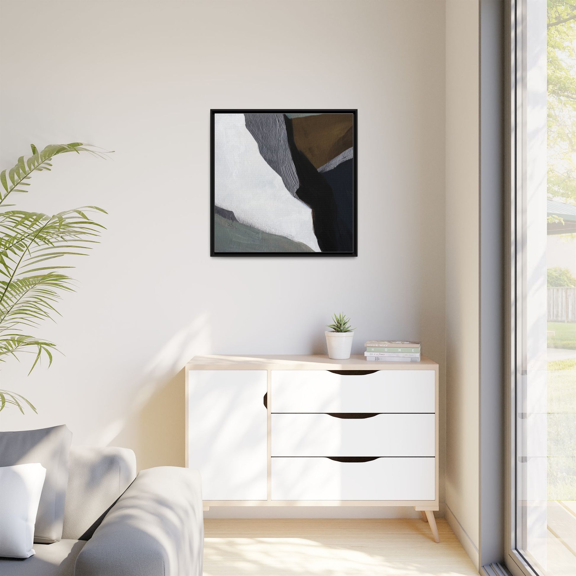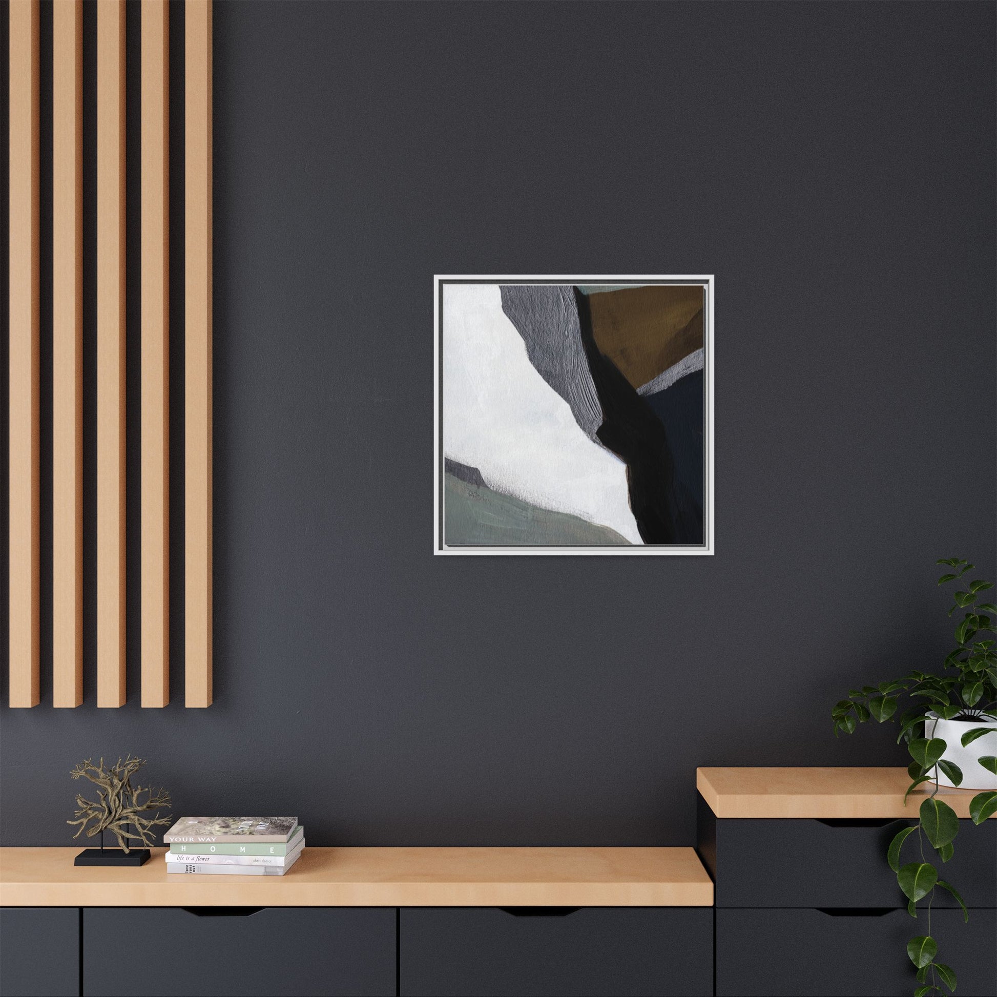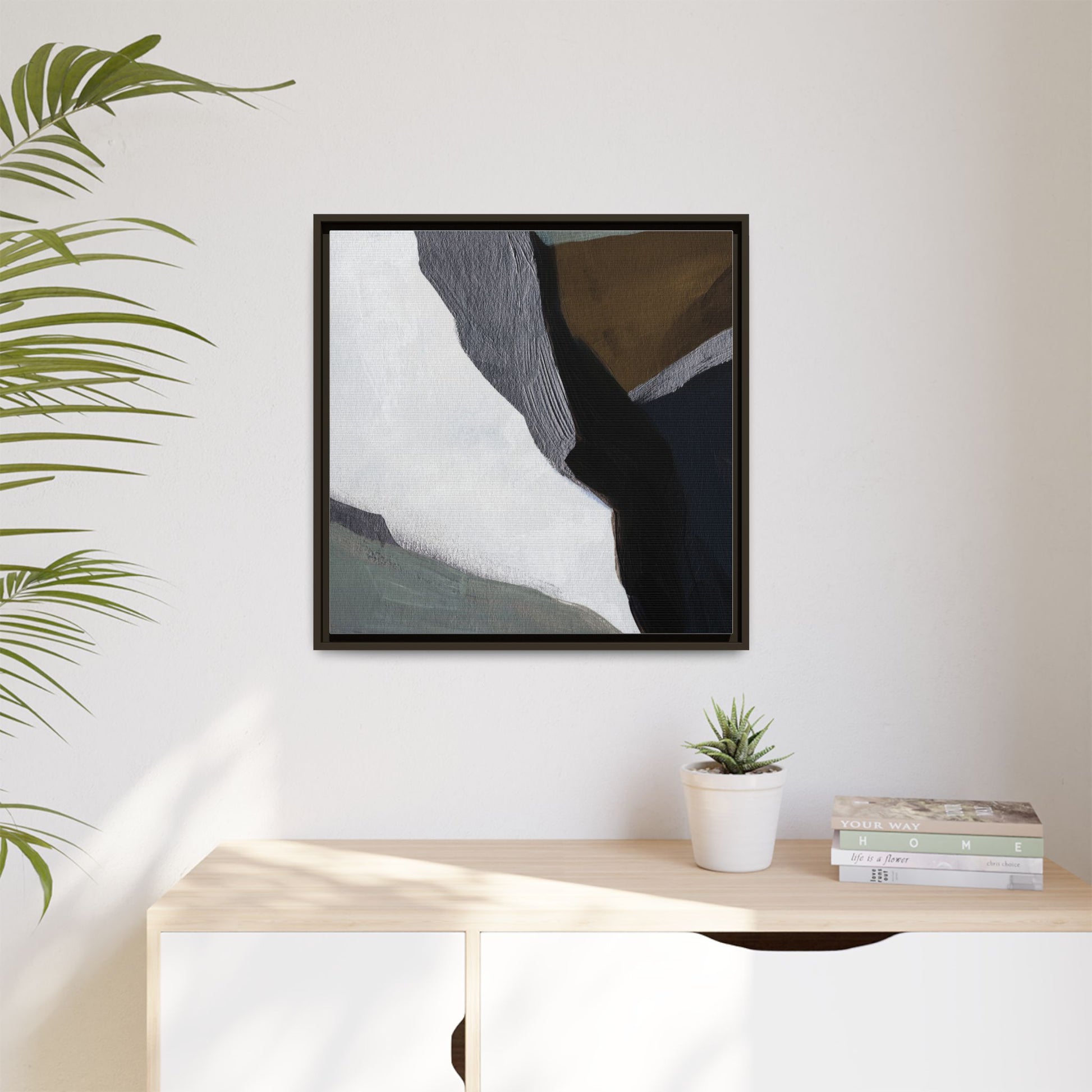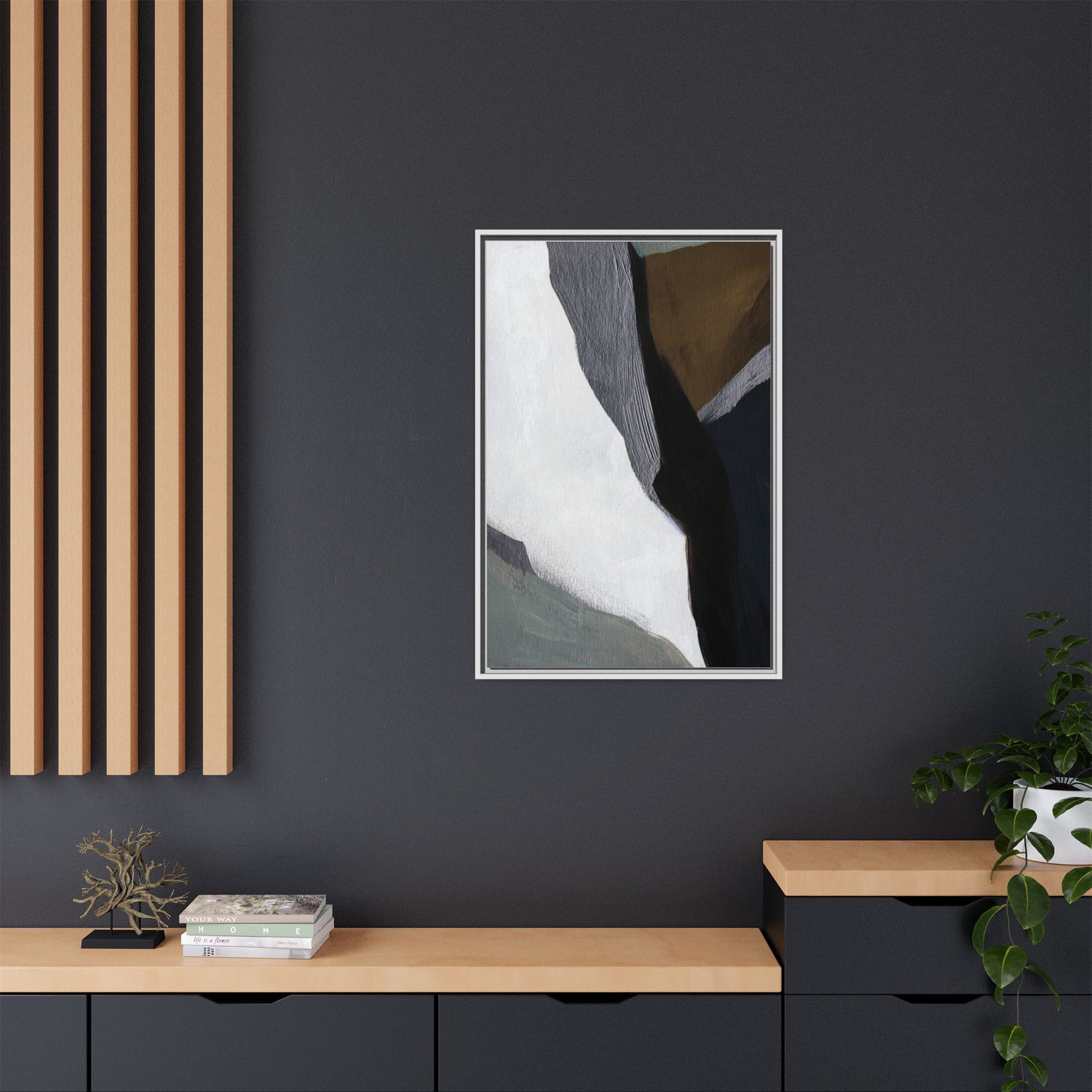 This abstract artistic image features a sophisticated composition of geometric shapes and textured surfaces in a muted color palette. Soft, layered forms in shades of white, gray, black, green, and brown create a dynamic visual landscape with distinct angular transitions. The texture appears to be reminiscent of painted or sculpted surfaces, with subtle variations in depth and a slightly rough, almost tactile quality that suggests brush or palette knife application. Diagonal lines and sharp contrasts between the color blocks create a sense of movement and depth, drawing the viewer's eye across the artistic arrangement. The overall aesthetic evokes a minimalist, contemporary art style that balances geometric precision with organic, softly blended edges.