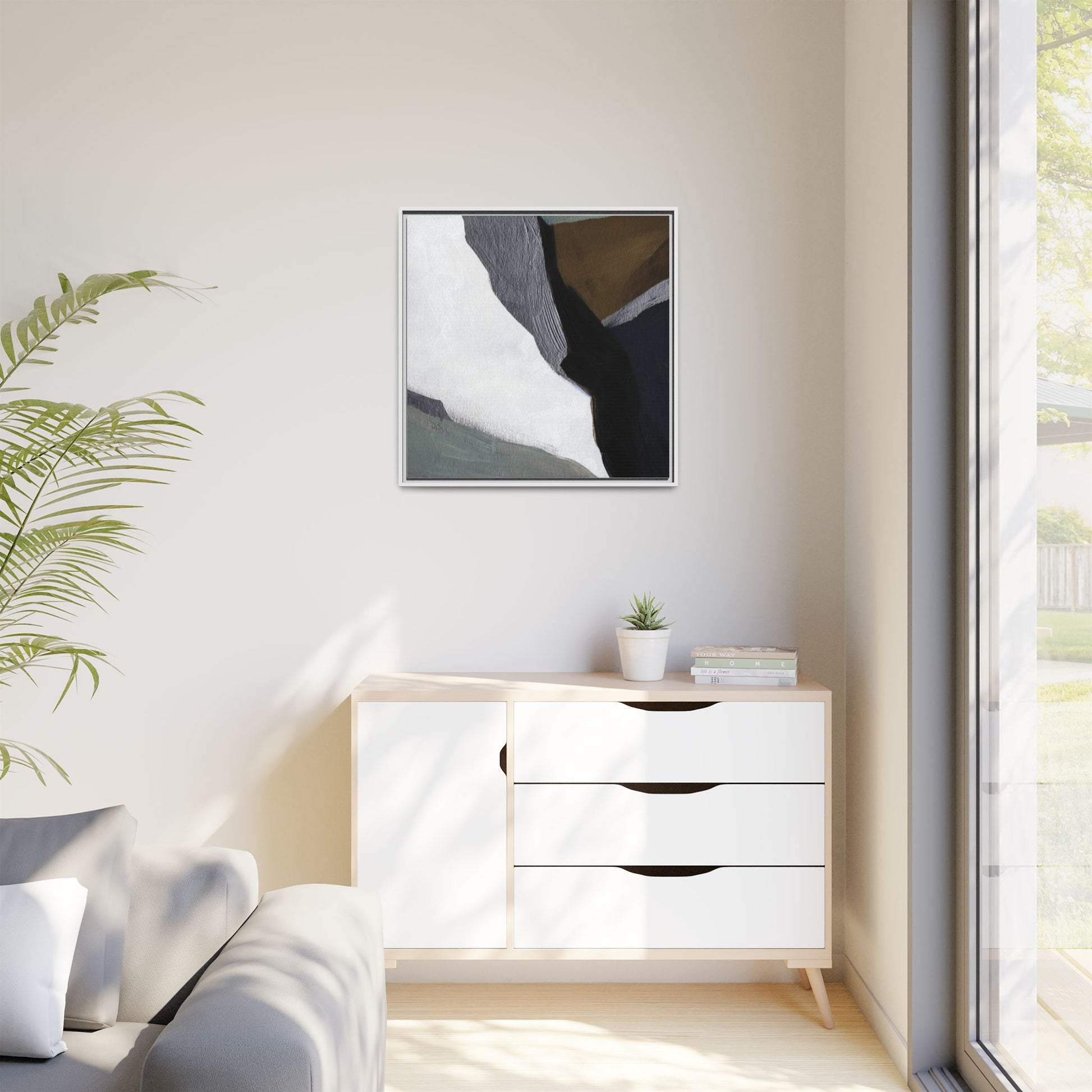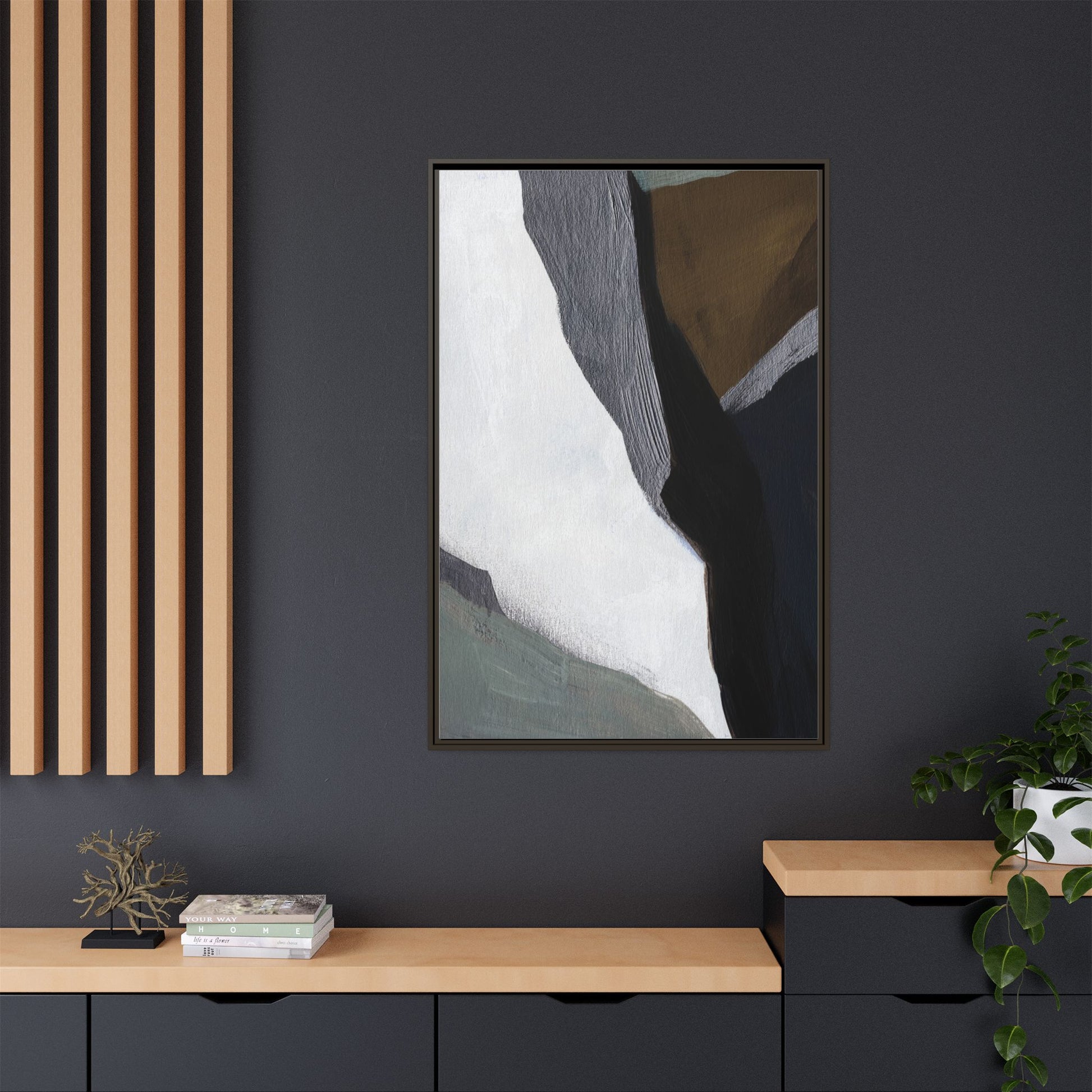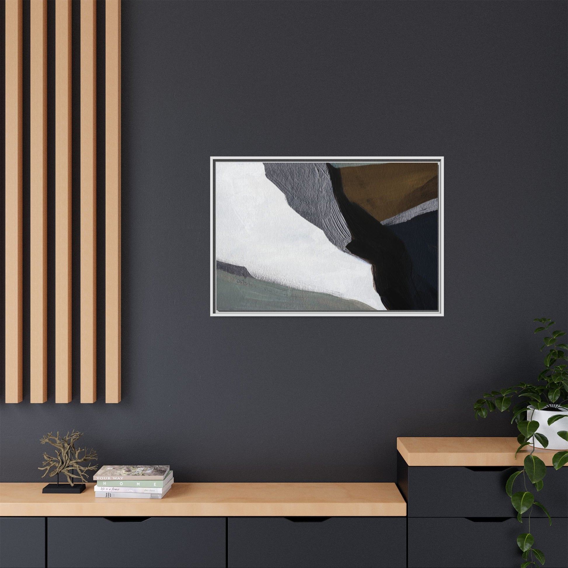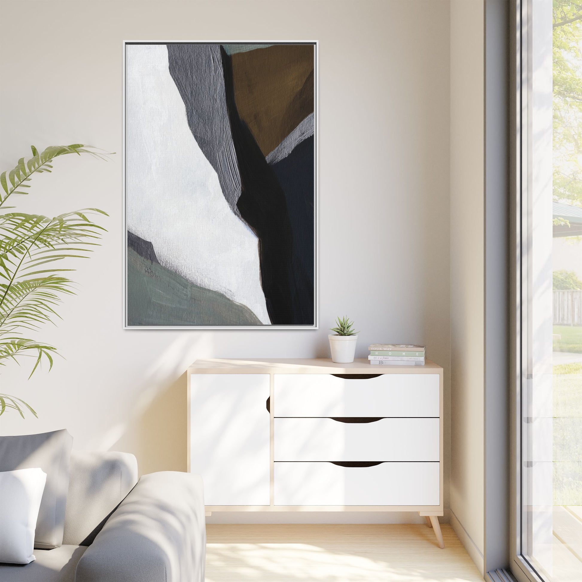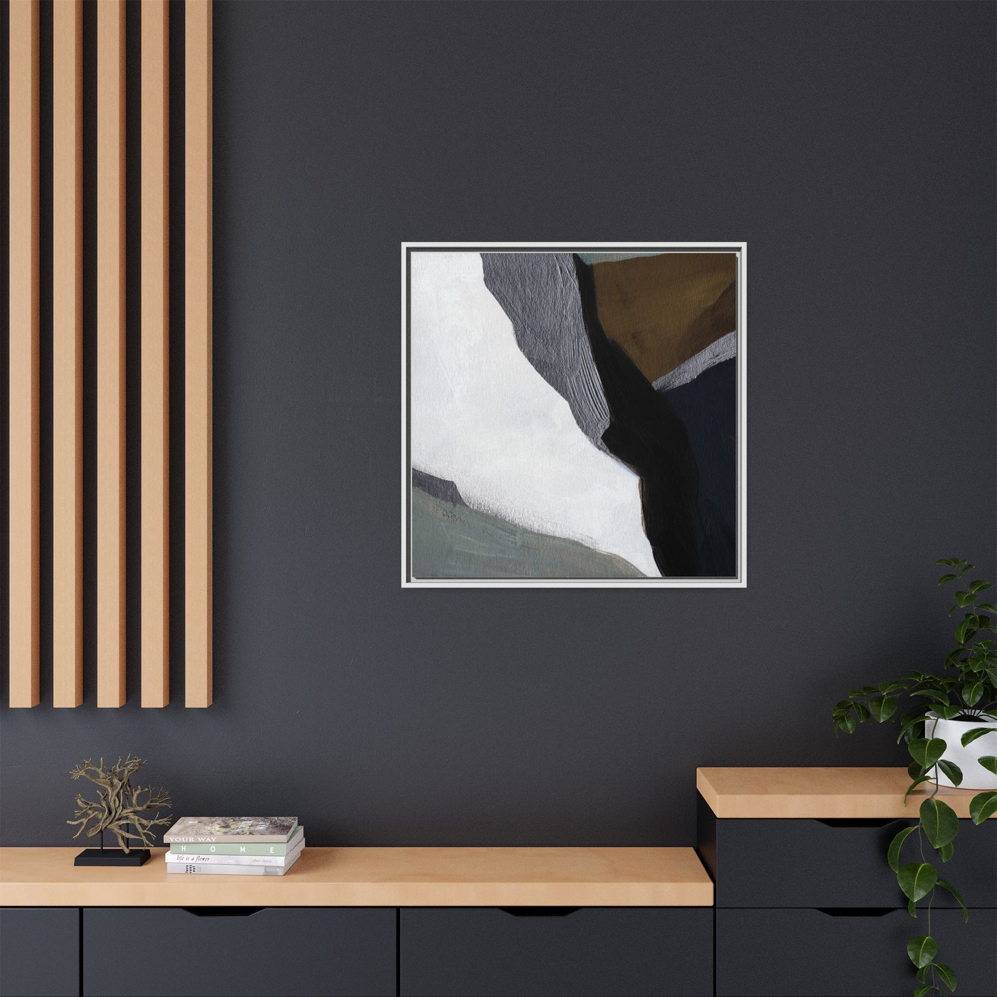 This abstract artistic image features a sophisticated composition of geometric shapes and textured surfaces in a muted color palette. Soft, layered forms in shades of white, gray, black, green, and brown create a dynamic visual landscape with distinct angular transitions. The texture appears to be reminiscent of painted or sculpted surfaces, with subtle variations in depth and a slightly rough, almost tactile quality that suggests brush or palette knife application. Diagonal lines and sharp contrasts between the color blocks create a sense of movement and depth, drawing the viewer's eye across the artistic arrangement. The overall aesthetic evokes a minimalist, contemporary art style that balances geometric precision with organic, softly blended edges.