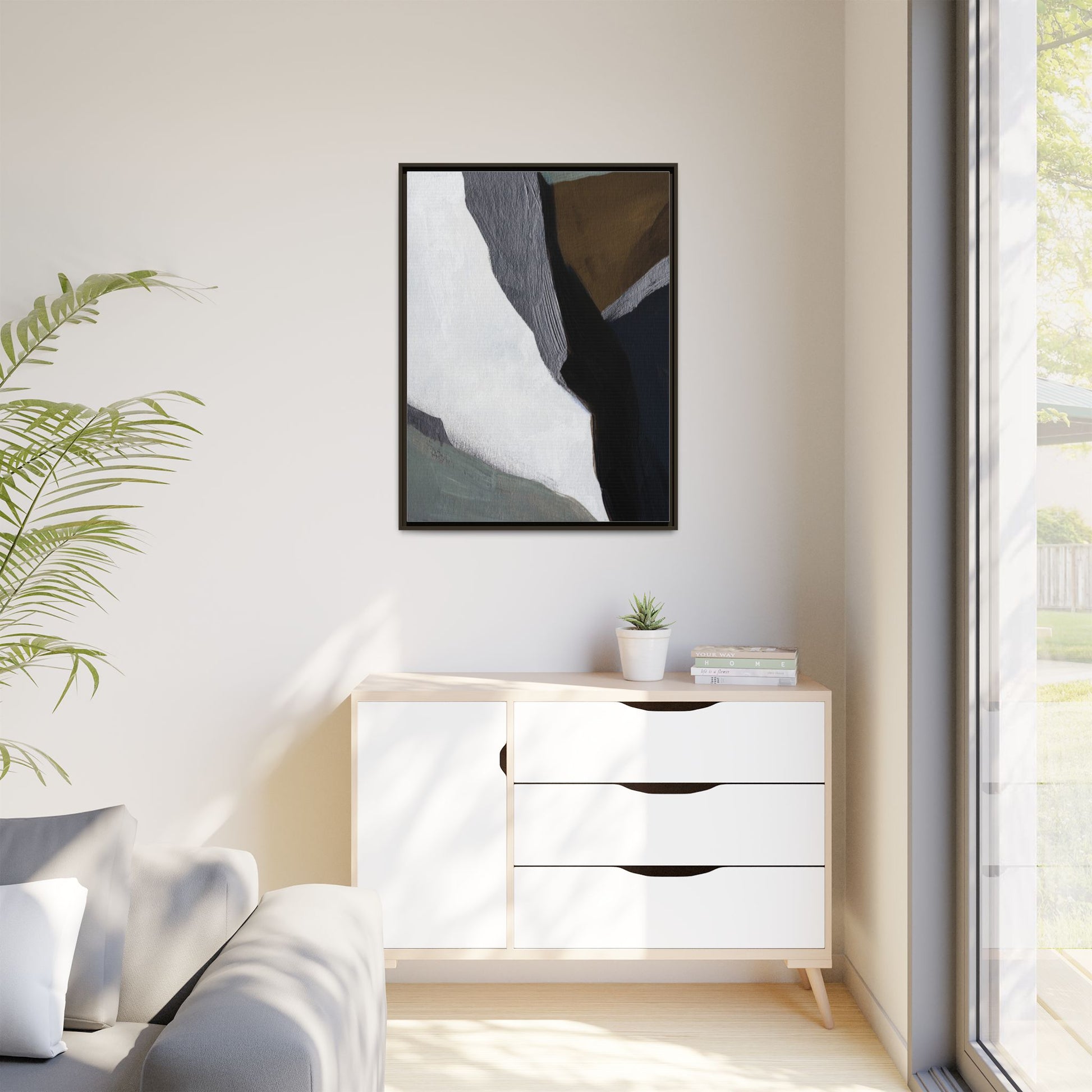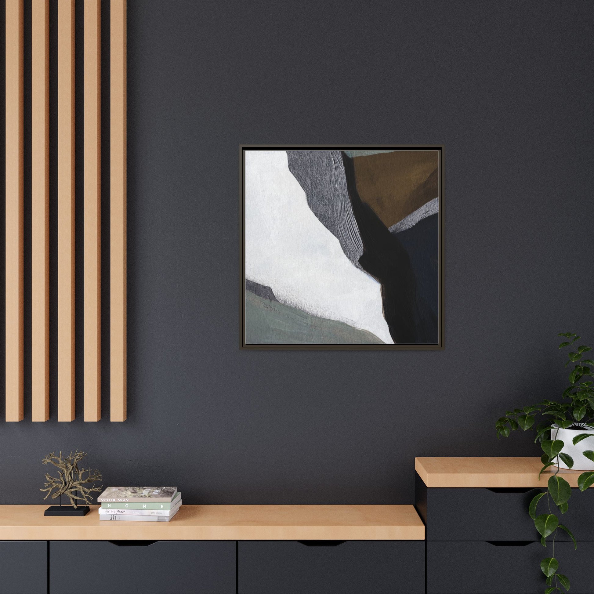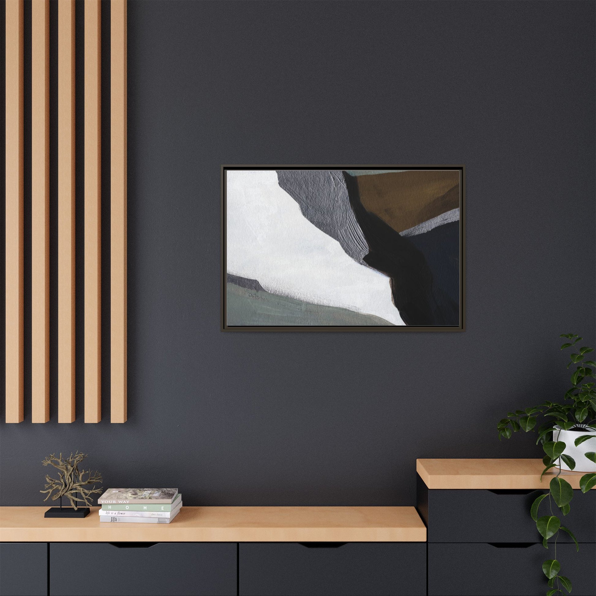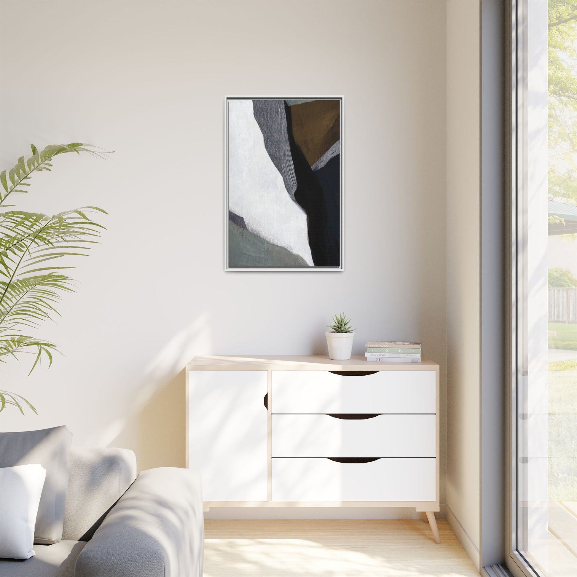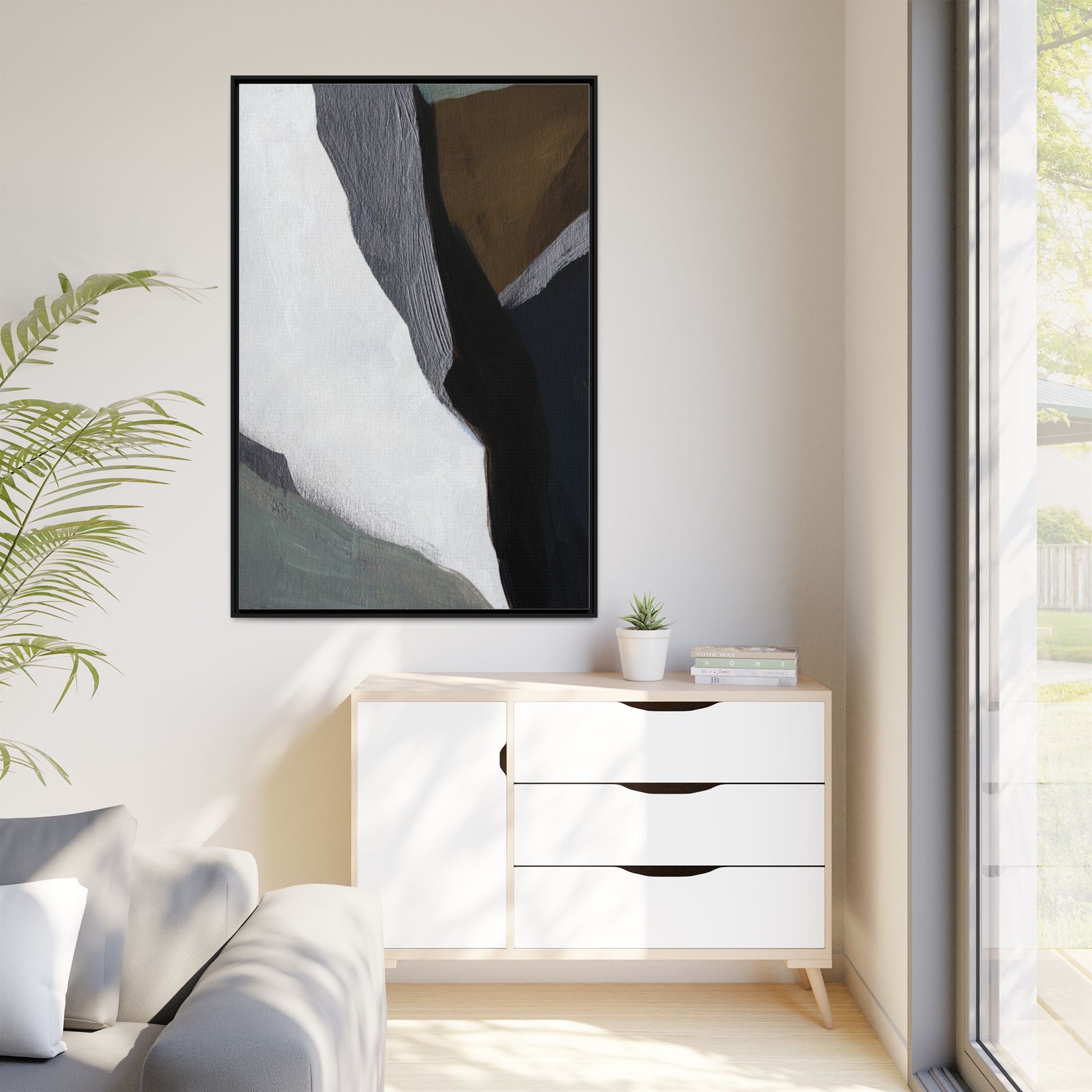 This abstract artistic image features a sophisticated composition of geometric shapes and textured surfaces in a muted color palette. Soft, layered forms in shades of white, gray, black, green, and brown create a dynamic visual landscape with distinct angular transitions. The texture appears to be reminiscent of painted or sculpted surfaces, with subtle variations in depth and a slightly rough, almost tactile quality that suggests brush or palette knife application. Diagonal lines and sharp contrasts between the color blocks create a sense of movement and depth, drawing the viewer's eye across the artistic arrangement. The overall aesthetic evokes a minimalist, contemporary art style that balances geometric precision with organic, softly blended edges.