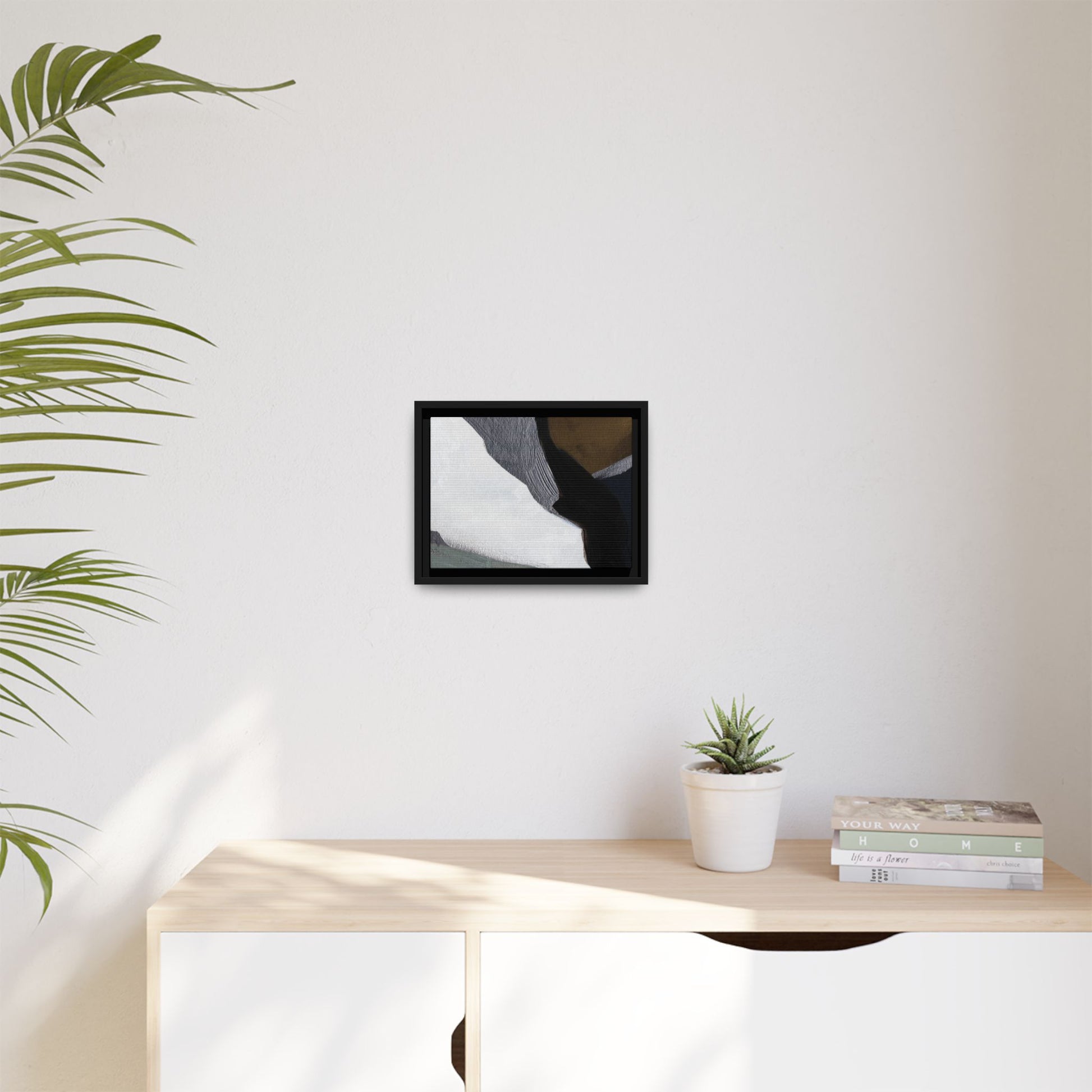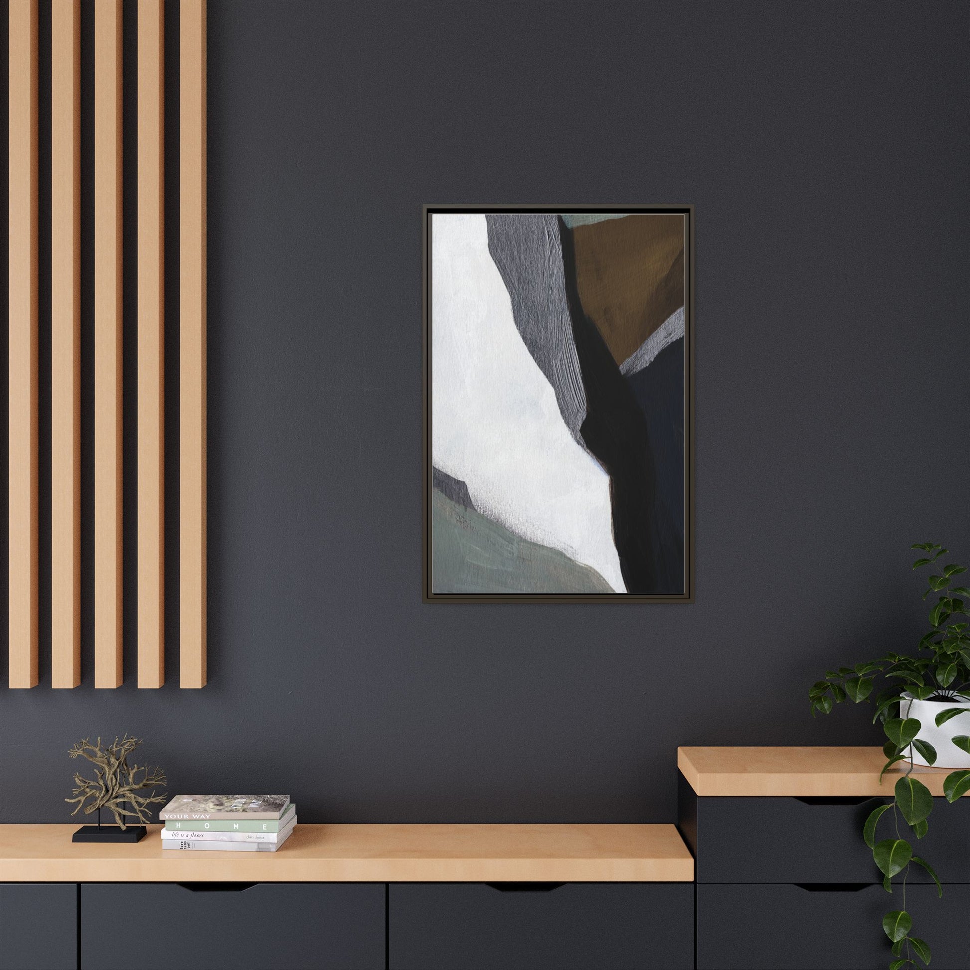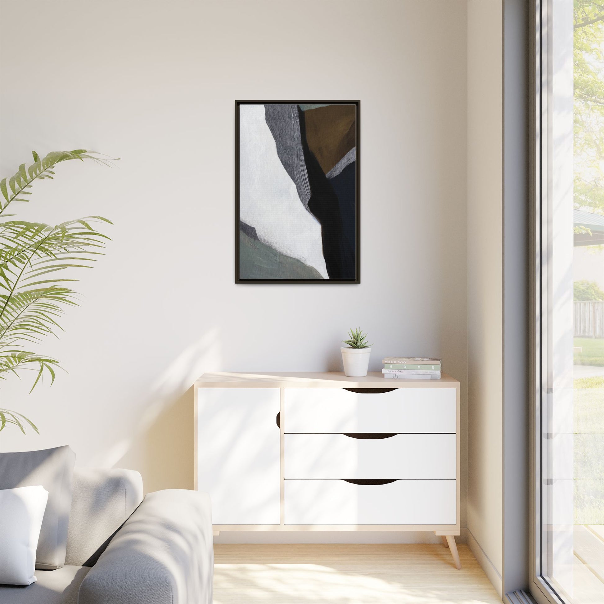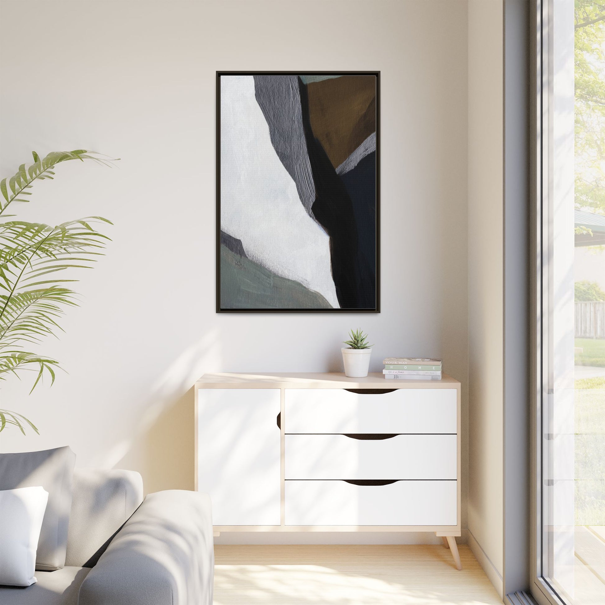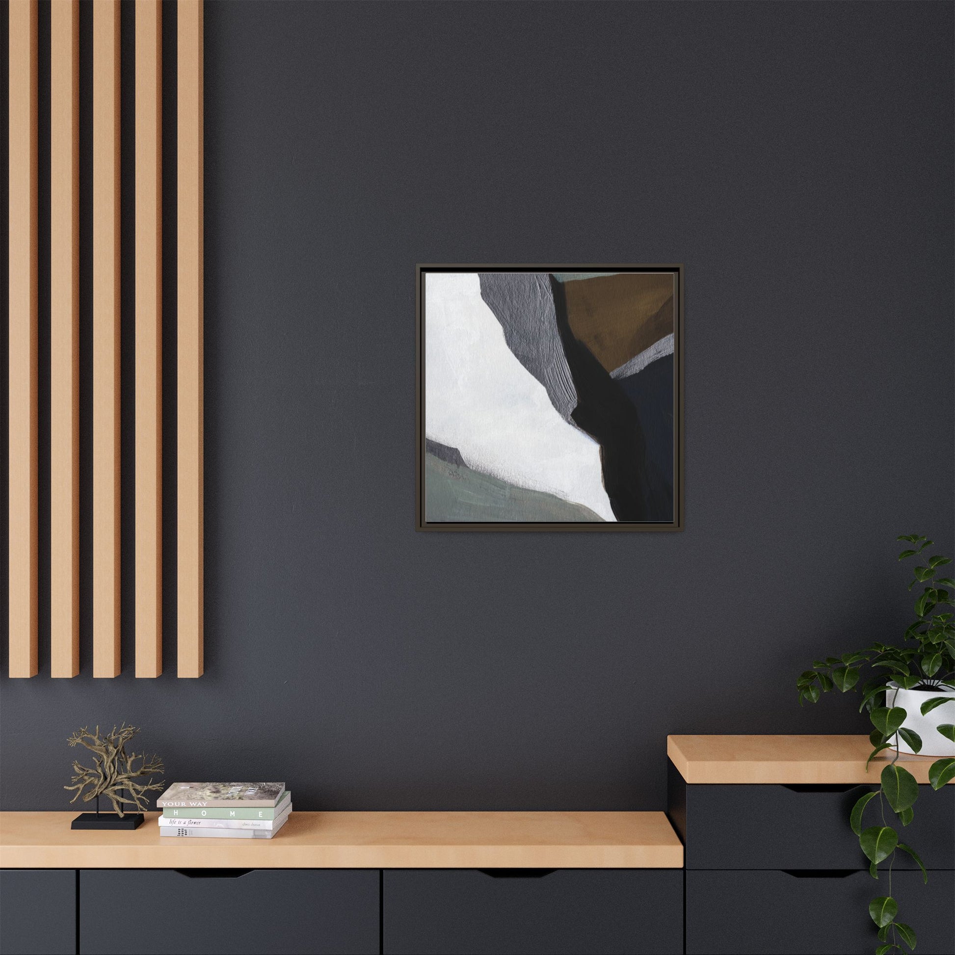 This abstract artistic image features a sophisticated composition of geometric shapes and textured surfaces in a muted color palette. Soft, layered forms in shades of white, gray, black, green, and brown create a dynamic visual landscape with distinct angular transitions. The texture appears to be reminiscent of painted or sculpted surfaces, with subtle variations in depth and a slightly rough, almost tactile quality that suggests brush or palette knife application. Diagonal lines and sharp contrasts between the color blocks create a sense of movement and depth, drawing the viewer's eye across the artistic arrangement. The overall aesthetic evokes a minimalist, contemporary art style that balances geometric precision with organic, softly blended edges.