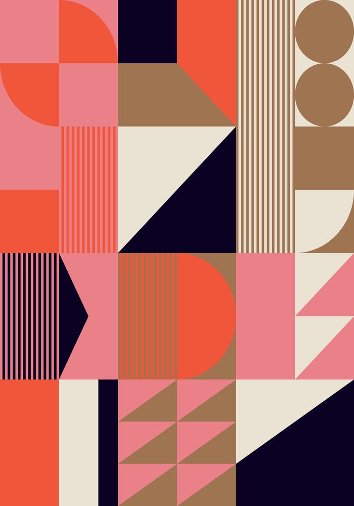 A vibrant interplay of geometric forms dances across the canvas, weaving bold lines and shapes into a rhythmic pattern. The composition harmonizes contrasting textures, colors, and forms in an abstract embrace.